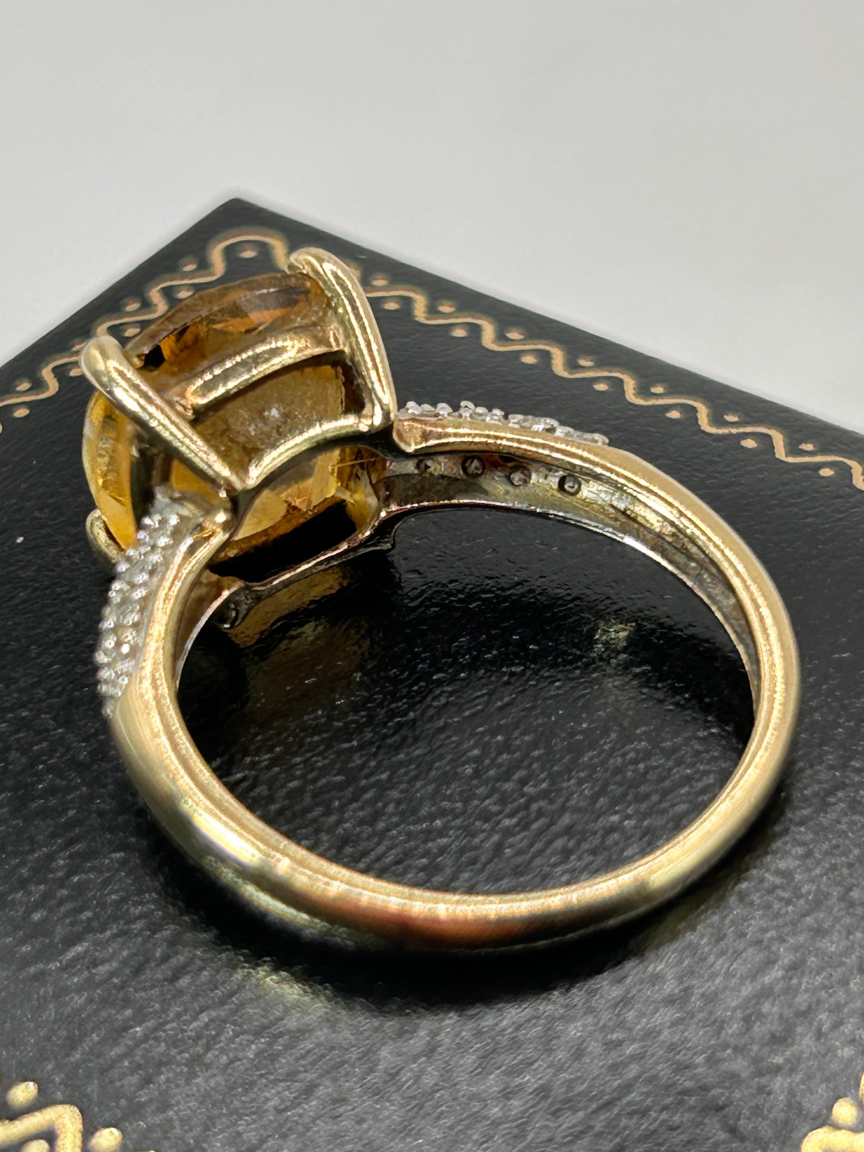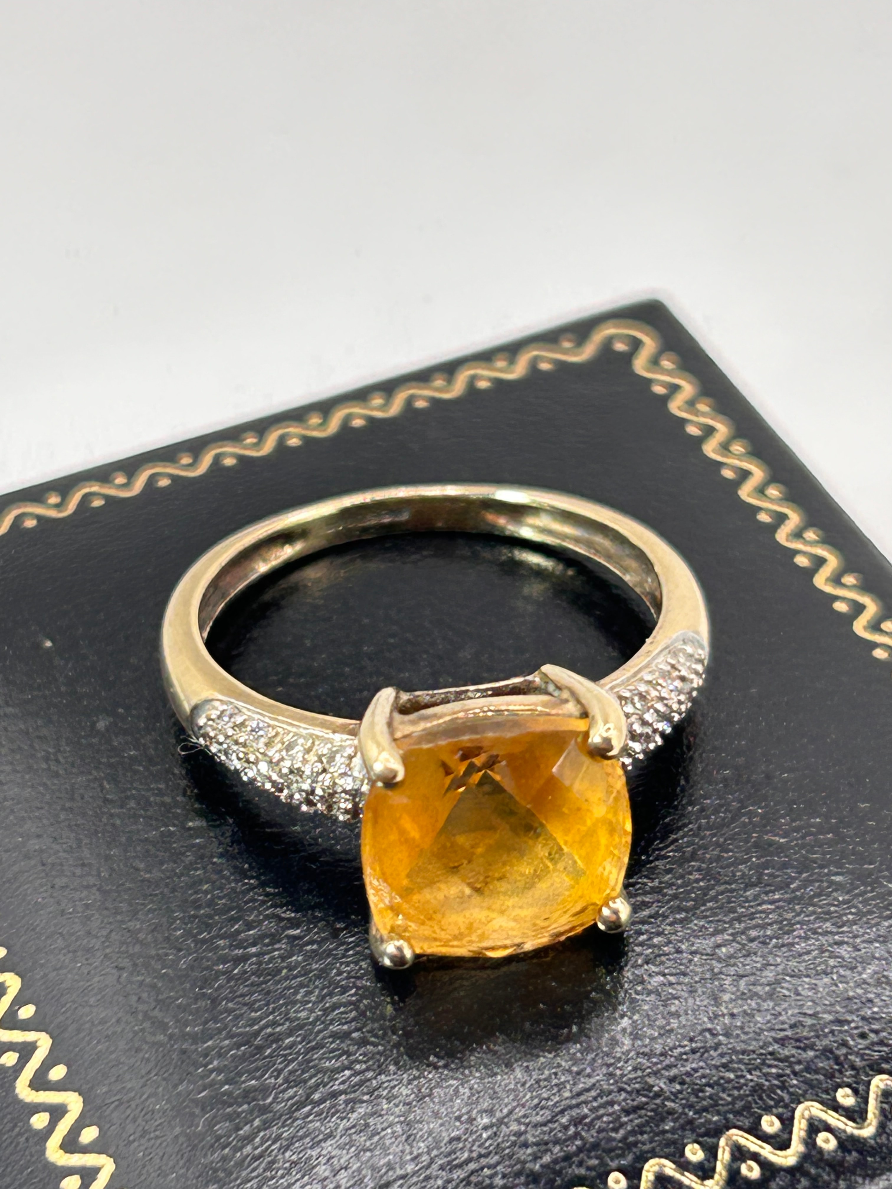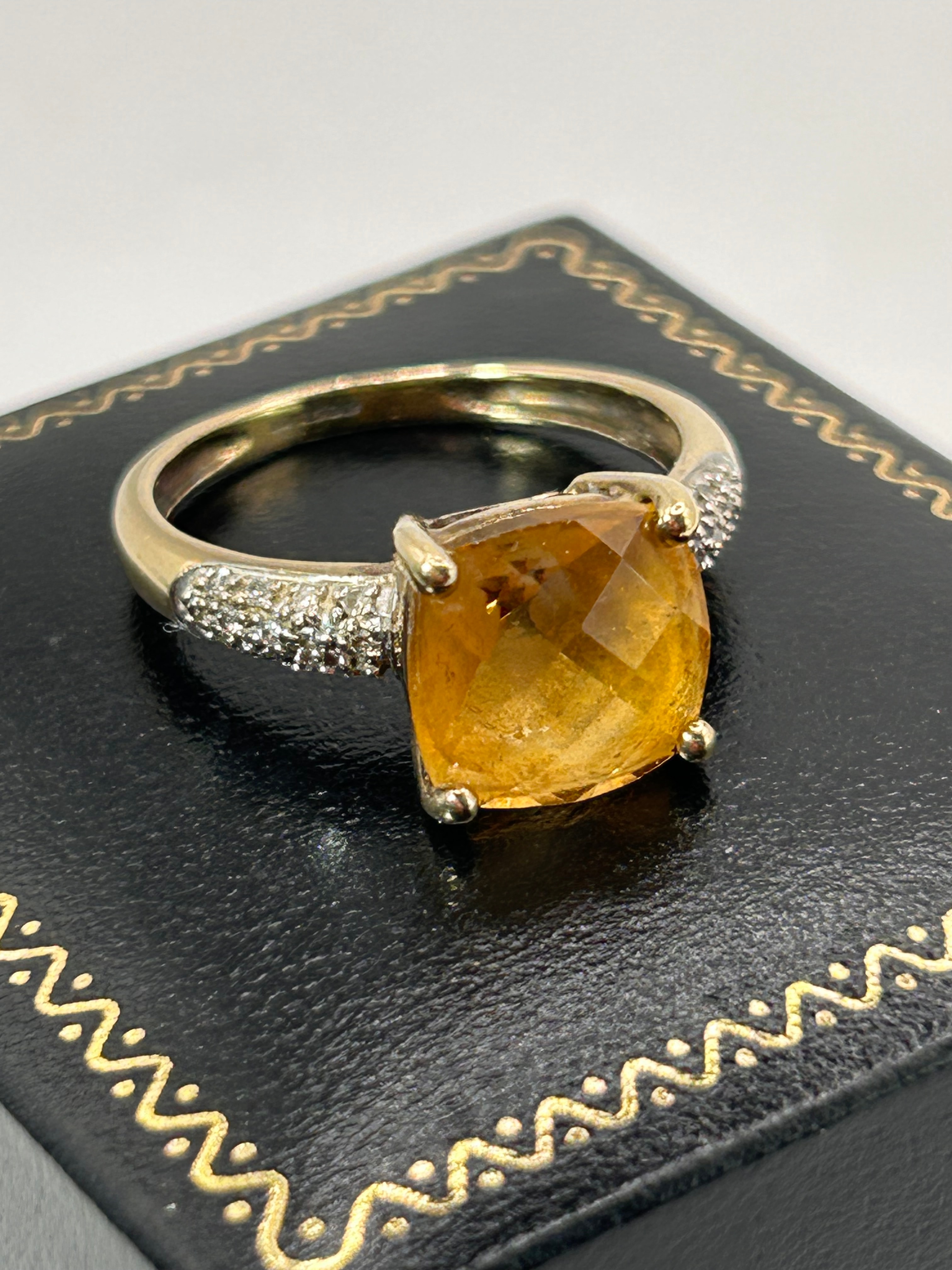 A 9ct gold ring featuring a prominent cushion-cut faceted golden-yellow citrine gemstone, secured in a four-prong setting. The shoulders of the band are adorned with multiple rows of small, round brilliant-cut colorless accent diamonds, set in a pavé style. The ring presents a contemporary design. No visible hallmarks, text, or markings are discernible.