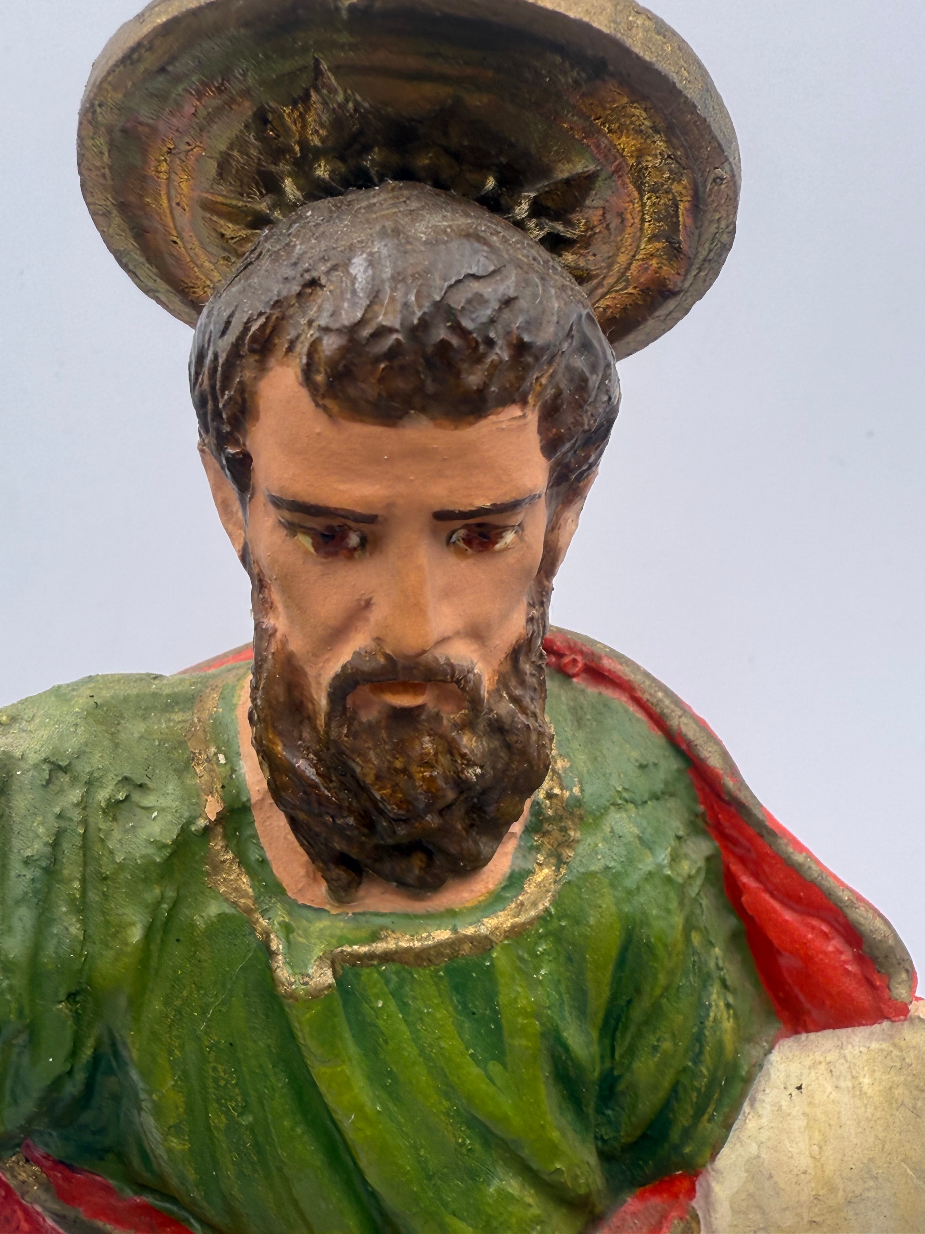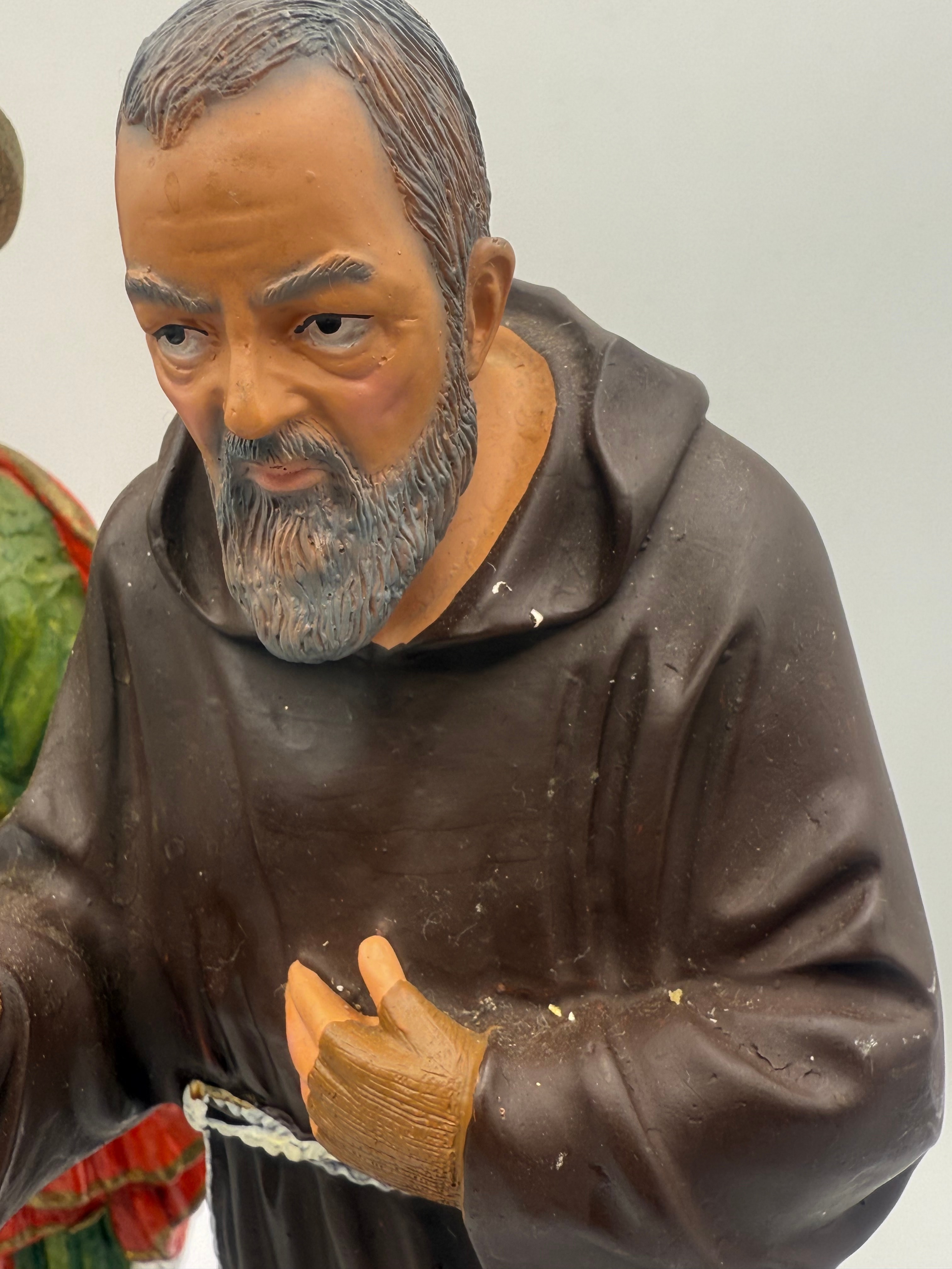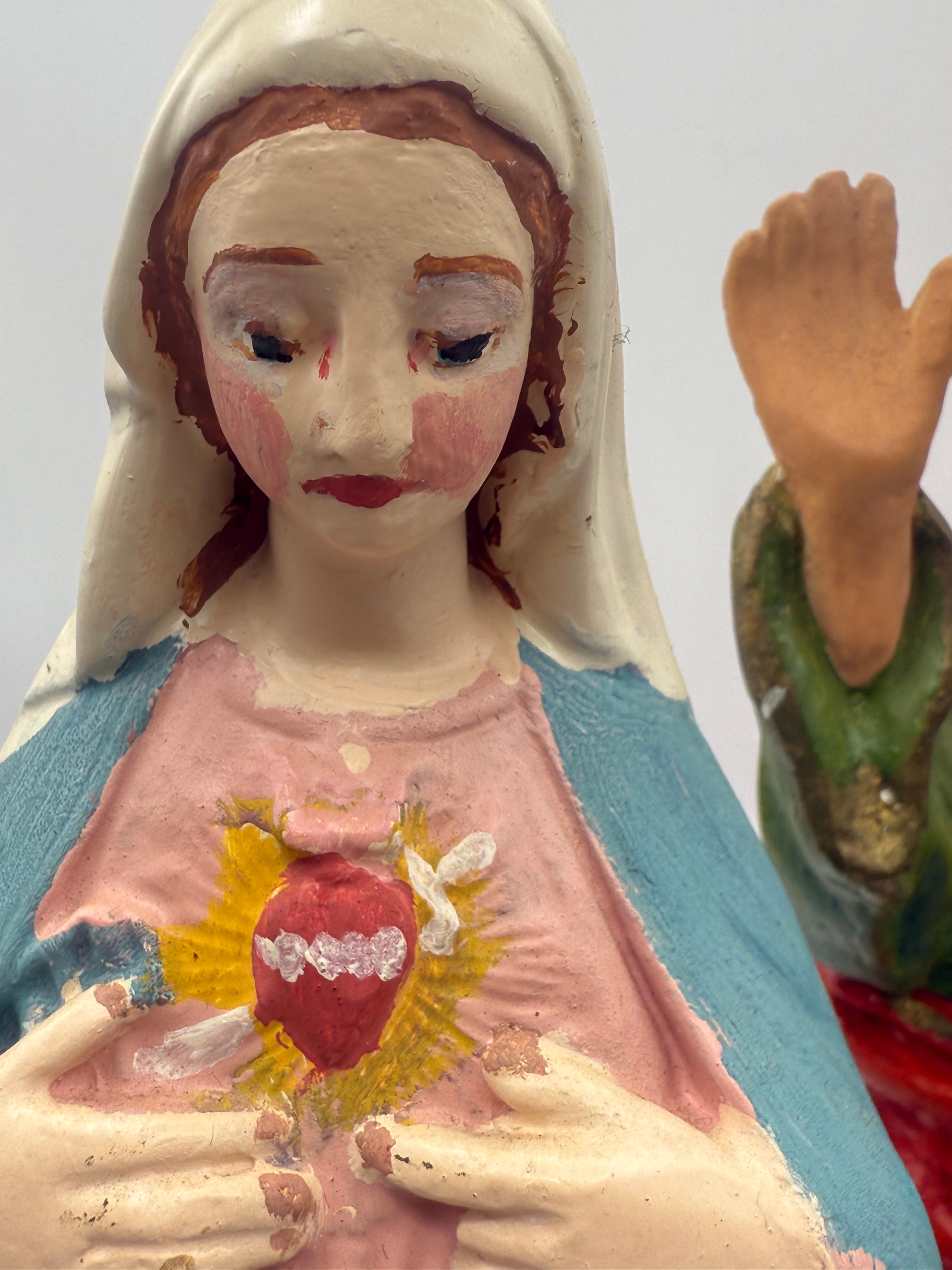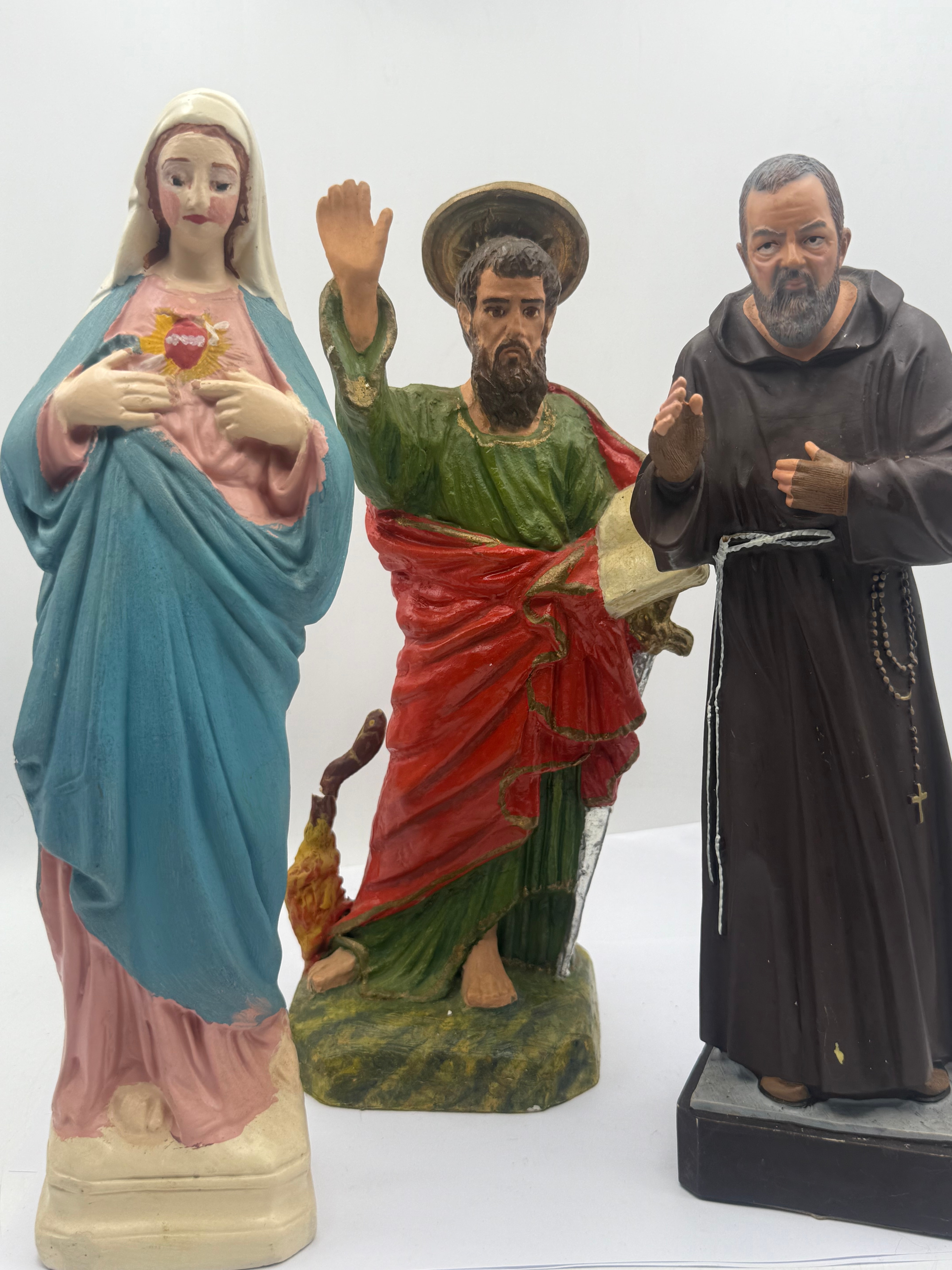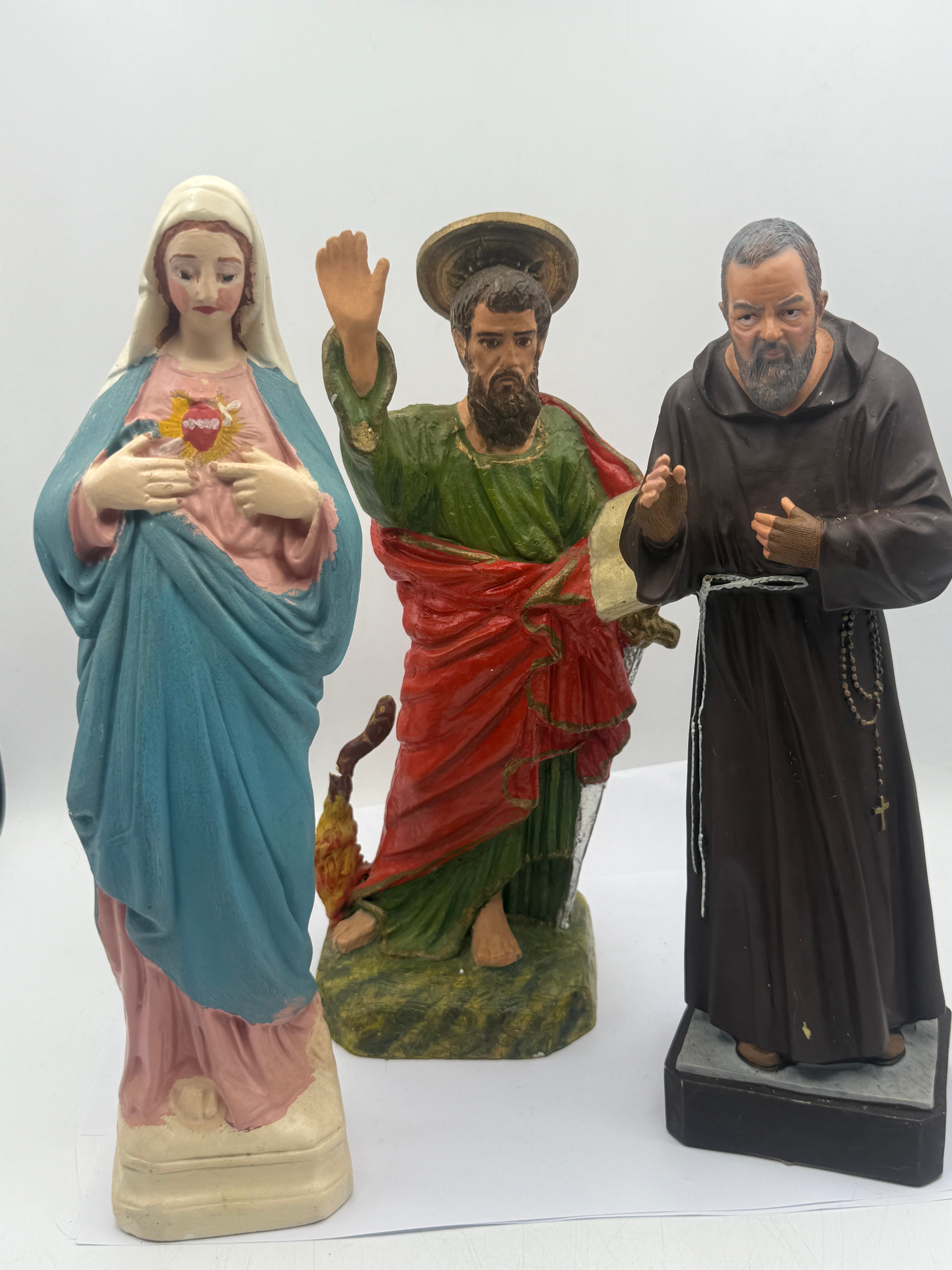 A group of three polychrome painted religious statues, likely crafted from plaster or a composite material. The leftmost figure depicts the Sacred Heart of Mary, shown veiled in white, with a pink tunic and blue cloak, and a flaming Sacred Heart emblem on her chest. The central figure is a bearded male saint, possibly Saint Jude Thaddeus, with a golden halo, wearing green and red robes, holding an open book and a burning torch or lamp. The rightmost figure represents a bearded male friar, consistent with depictions of Saint Francis of Assisi, dressed in a dark brown habit with a rosary hanging from his waist, standing on a rectangular base.