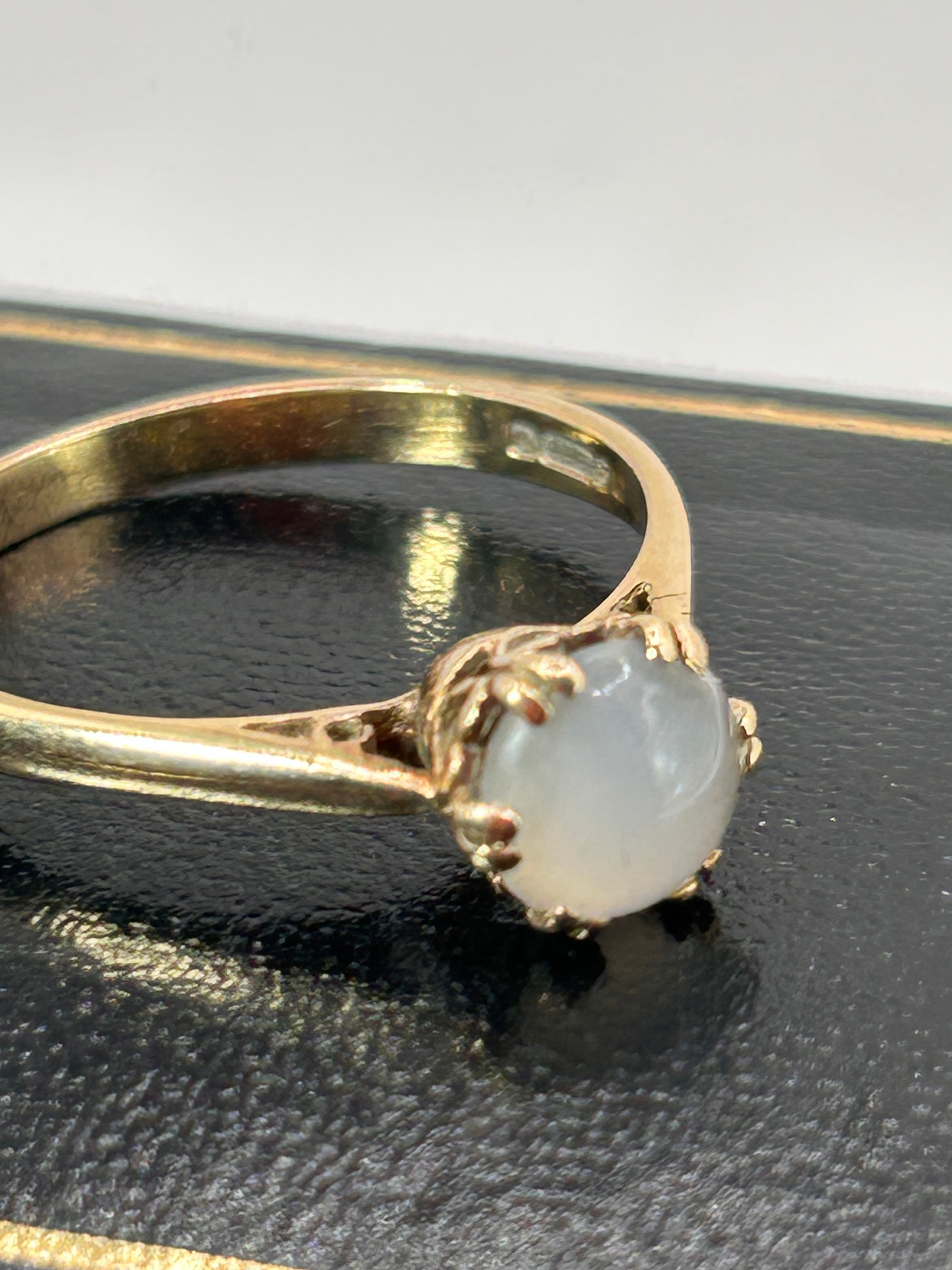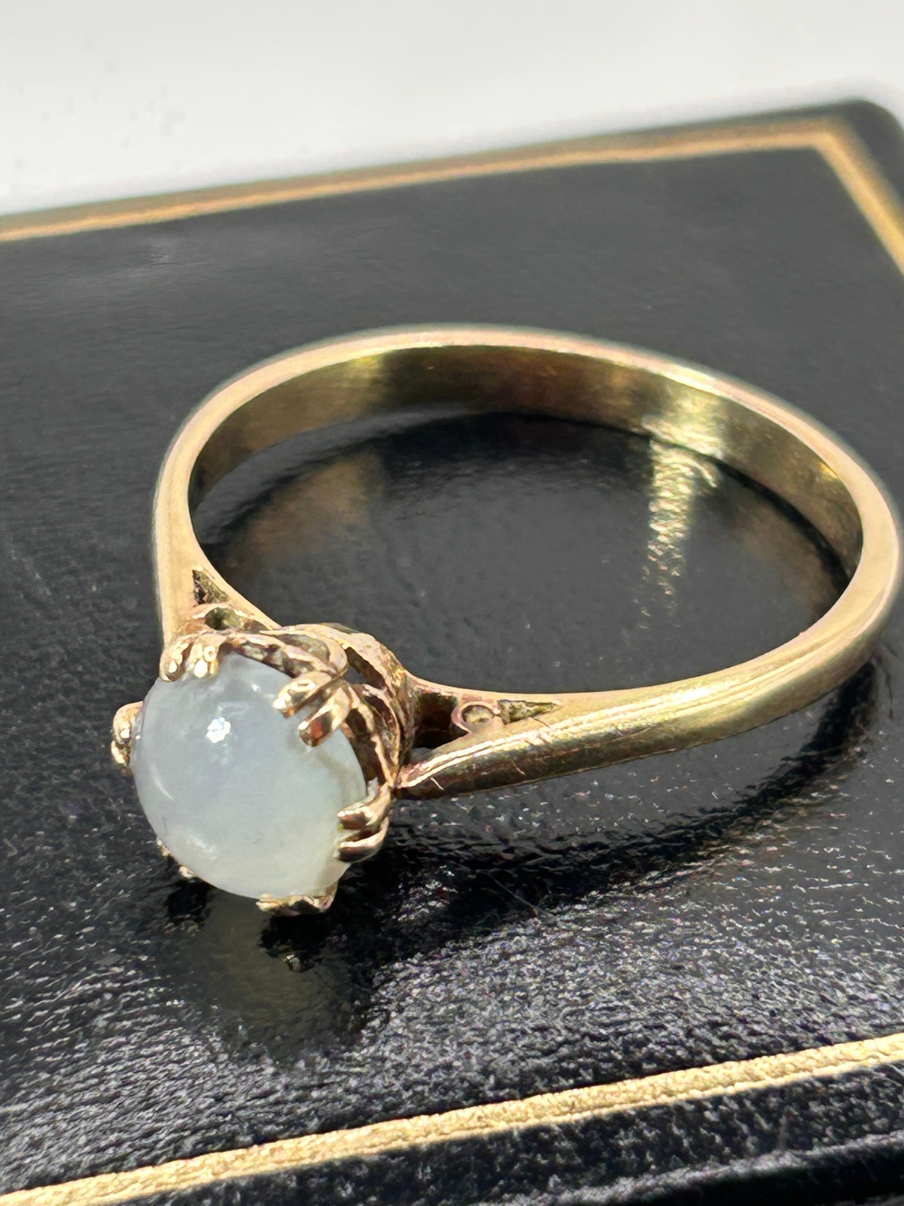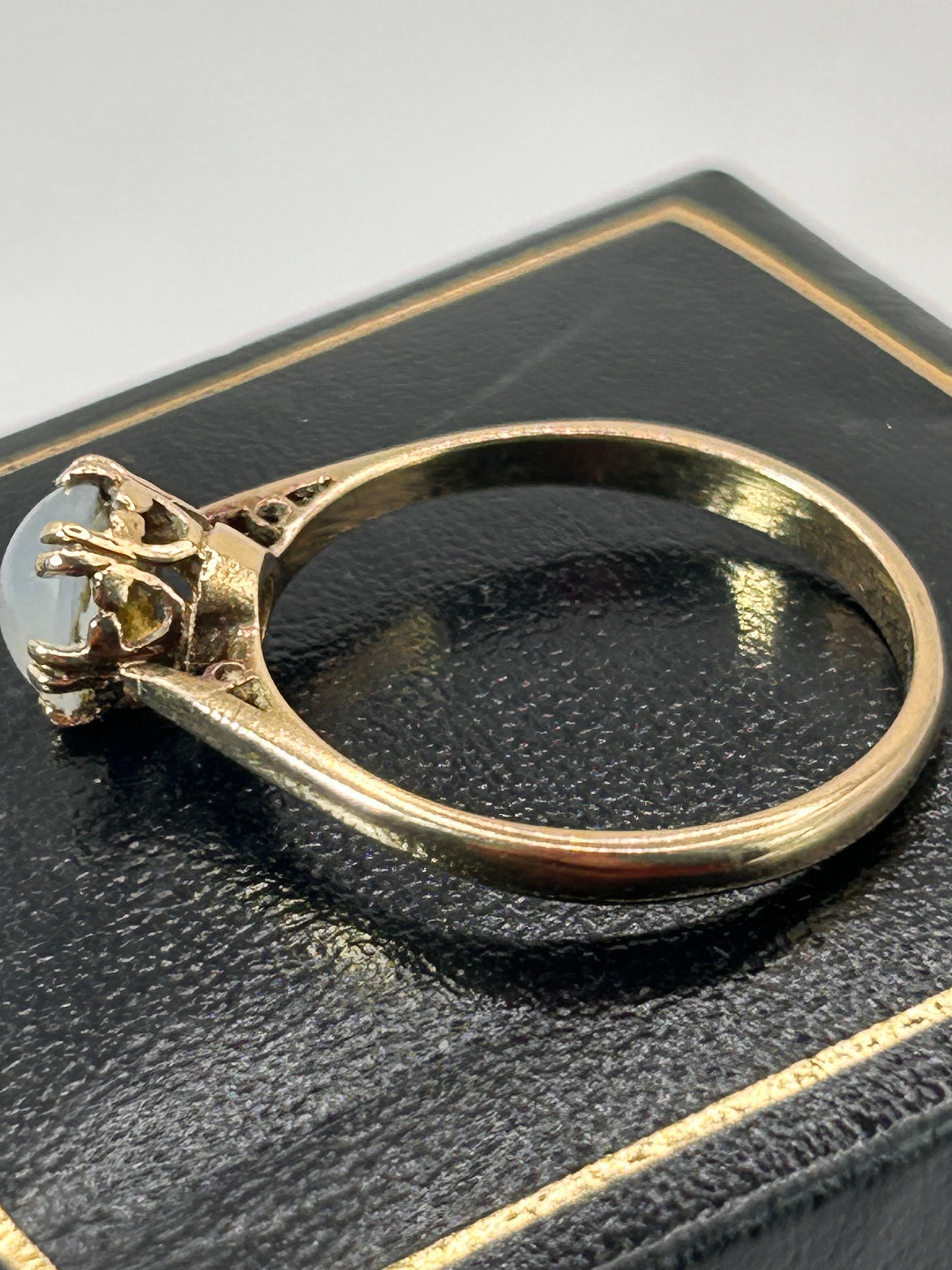 A Victorian 9ct yellow gold ring featuring a central oval-shaped, milky white/grey translucent cabochon moonstone, held securely by a multi-claw setting. The ring’s shoulders are adorned with intricate openwork scroll or stylized leaf details, tapering into a plain, polished band.