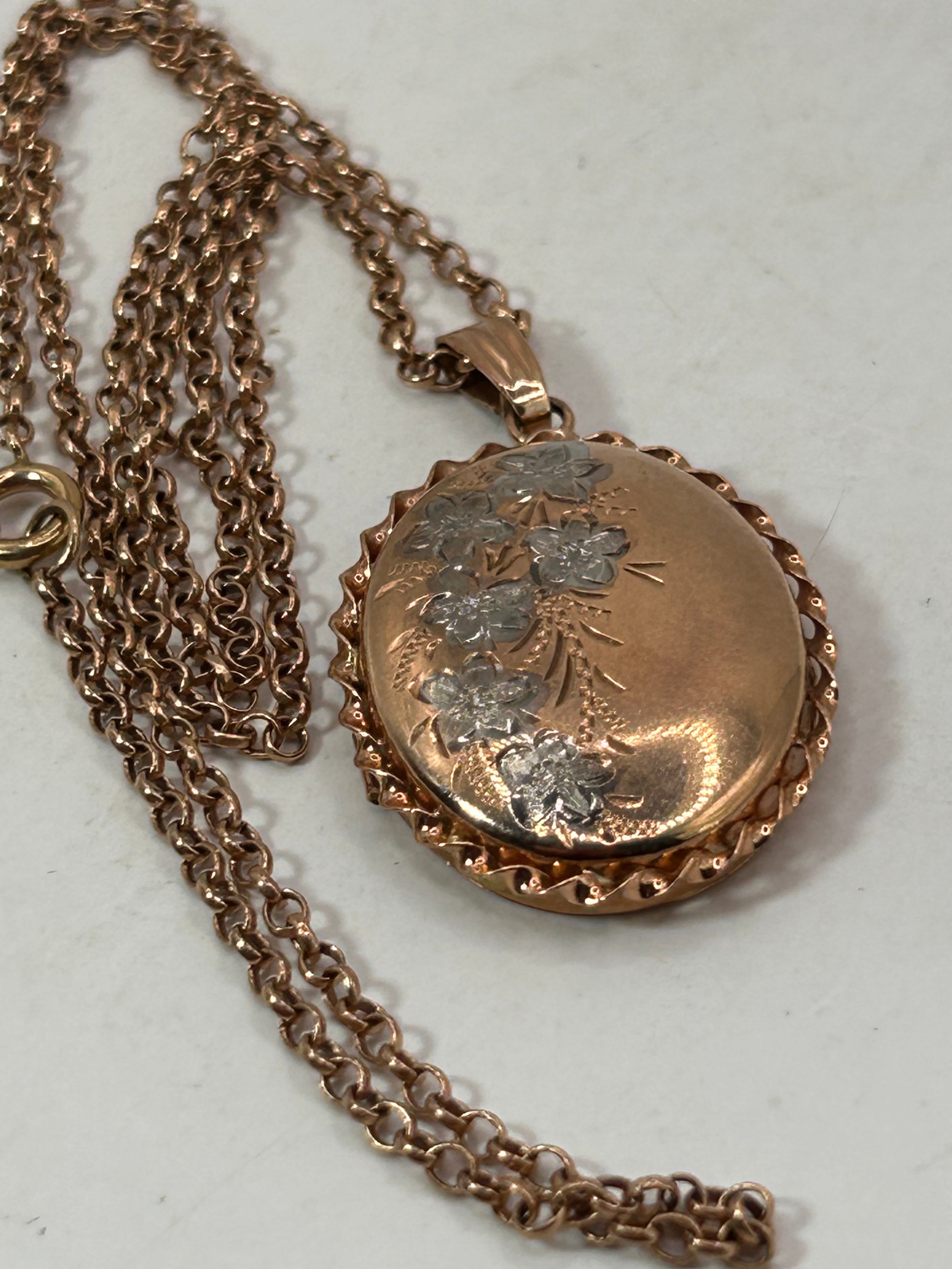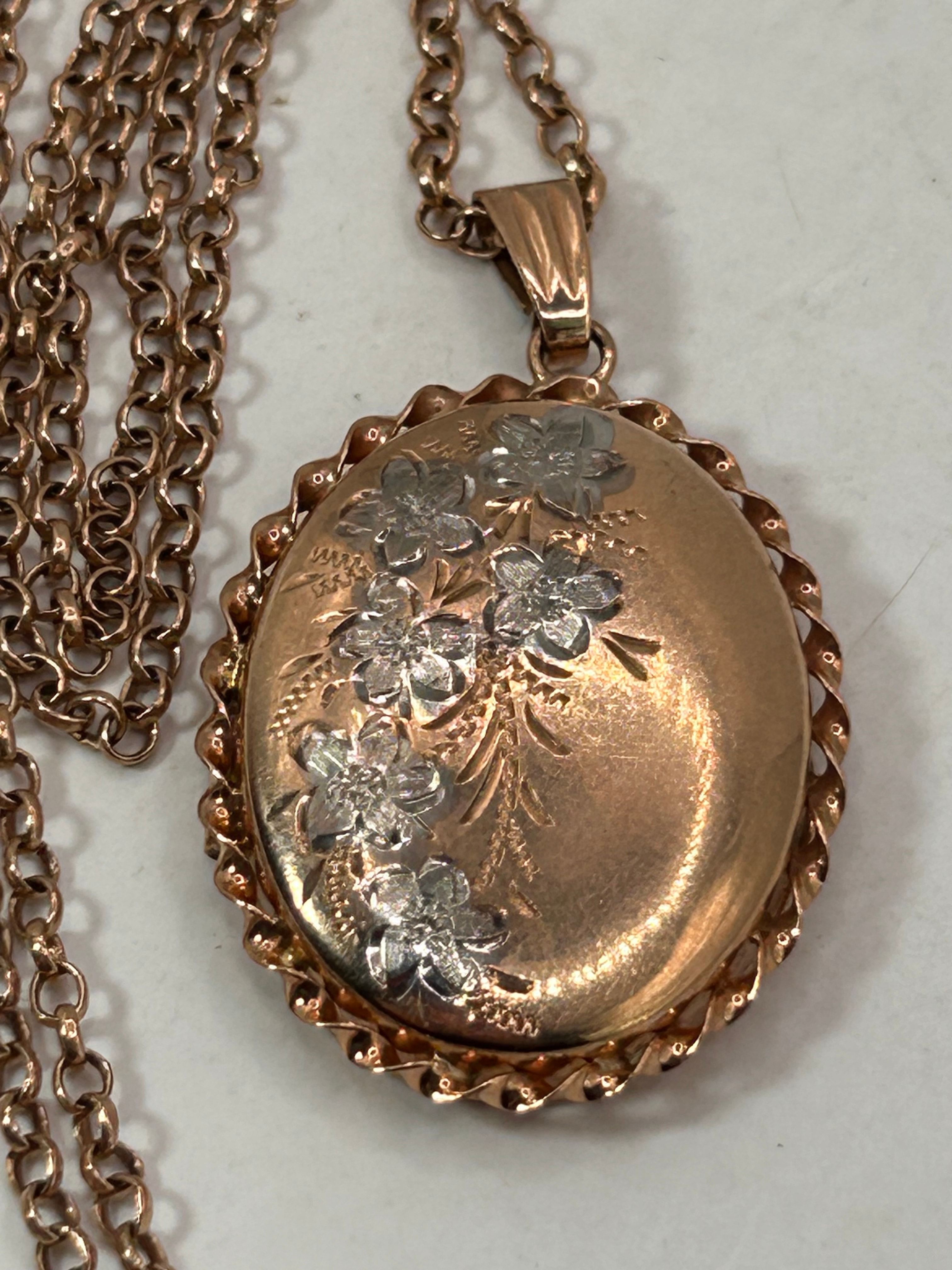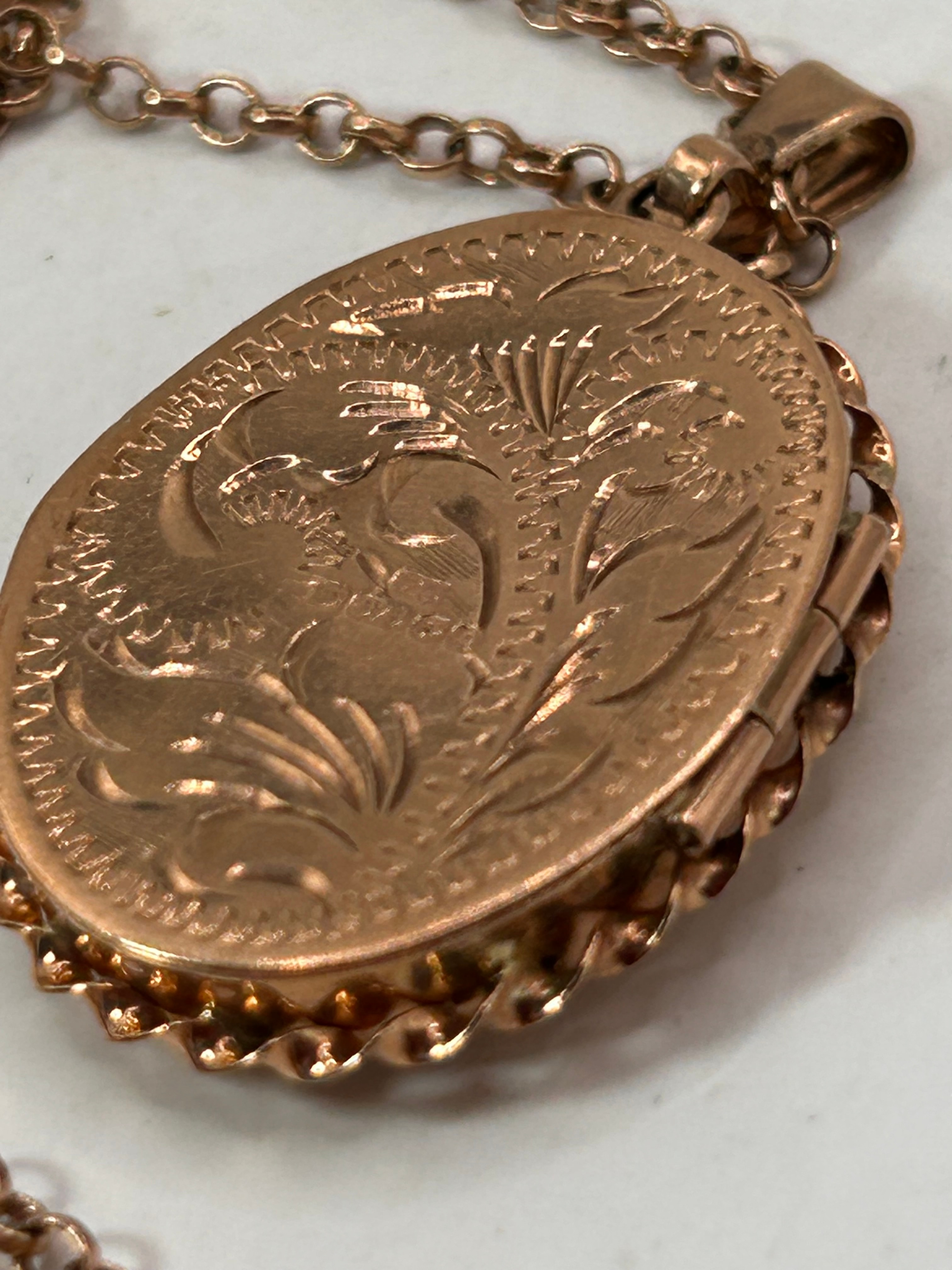 A 9ct Rose Gold oval locket, featuring a hand-engraved floral spray design on the front and intricate scrollwork engraving on the reverse. The locket is framed by a twisted wire edge. It is accompanied by an 18-inch chain comprised of numerous small, uniform oval links.