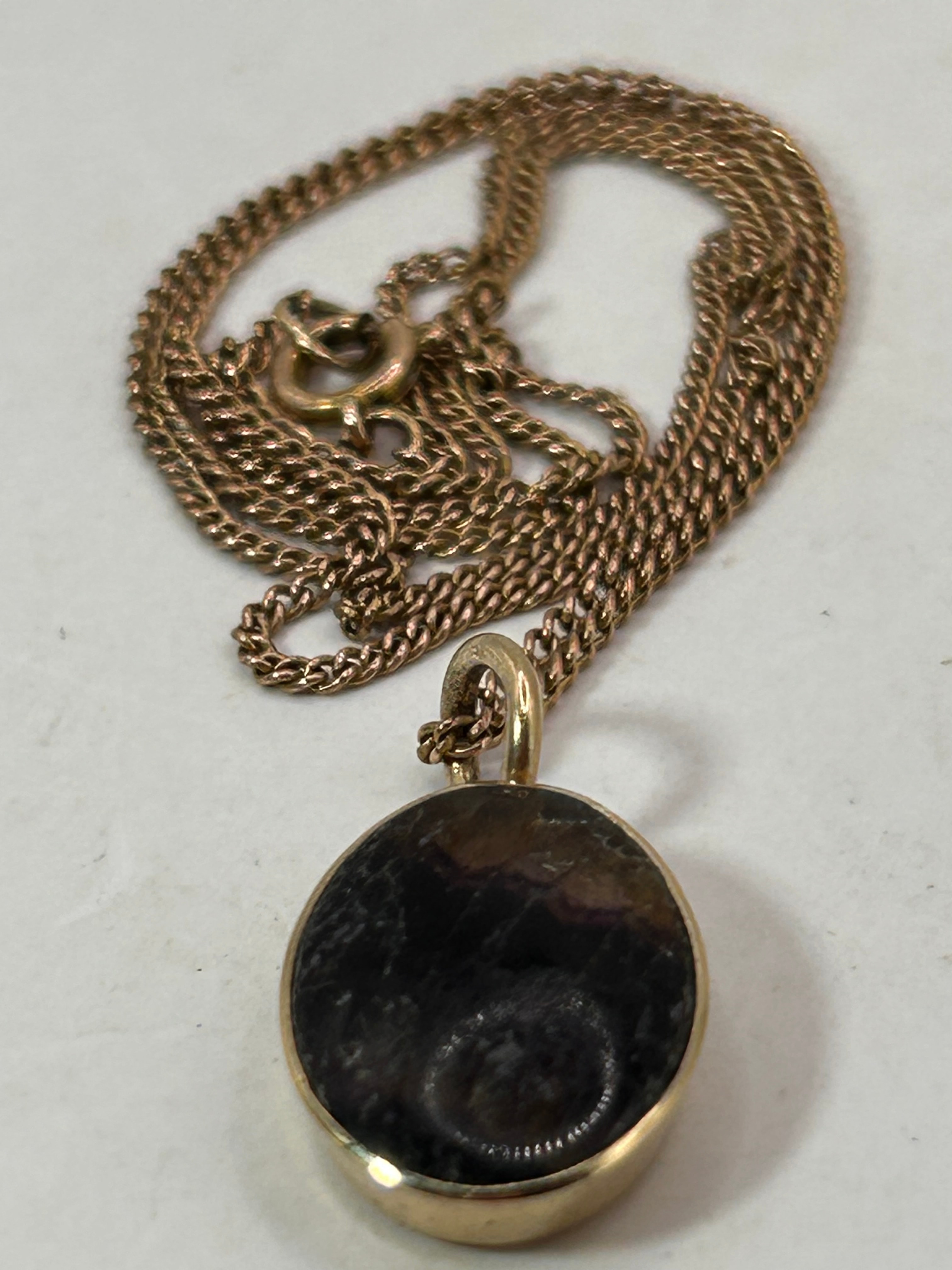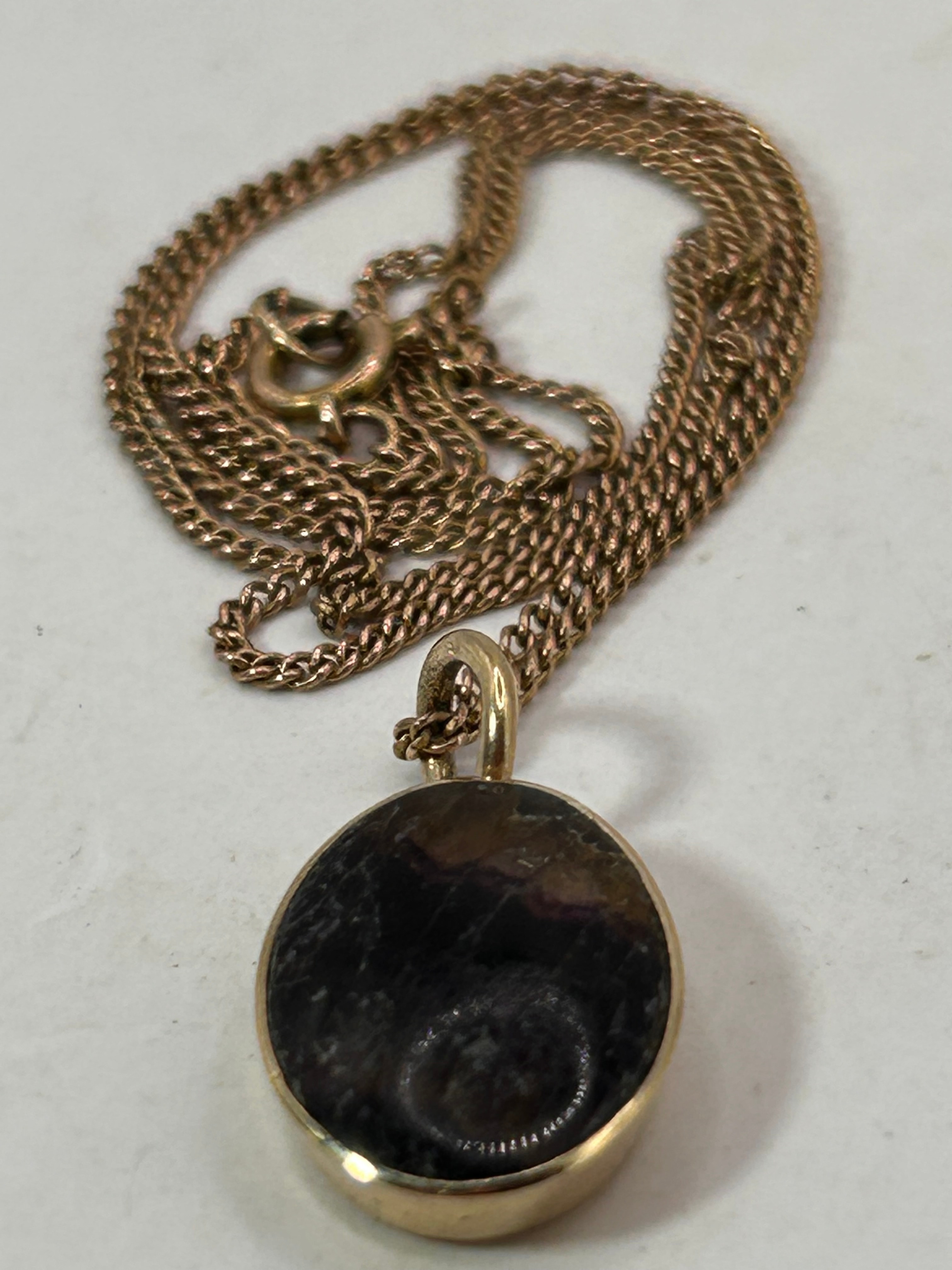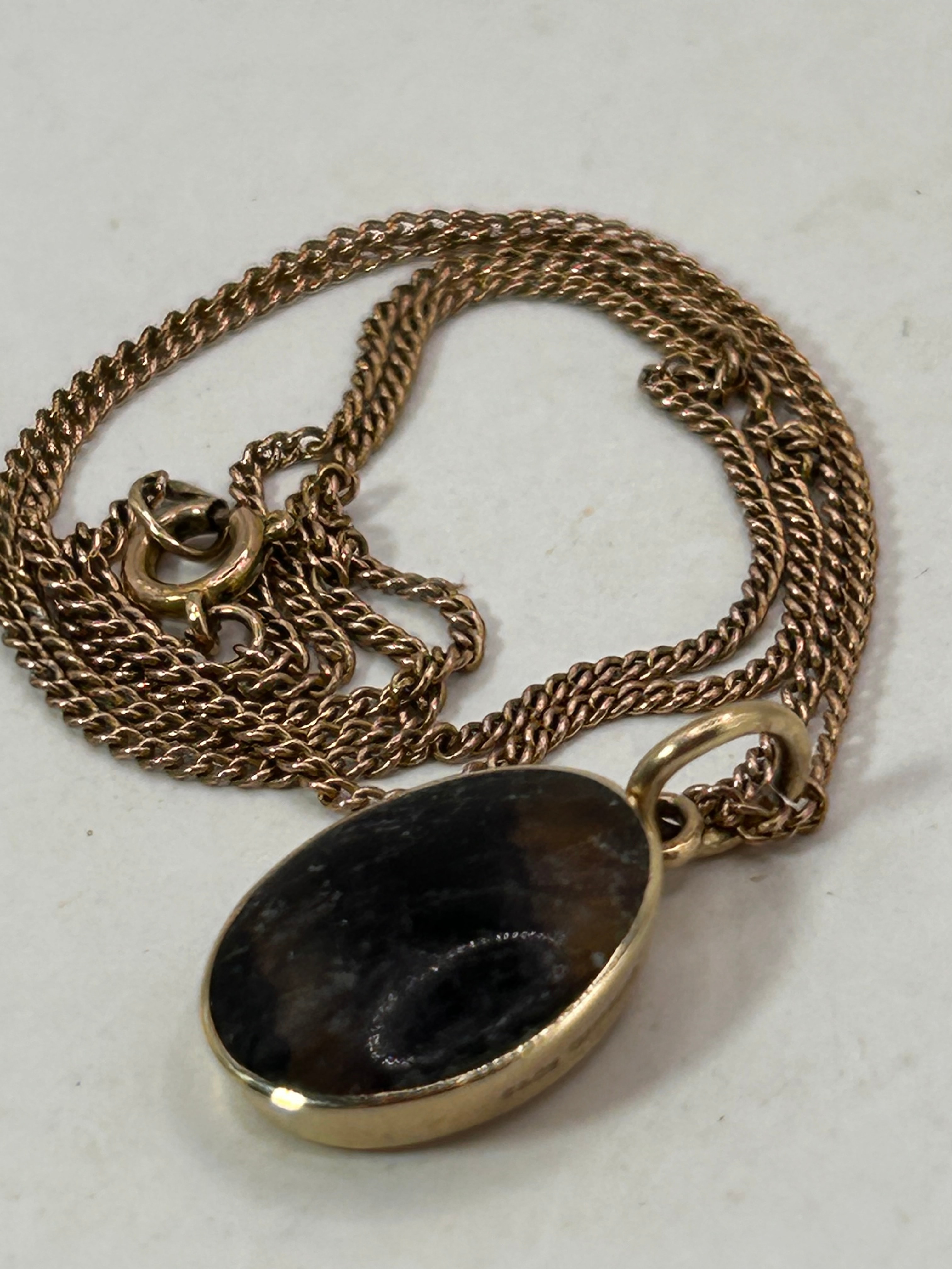 A 9ct gold necklace featuring an oval-shaped pendant set with a Blue John cabochon. The pendant features a smooth, bezel-set cabochon stone displaying a dark, mottled, and somewhat translucent appearance with shades of brown, black, and deep purple or gray, consistent with Blue John. The yellow-toned metal link chain is fitted with a spring-ring clasp. No visible hallmarks or manufacturer’s markings are discernible.