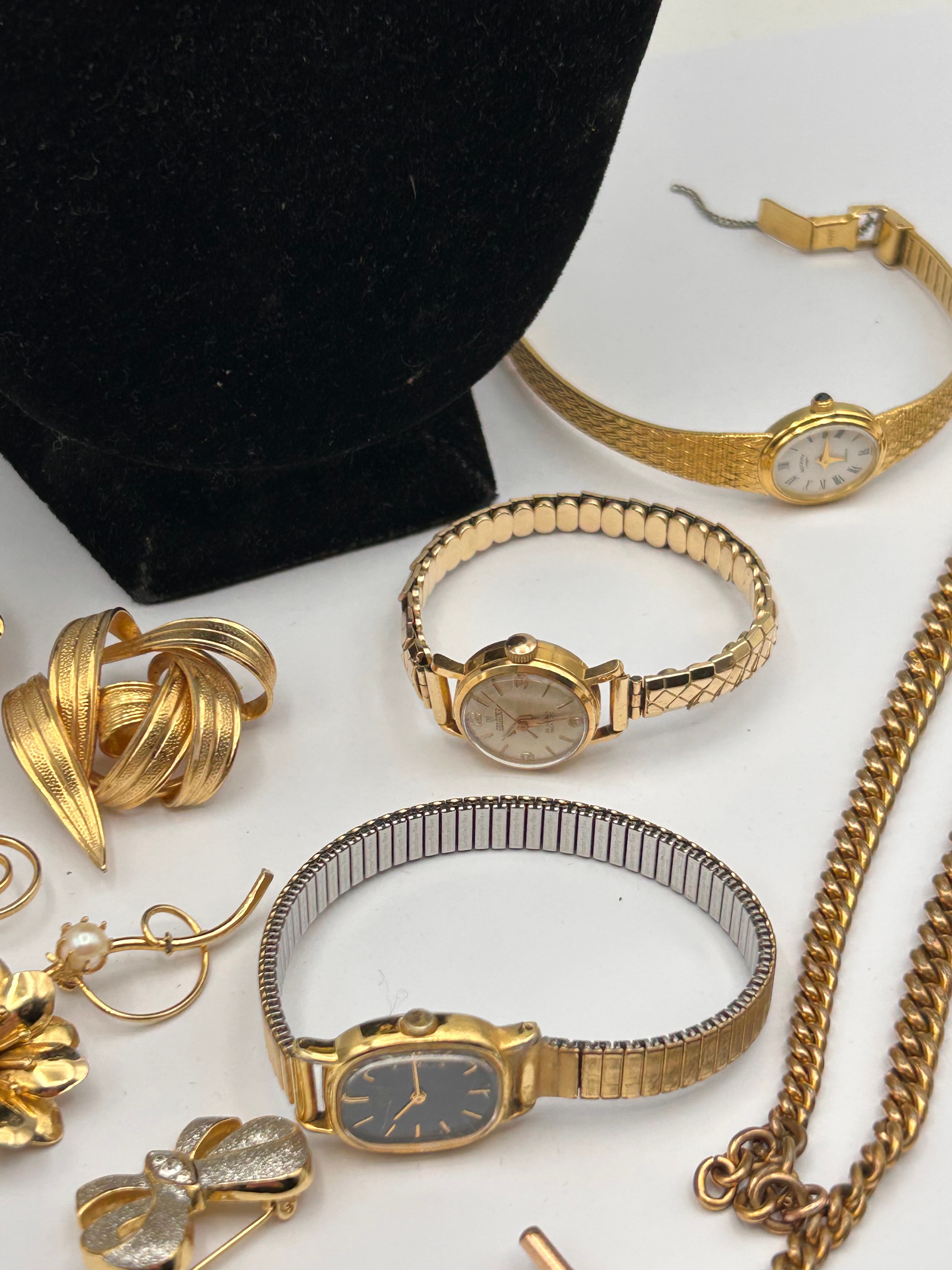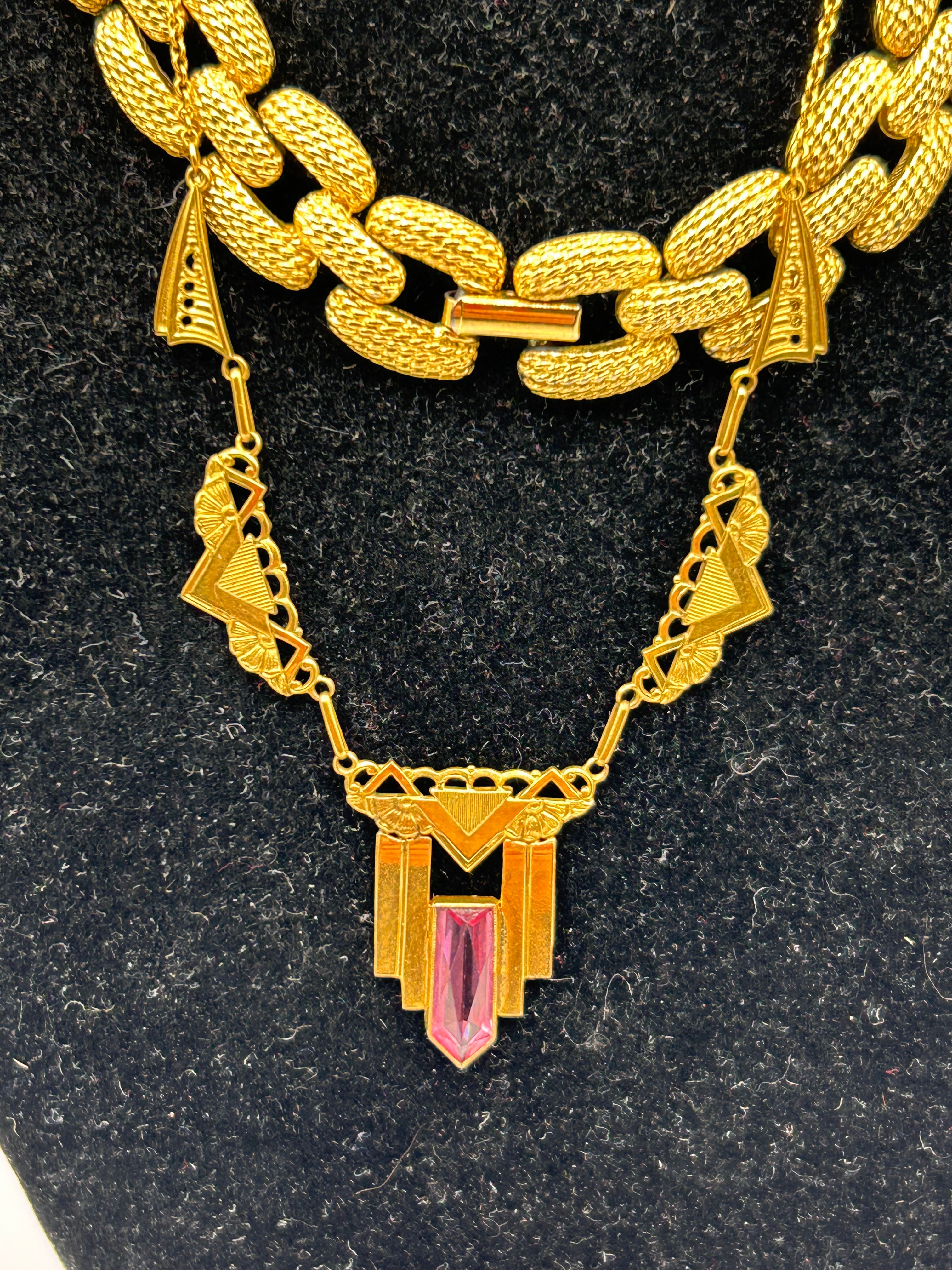 This lot presents a collection of women’s jewelry,The collection also includes a second gold-toned Art Deco-inspired geometric pendant necklace with a pinkish-purple faceted stone, two thinner gold-toned curb chains, four gold-toned brooches (including a rose, an abstract swirl, a floral cluster with a faux pearl, and a bow with clear stones), and three women’s gold-toned wristwatches. One round-faced watch with a mesh-style bracelet is partially visible, marked “BUL[OVA]” and “17 JEWELS” on its dial. A rectangular-faced watch with a stretch band is marked “GENEVA” on its face. The items primarily suggest a mid-20th century to contemporary aesthetic.