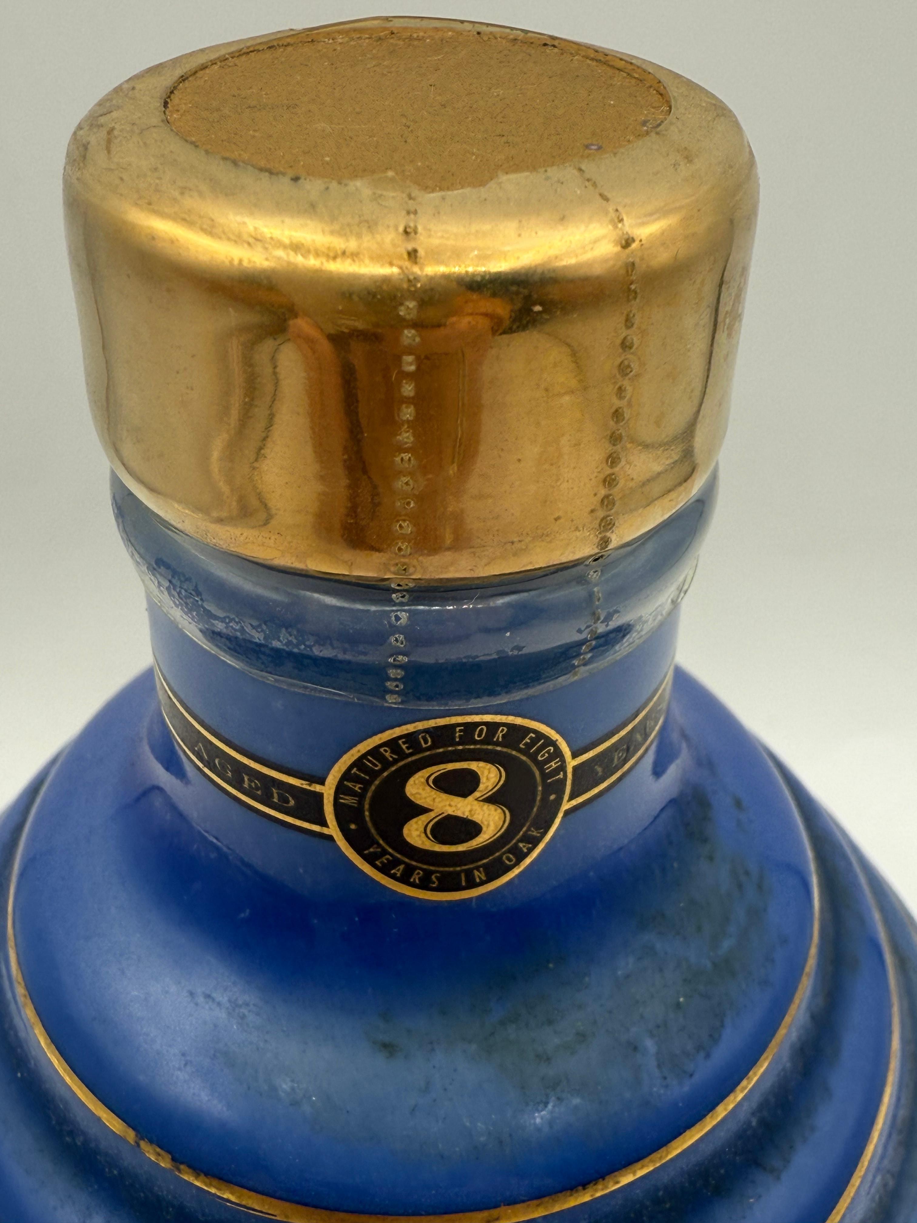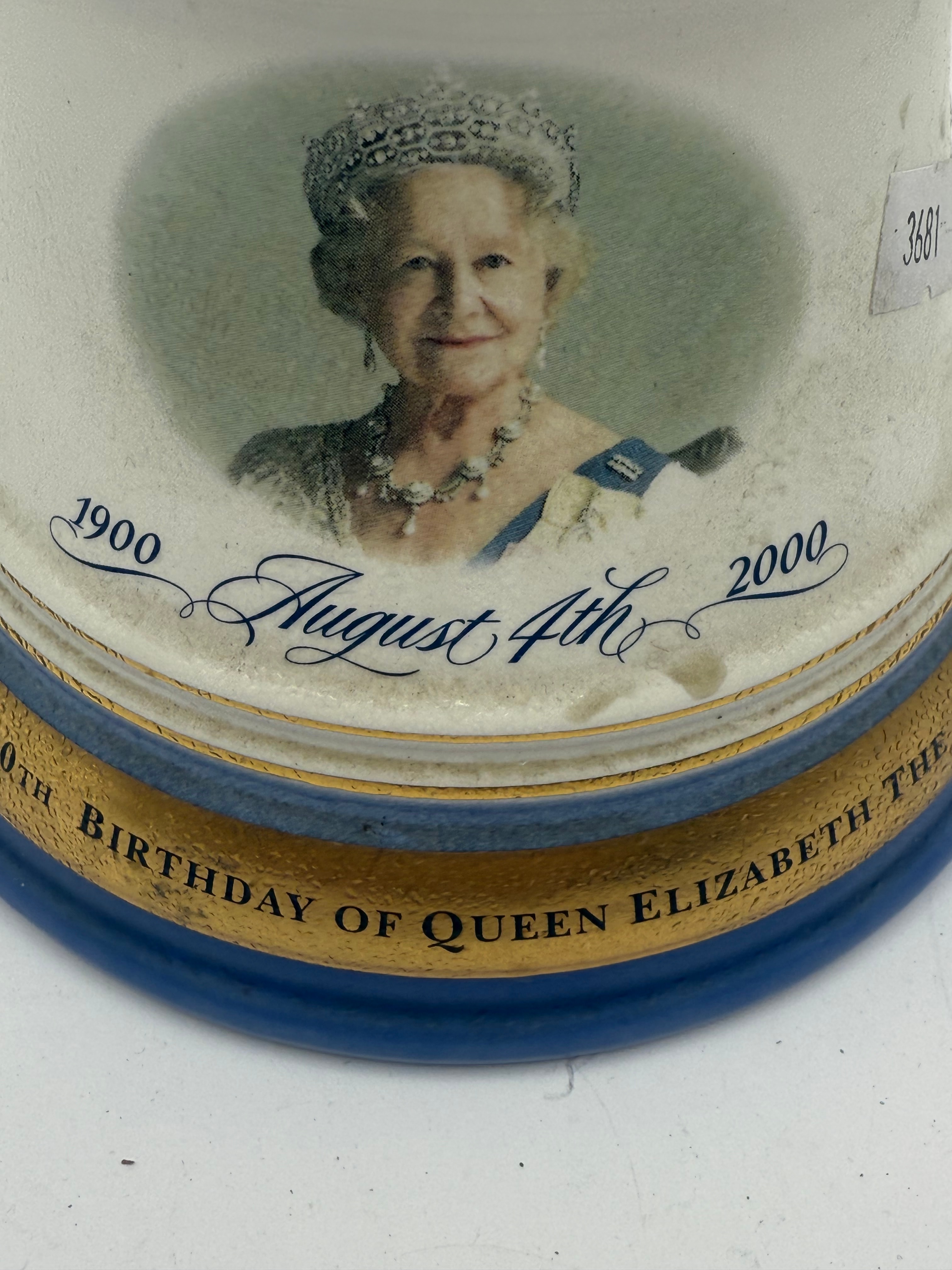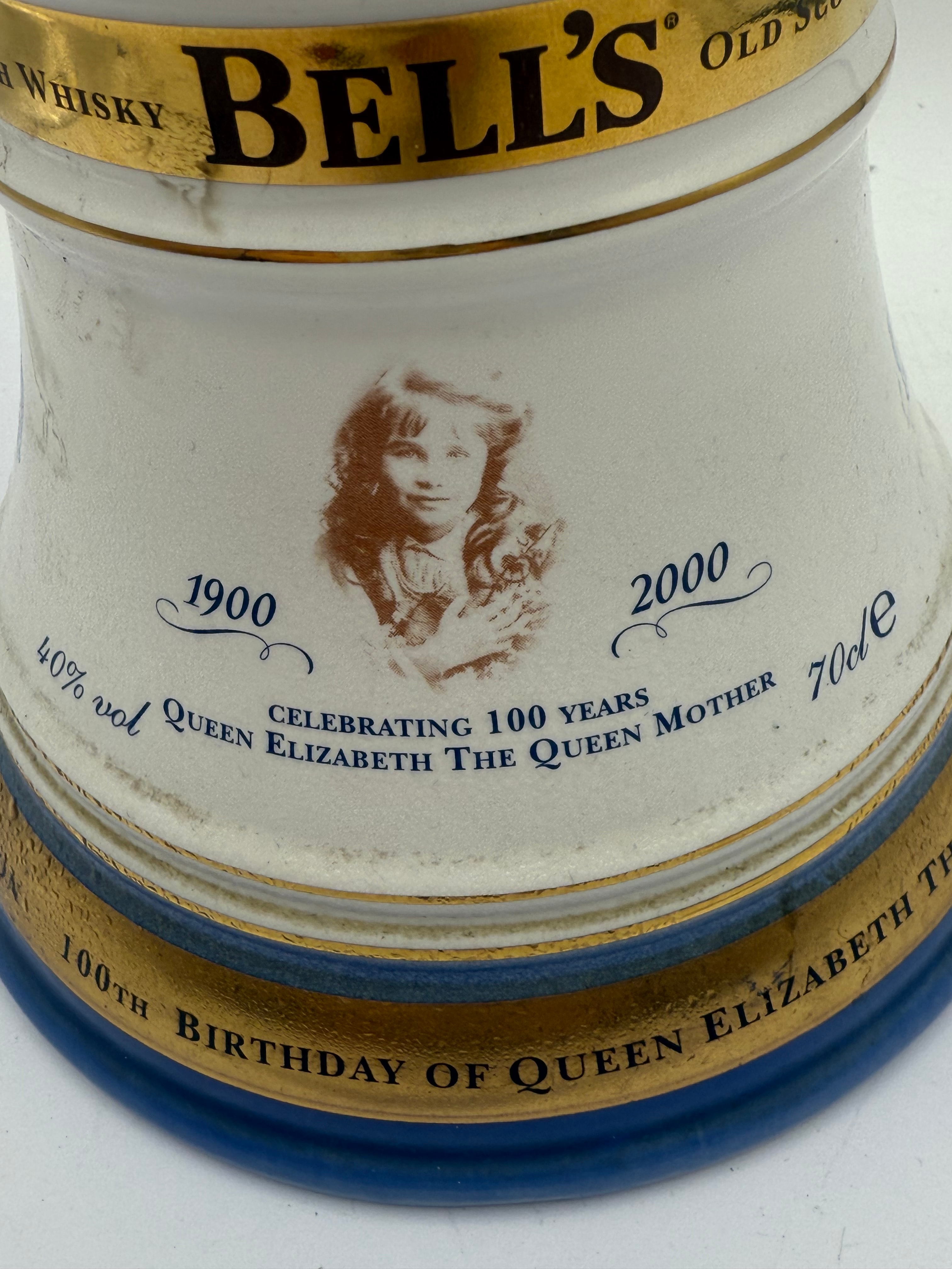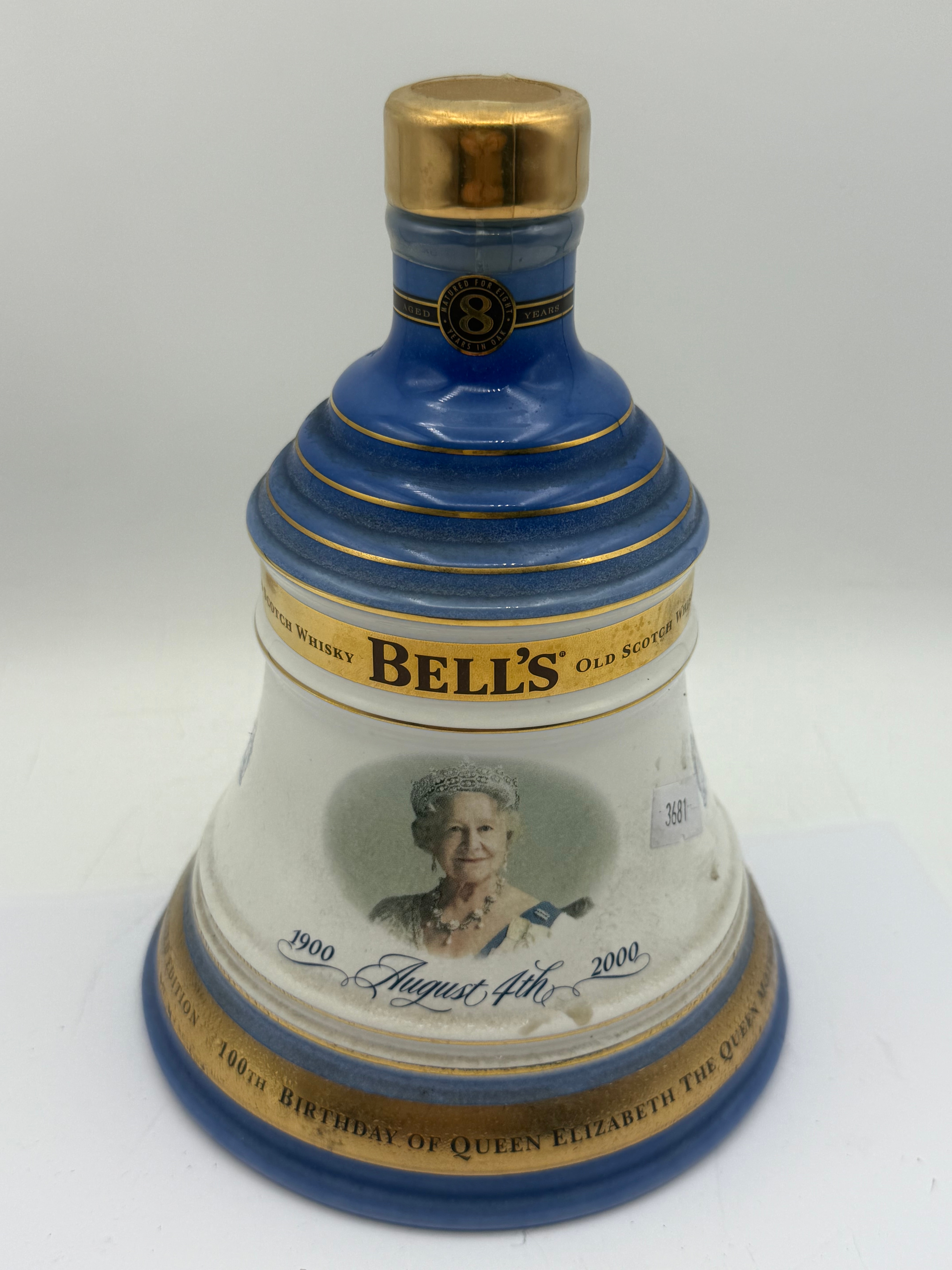 A Bell’s Blended Scotch Whisky ceramic decanter, commemorating the “100TH BIRTHDAY OF QUEEN ELIZABETH THE QUEEN MOTHER,” dated “1900 August 4th 2000.” The bell-shaped decanter features a predominantly blue and white body with gold accent bands and a metallic gold-toned screw cap. It displays portraits of Queen Elizabeth The Queen Mother as both a young girl and an adult in ceremonial dress. The decanter contains whisky “AGED NATURALLY FOR EIGHT YEARS IN OAK” and is specified as “40% vol” and “70cl e.” A sticker with the number “3681” is present on the body.
