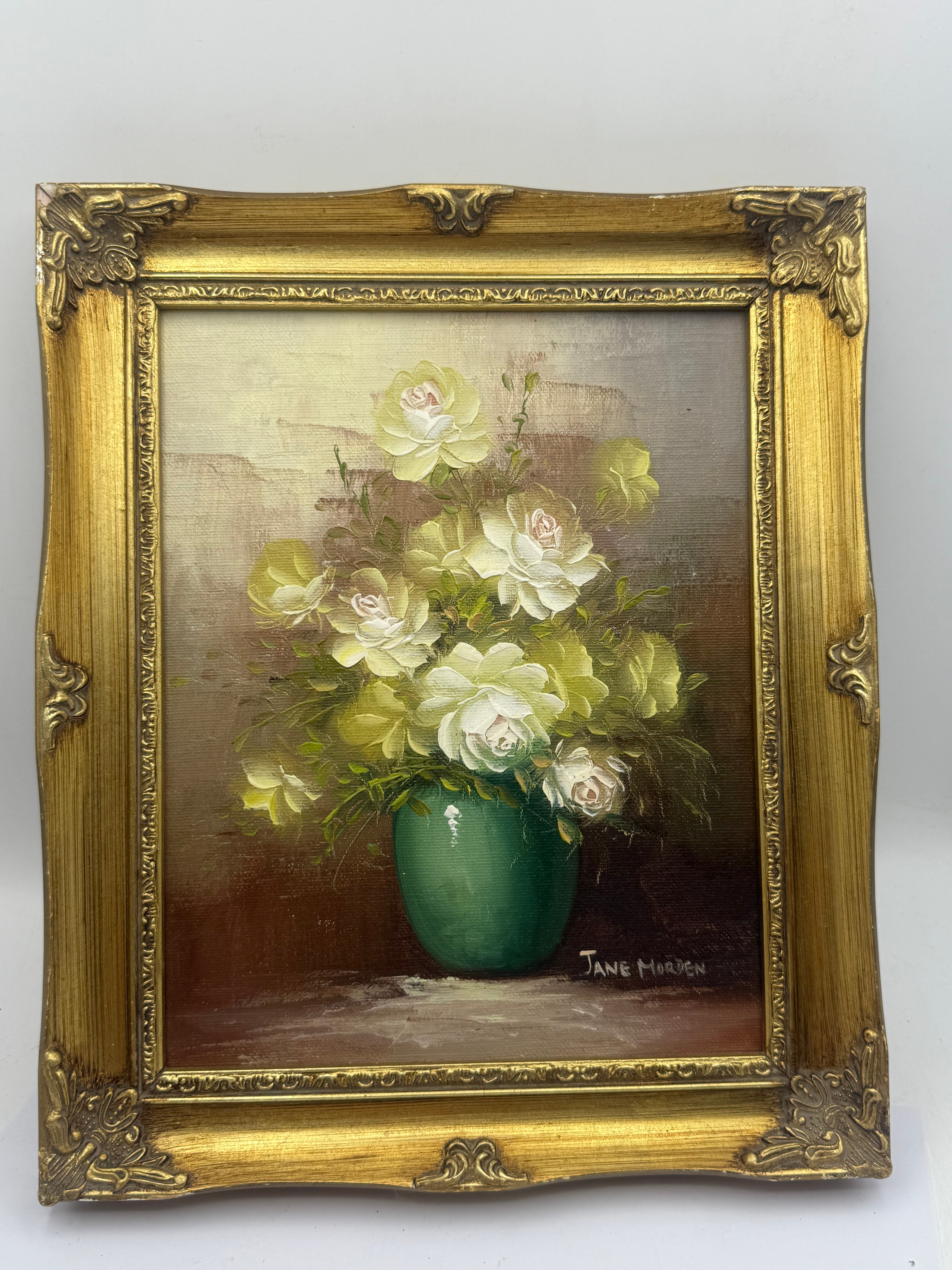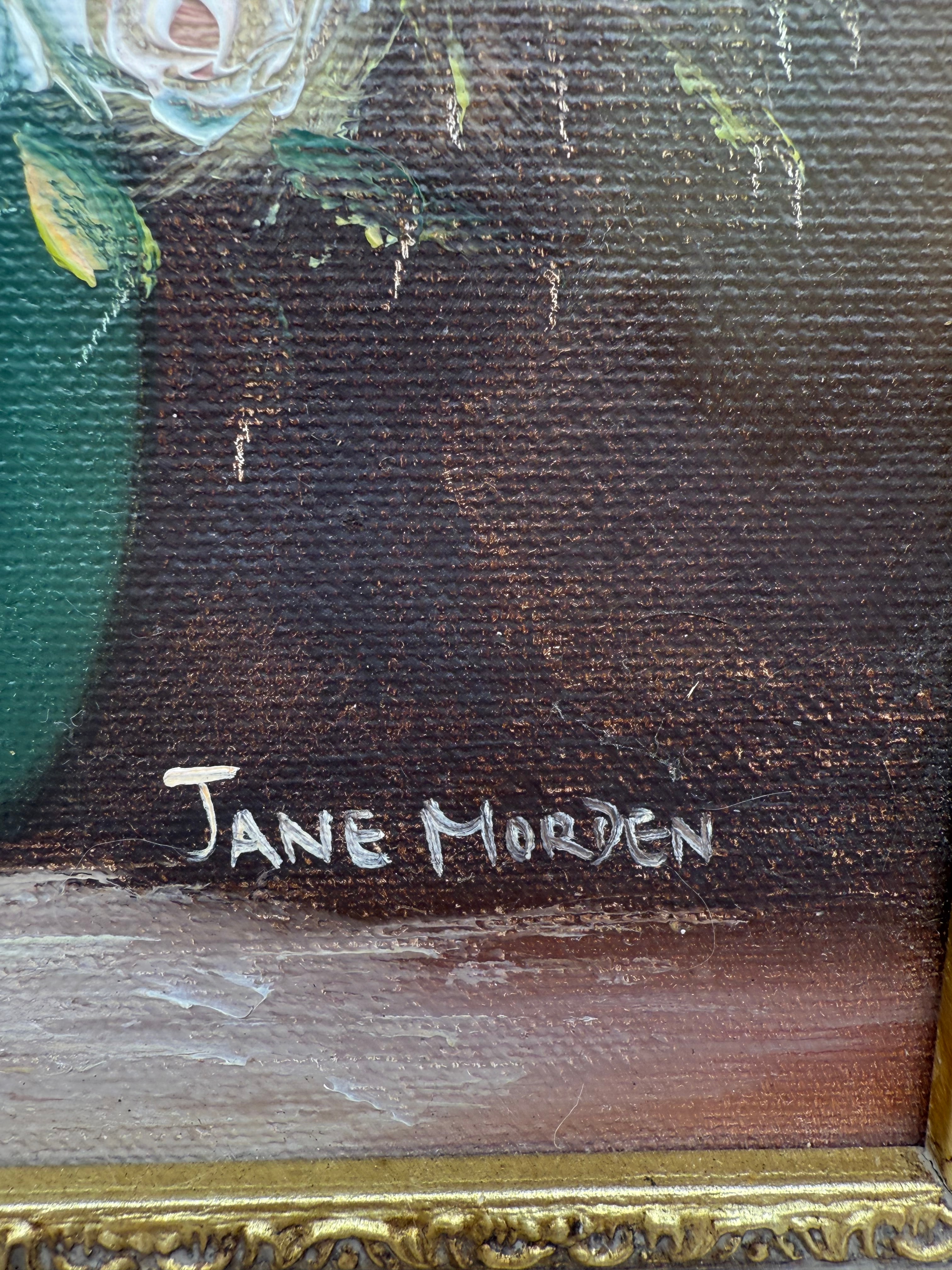 An oil on canvas painting by Jane Morden, depicting a vibrant floral still life of pale yellow and white roses arranged in a green vase. The painting features visible brushstrokes, indicating an impasto technique in areas, and is signed ‘JANE MORDEN’ in the lower right corner. It is presented in an ornate, decorative frame, possibly giltwood or composite.