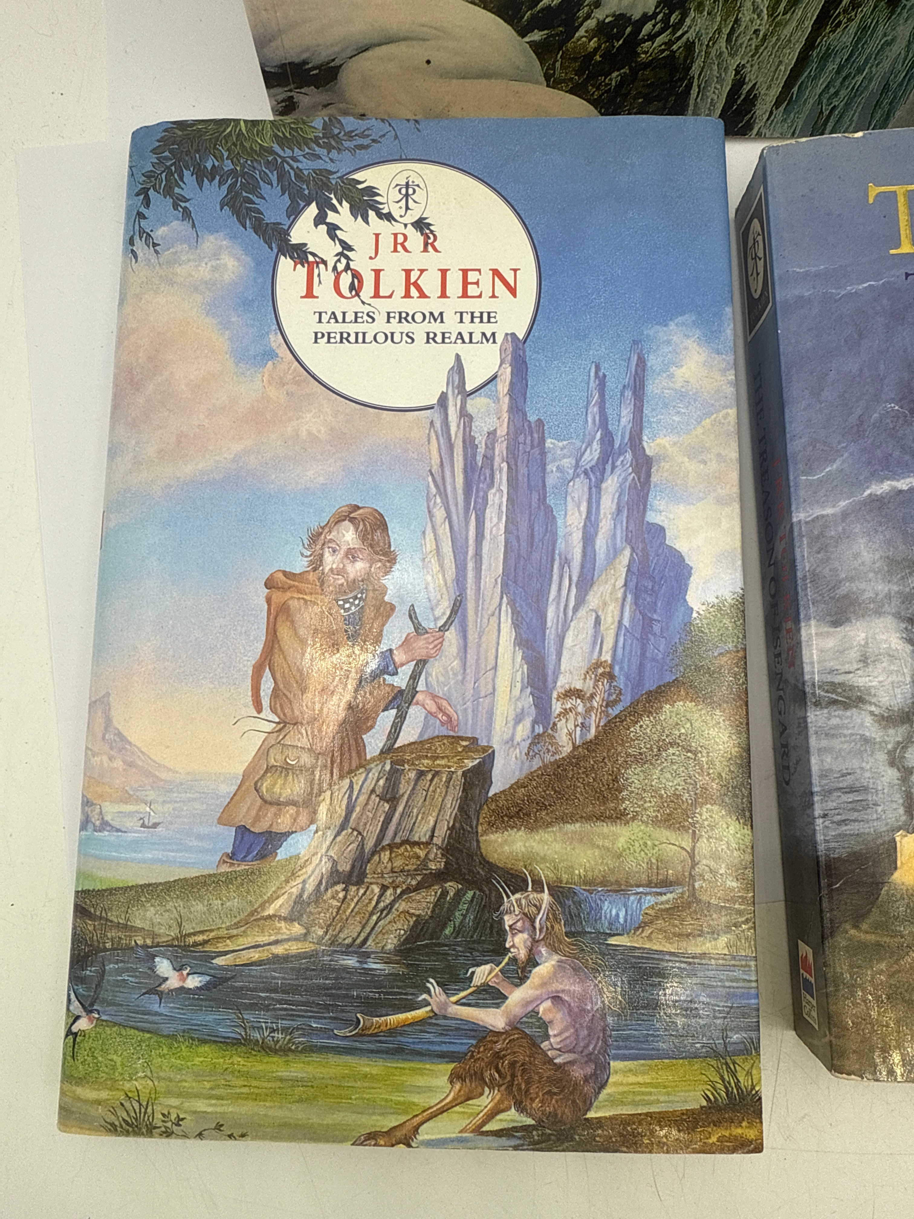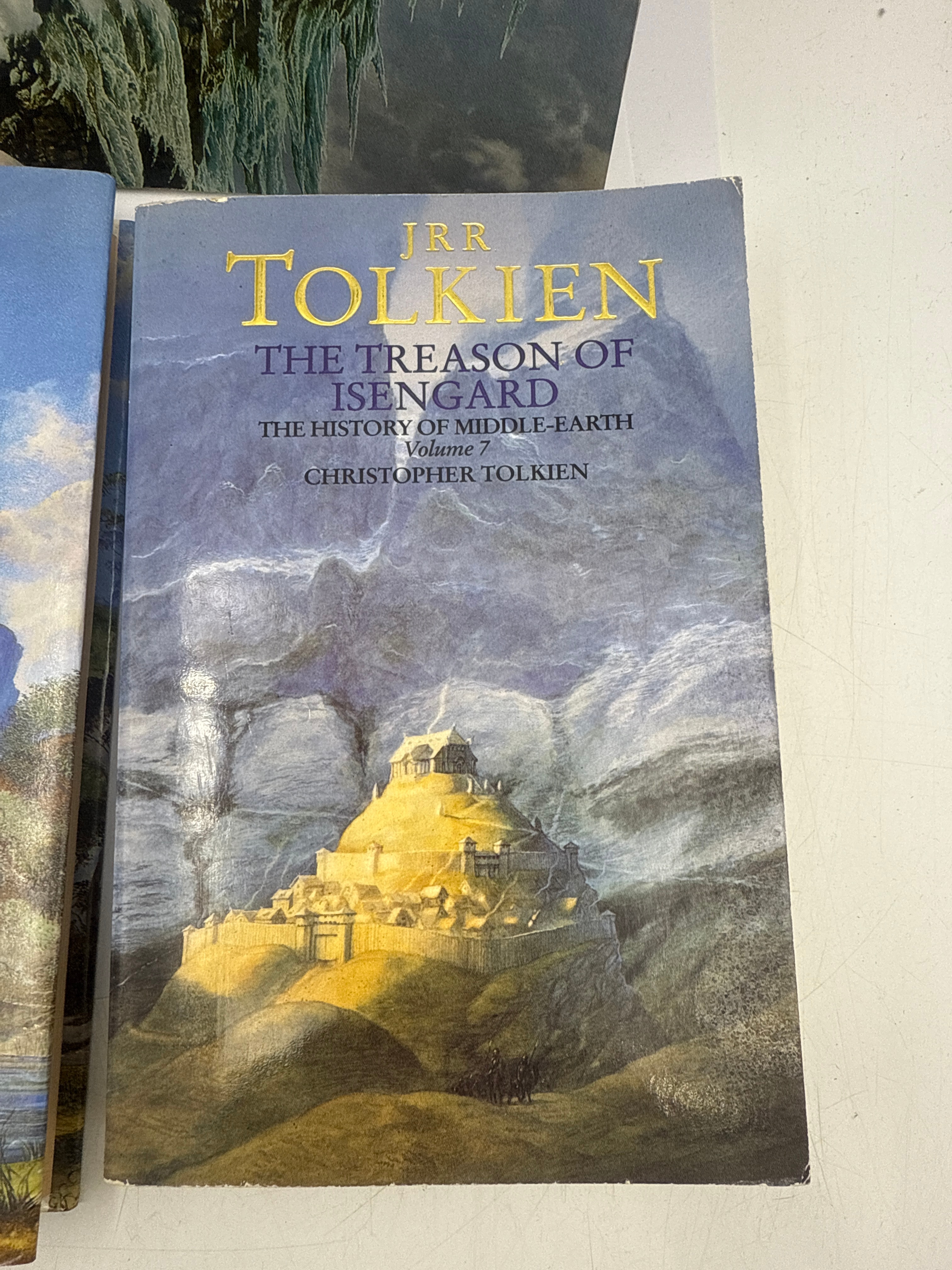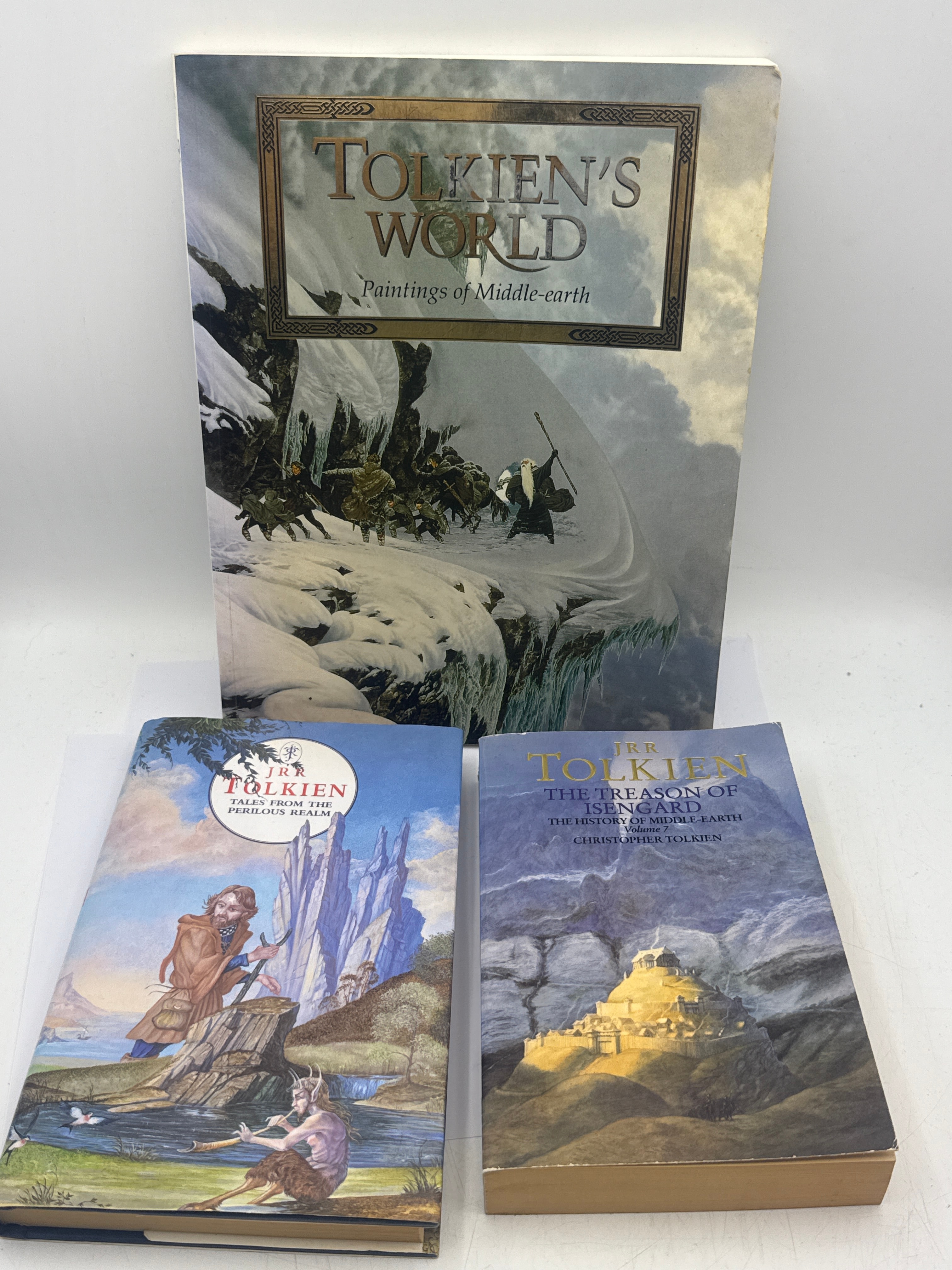 A group of three printed books associated with J.R.R. Tolkien. The lot includes ‘Tolkien’s World: Paintings of Middle-Earth,’ a glossy illustrated hardcover featuring a cover illustration of figures in a snowy mountainous landscape. Also included are ‘JRR TOLKIEN TALES FROM THE PERILOUS REALM,’ with an illustrated cover depicting a man and a satyr in a fantastical waterside setting, and ‘JRR TOLKIEN THE TREASON OF ISENGARD THE HISTORY OF MIDDLE-EARTH Volume 7 CHRISTOPHER TOLKIEN,’ showing a fortified structure on a mountain.