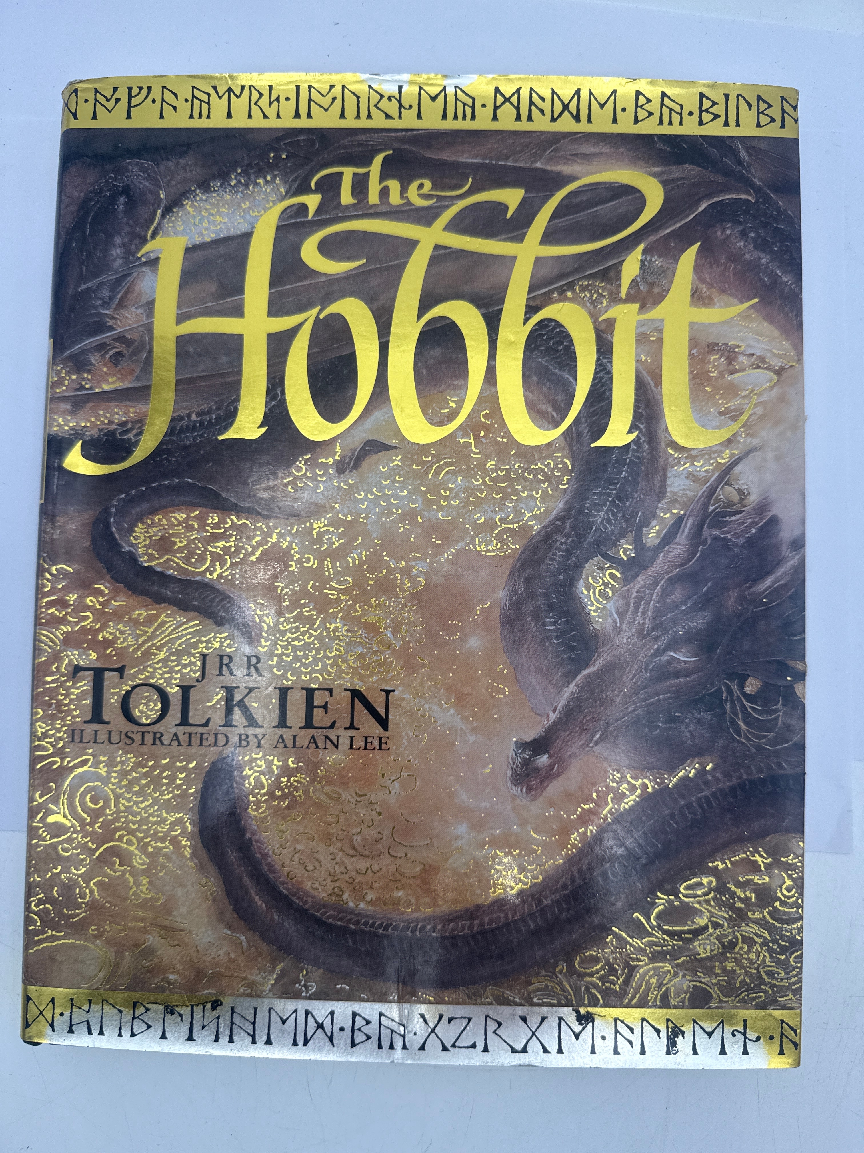 A hardcover edition of J.R.R. Tolkien’s ‘The Hobbit’, illustrated by Alan Lee, published in 1997. The cover features a modern fantasy style design, with a large, ornate gold foil title ‘The Hobbit’ set against a dark, textured background depicting a sleeping dragon amidst swirling golden patterns, suggesting treasure or ancient motifs. Decorative bands of runic script adorn the top and bottom edges, translating from the Dwarvish Moon-Runes as “STAND BY THE GREY STONE WHEN THE THRUSH KNOCKS” (top) and “AND THE LAST RAY OF THE SETTING SUN” (bottom), alluding to the secret door on Thror’s Map.
