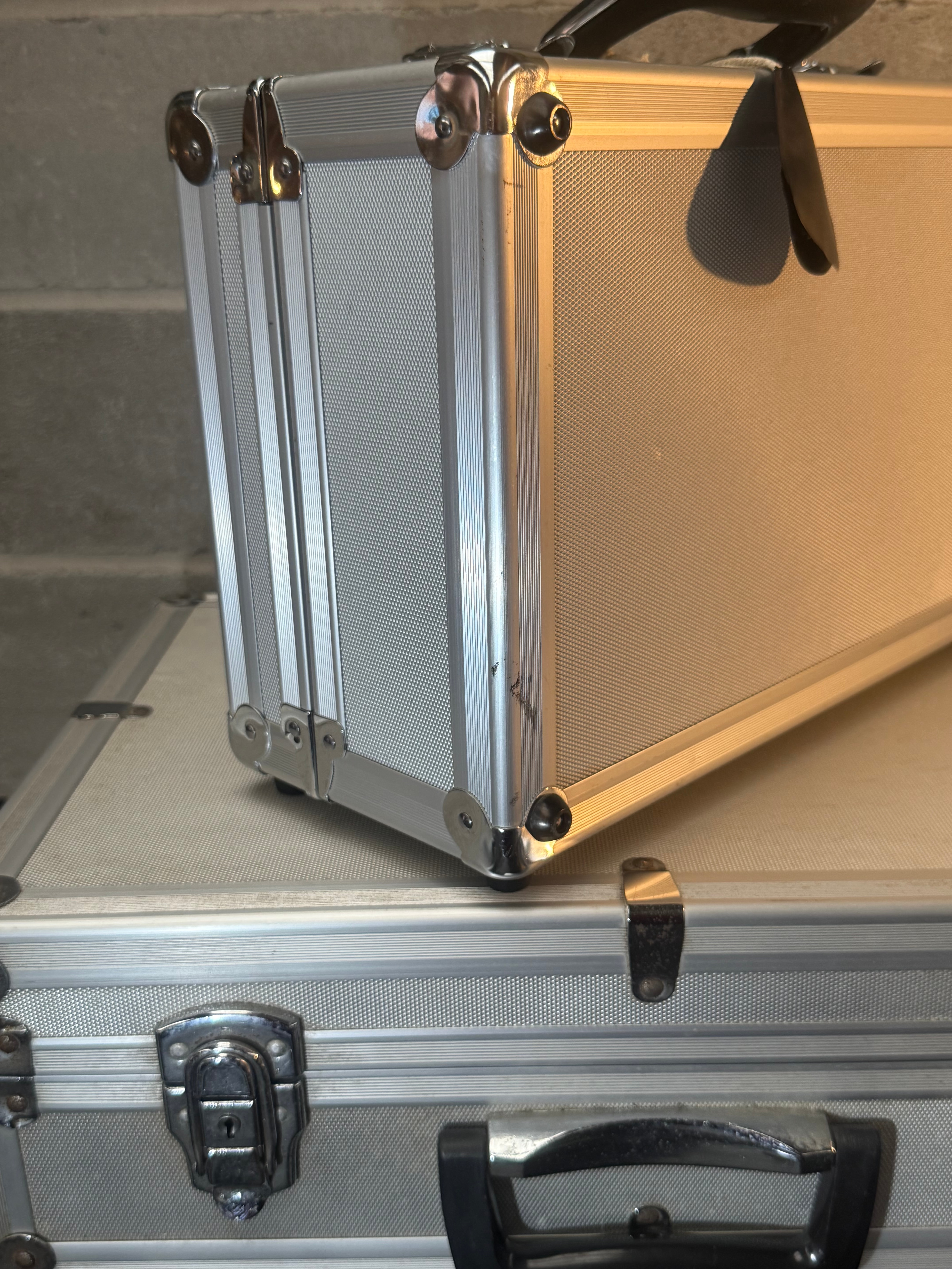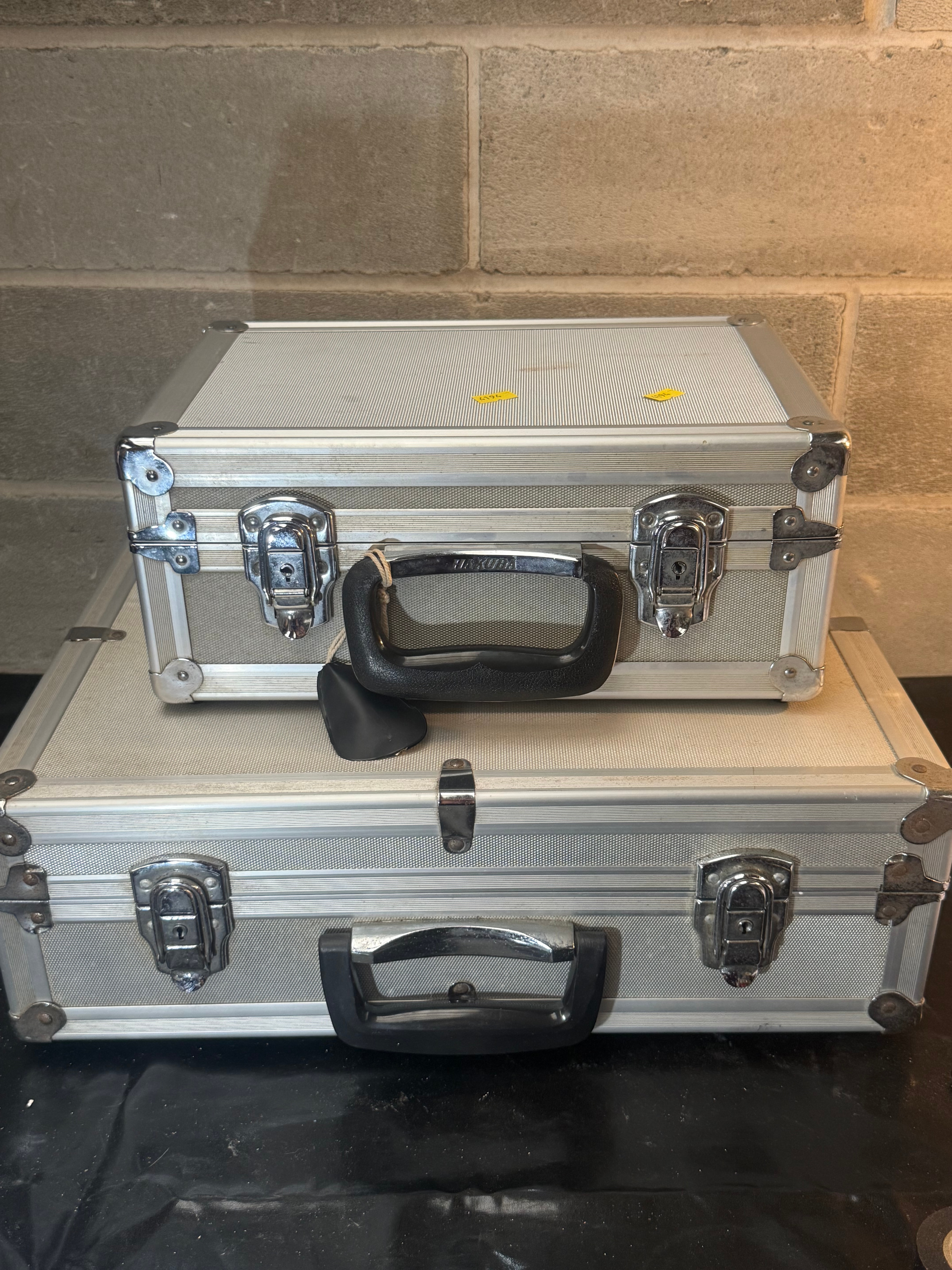 A pair of contemporary hard-shell utility cases, each featuring a modern, utilitarian style. Both cases are constructed with a textured silver-tone finish on their main panels, reinforced by polished silver-tone metal trim and corner protectors. Each case is equipped with two chrome-finished, lockable latches and a black plastic or rubberized carry handle. The top case includes a small black tag with largely illegible white text attached to its handle, along with two small yellow circular stickers on its lid.