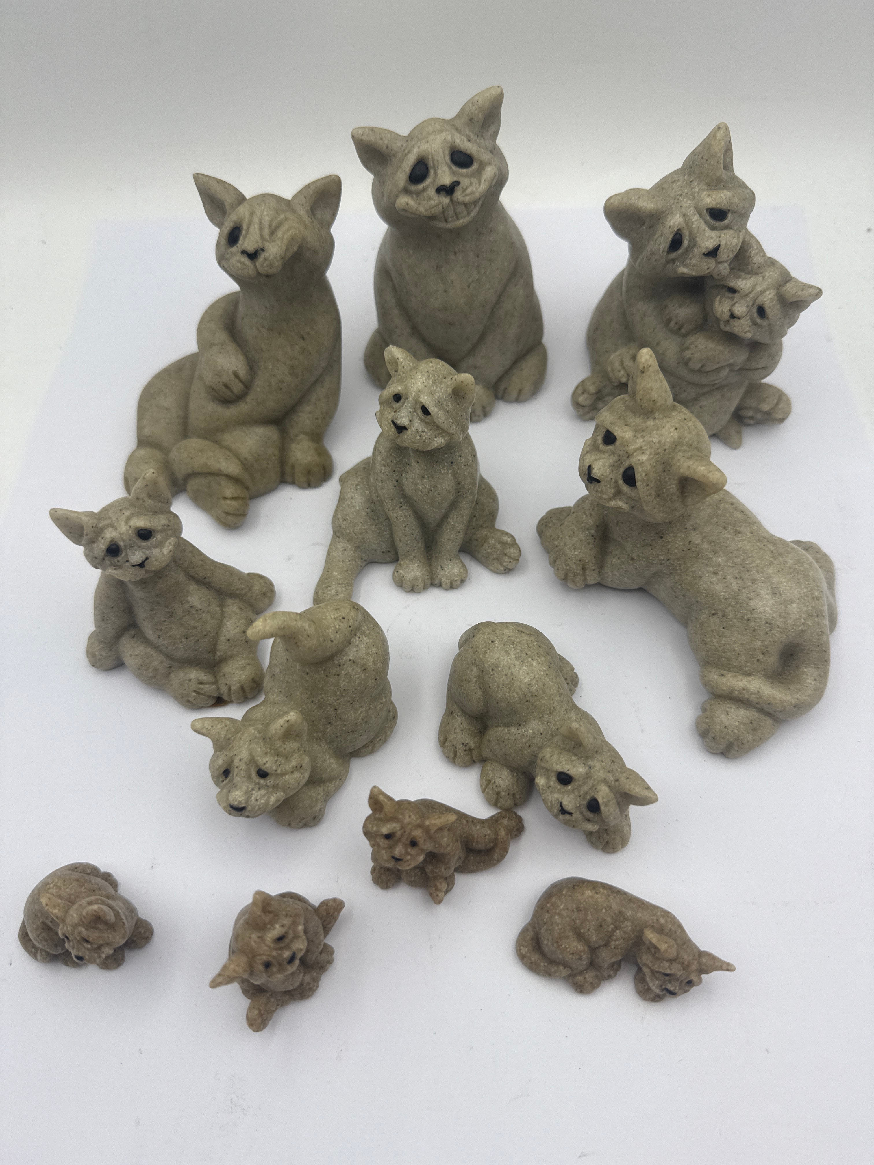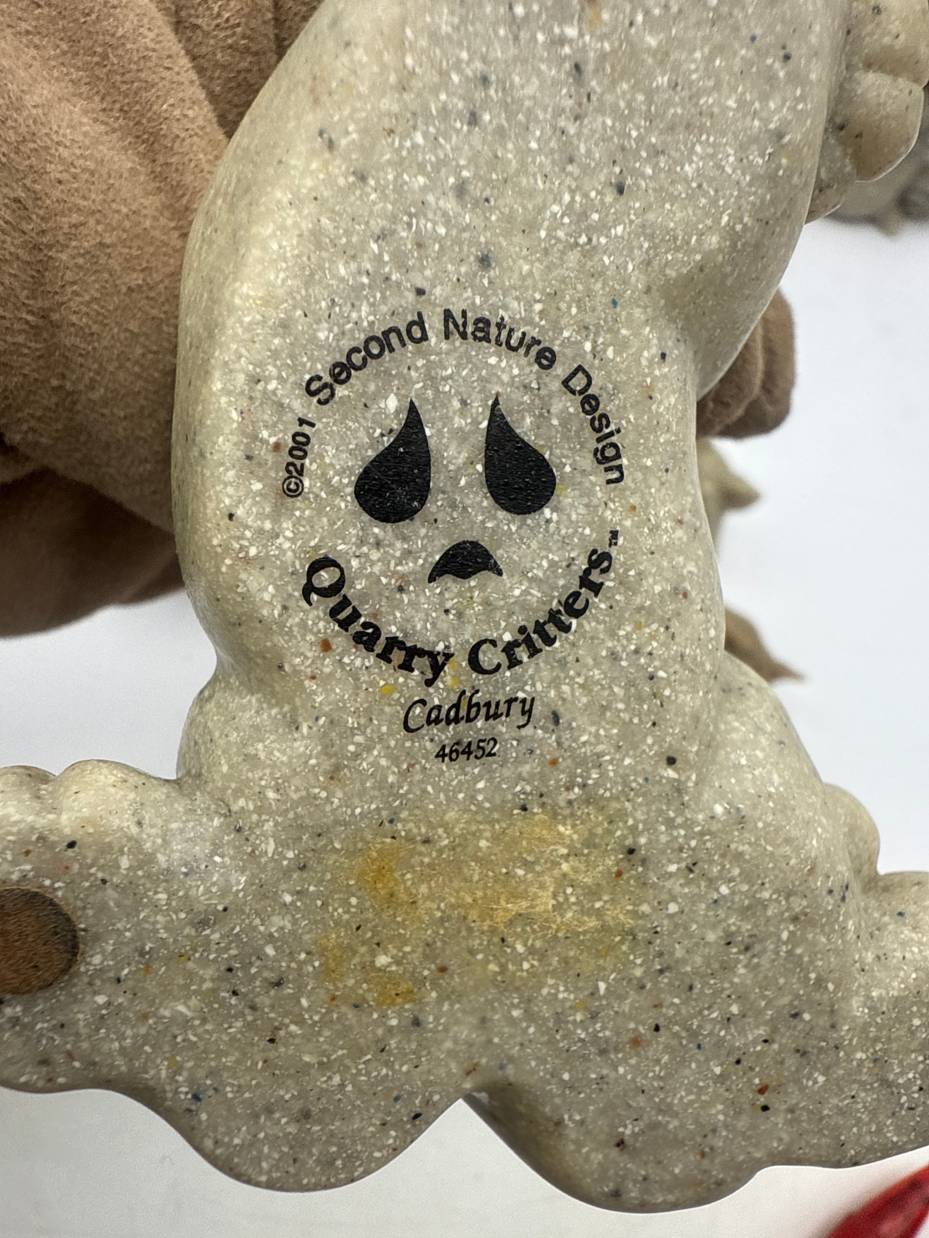 A collection of twelve Second Nature Design Quarry Critters Cats figurines. Crafted from a speckled, sandy-gray composite material with visible colorful flecks, depicting cats and kittens in various stylized and whimsical poses. The overall style is uniform. The underside of one figure is clearly marked with ‘©2001 Second Nature Design,’ a distinctive sad face logo, the brand name ‘Quarry Critters™,’ ‘Cadbury,’ and the numerical identifier ‘46452,’ dating these items to the early 21st century.
