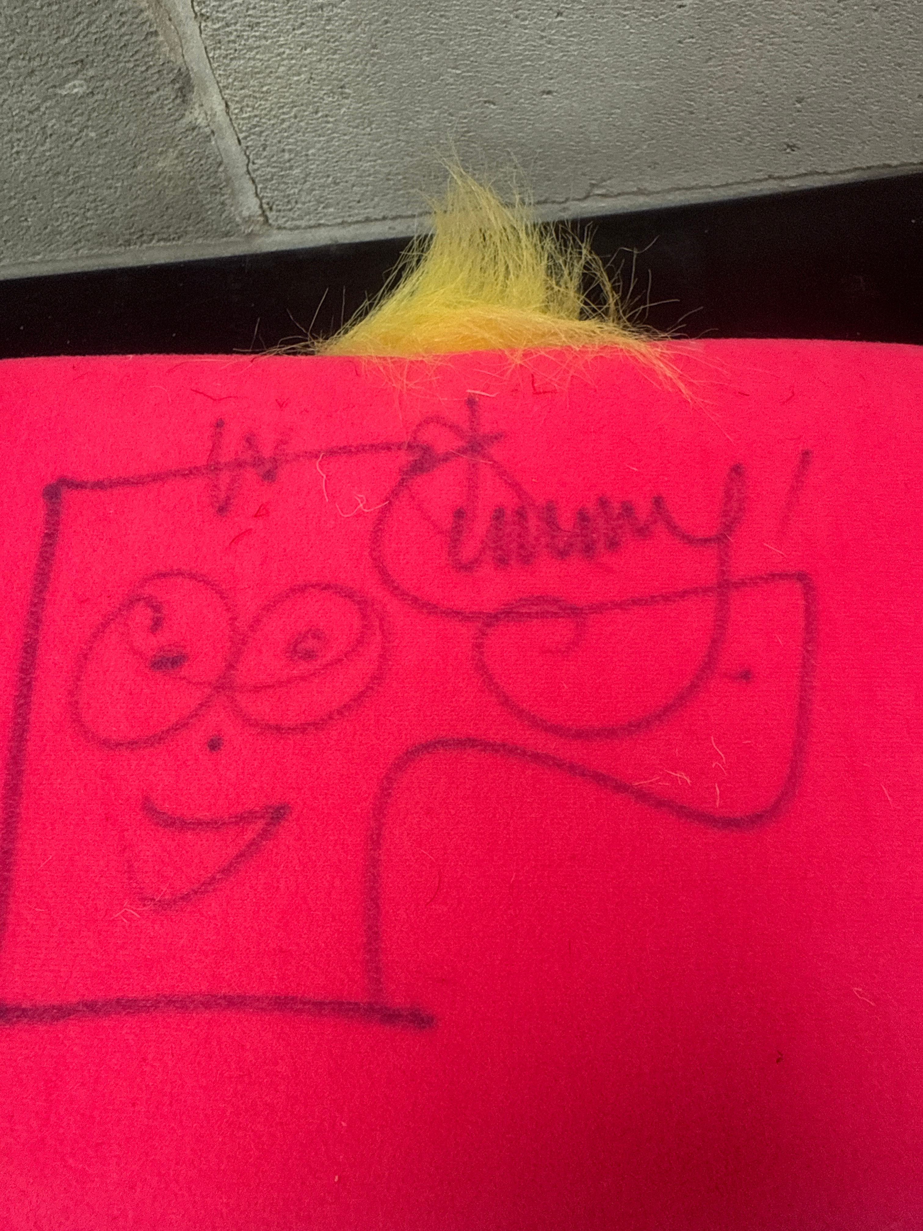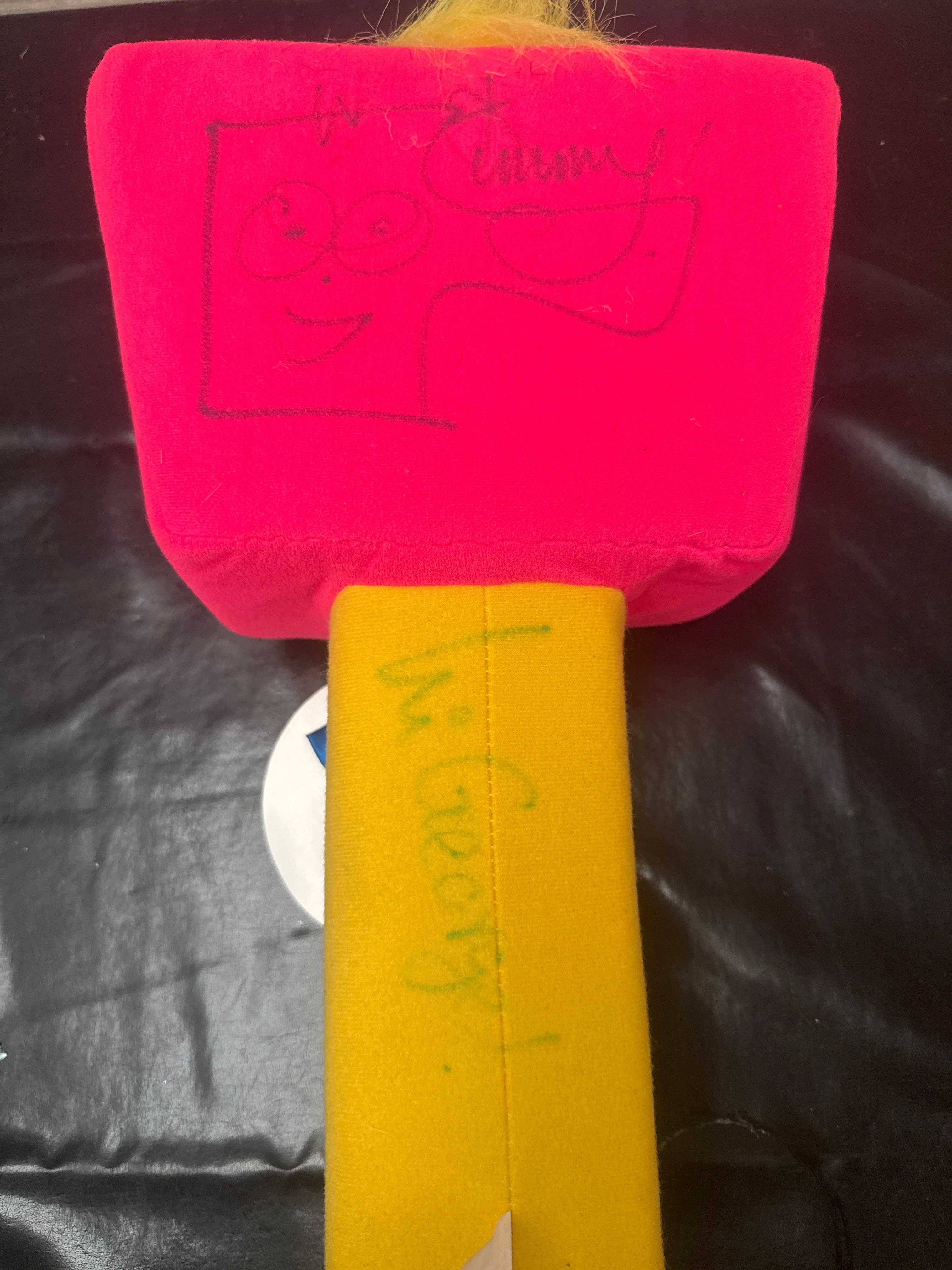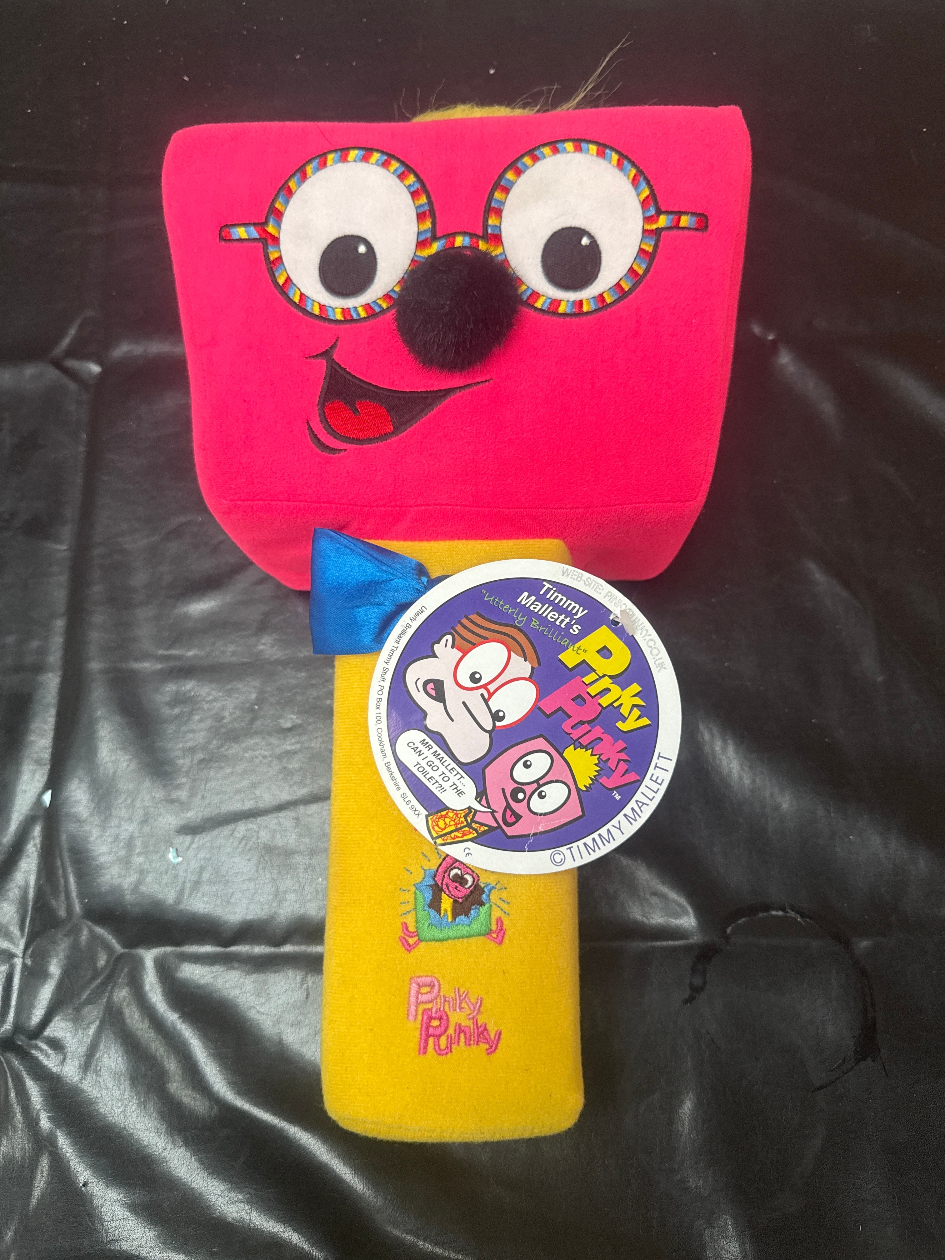 A brightly colored plush novelty item, identified as Timmy Mallett’s Pinky Punky Wacaday Mallett’s Mallet, dating from the early 2000s. Constructed primarily from pink and yellow fabric, it features a large pink block-shaped head with yellow spiky hair, cartoon-style appliquéd eyes wearing glasses, a black pom-pom nose, and a red smiling mouth. The head is mounted on a yellow fabric-covered handle, resembling a mallet, which also has ‘Pinky Punky’ printed on it. A prominent circular hang tag, white with blue and red graphics, identifies the item as ‘Timmy Mallett’s Pinky Punky,’ stating it was ‘CREATED BY TIMMY MALLETT 2004’ and includes a ‘Warning: Not suitable for children under 36 months,’ a ‘CE’ mark, production information, and a ‘© TIMMY MALLETT’ copyright. The pink head bears a black marker inscription, reading ‘To Emmy’ above a signature that appears to be ‘Timmy.’ The yellow handle has another partial inscription that is largely illegible.