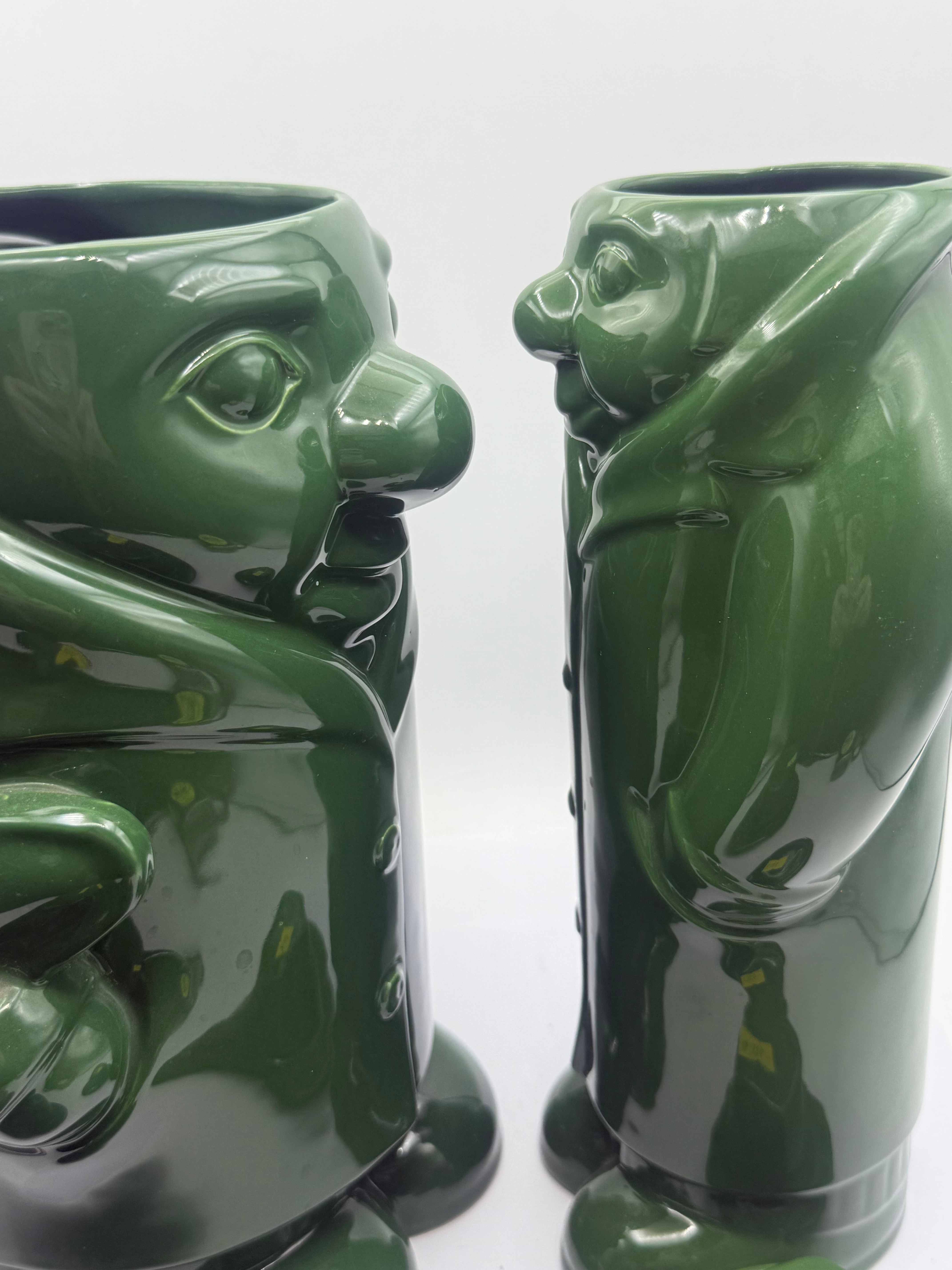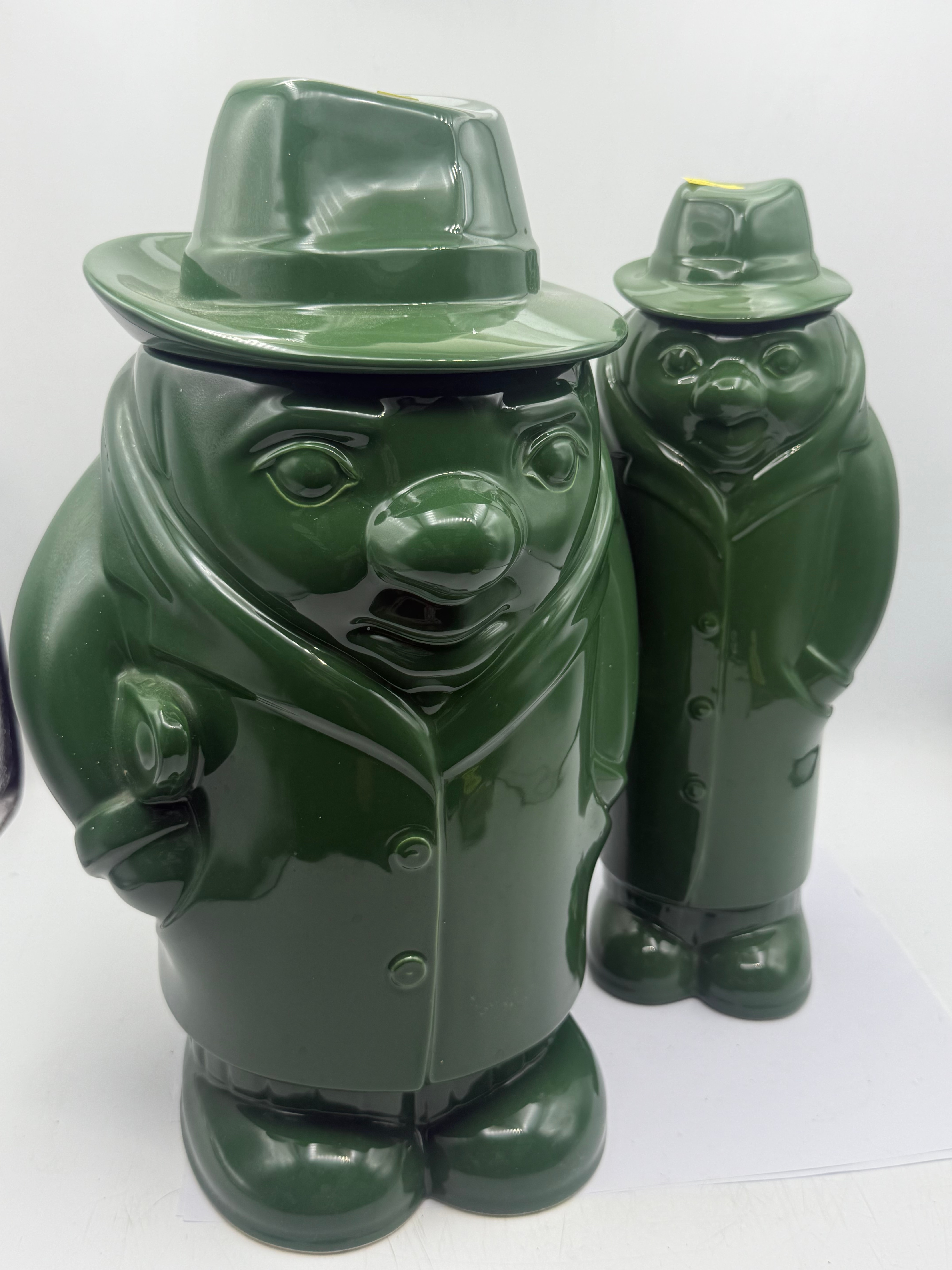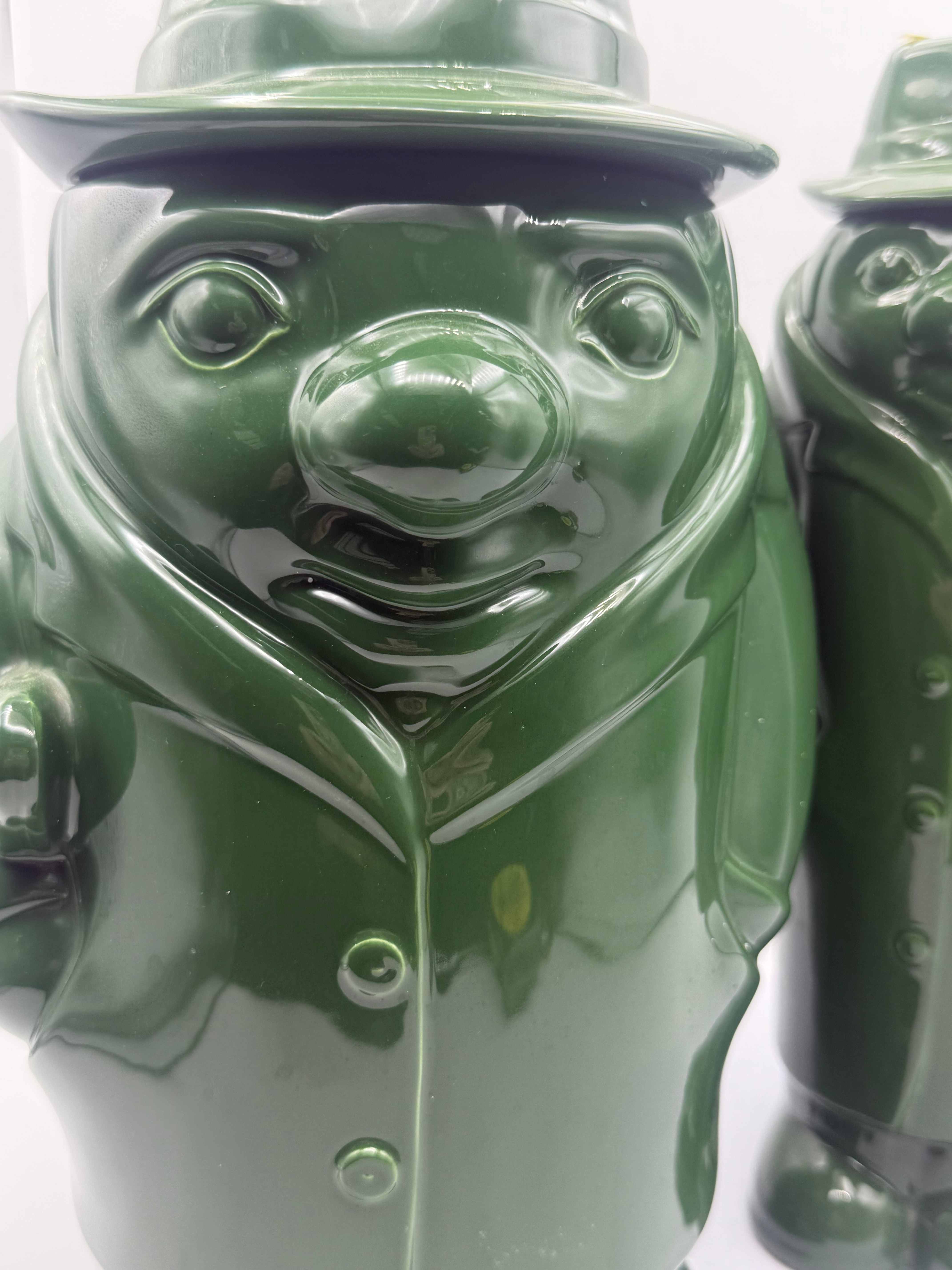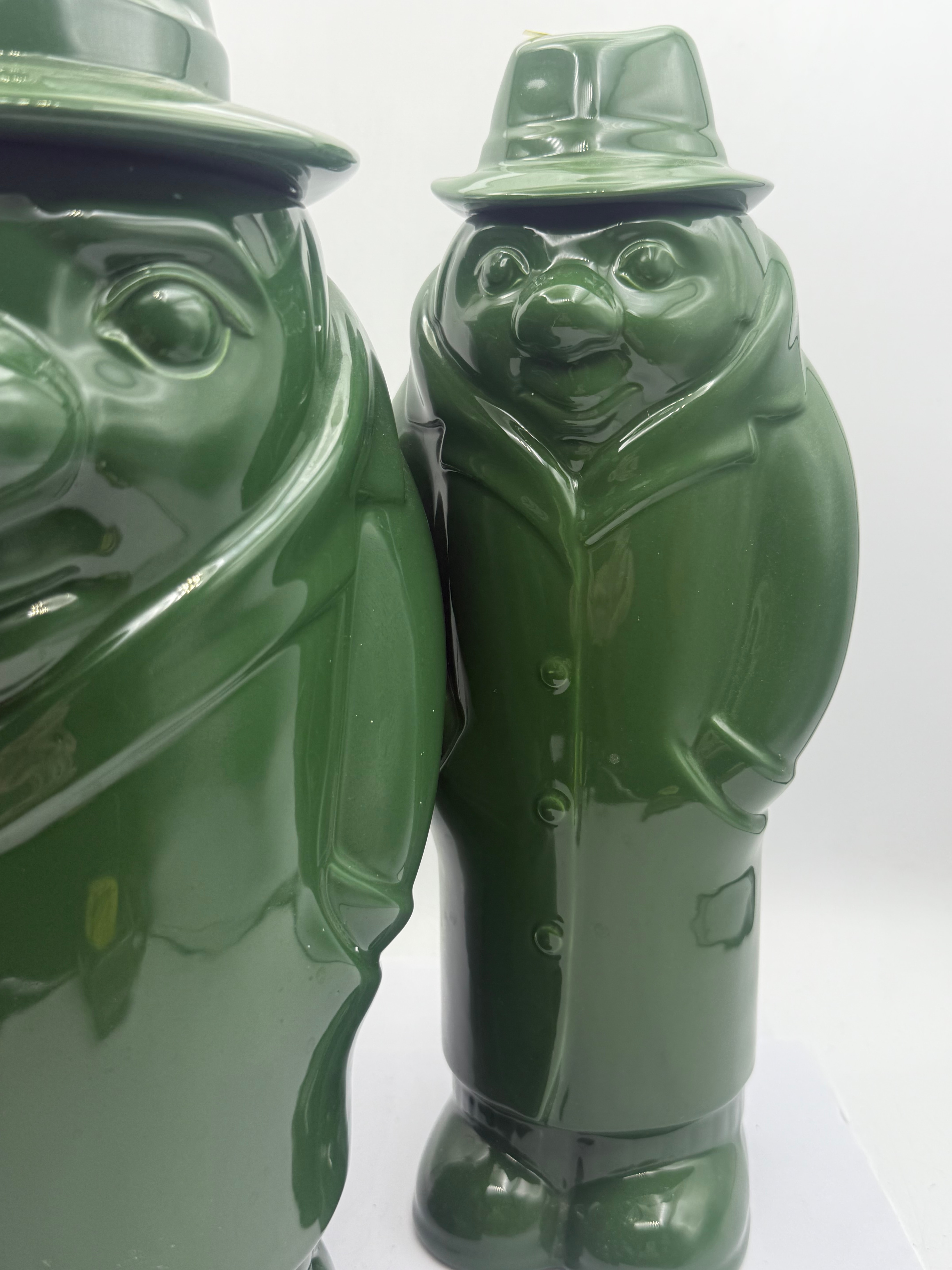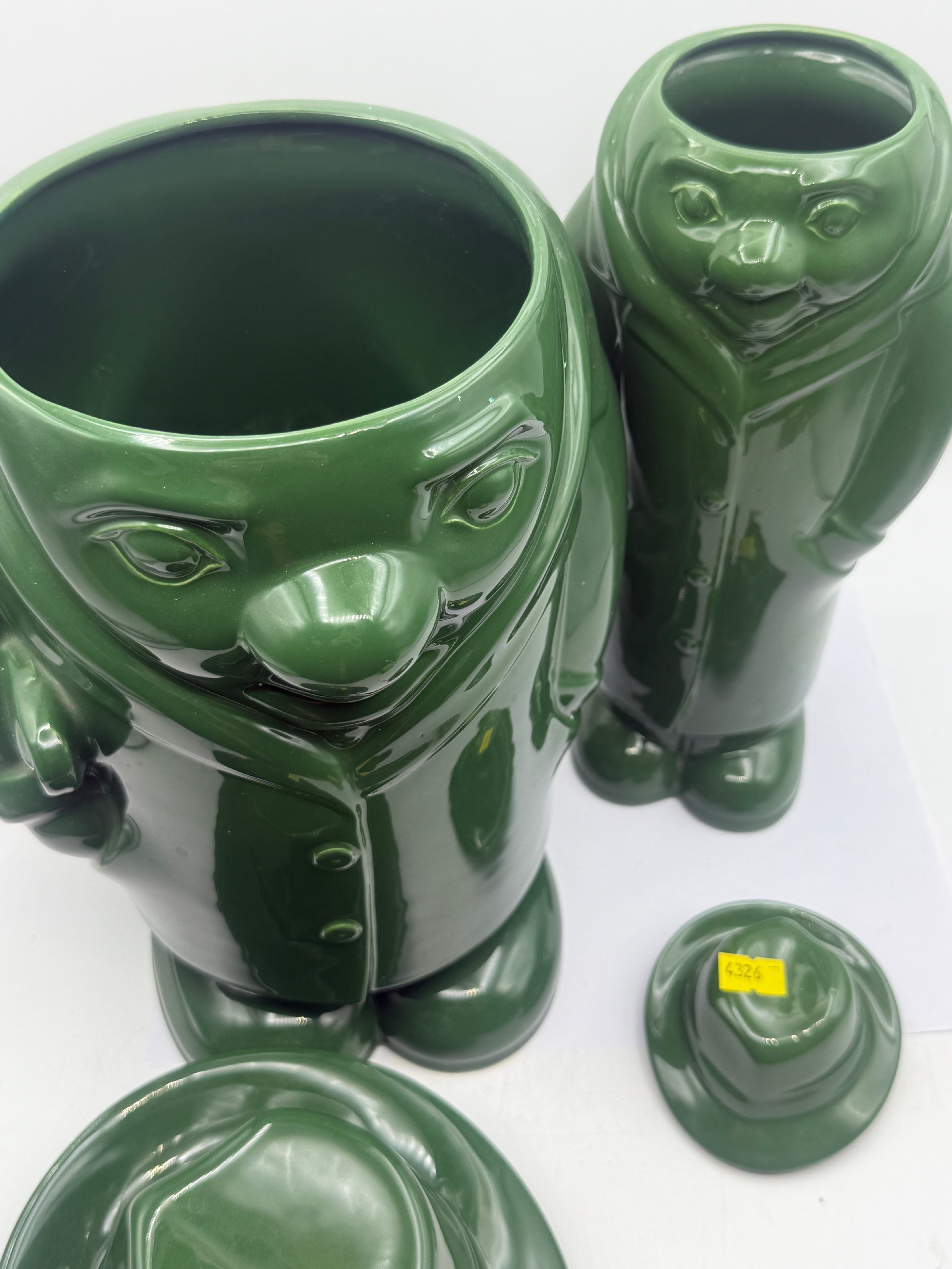 A pair of anthropomorphic, dark green, high-gloss glazed ceramic containers. Each depicts a stout, cartoonish figure wearing a trench coat and fedora-style hat, with prominent noses and simple facial features. The hats serve as removable lids, revealing their hollow interior. One container is significantly larger than the other. A yellow sticker with the number ‘4326’ is present on the lid of the smaller container.