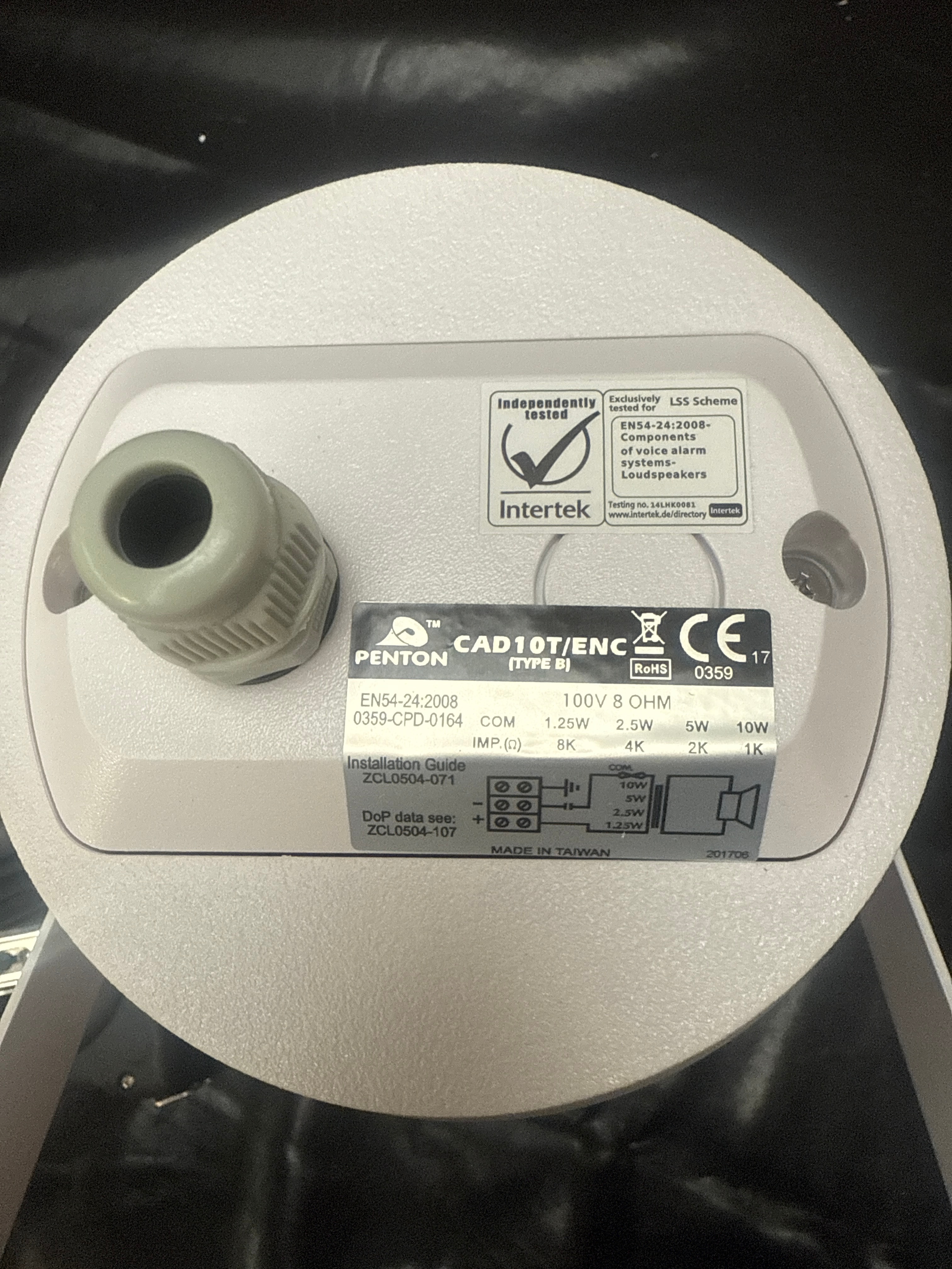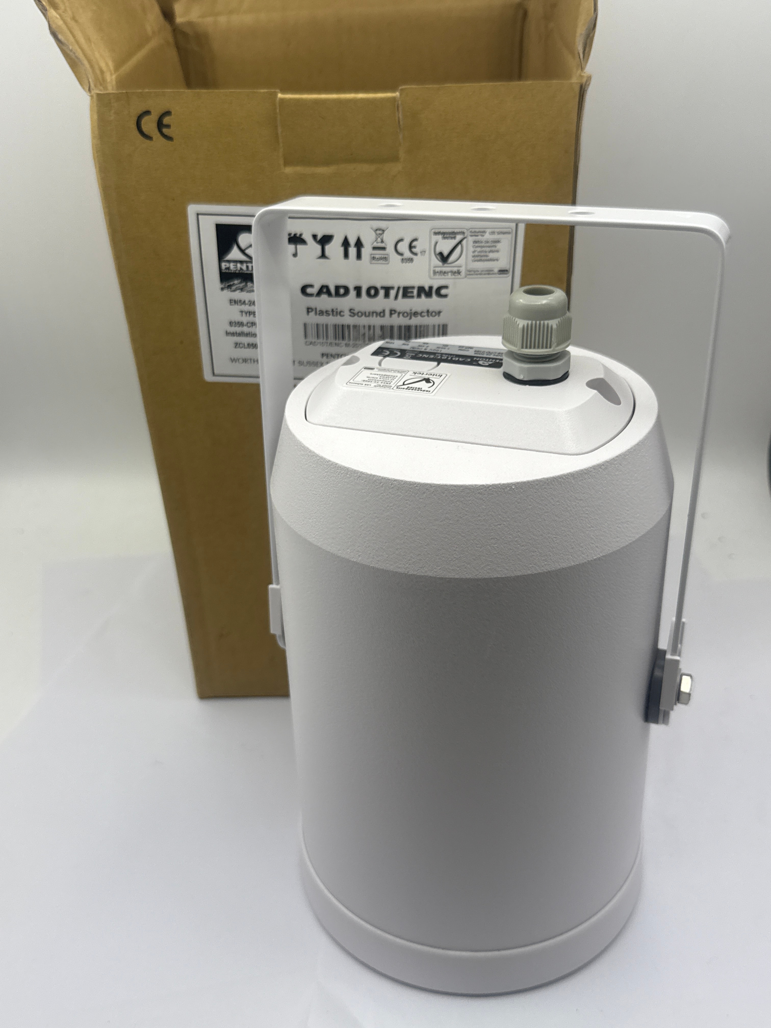 A group of seven Penton CAD10T/ENC (Type B) Plastic Sound Projectors. Each unit is designed for 100V 8 Ohm systems and is compliant with EN54-24:2008 standards for voice alarm loudspeakers. They feature selectable power taps ranging from 1.25W to 10W. Each projector displays CE and RoHS markings, indicating European conformity and restricted hazardous substances, and is labeled “MADE IN TAIWAN.” The items are presented in their open, original brown cardboard packaging, also marked with “CE” and “PENTON.”