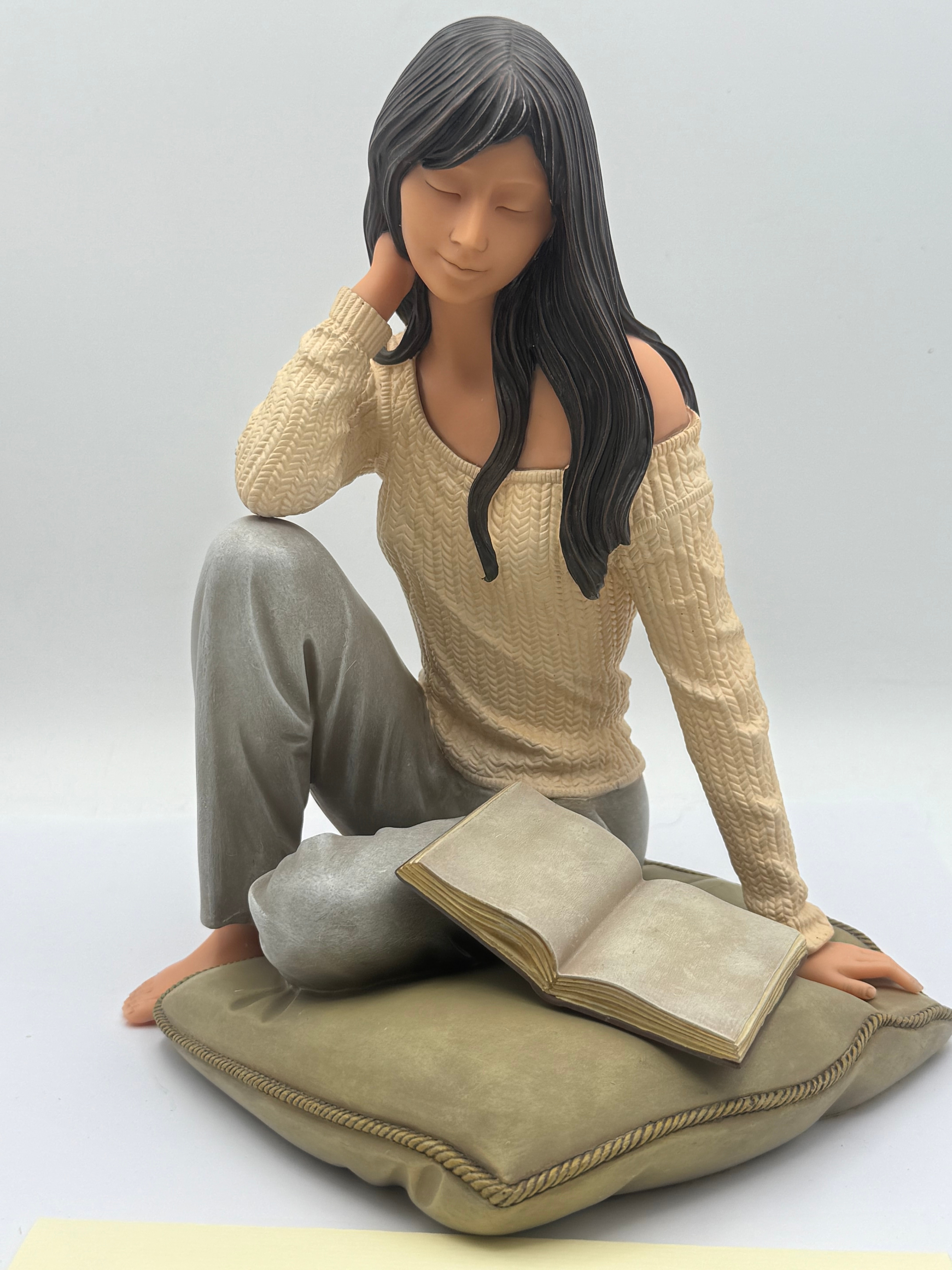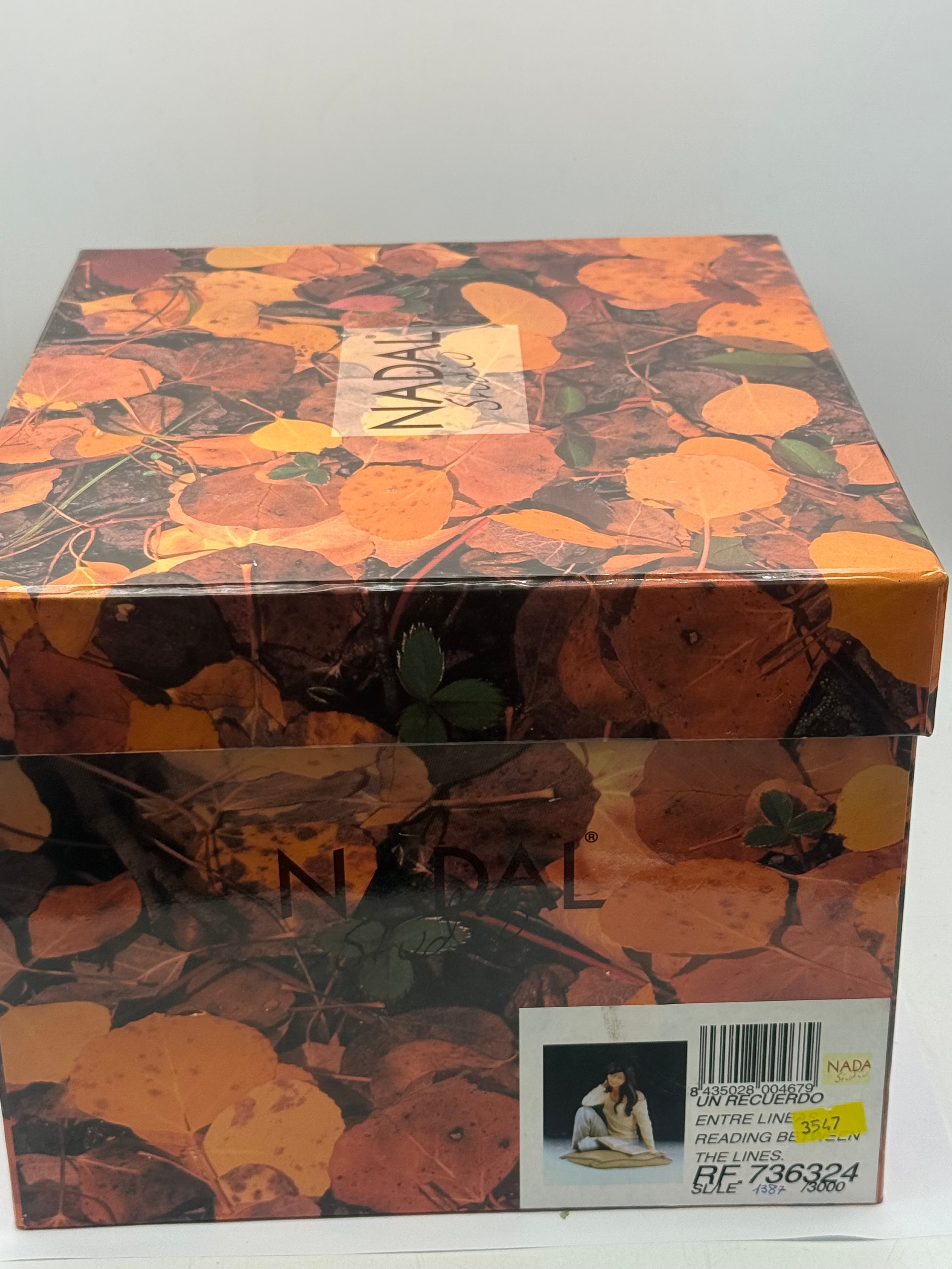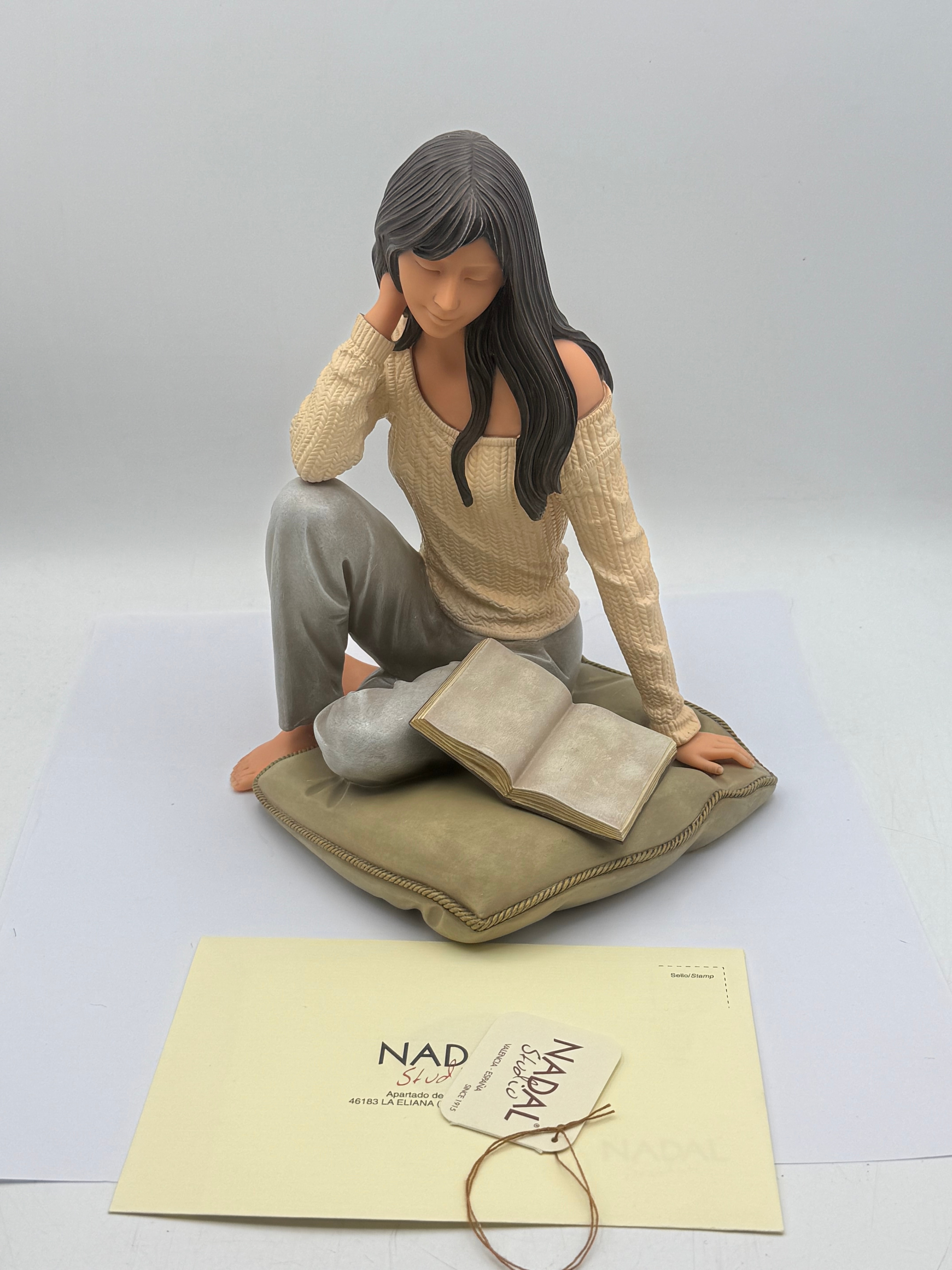 A contemporary figurine by NADAL Studio, titled “Un recuerdo entre líneas” (A memory between lines) or “Reading between the lines,” reference number 736324. This piece is number 1387 from a limited edition of 3,000. Crafted in Valencia, Spain, by NADAL Studio, which has a legacy dating back to 1915. The figurine depicts a serene woman with dark hair, seated on a green cushion, engrossed in an open book. She is dressed in a cream-colored, textured, off-the-shoulder sweater and light gray pants. The piece is presented with its original box and accompanying paperwork.