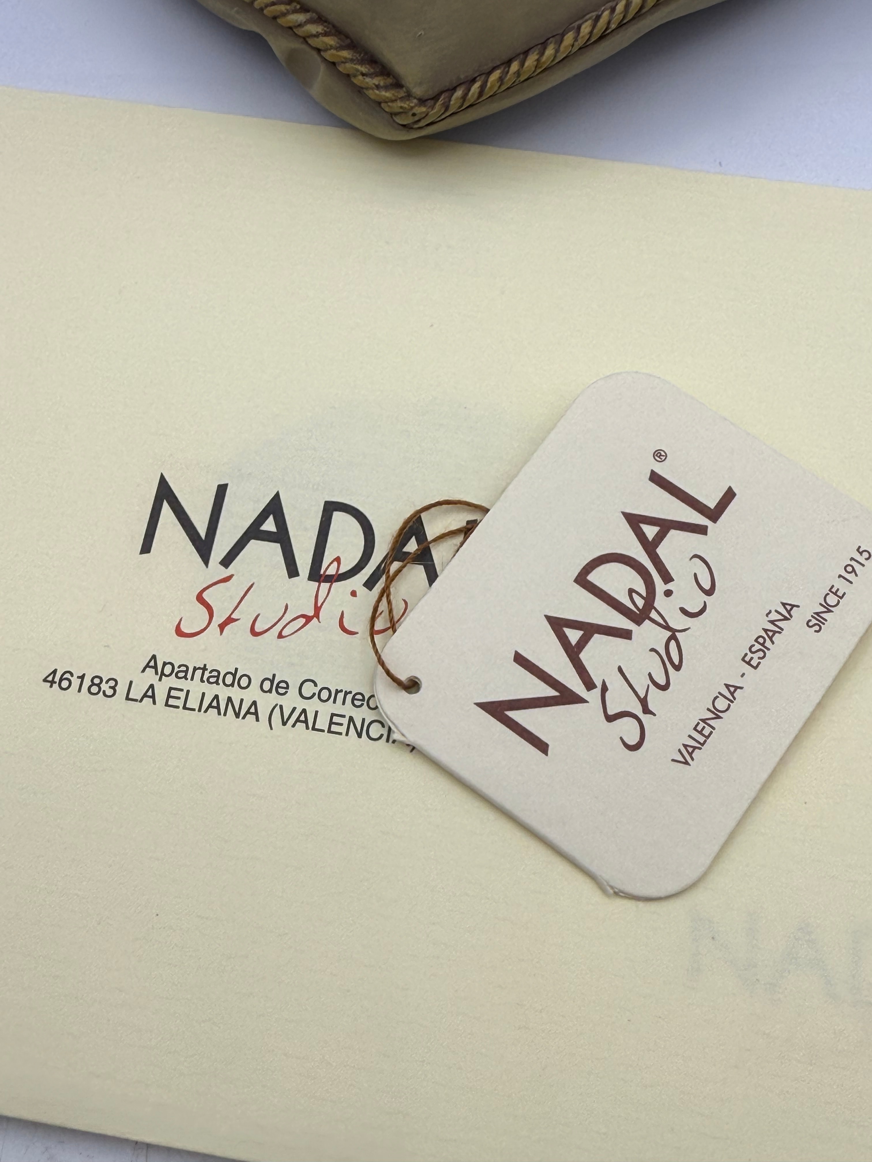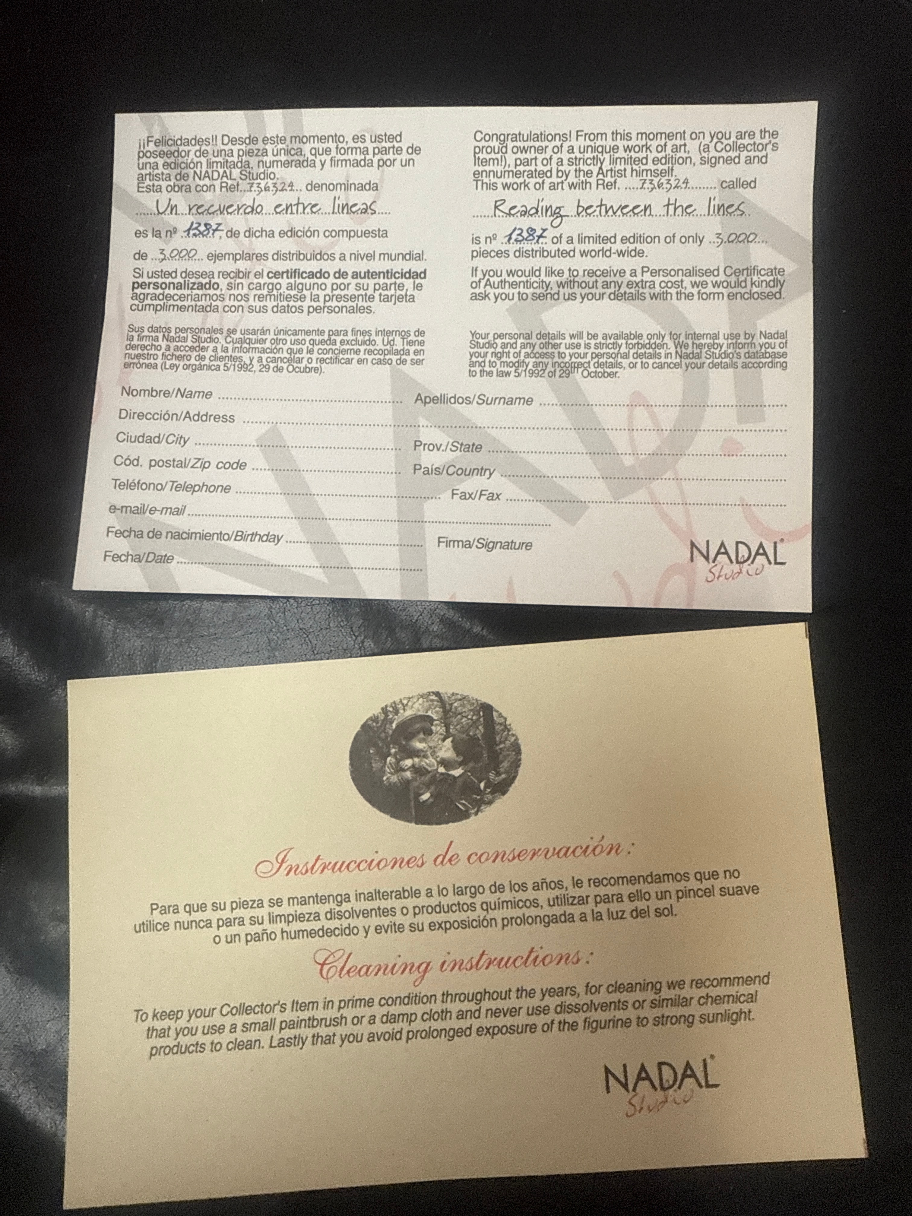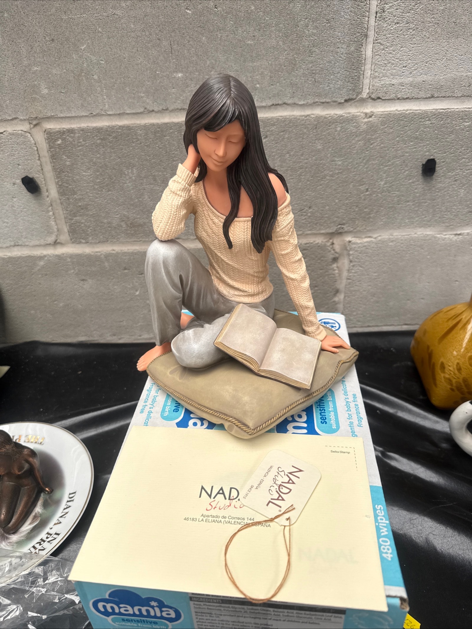 A contemporary figurine by NADAL Studio, titled “Un recuerdo entre líneas” (A memory between lines) or “Reading between the lines,” reference number 736324. This piece is number 1387 from a limited edition of 3,000. Crafted in Valencia, Spain, by NADAL Studio, which has a legacy dating back to 1915. The figurine depicts a serene woman with dark hair, seated on a green cushion, engrossed in an open book. She is dressed in a cream-colored, textured, off-the-shoulder sweater and light gray pants. The piece is presented with its original box and accompanying paperwork.
