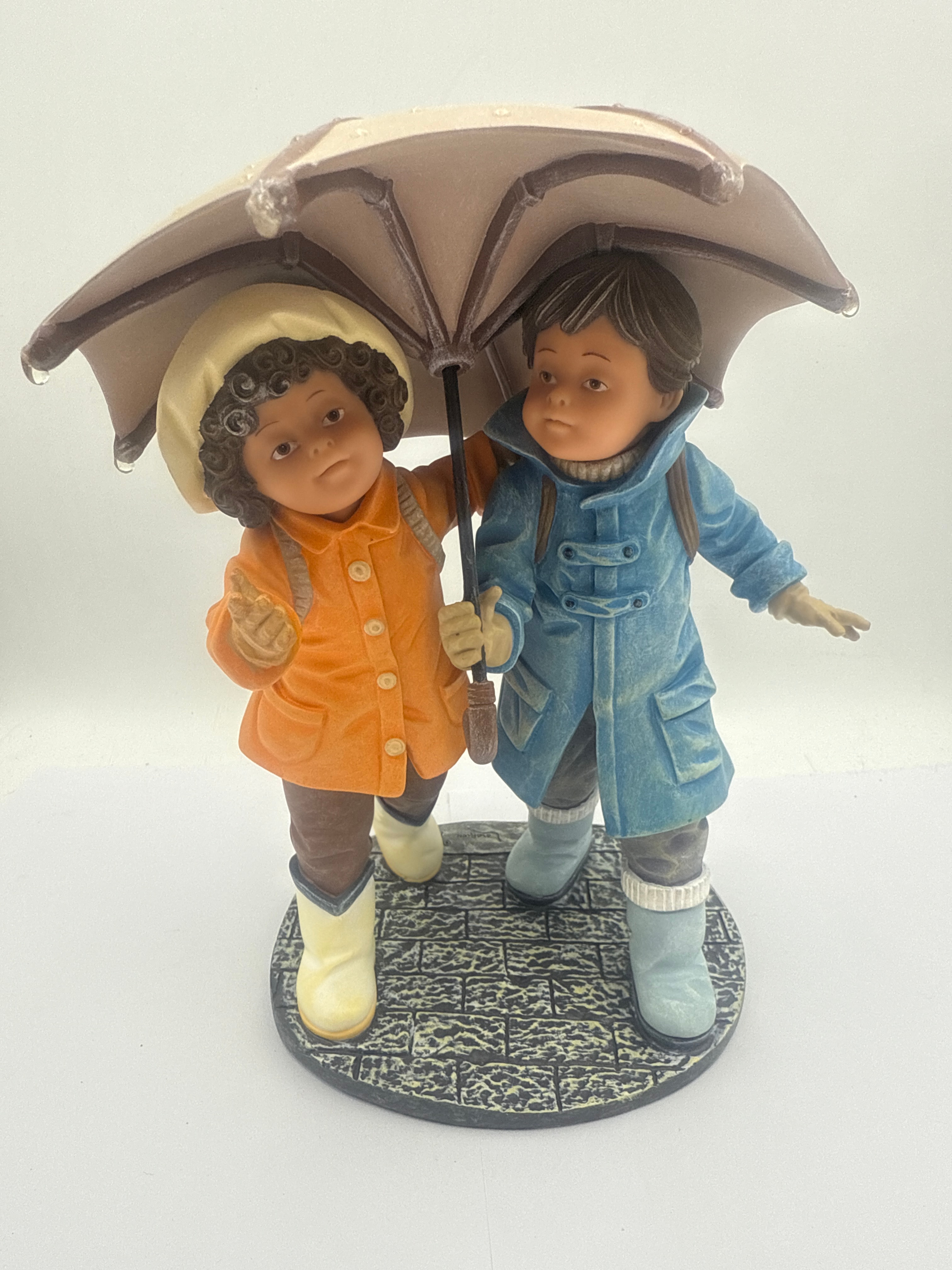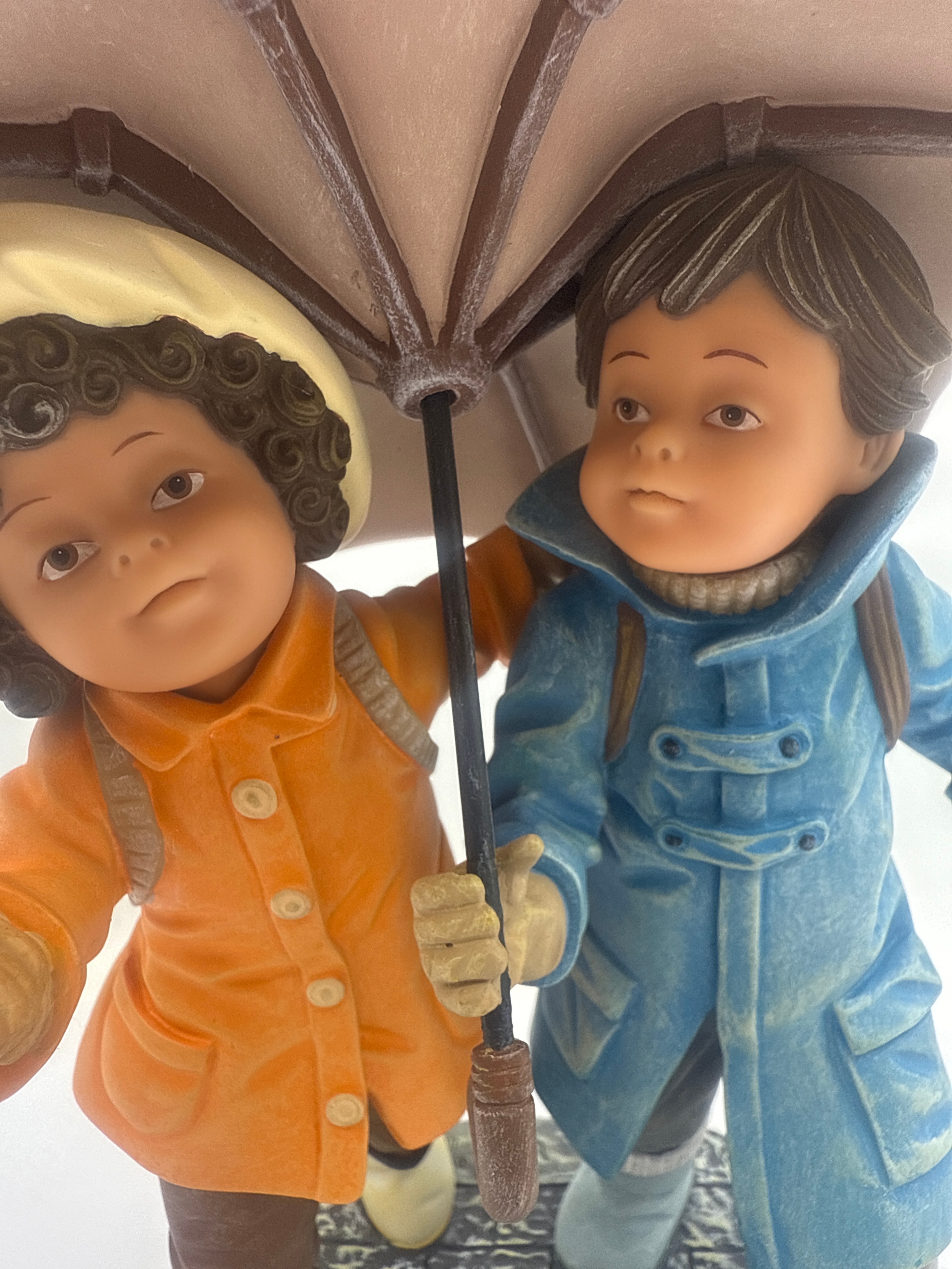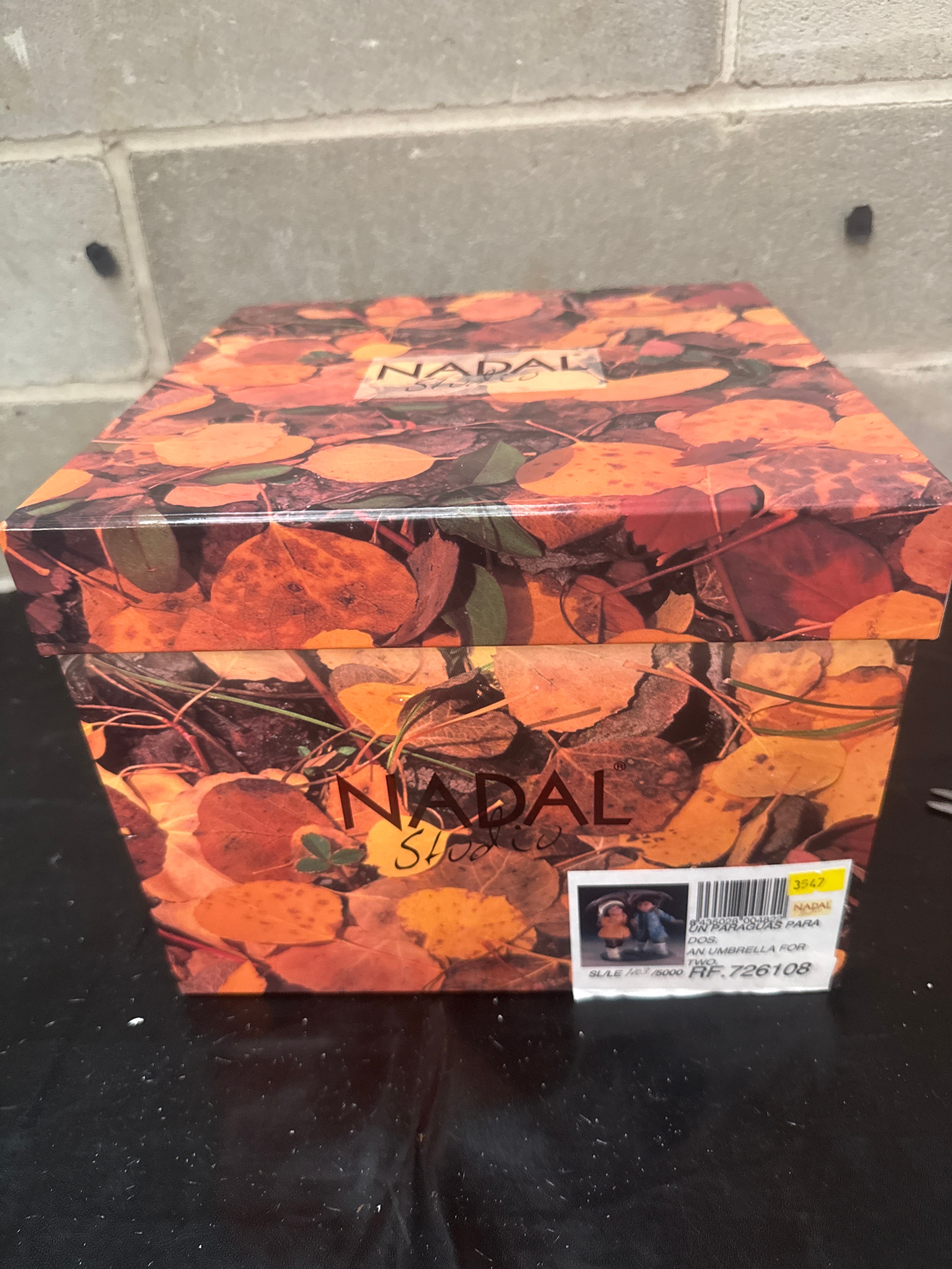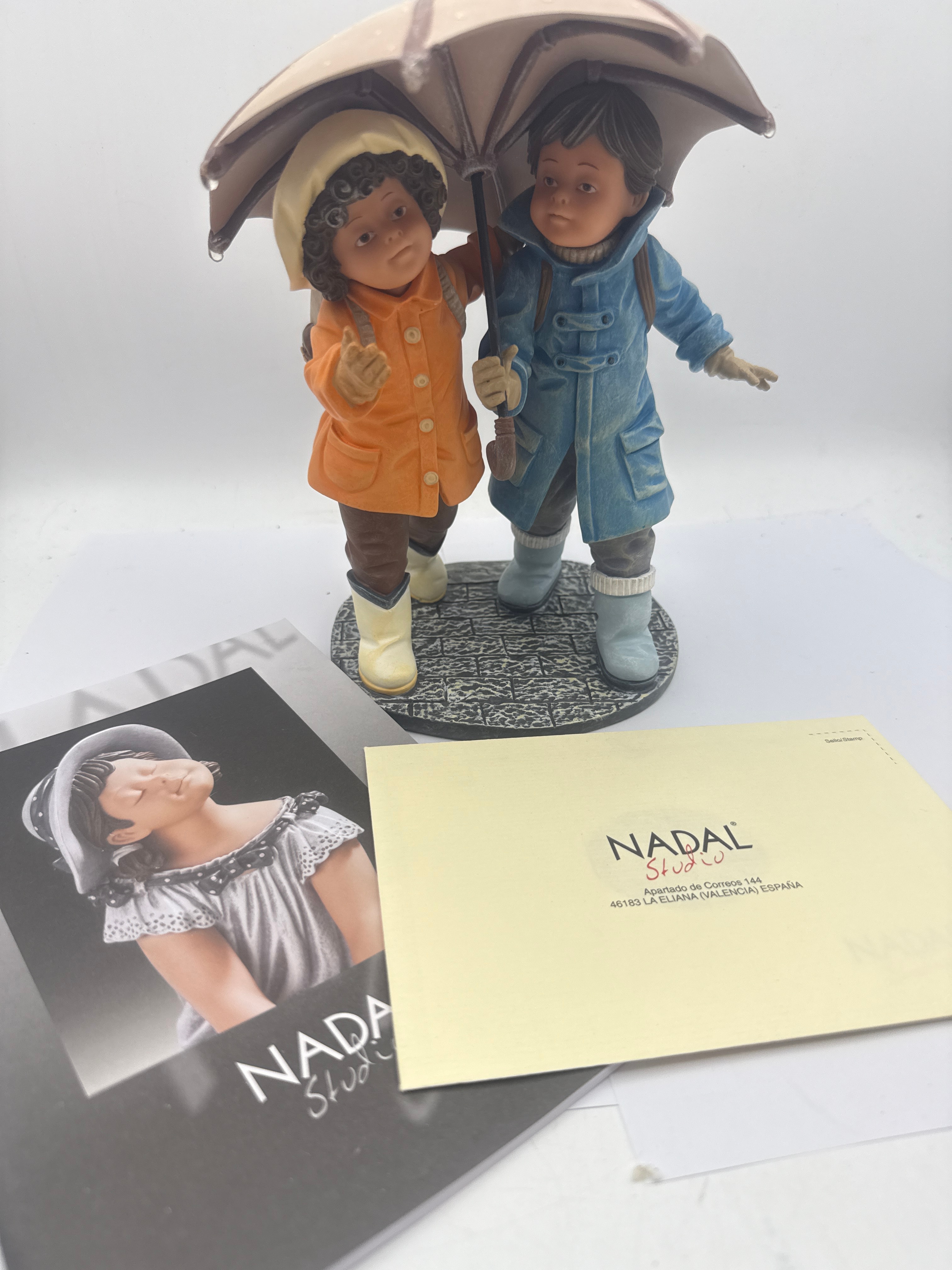 A contemporary decorative figurine by NADAL Studio, titled “Muchachos con Paraguas” (Boys with Umbrella), reference number REF. 726108. The piece depicts two children, one in an orange coat and cream hat, and the other in a blue coat, sharing a tan umbrella with simulated raindrops. They stand on a cobblestone-patterned base. Crafted from painted resin or ceramic, the figurine originates from La Eliana, Valencia, Spain, as confirmed by accompanying paperwork and original packaging. The item is presented new in its original autumn-leaf patterned box.