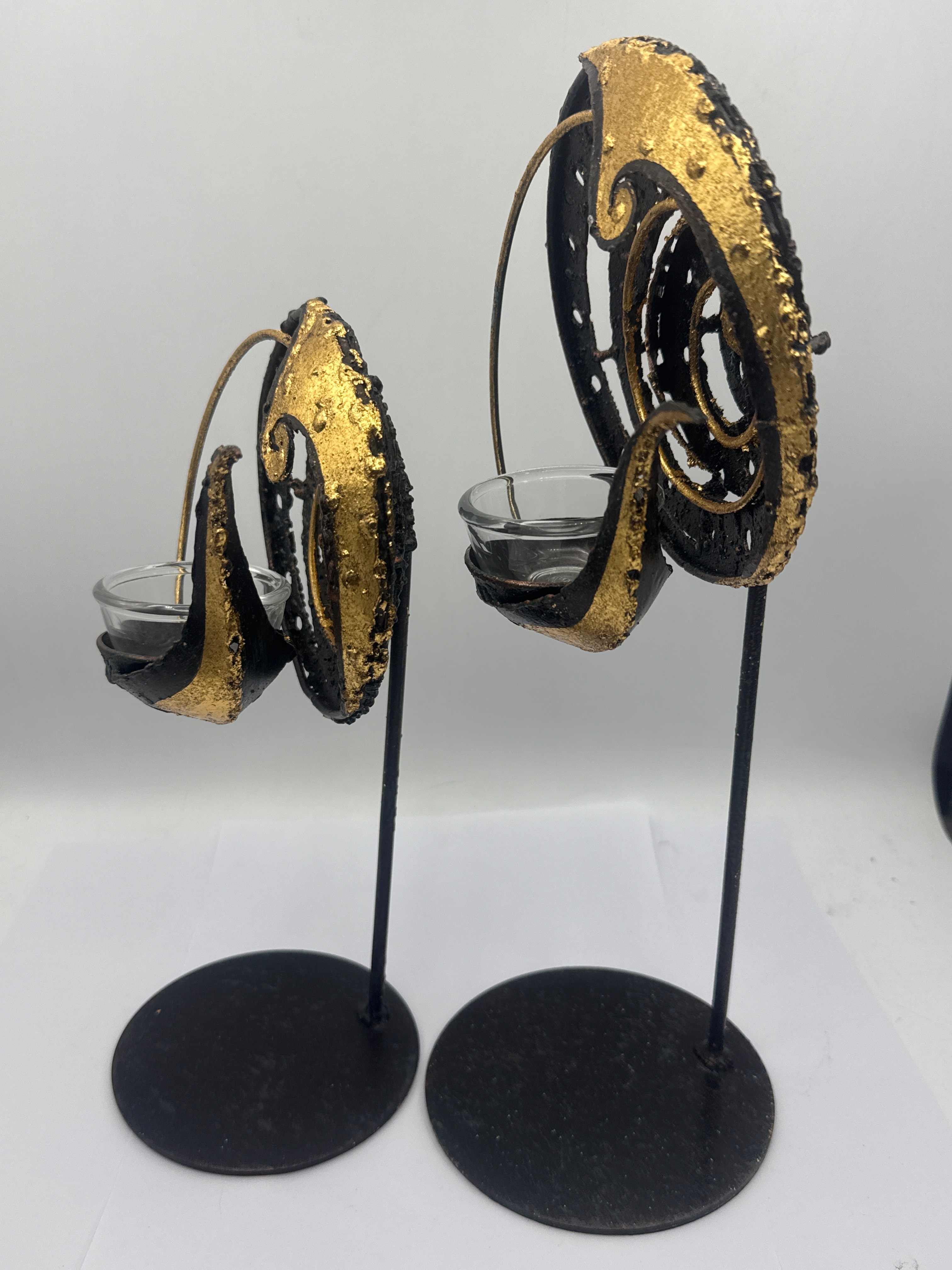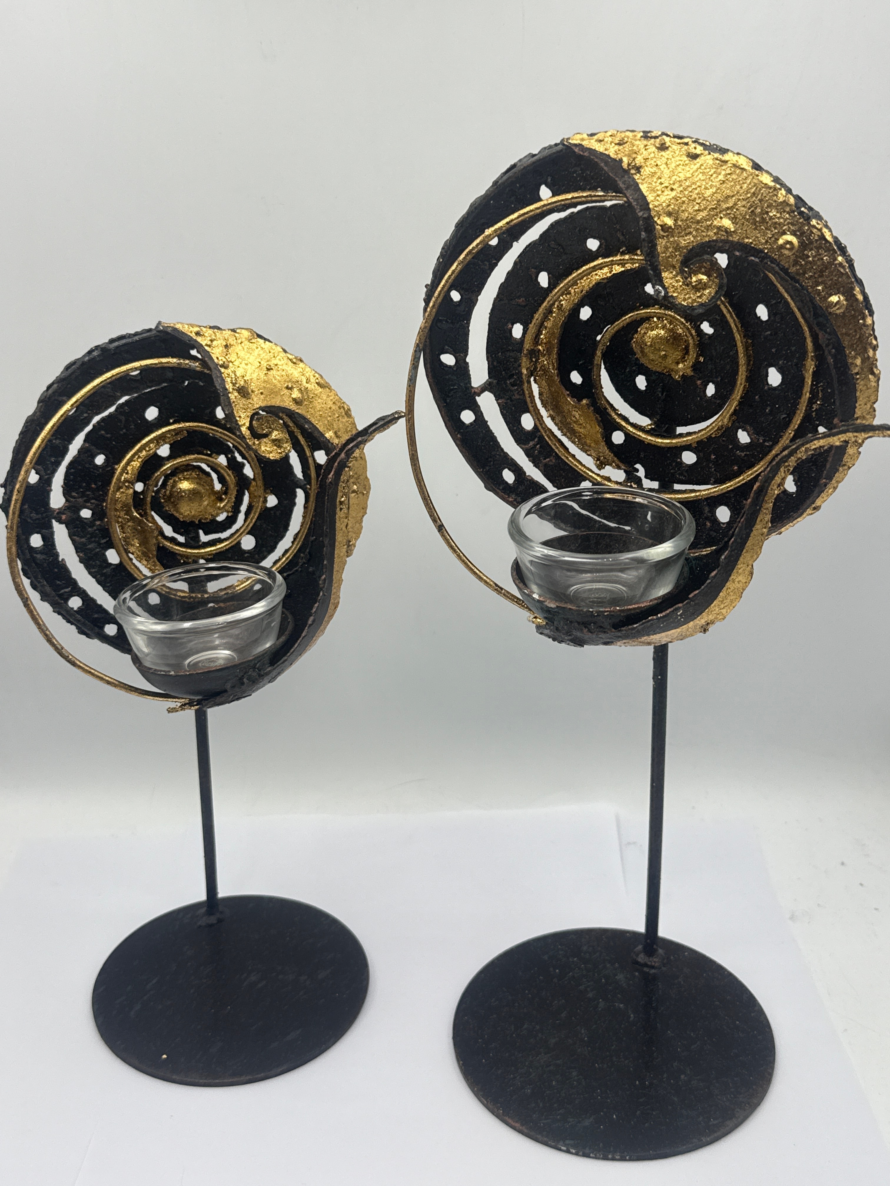 A pair of decorative votive or tea light candle holders, each featuring an abstract, spiraled design reminiscent of a nautilus shell or scroll. The primary decorative element is crafted from metal, finished in a textured matte black with applied, somewhat distressed gold accents and small white painted dots, forming a pattern of internal spirals. Each decorative piece is mounted on a slender black metal stem rising from a round, flat black metal base, and securely holds a removable clear glass cup for a candle.