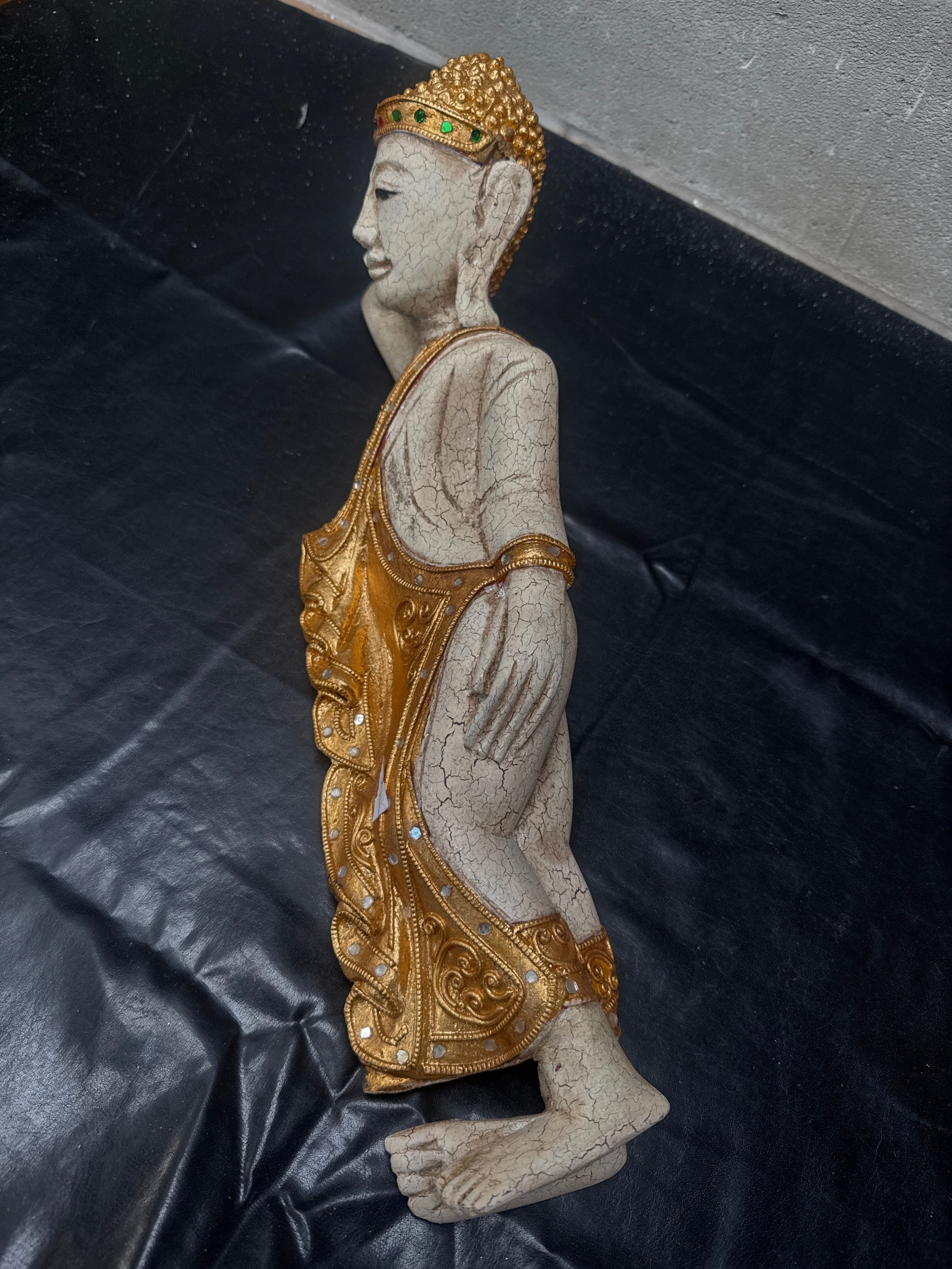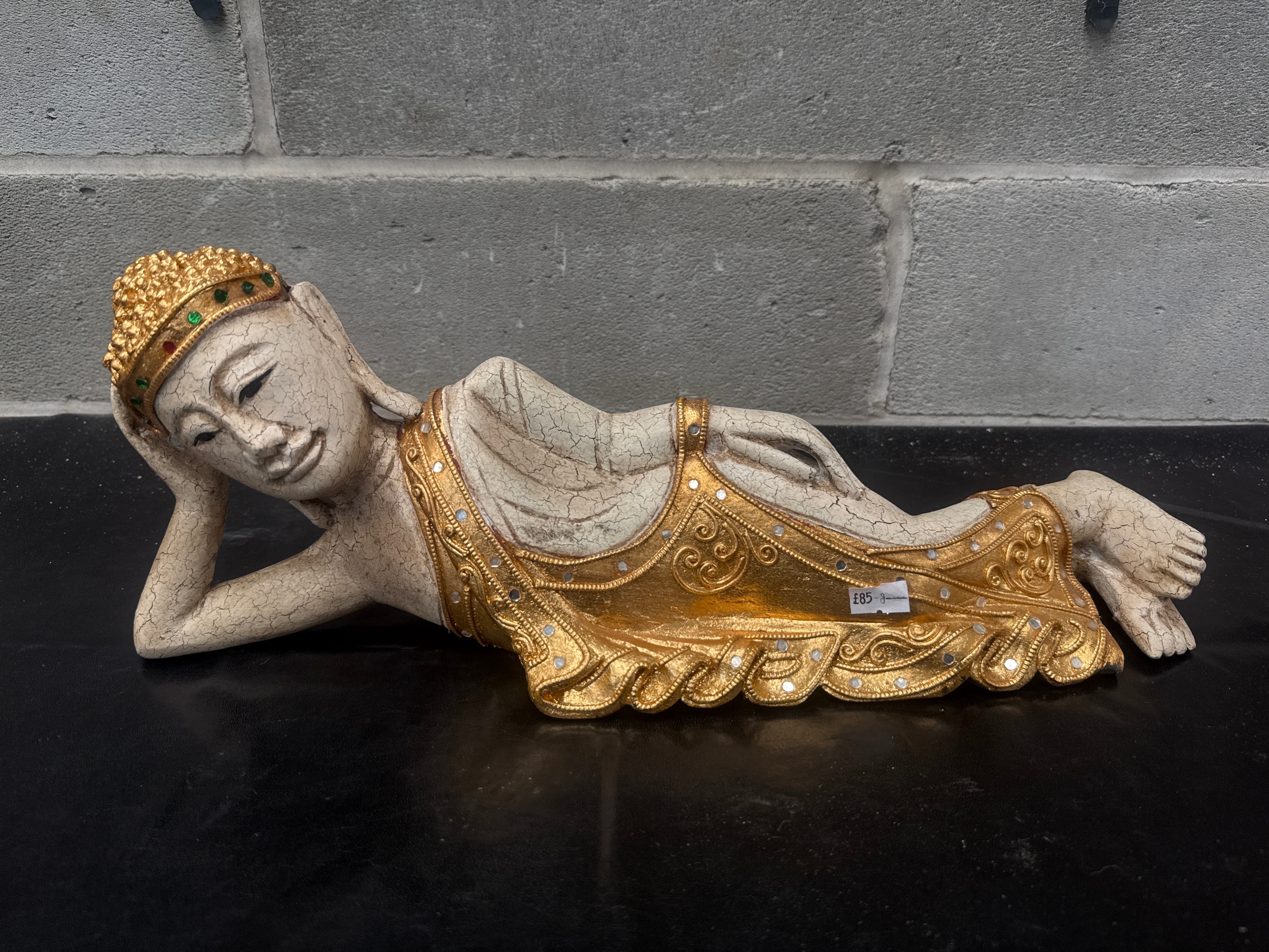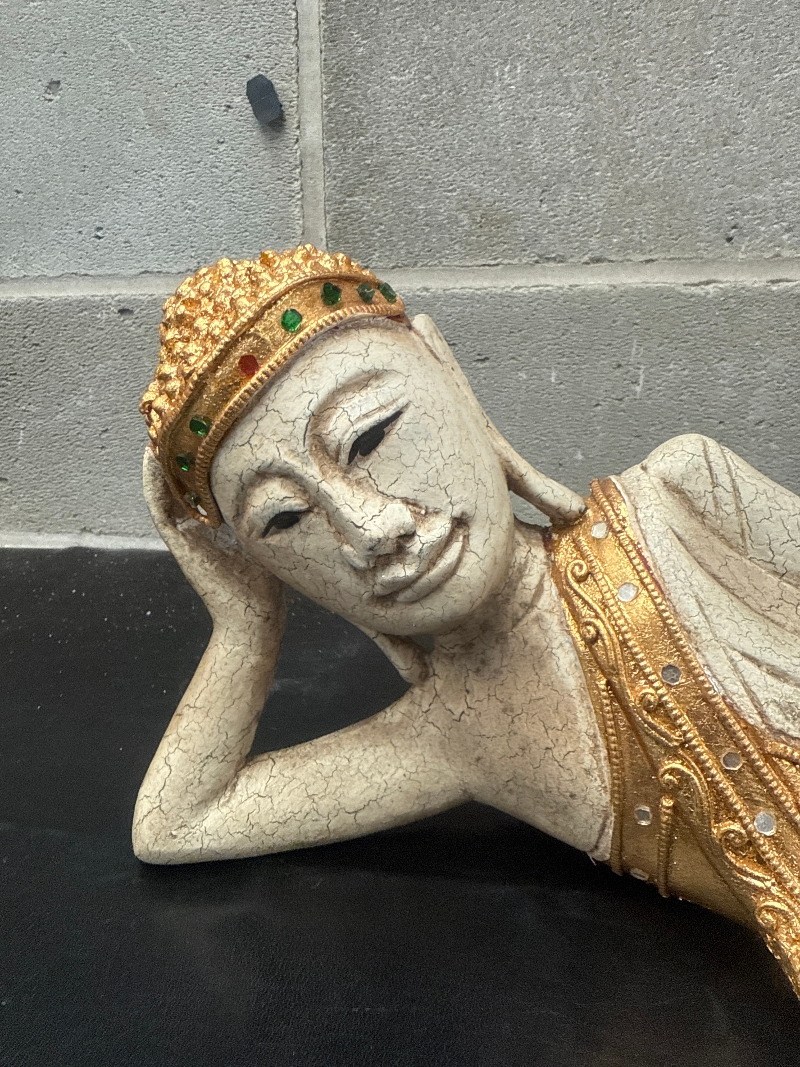 A Parinirvana Buddha figurine, identified as ‘Mahaparinirvana Buddha’ or ‘Parinirvana Buddha’ and originating from India. Rendered in a Southeast Asian-inspired style, depicting a serene figure lying on its right side, head supported by its hand. It is adorned with a golden, jeweled crown featuring red and green accents, and a richly decorated golden robe embellished with numerous mirrored or mother-of-pearl-like accents. The exposed skin areas feature an intentional crackle-glaze finish in an off-white color, suggesting a distressed or aged aesthetic, while the golden areas are smooth. The material is a painted resin or composite, consistent with a modern manufacture designed to emulate an antique.
