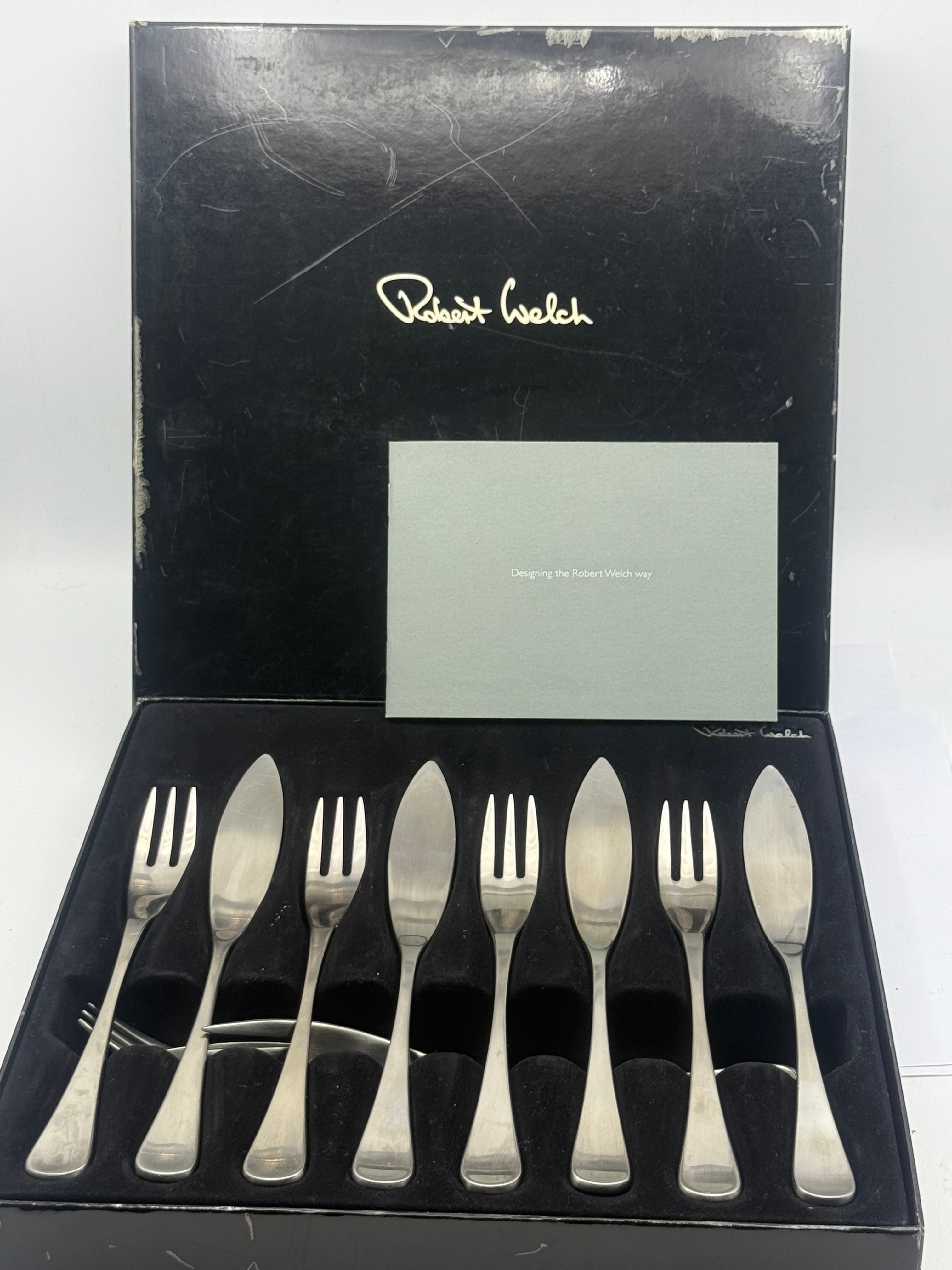 A modern Robert Welch Malvern Bright eight-piece cutlery set, likely crafted from stainless steel, comprising four small three-tined forks and four blunt-edged spreaders or knives, all featuring a minimalist design with gently tapered handles. The set is housed within its original black cardboard presentation box with a fitted black velvet interior. The box lid prominently displays “Robert Welch” in a white script signature, and a small gray card inside is inscribed with the text “Designing the Robert Welch way,” with “Robert Welch” also visible in smaller print below it.