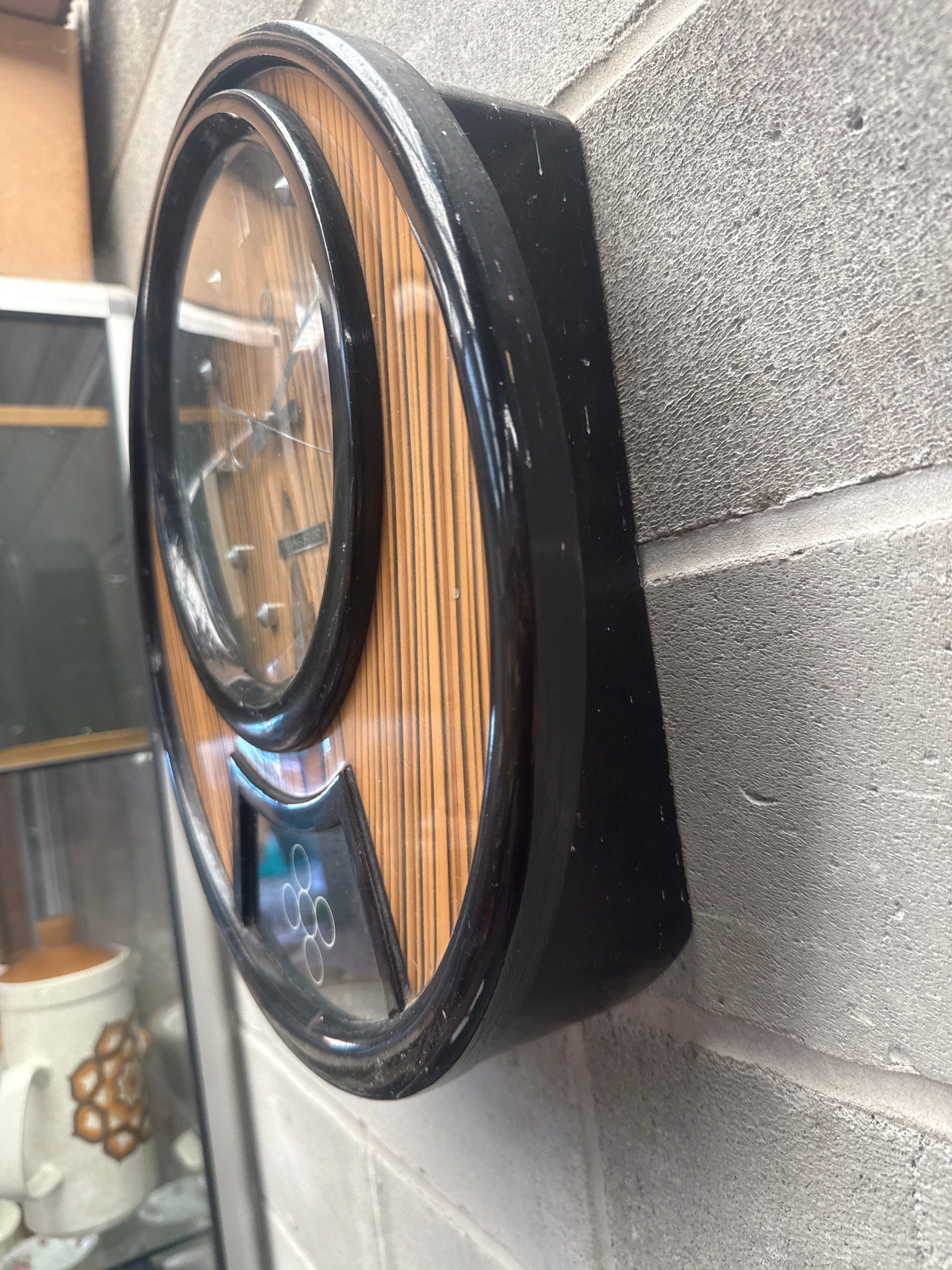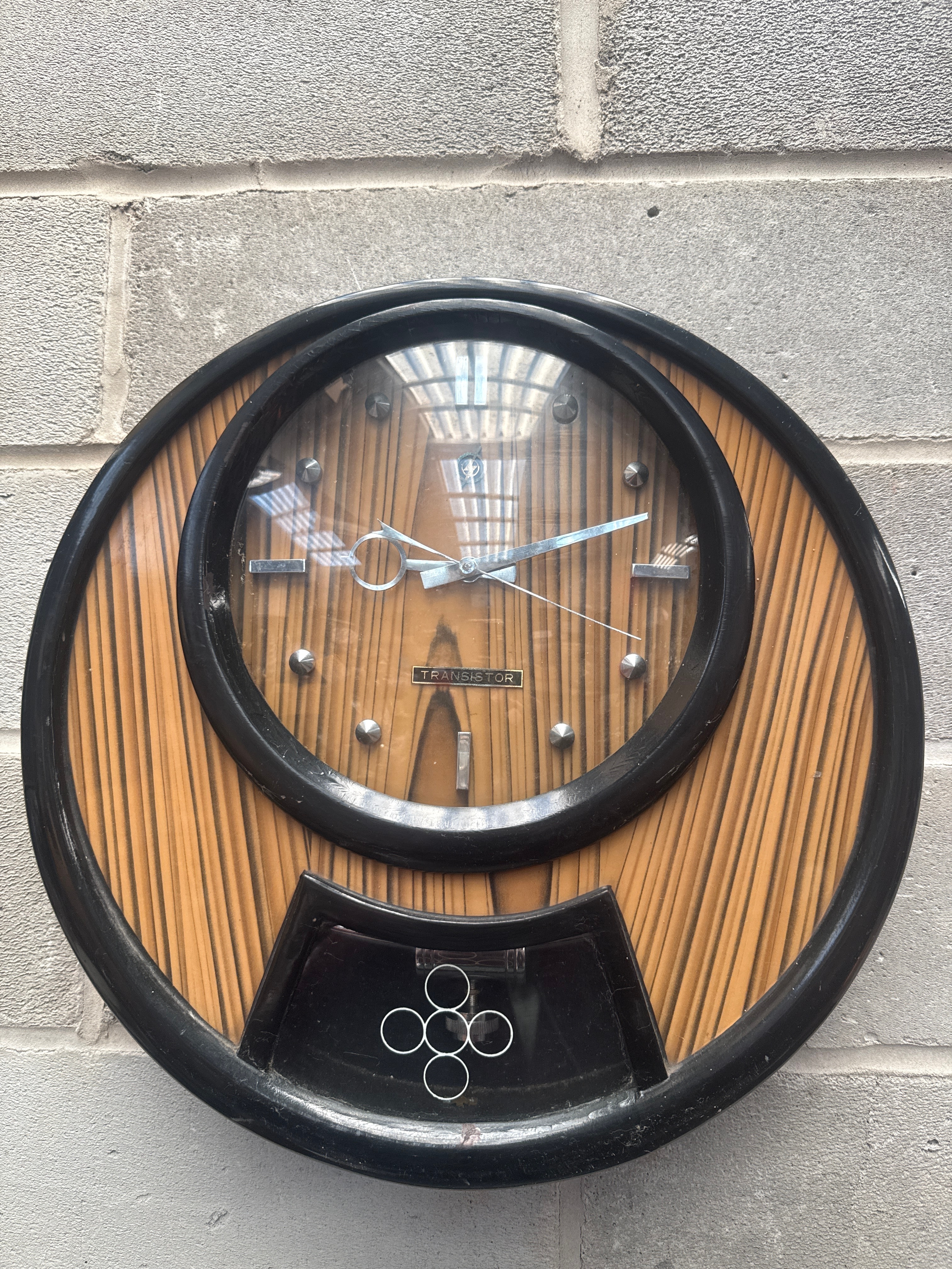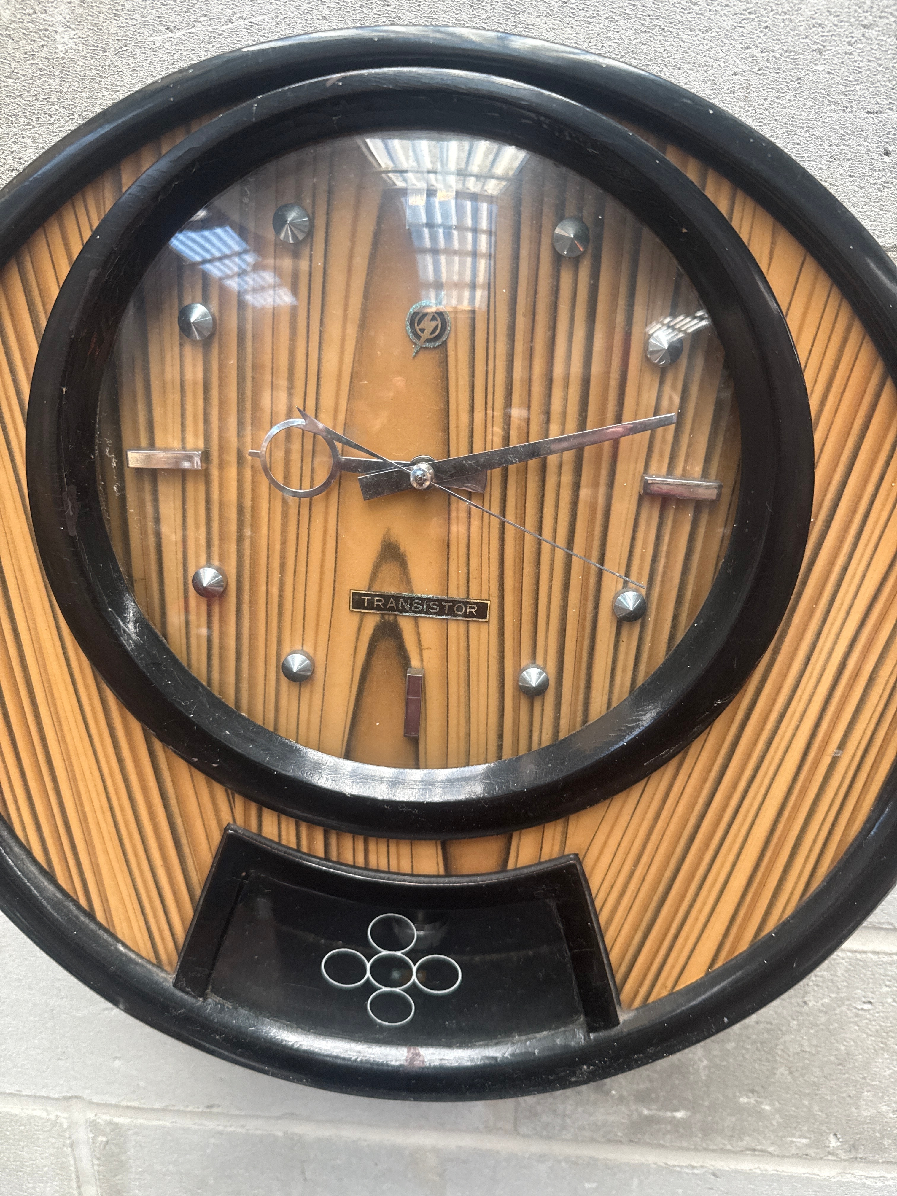 A vintage Japanese Mid-20th Century Modernist or Space Age style oval-shaped wall clock. It features a prominent black frame, likely plastic or bakelite, surrounding a light-toned wood or wood veneer face with a striking linear grain pattern. The clock face is protected by a clear glass cover, behind which are silver-tone metal hands, a mix of stud and rectangular hour markers, and a stylized logo resembling a ‘Z’ at the 12 o’clock position. A rectangular plaque below the center spindle prominently displays the English word “TRANSISTOR.” The lower portion of the clock features a decorative black panel, likely matching the frame material, embellished with a pattern of four interlinked rings.