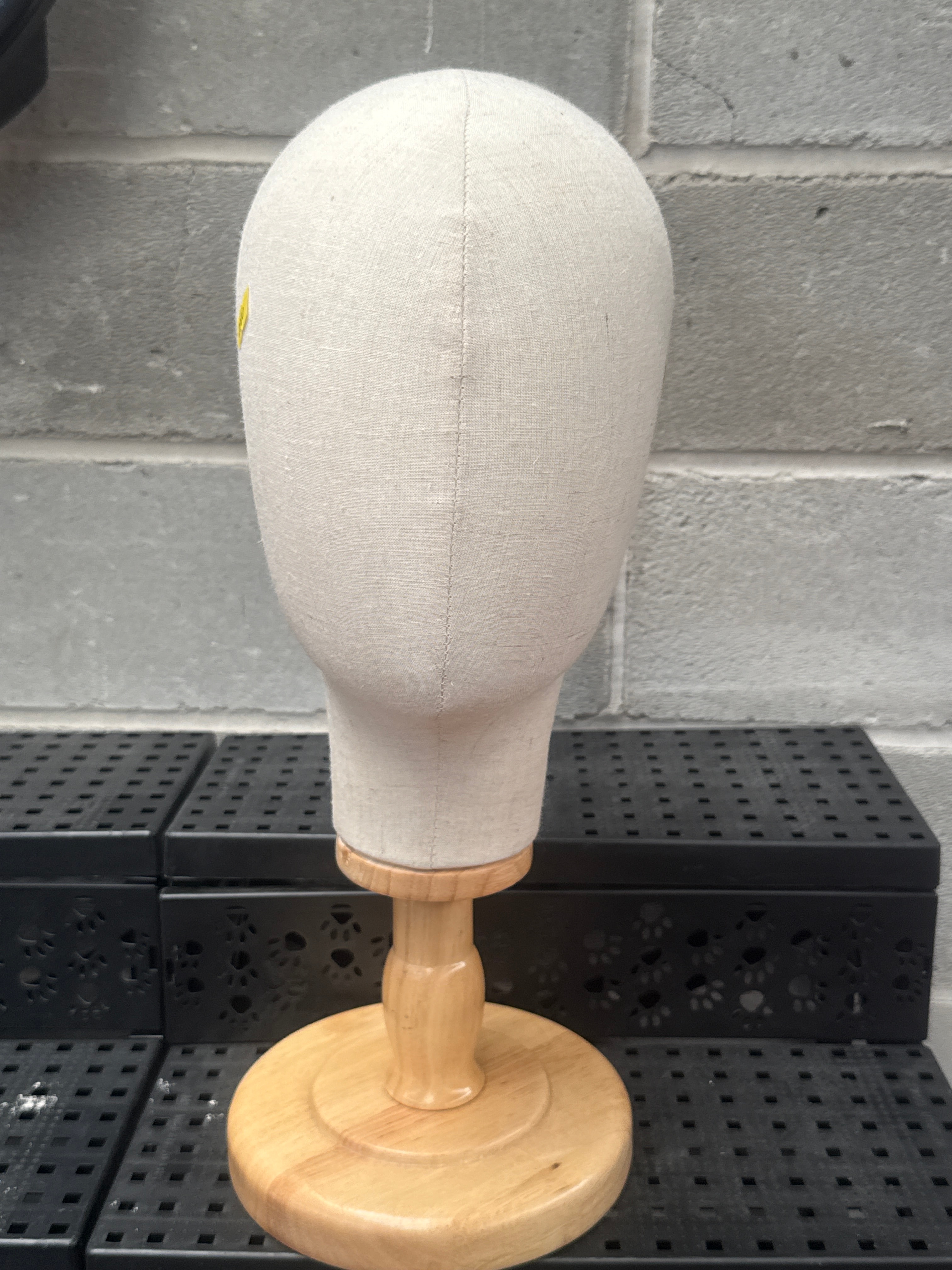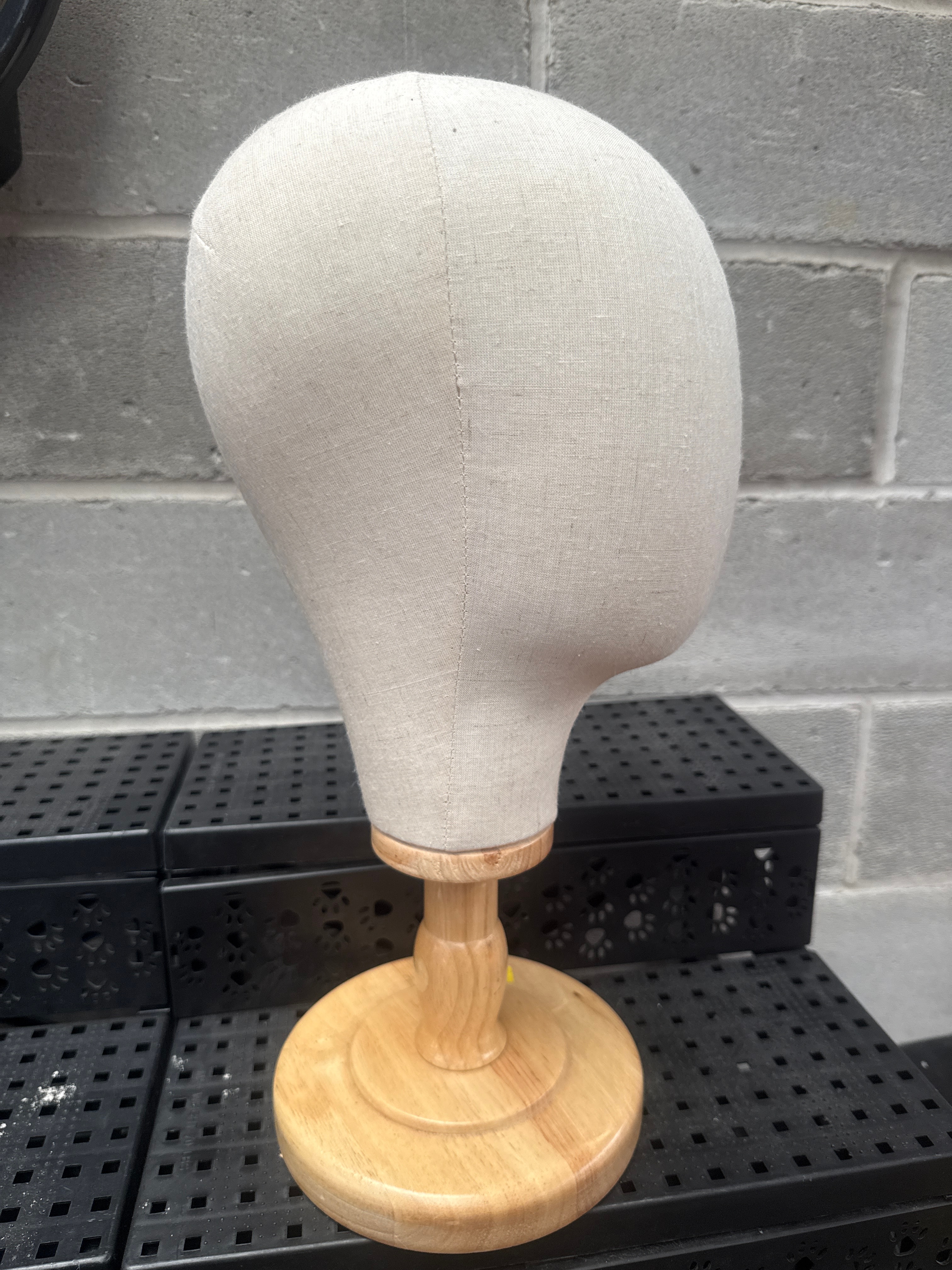 A contemporary display mannequin head featuring a simplified, faceless form covered in a light beige or natural-toned linen fabric, with visible vertical stitching seams. The head is supported by a turned, light-colored wooden neck and a sturdy, circular wooden base. The stand is detachable, suitable for displaying wigs, hats, scarves, or for use in arts and crafts.
