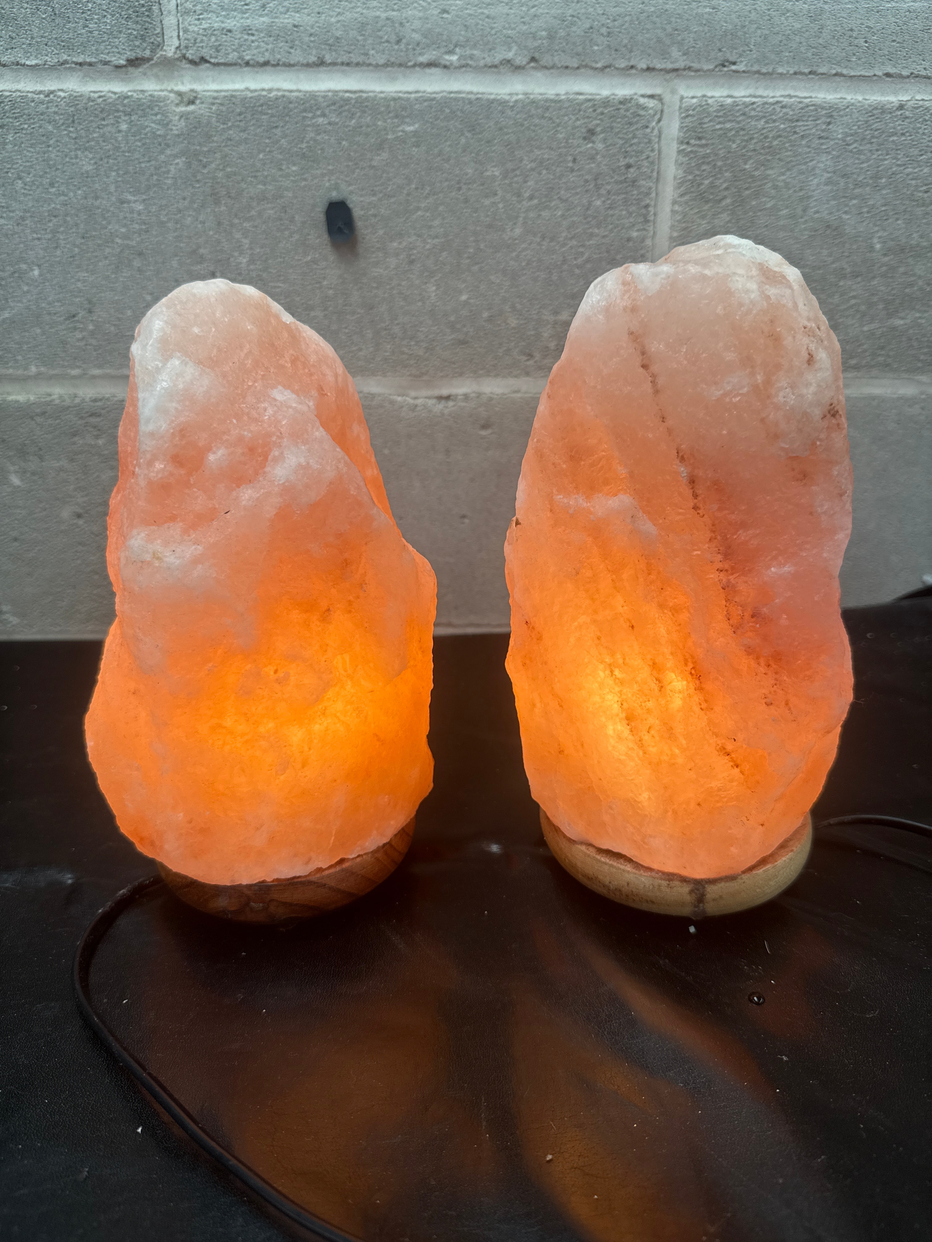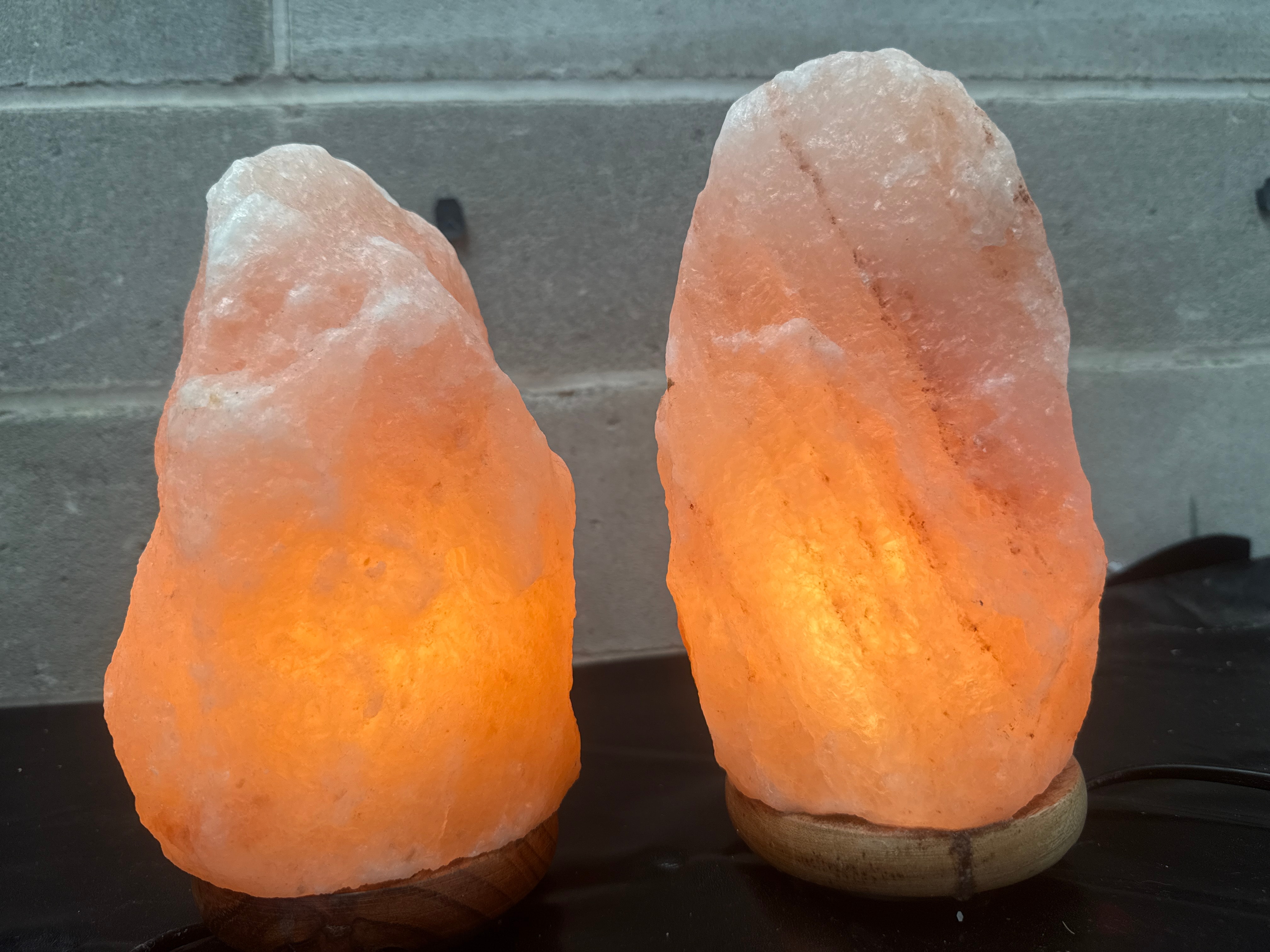 A pair of Himalayan Glow Himalayan Pink Salt Lamps. The lamps are crafted from Salt, each featuring an irregular pink-orange salt crystal illuminated internally and resting on a simple round wooden base. These lamps are consistent with models described as 9 inches tall and often include a dimmer switch. They appear functional and suitable for decorative purposes.