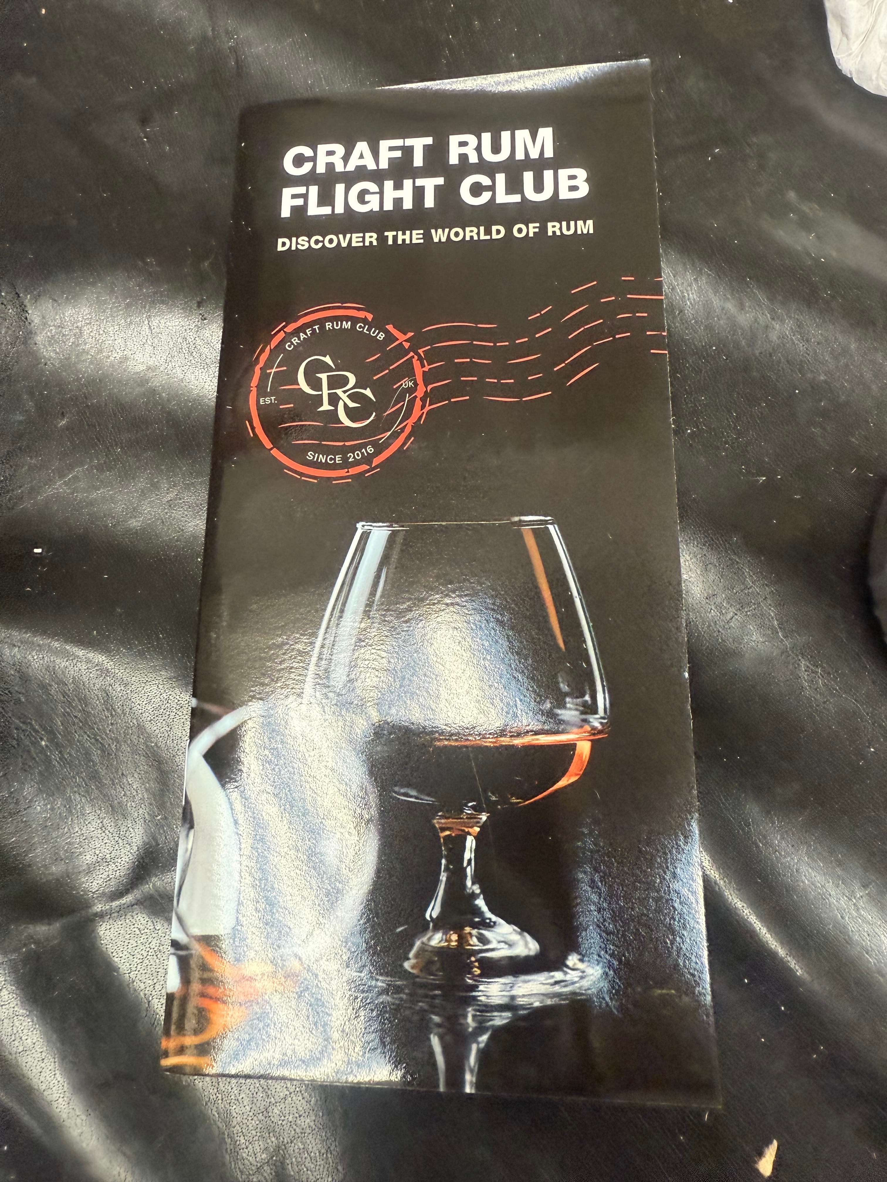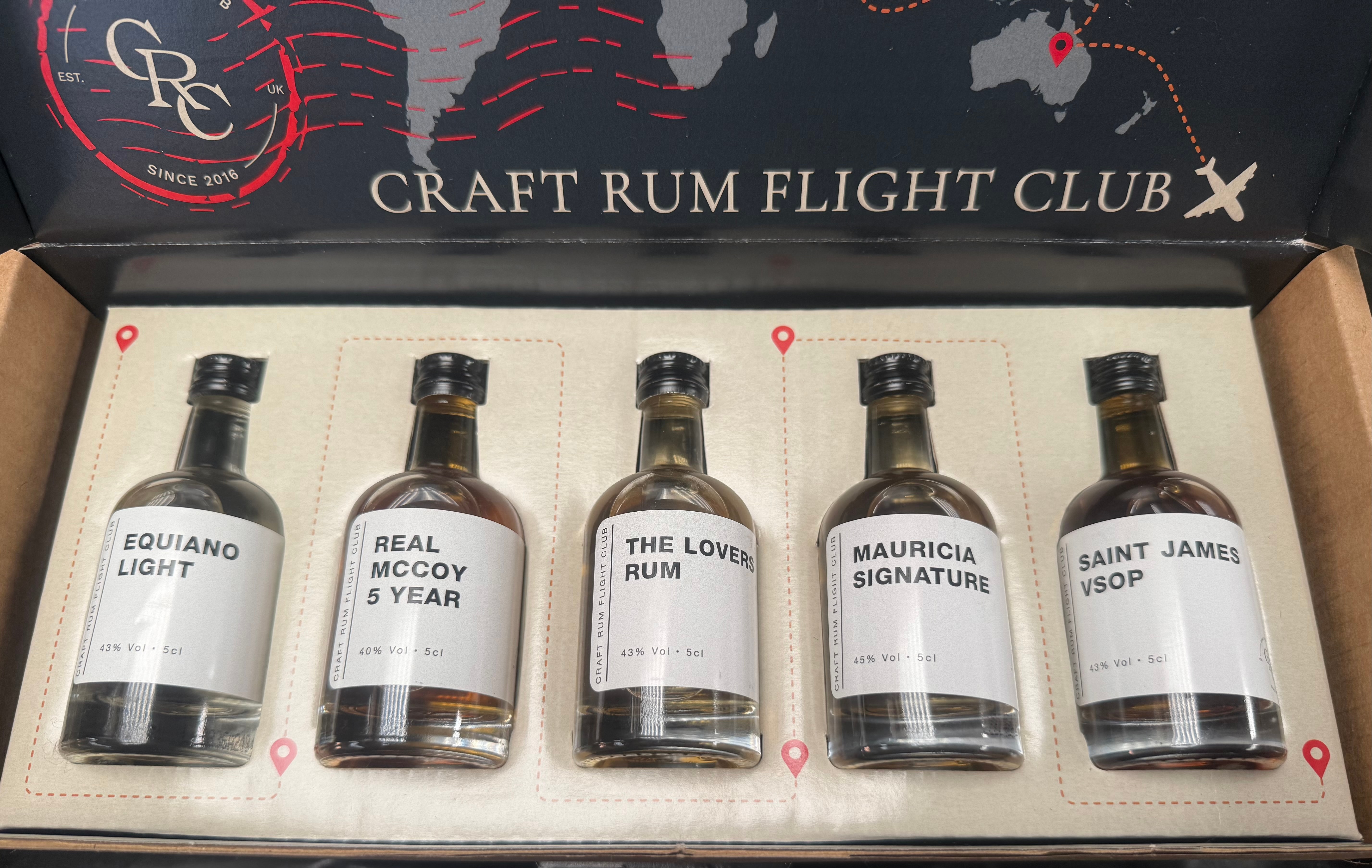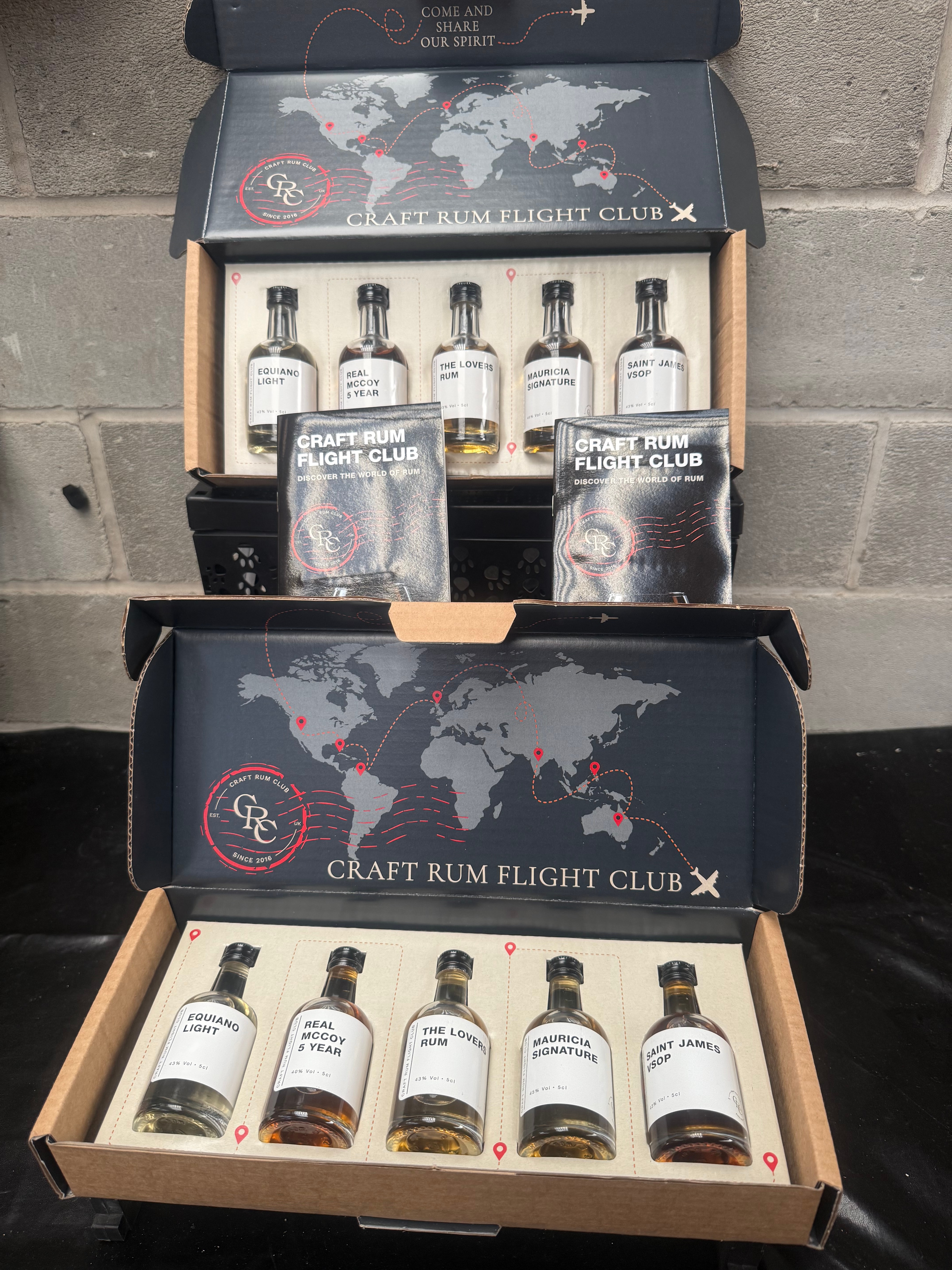 A pair of Craft Rum Flight Club tasting sets. Each set is presented in a modern rectangular cardboard box featuring a world map motif and branding including “EST. UK SINCE 2016.” Each set contains five miniature glass rum bottles, typically 5cl with varying alcohol percentages (e.g., 45% Vol), individually labeled with names such as “Equiano Light,” “Real McCoy 5 Year,” “The Lovers Rum,” “Mauricia Signature,” and “Saint James VSOP.” Accompanying the bottles in each set are a small black promotional item, likely a wallet or booklet, embossed with the “Craft Rum Flight Club” logo, and a paper informational booklet further detailing the club and its offerings. All visible text is in English.