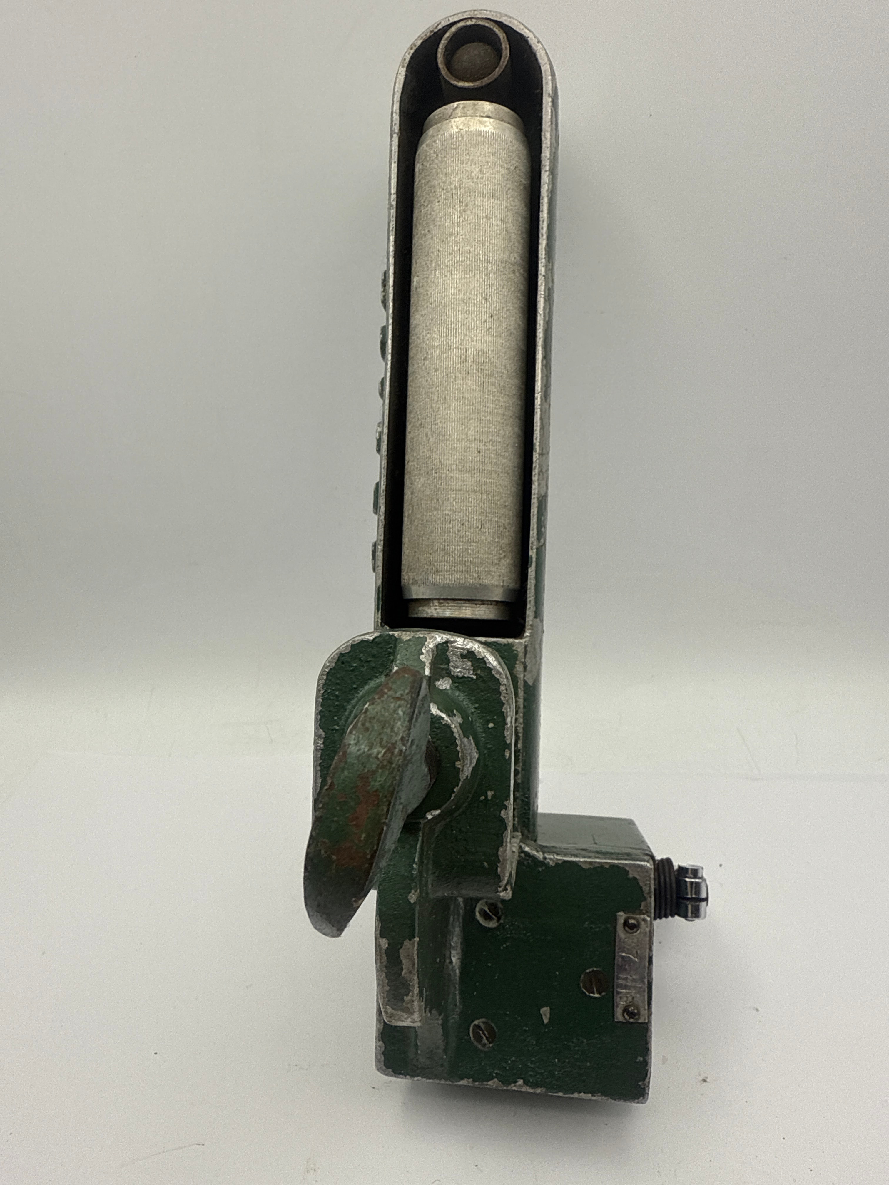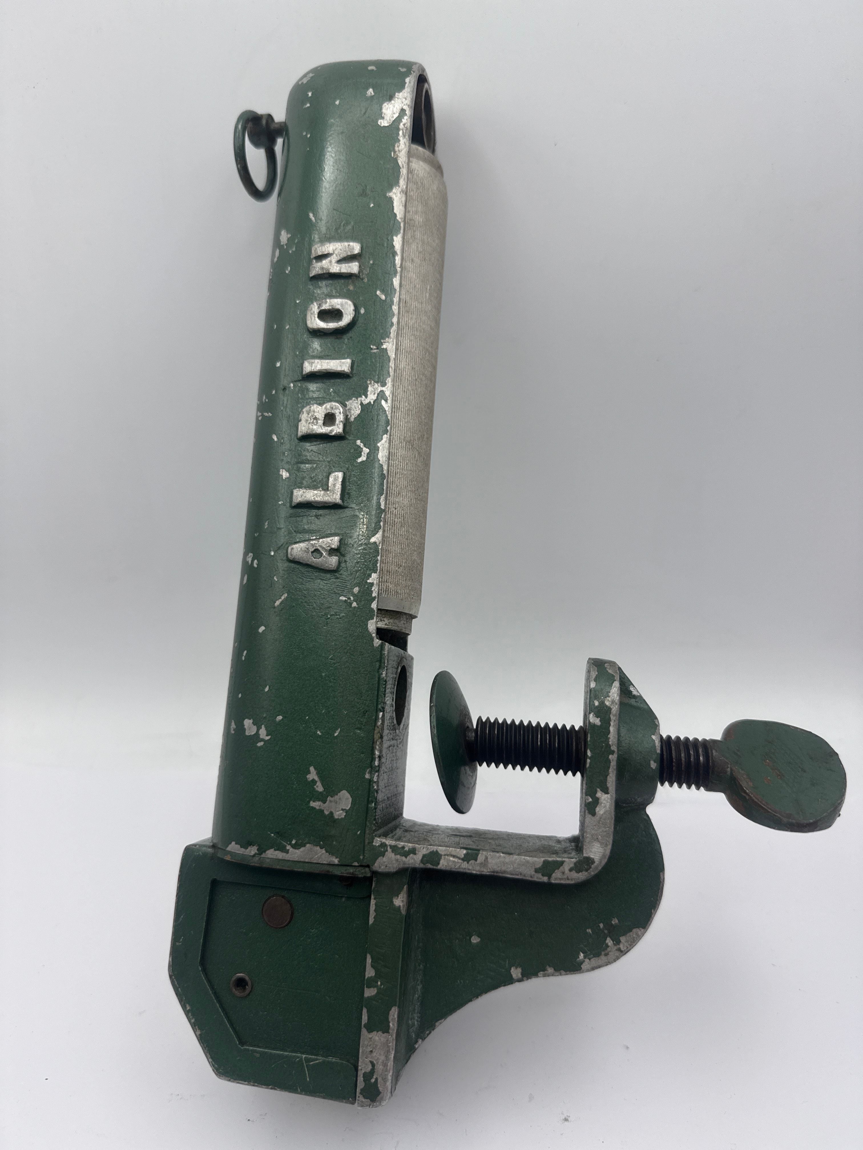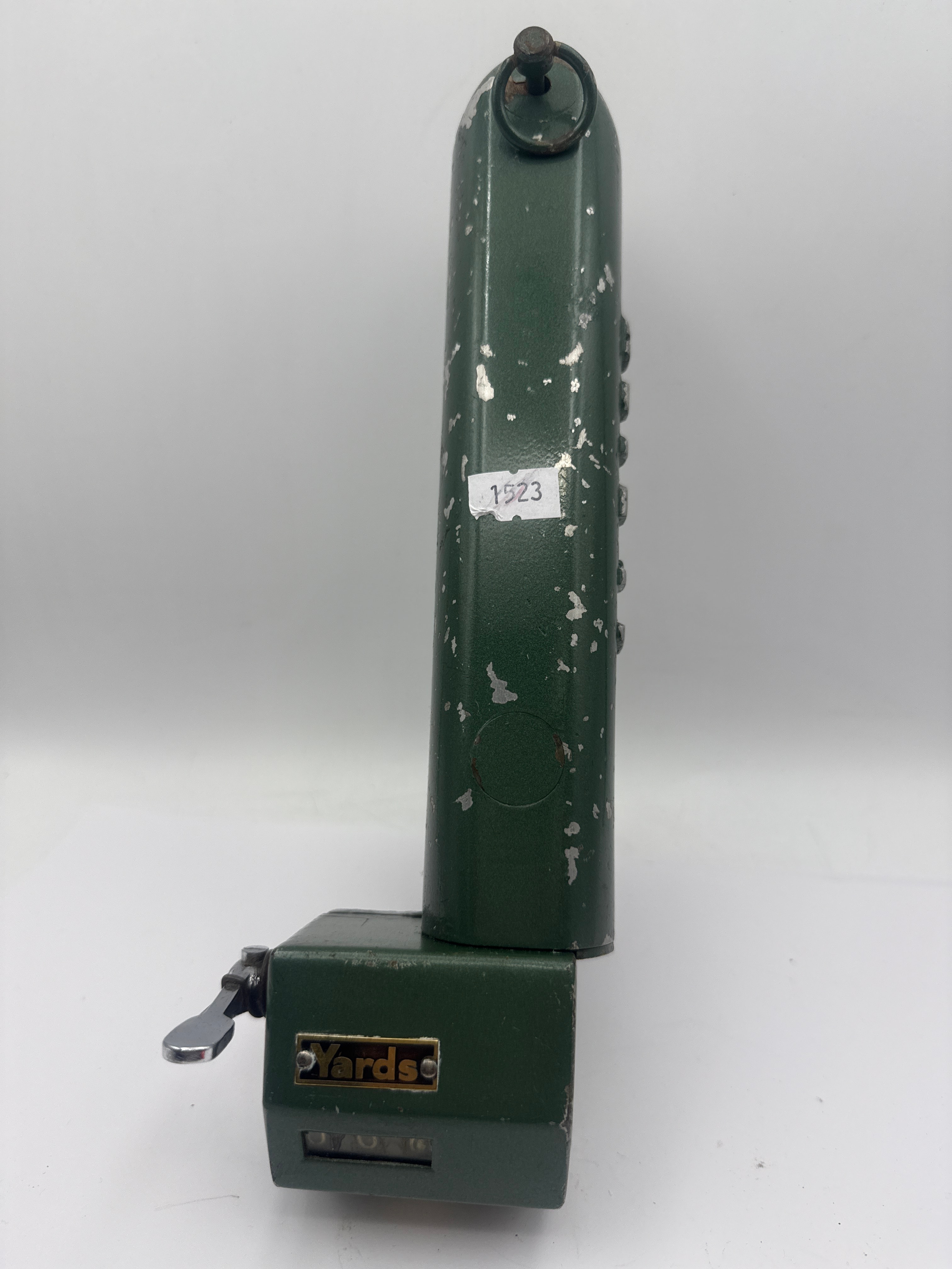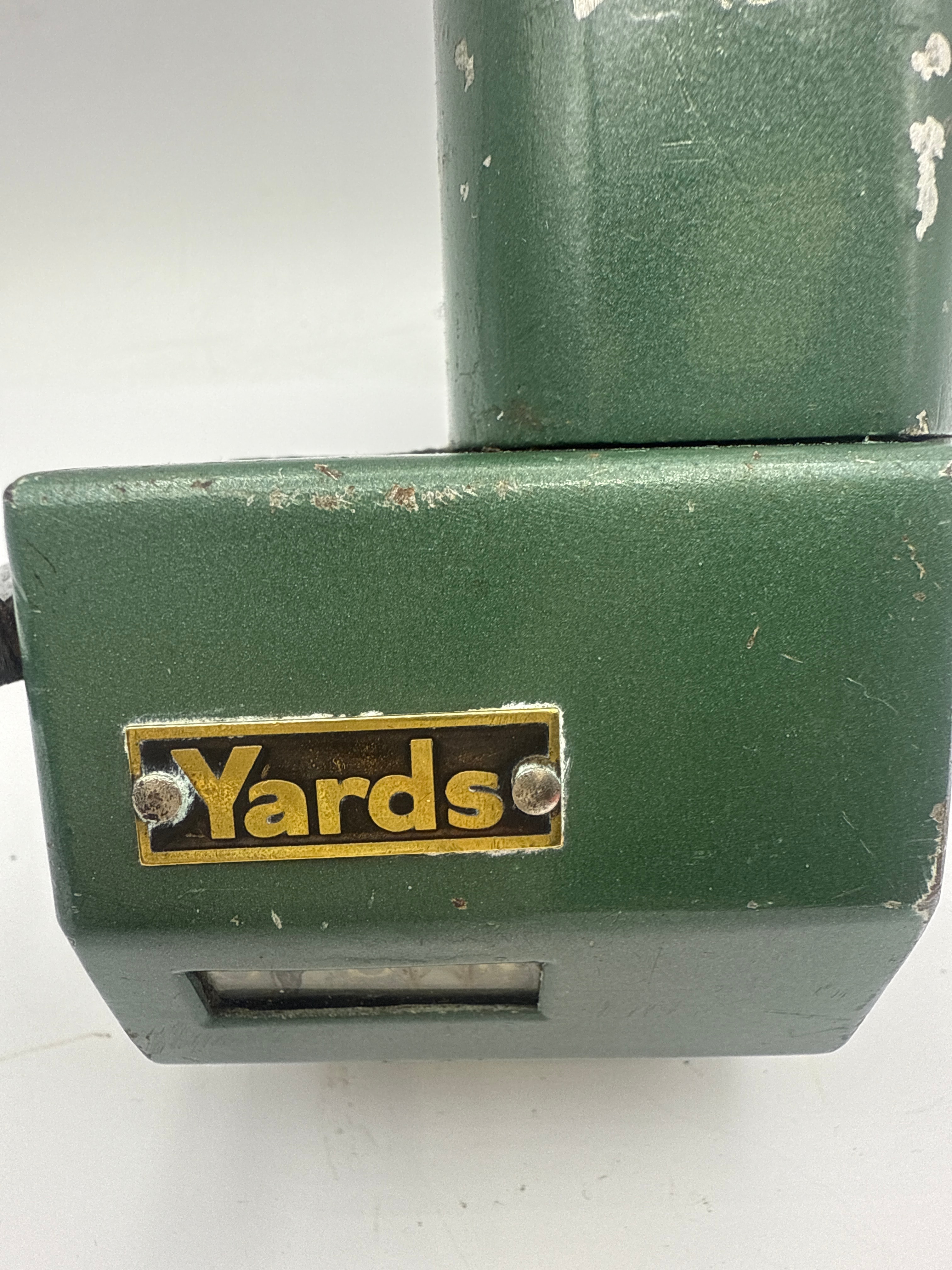 A vintage mechanical counter or measuring device, likely for textiles or materials, constructed from painted metal, possibly cast iron or steel, in a dark green finish. The item features a prominent roller, an integrated C-clamp for mounting, and a numerical display currently showing “970”. Identifiable markings include a golden rectangular plaque reading “Yards” and the name “ALBION” embossed vertically on the main body. A sticker displaying “1523” is also present. The utilitarian design suggests a mid-20th century origin.