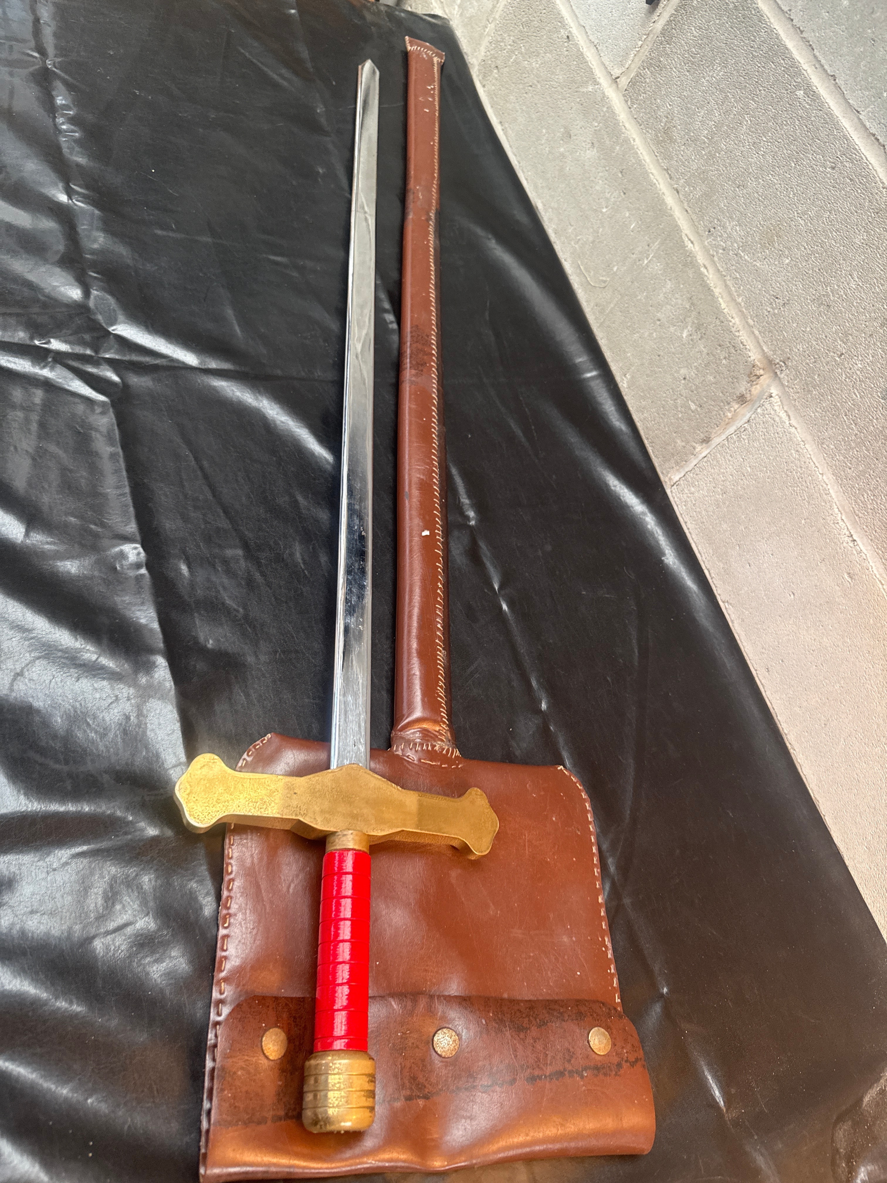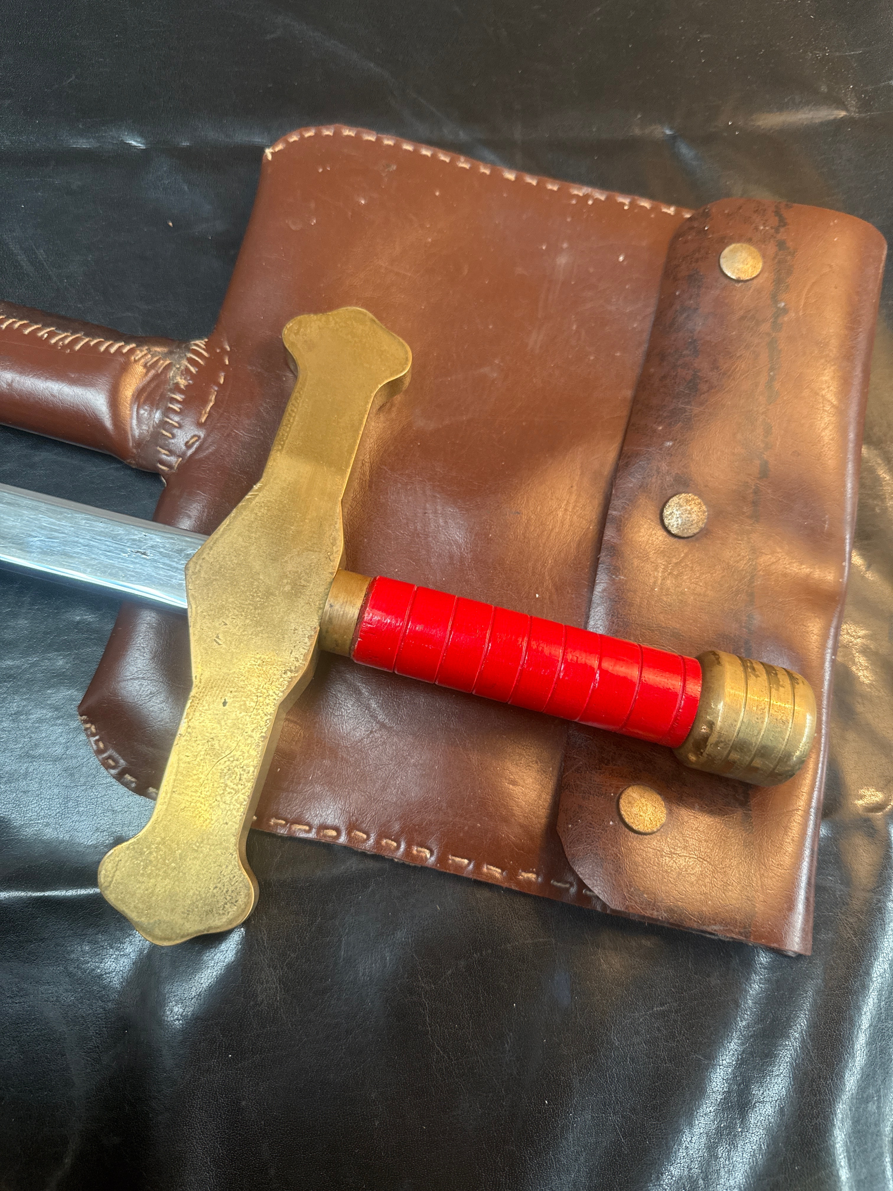 A decorative King Solomon sword. This single-edged sword features a polished metallic blade. The hilt is characterized by a cruciform guard and a disc-shaped pommel, both appearing to be made of a brass-toned metal. The cylindrical grip is wrapped in a bright red material. It is accompanied by a fitted brown leather or faux leather scabbard, constructed with visible stitching along the edges and featuring brass-toned rivets or snaps, with a fold-over flap closure at the top where the hilt rests. No discernible text or markings are visible on any component.