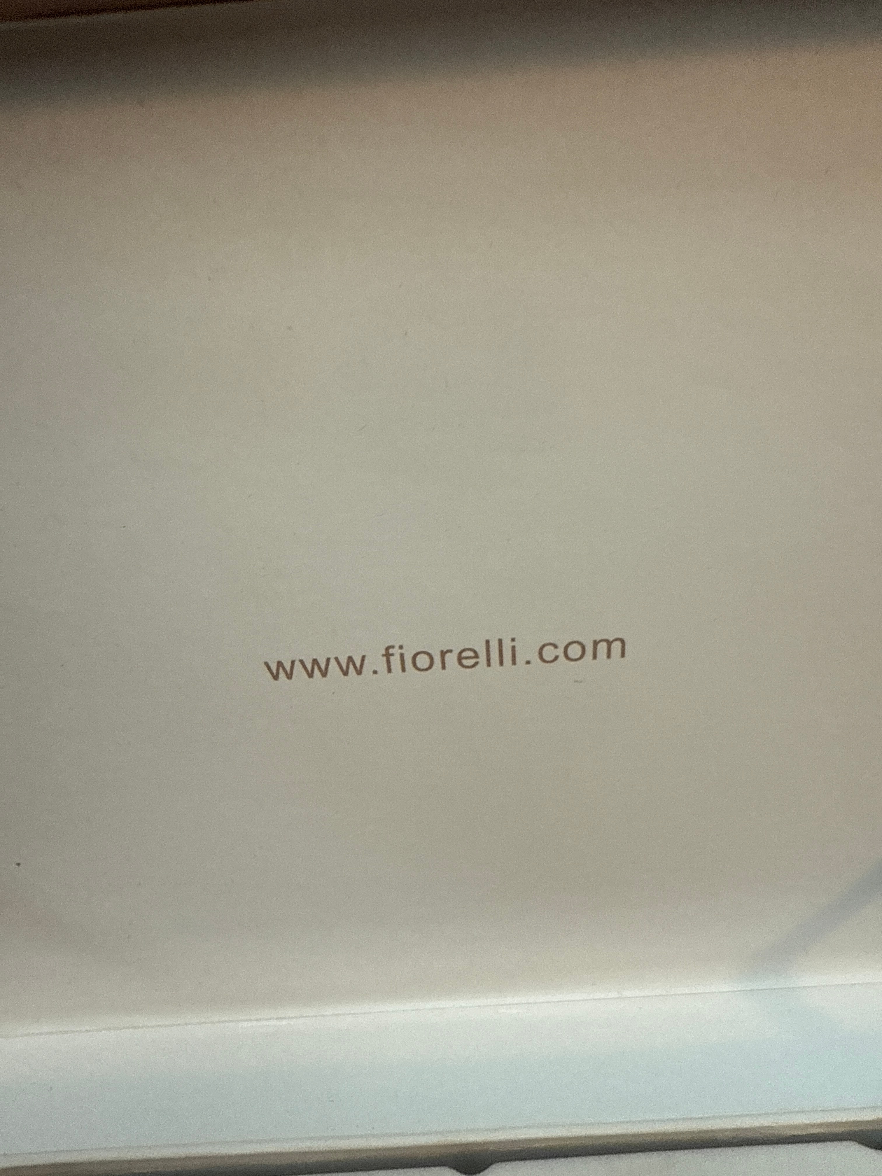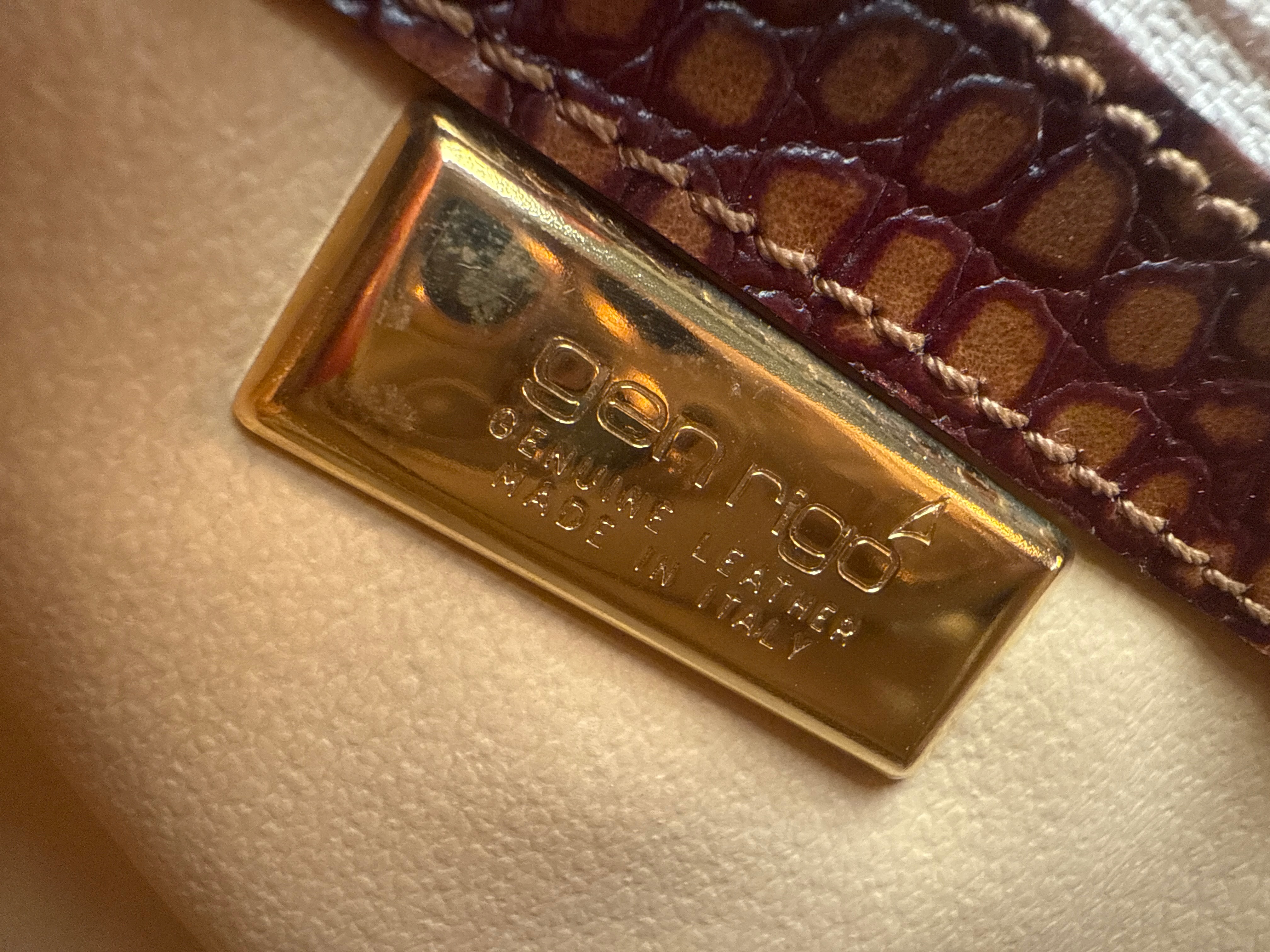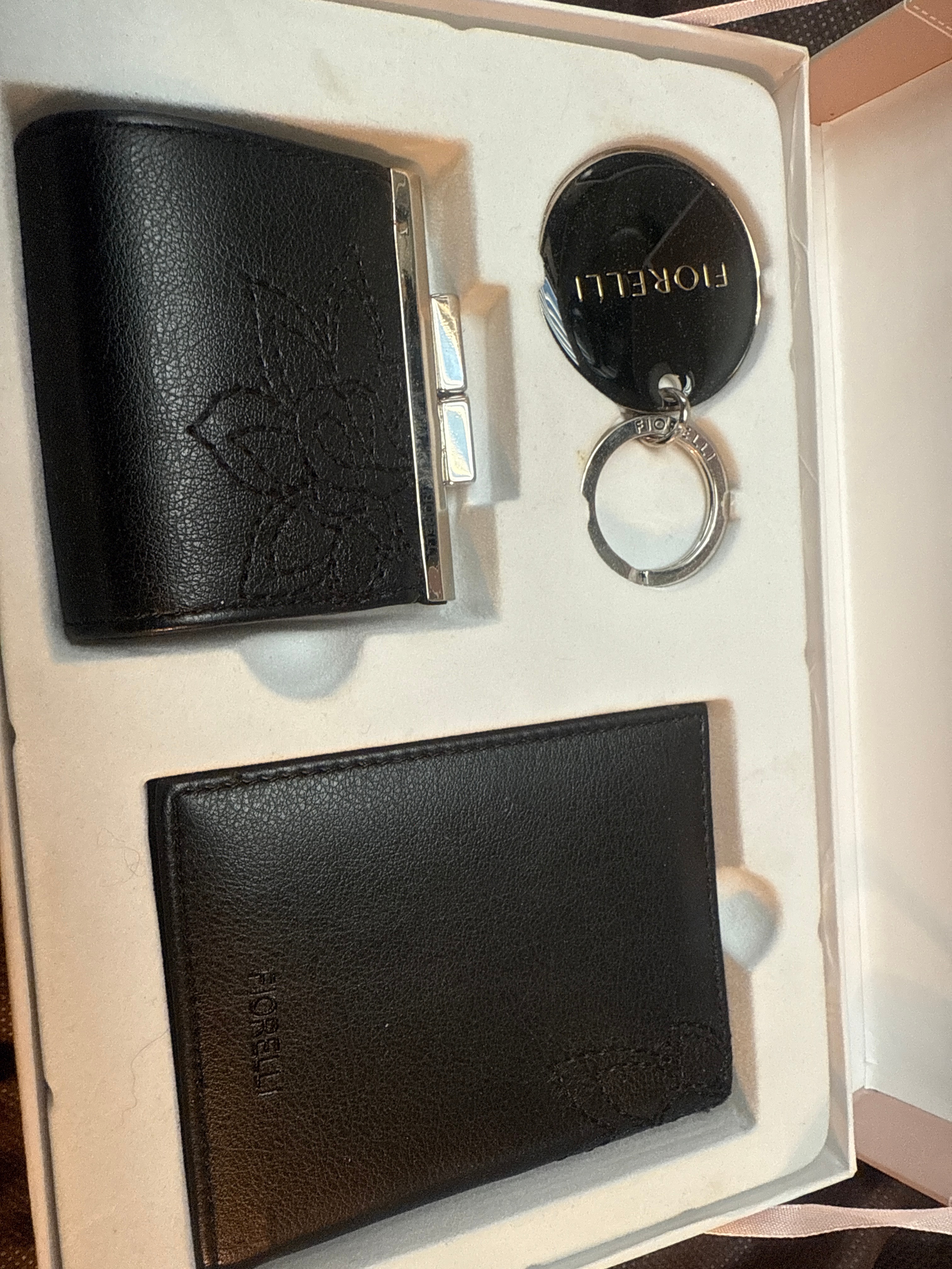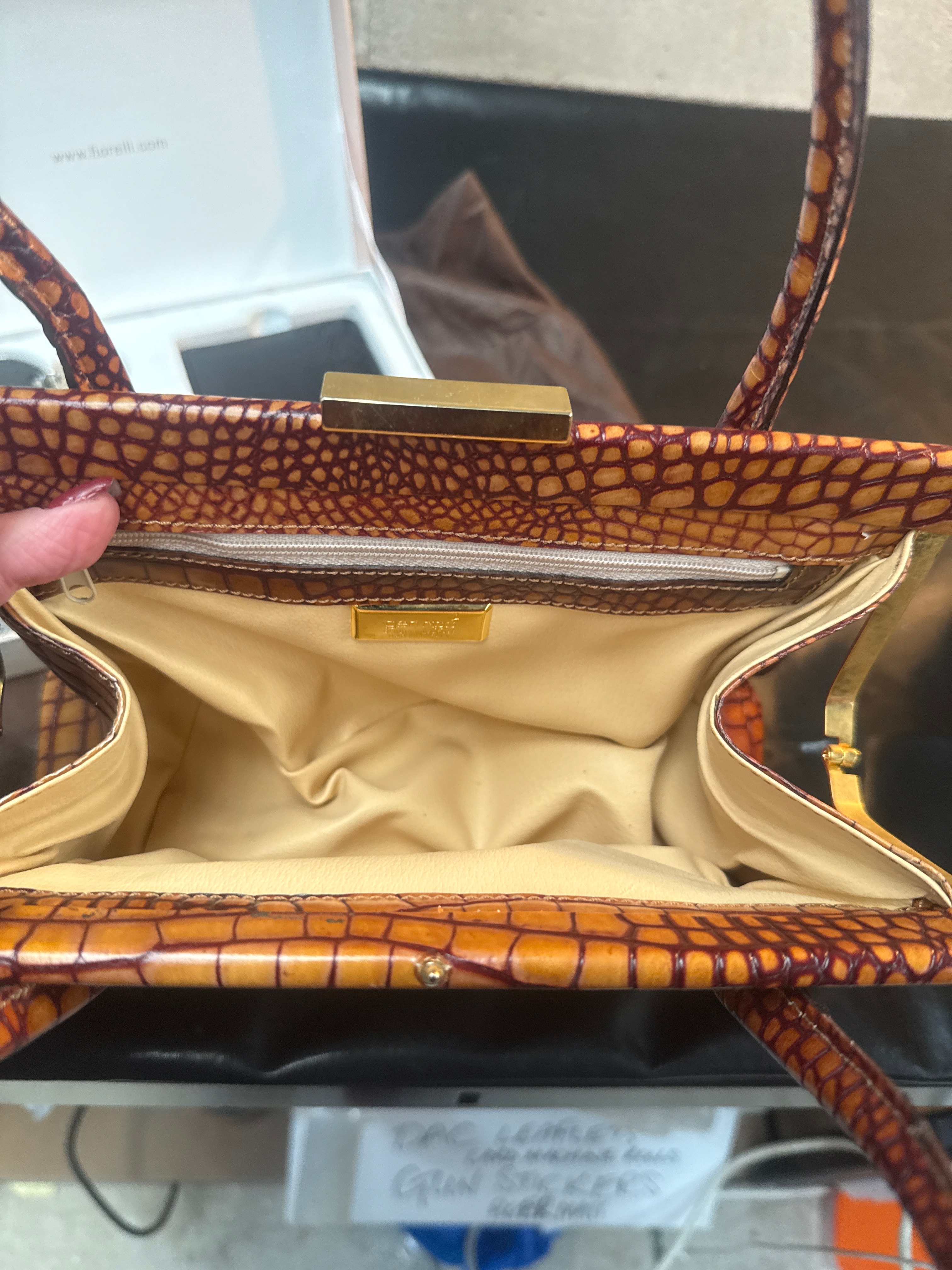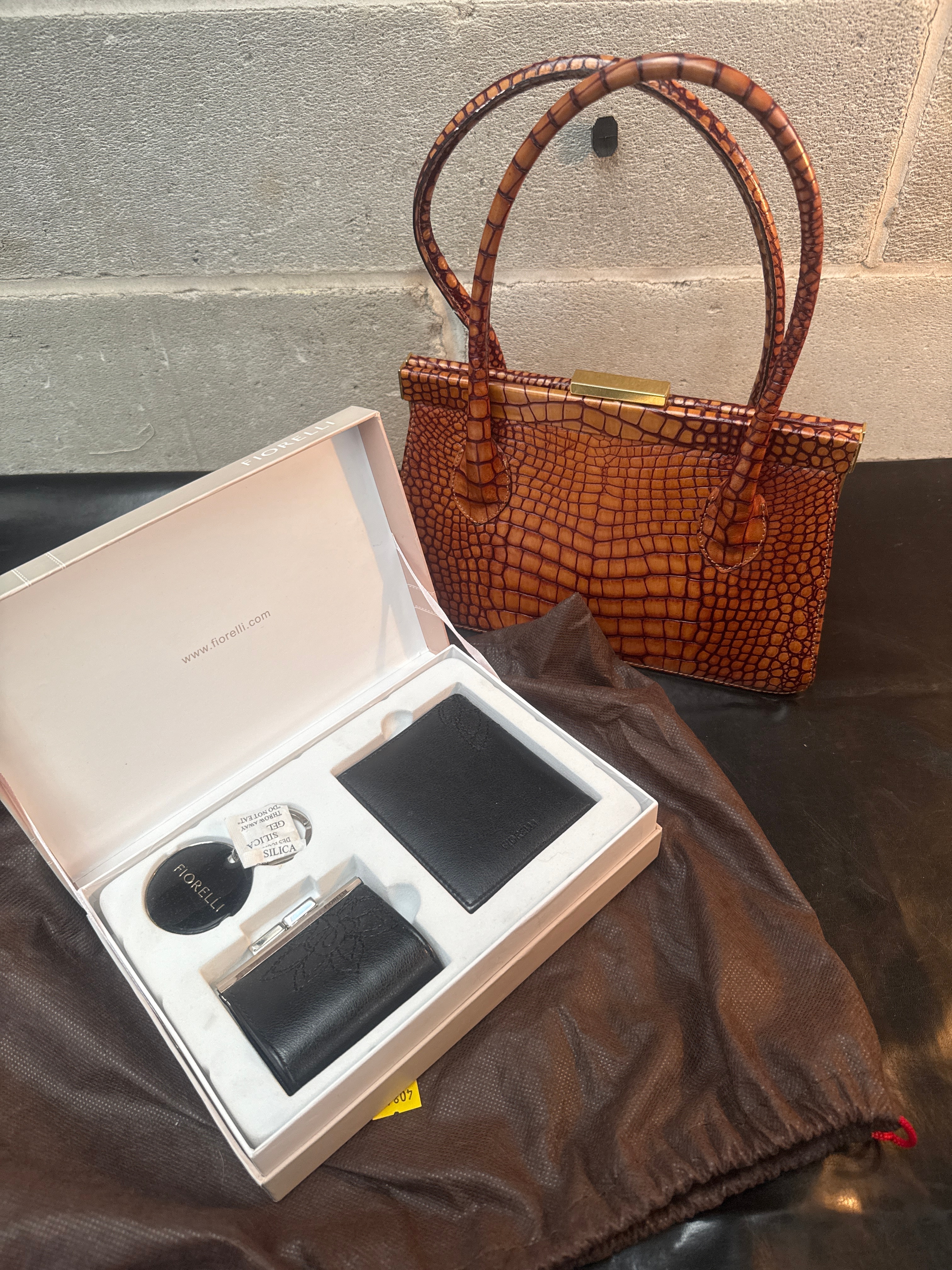 The lot comprises two items: a structured, top-handle frame handbag and a boxed accessory set. The handbag features a shiny brown and tan embossed material mimicking crocodile or alligator skin, secured by a gold-tone clasp. Its interior is lined with a light cream material and contains a gold-tone plaque marked ‘gen riga GENUINE LEATHER MADE IN ITALY’. The accompanying white cardboard box, displaying ‘www.fiorelli.com’ on the inner lid, presents a black three-piece accessory set. This set includes a small rectangular case with an embossed floral design and metal clasp, a bi-fold wallet or card holder, and a circular key ring prominently labeled ‘FIORELLI’. A ‘SILICA GEL’ desiccant packet is also visible within the box.