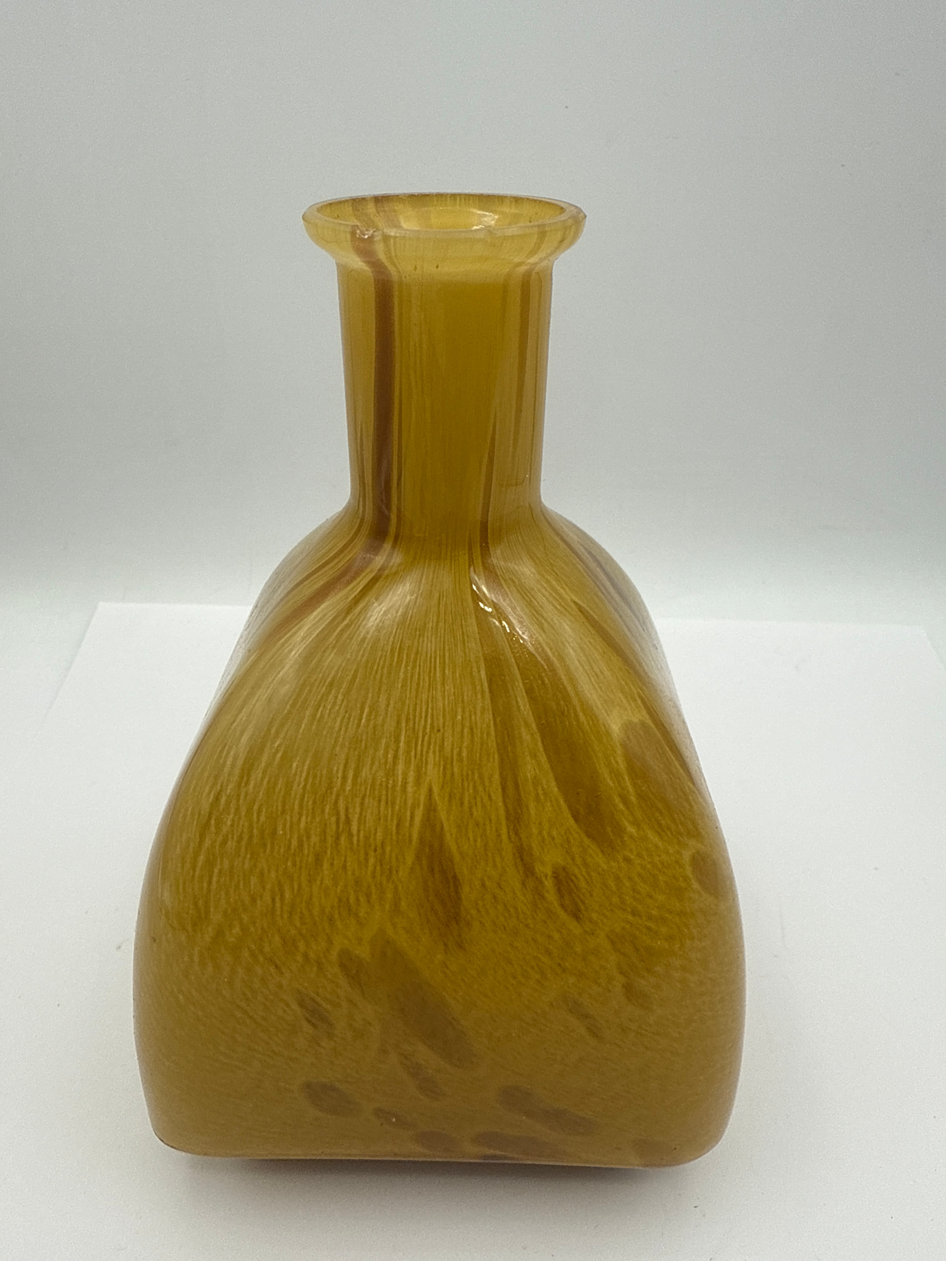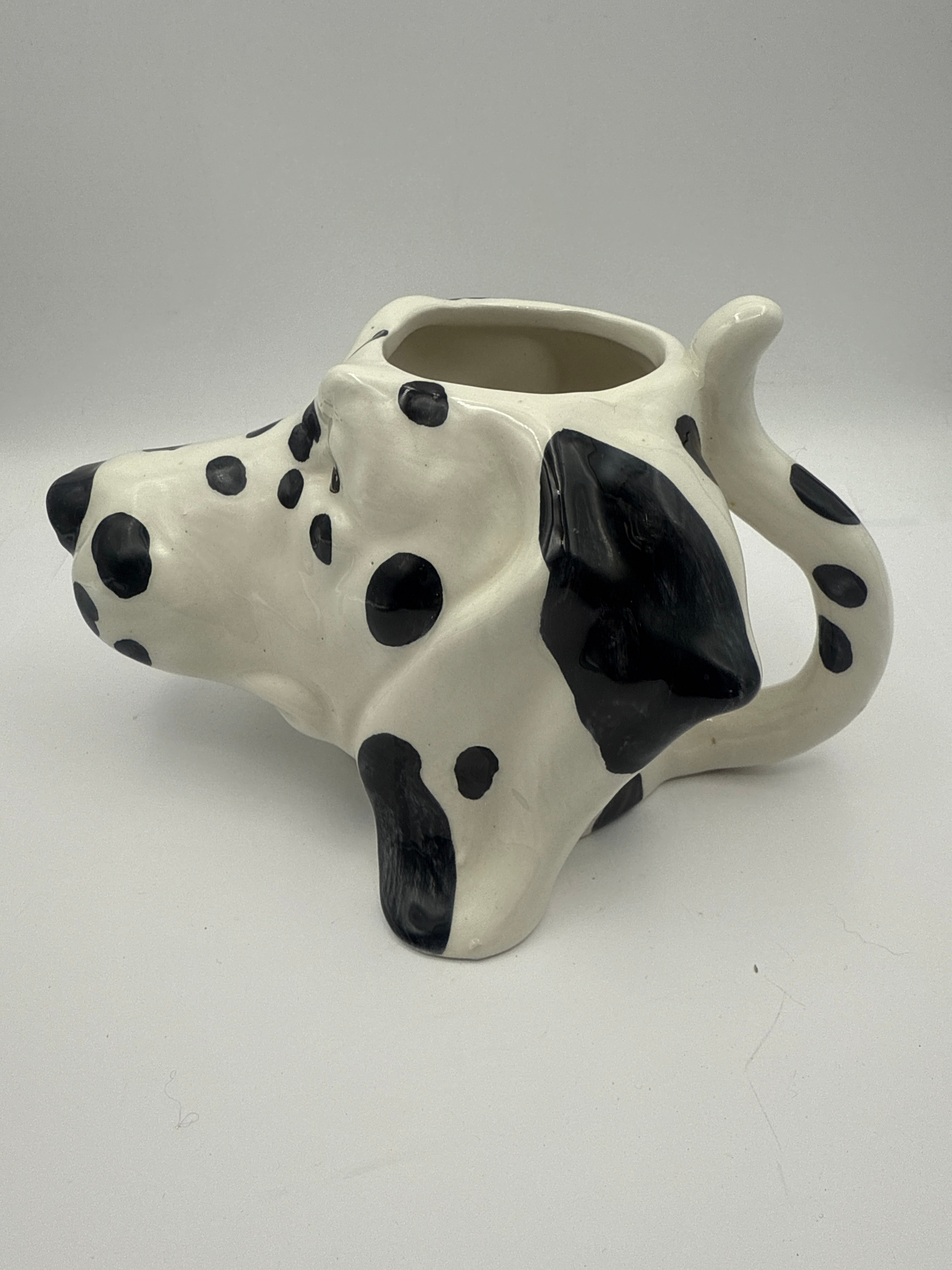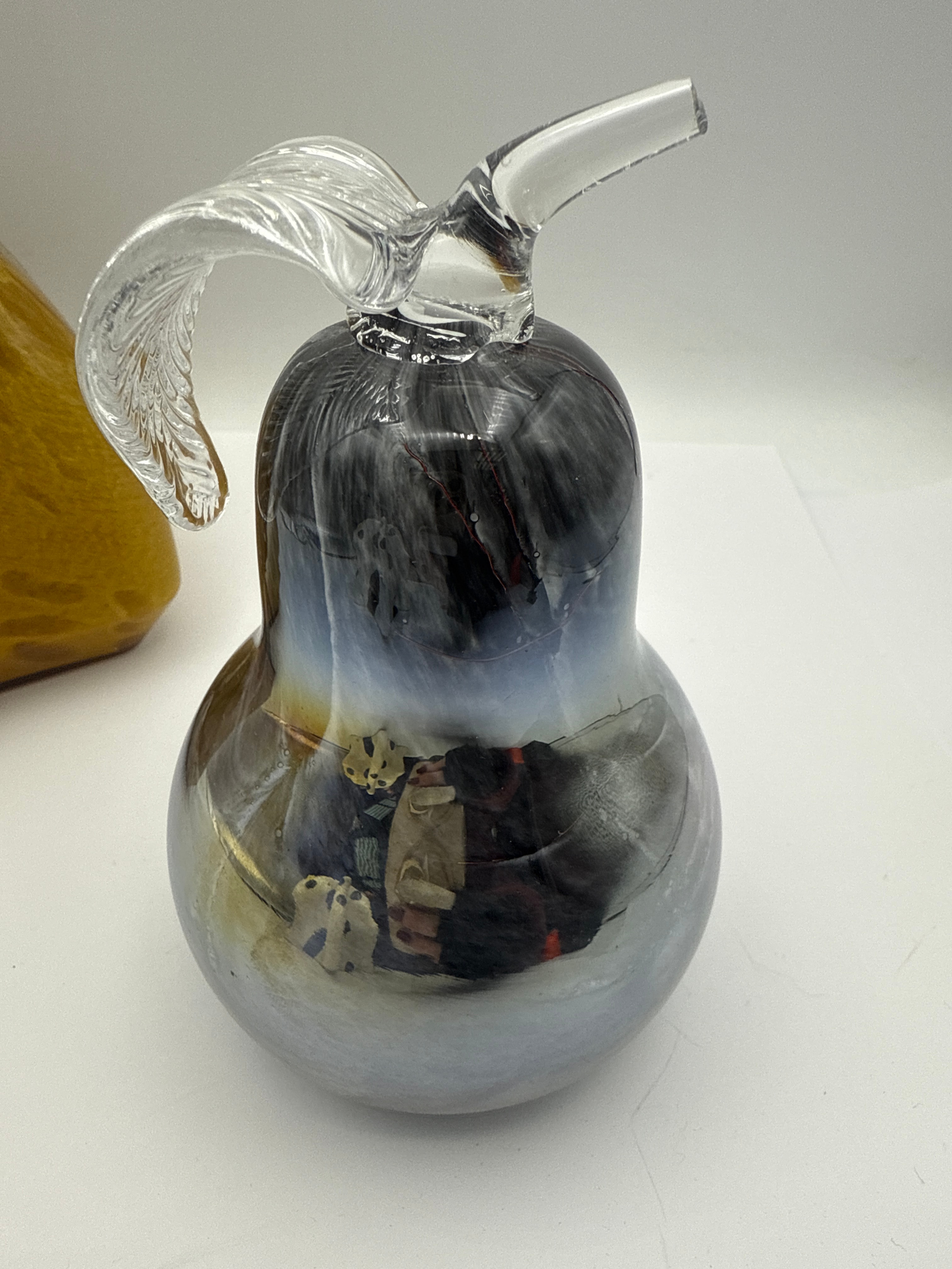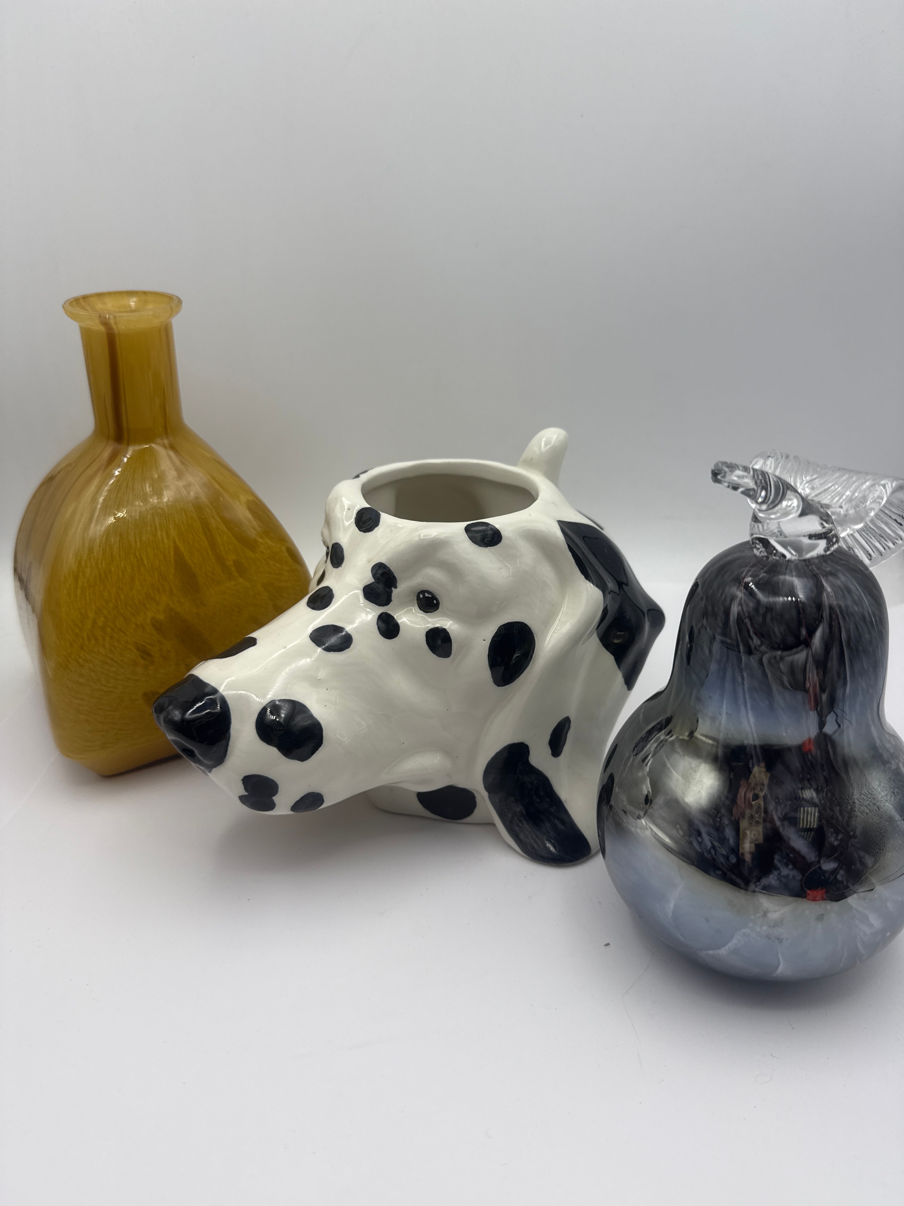 A group of three decorative objects. Comprising a squat, opaque amber-yellow glass bottle or vase with a subtle streaked pattern; a white ceramic pitcher or planter molded and glazed as a Dalmatian dog’s head, featuring prominent black spots and a curled tail-like handle; and a contemporary art glass sculpture in a pear or gourd shape, exhibiting swirled black, gray, and white coloration, surmounted by a clear glass bird figure.