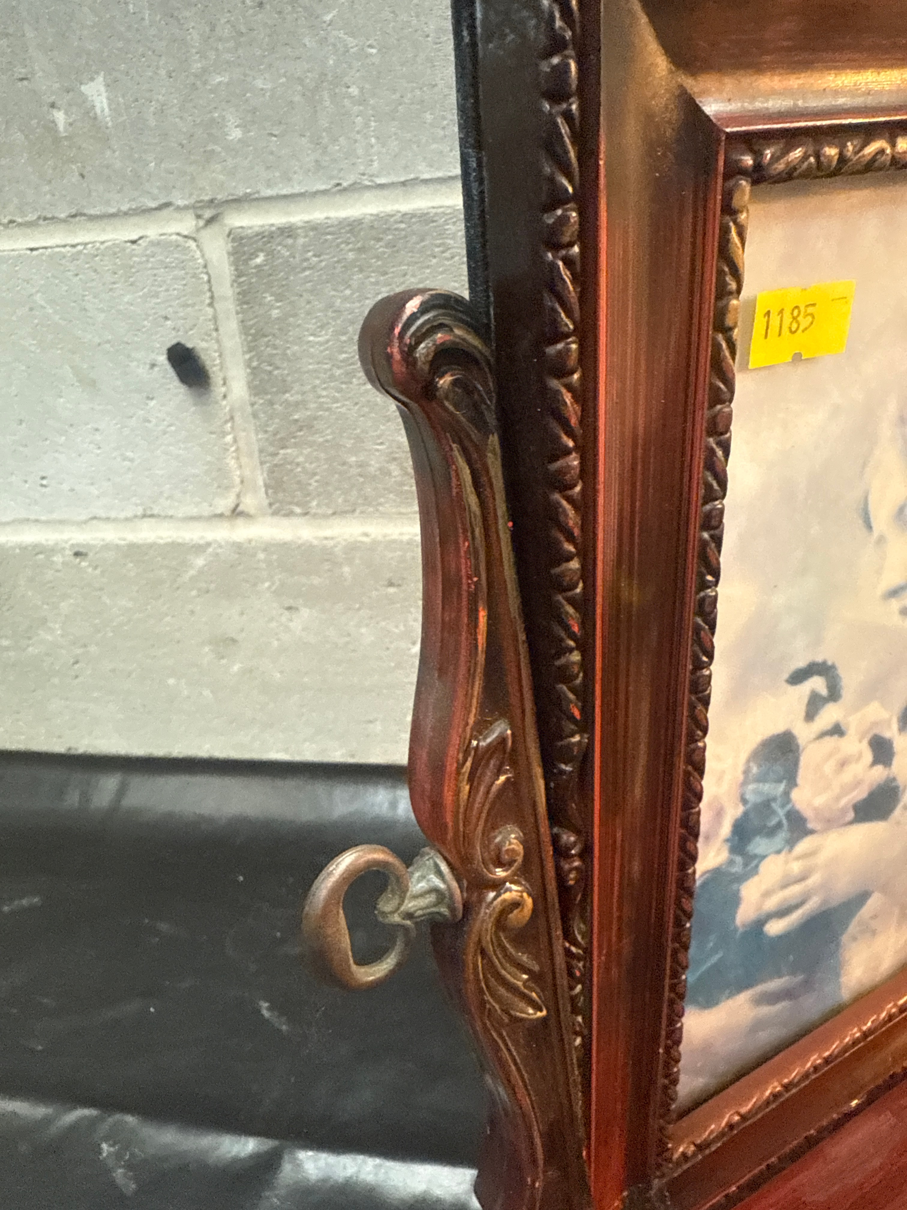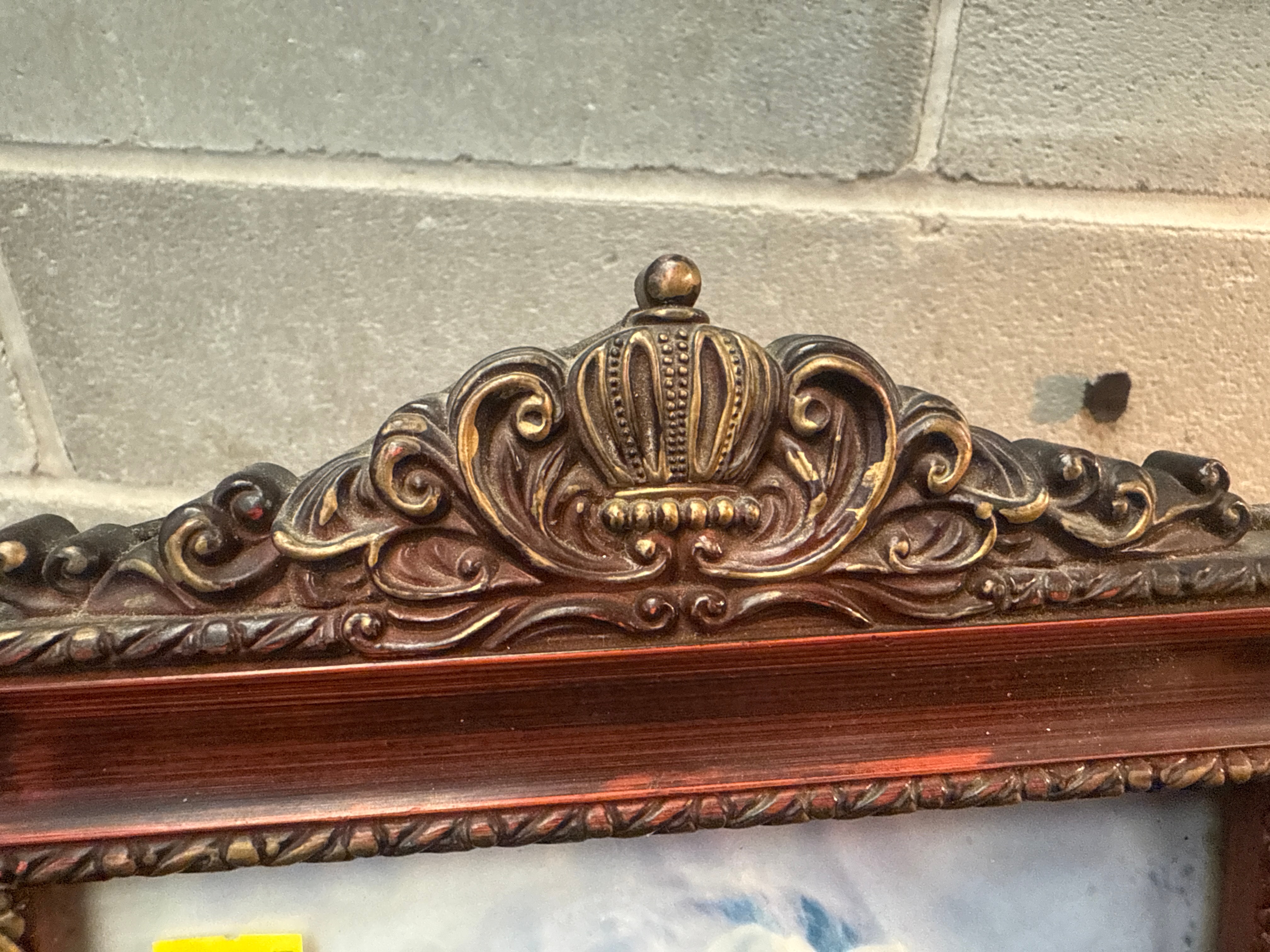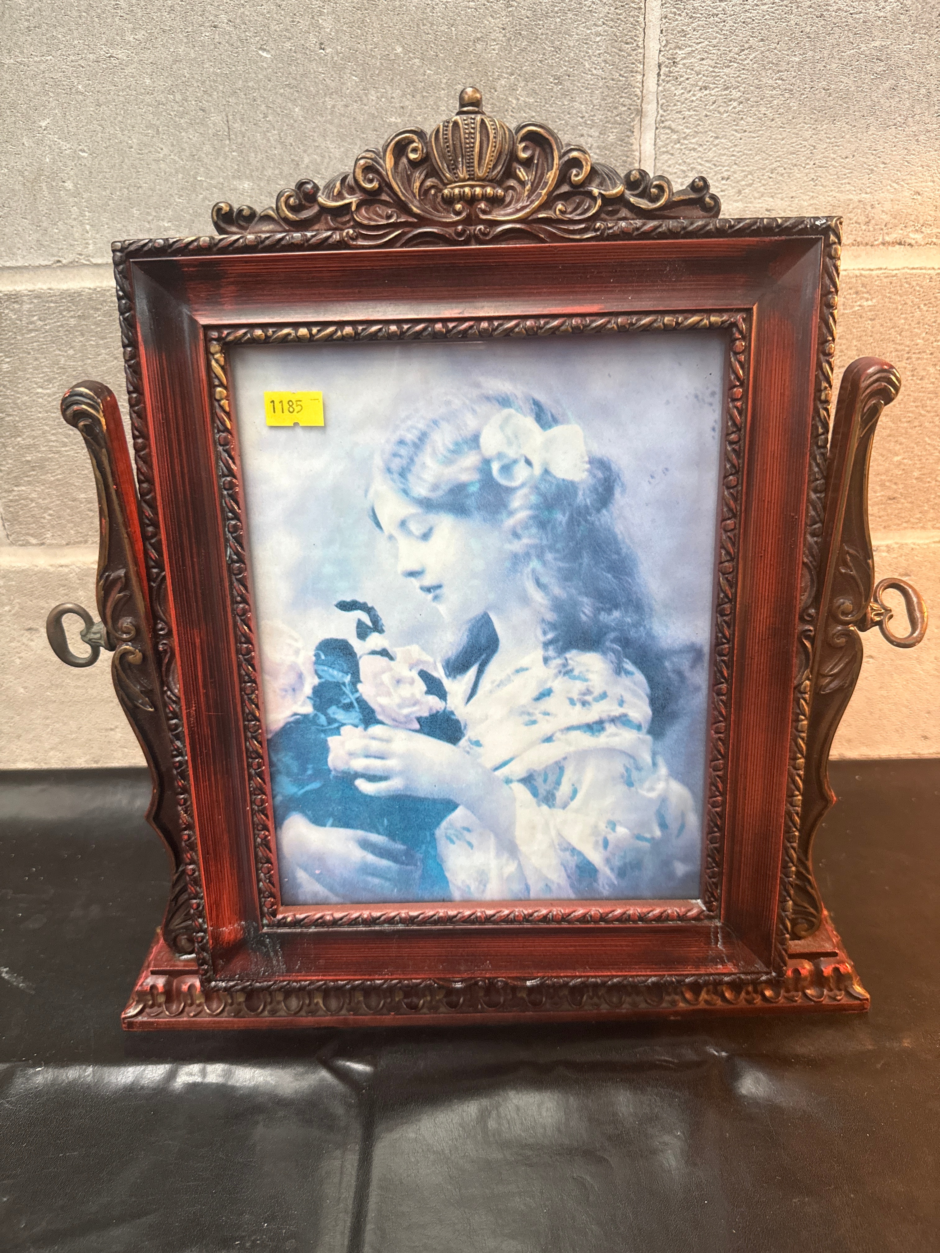 A decorative tabletop picture frame, designed in a Victorian Revival or Rococo-inspired style. The frame features an ornate crown motif finial at the top and decorative swivel arms on the sides. It is constructed from a molded composite material with a dark reddish-brown, faux wood-grain finish, accented by faux-gilt or bronze-colored scrollwork and decorative elements. The frame currently houses a monochromatic blue-toned print depicting a young girl with long, curly hair, holding flowers. A yellow sticker displaying the number “1185” is affixed to the upper left corner of the print.