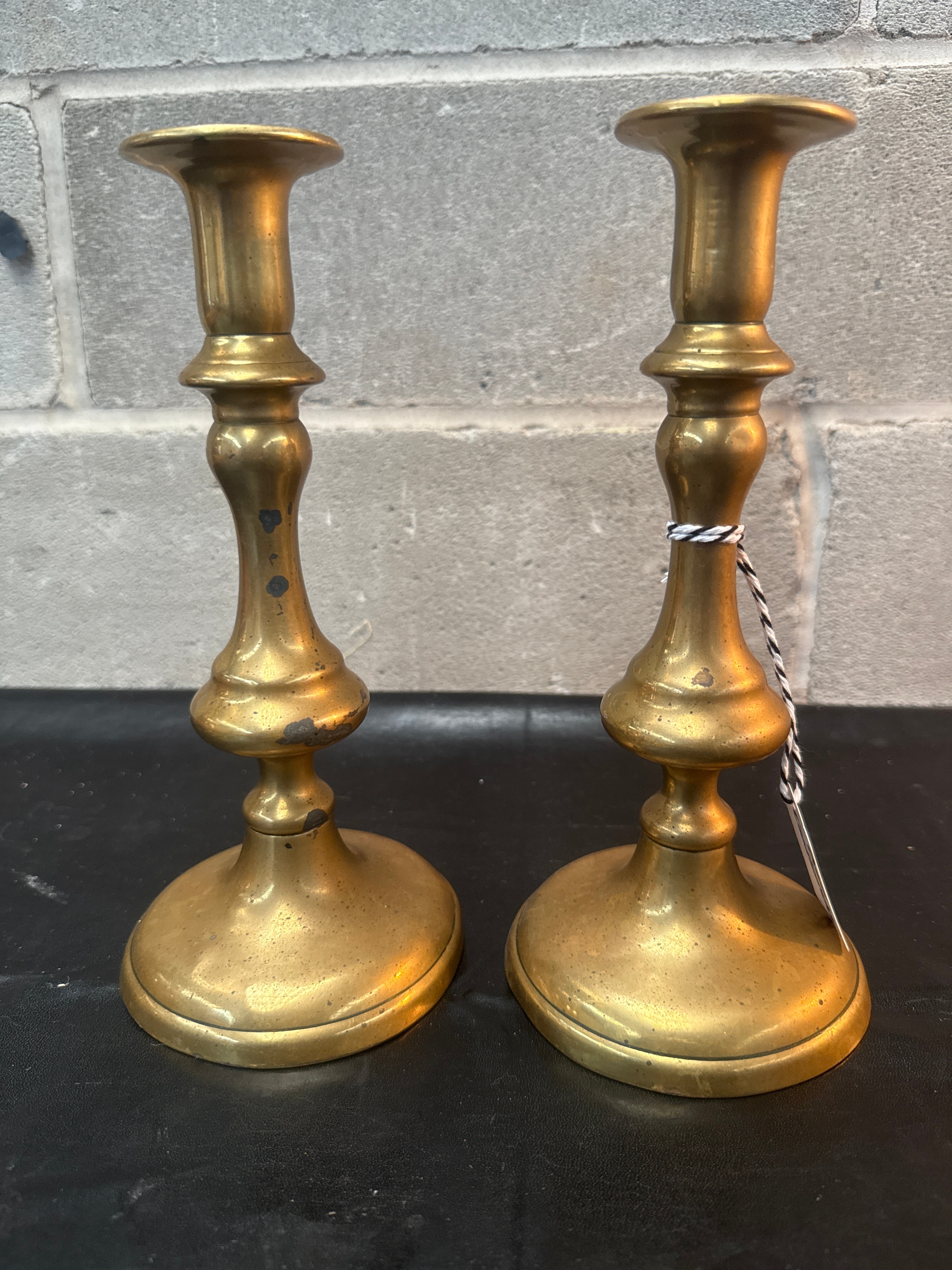 A pair of antique brass baluster form candlesticks, each crafted with a classic turned design. They feature a wide, circular base, a shaped stem, and a cupped bobeche. The items exhibit a consistent patina with areas of tarnish, minor surface scratches, and dark oxidation spots, indicative of age and use. A black and white striped string is tied around the stem of the right candlestick, likely for an identification tag. No discernible manufacturer’s markings are visible.