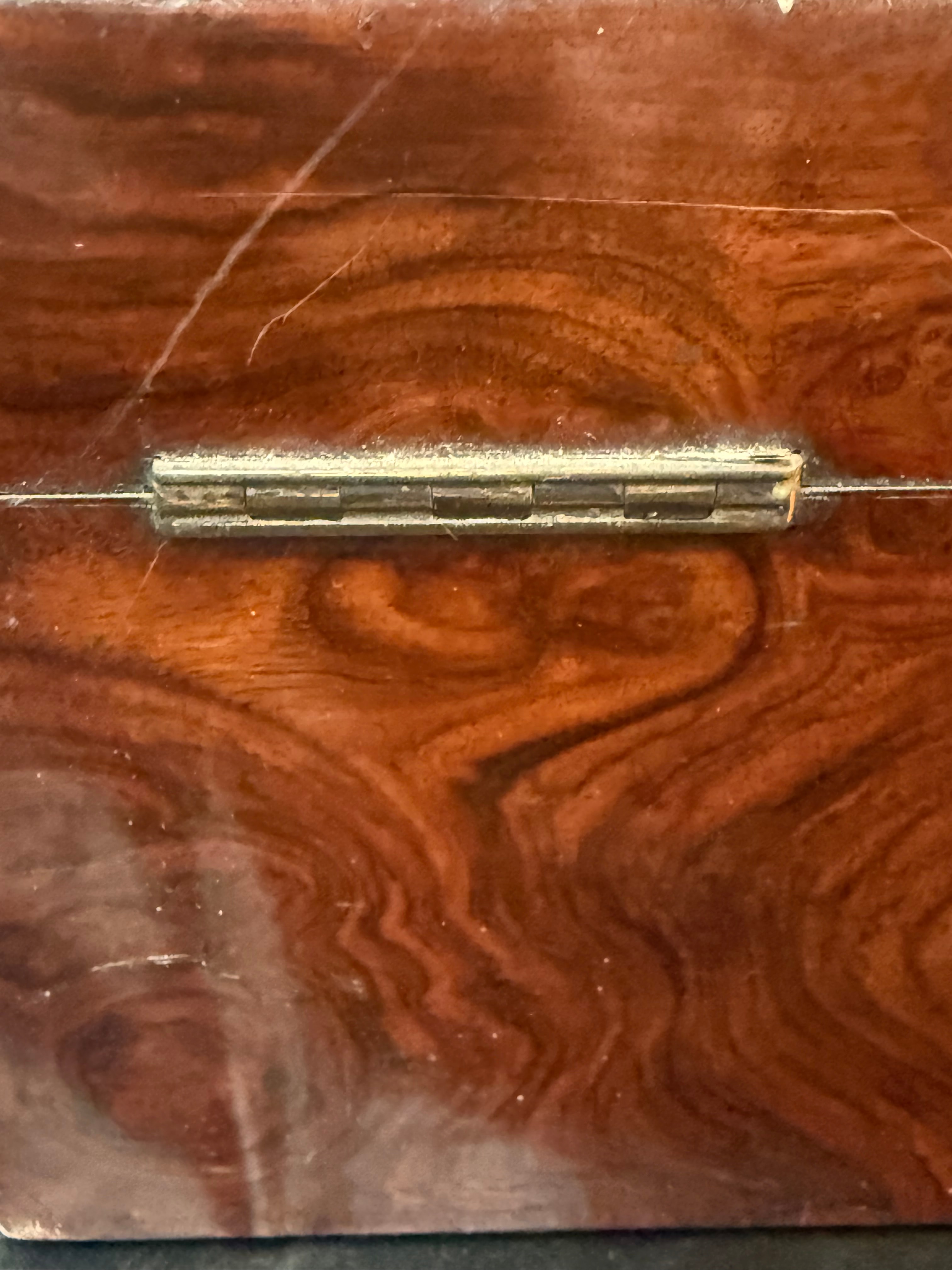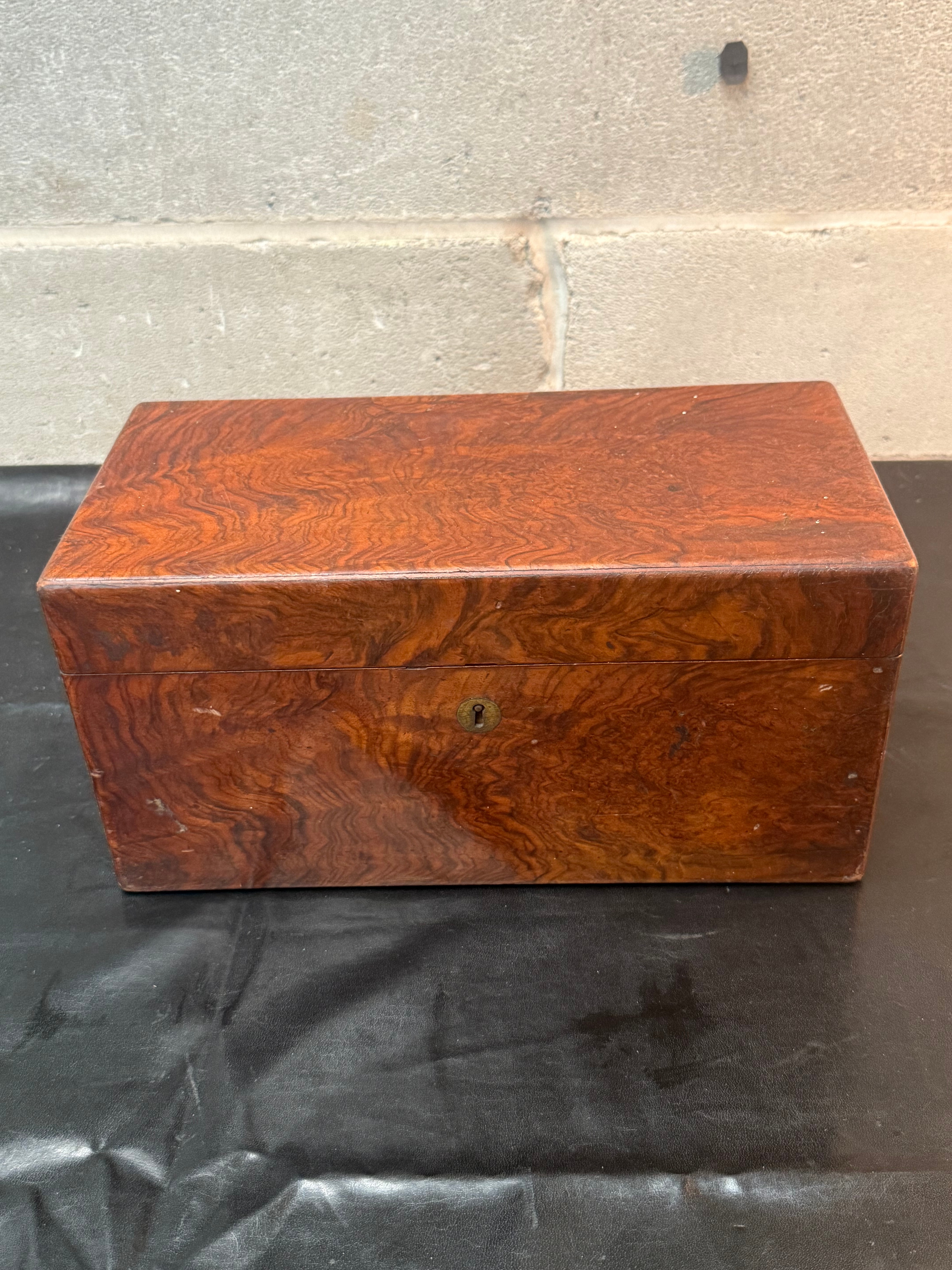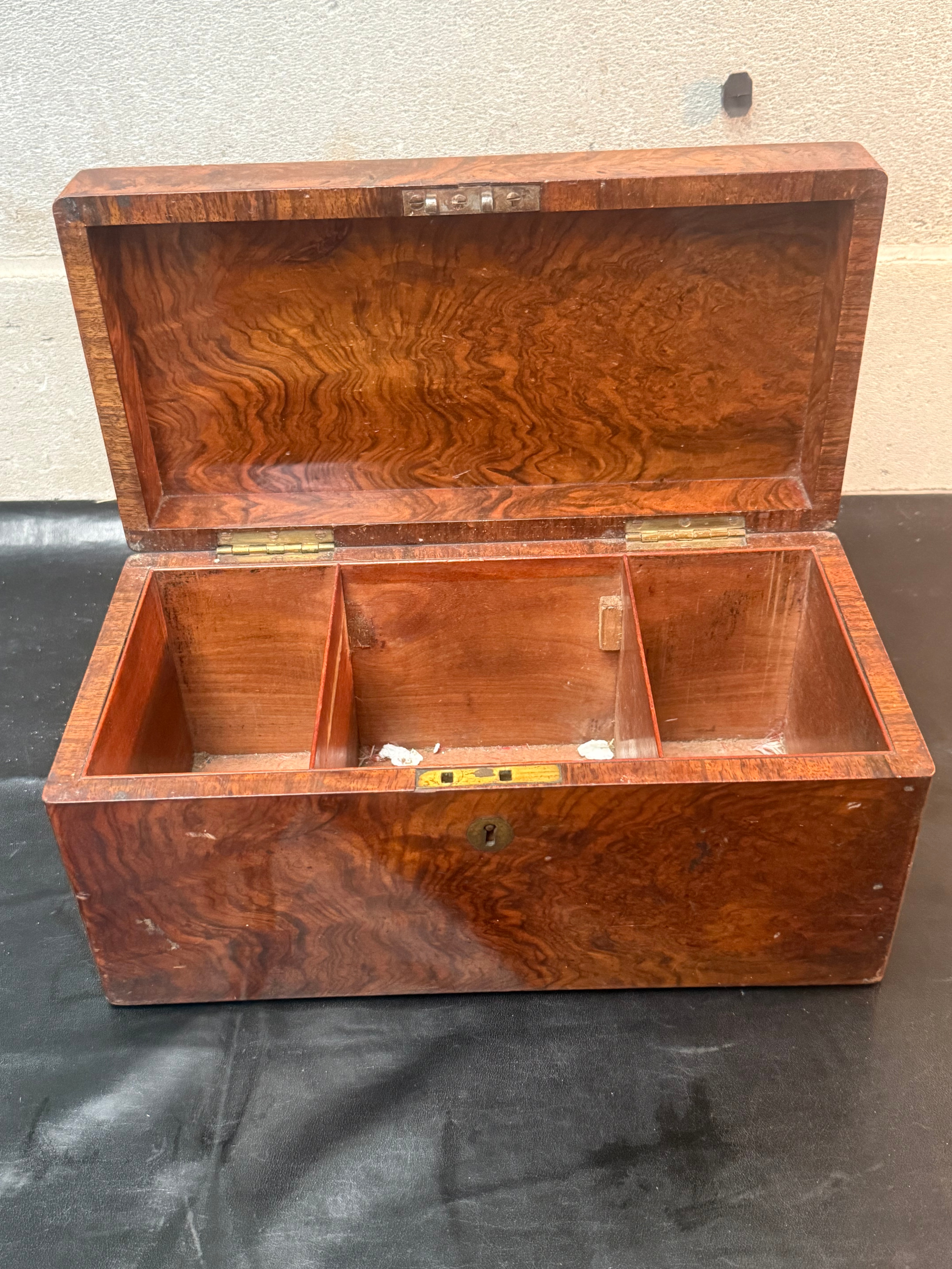 An antique rectangular lidded box, likely a tea caddy, crafted from burl wood veneer displaying a distinct swirling grain pattern. The box features a hinged lid secured by a brass keyhole escutcheon on the front. The interior is divided into three fixed compartments. No discernible text or maker’s marks are visible on the exterior or interior surfaces.