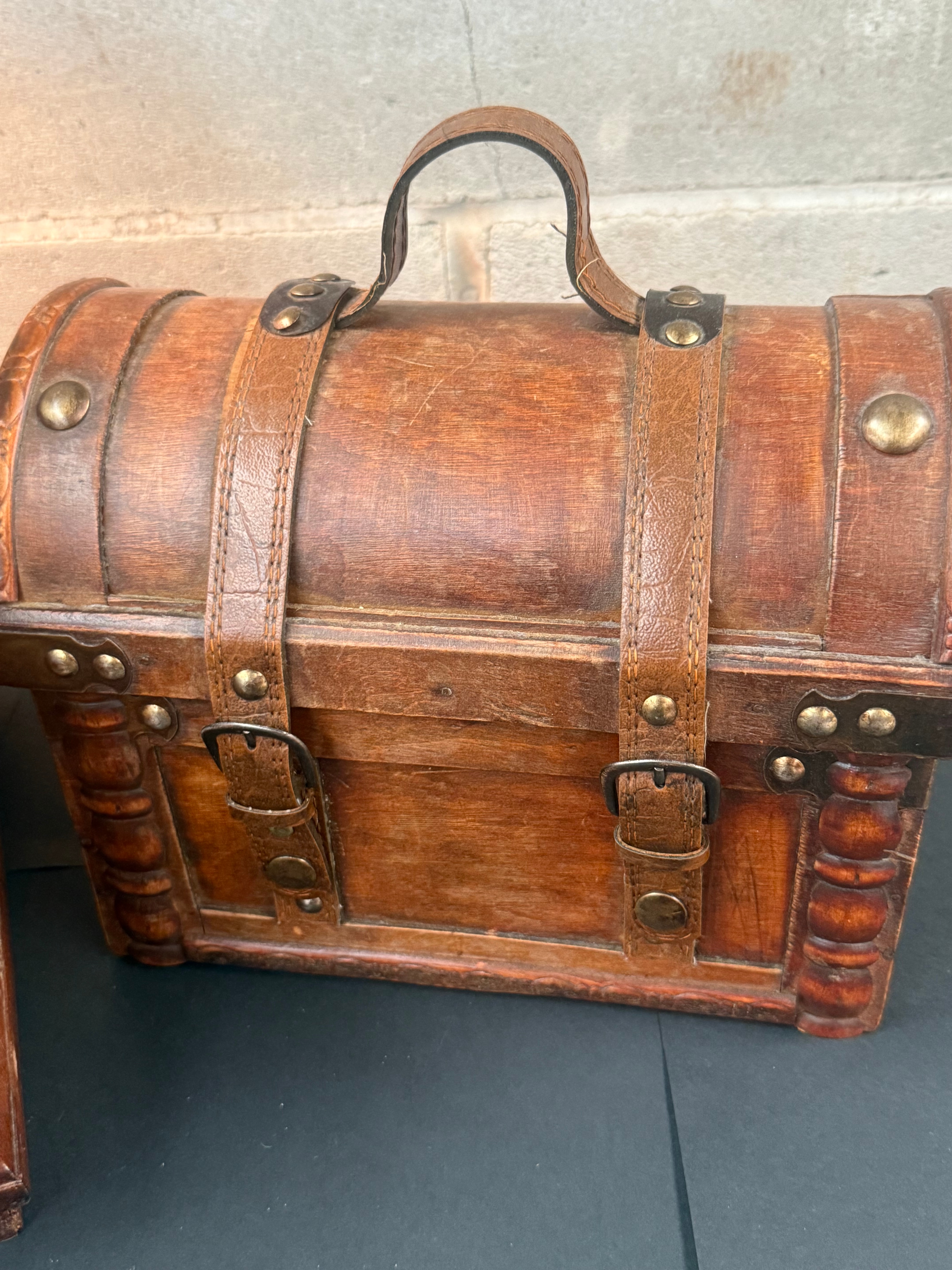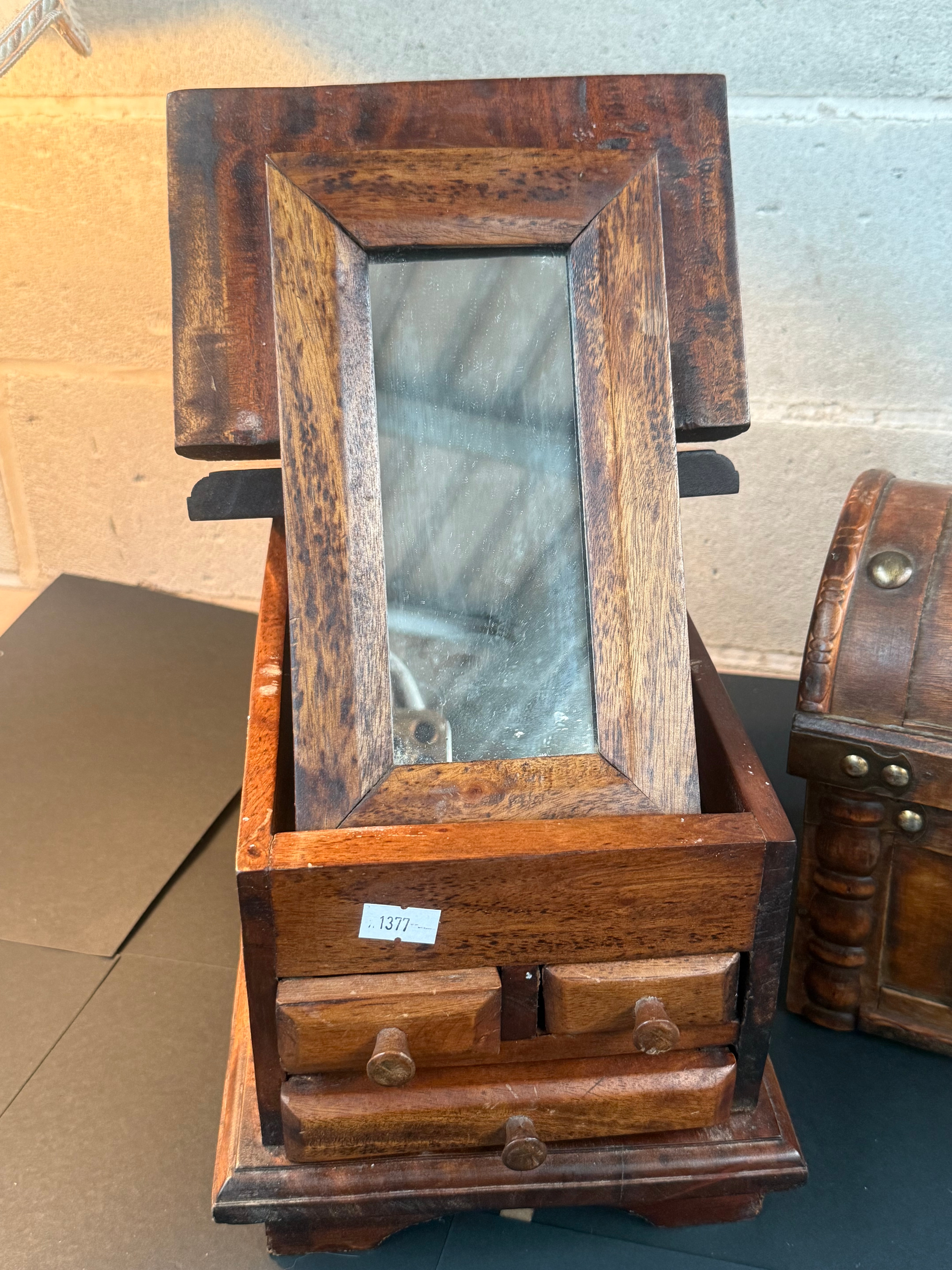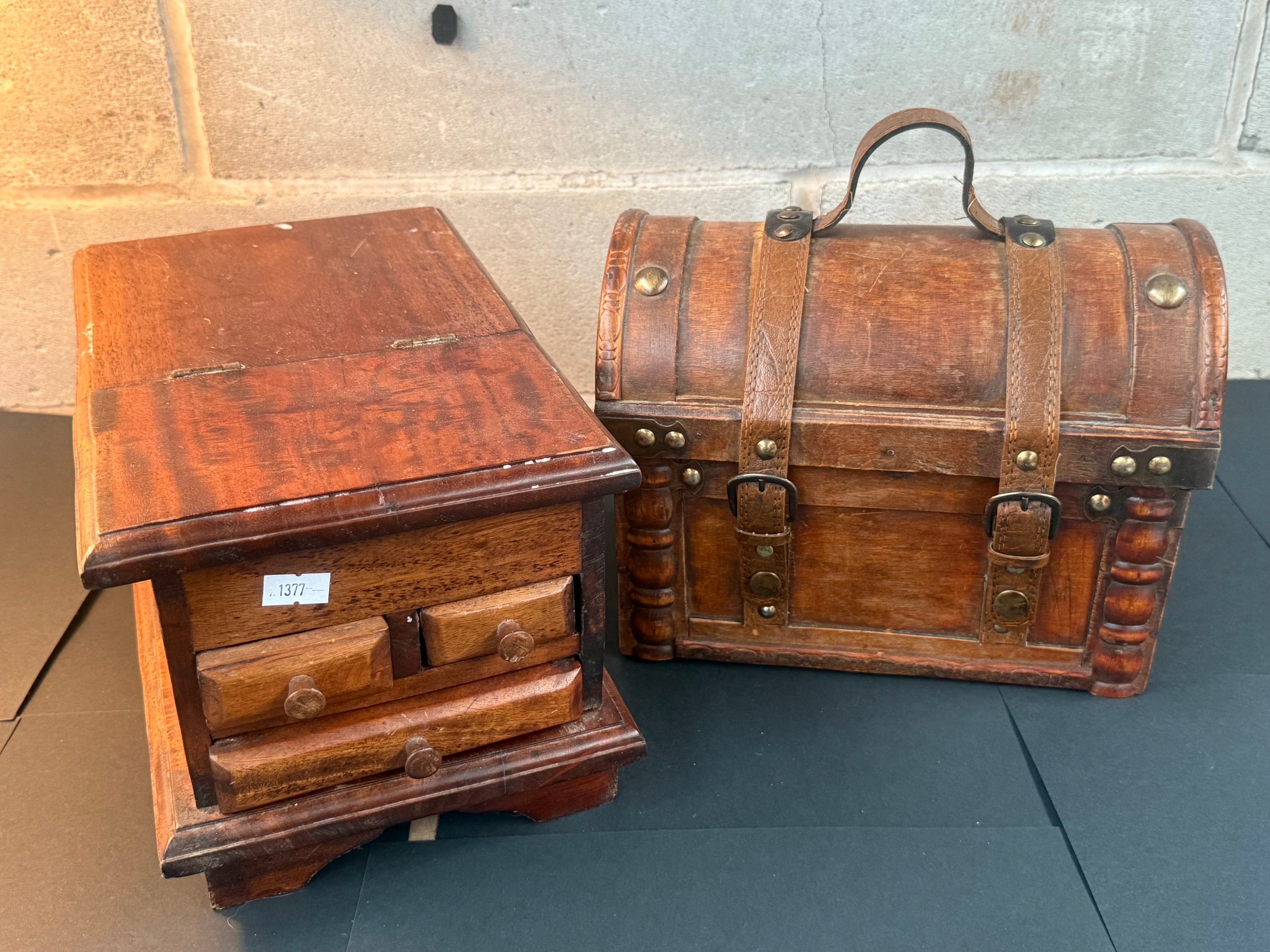This lot features two decorative wooden storage pieces. The first is a rectangular vanity box, constructed from medium-toned wood. It features a hinged top that opens to reveal a framed mirror affixed to its underside, and two small drawers on its front, each with a round wooden pull handle. A white sticker bearing the number “1377” is visible on one drawer. The second item is a small, domed-top wooden chest, accented with brass-toned studs, faux leather straps, and buckles, and equipped with a faux leather carrying handle. Both items present a rustic or aged aesthetic.