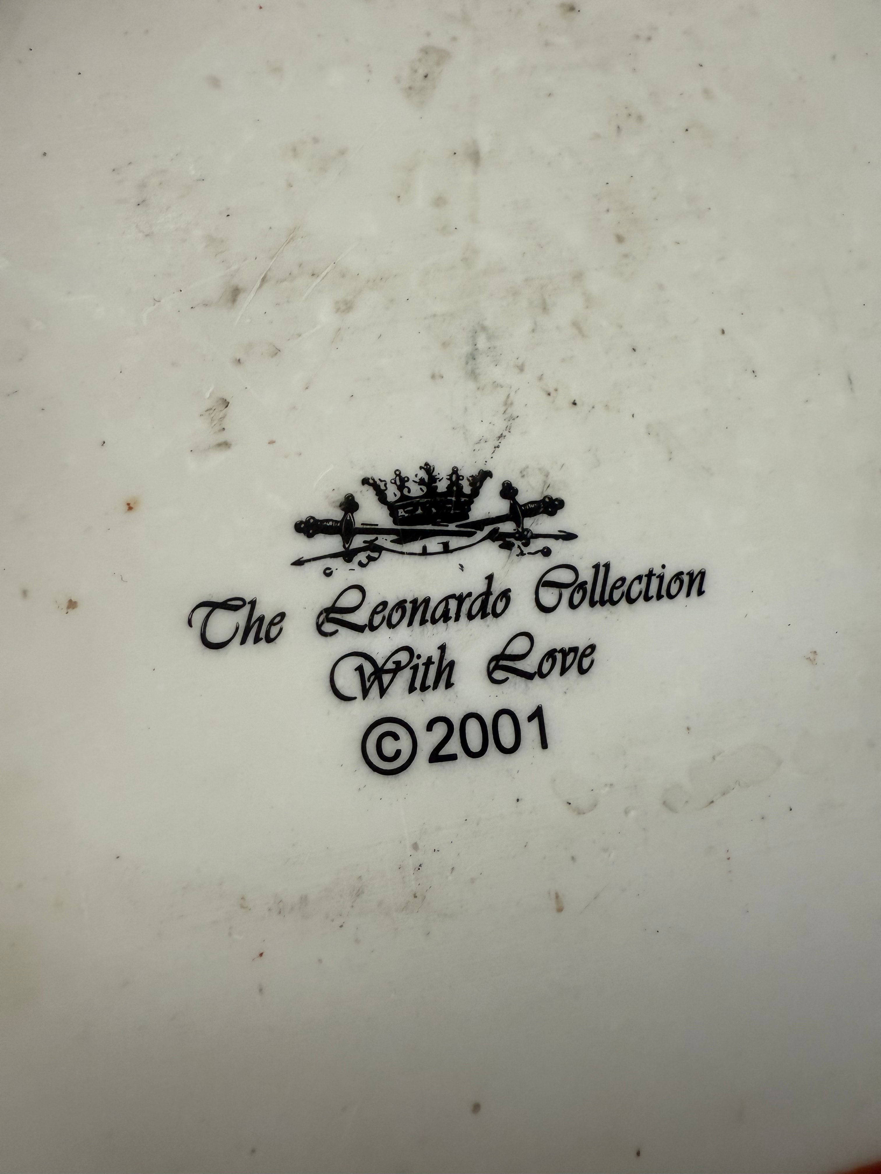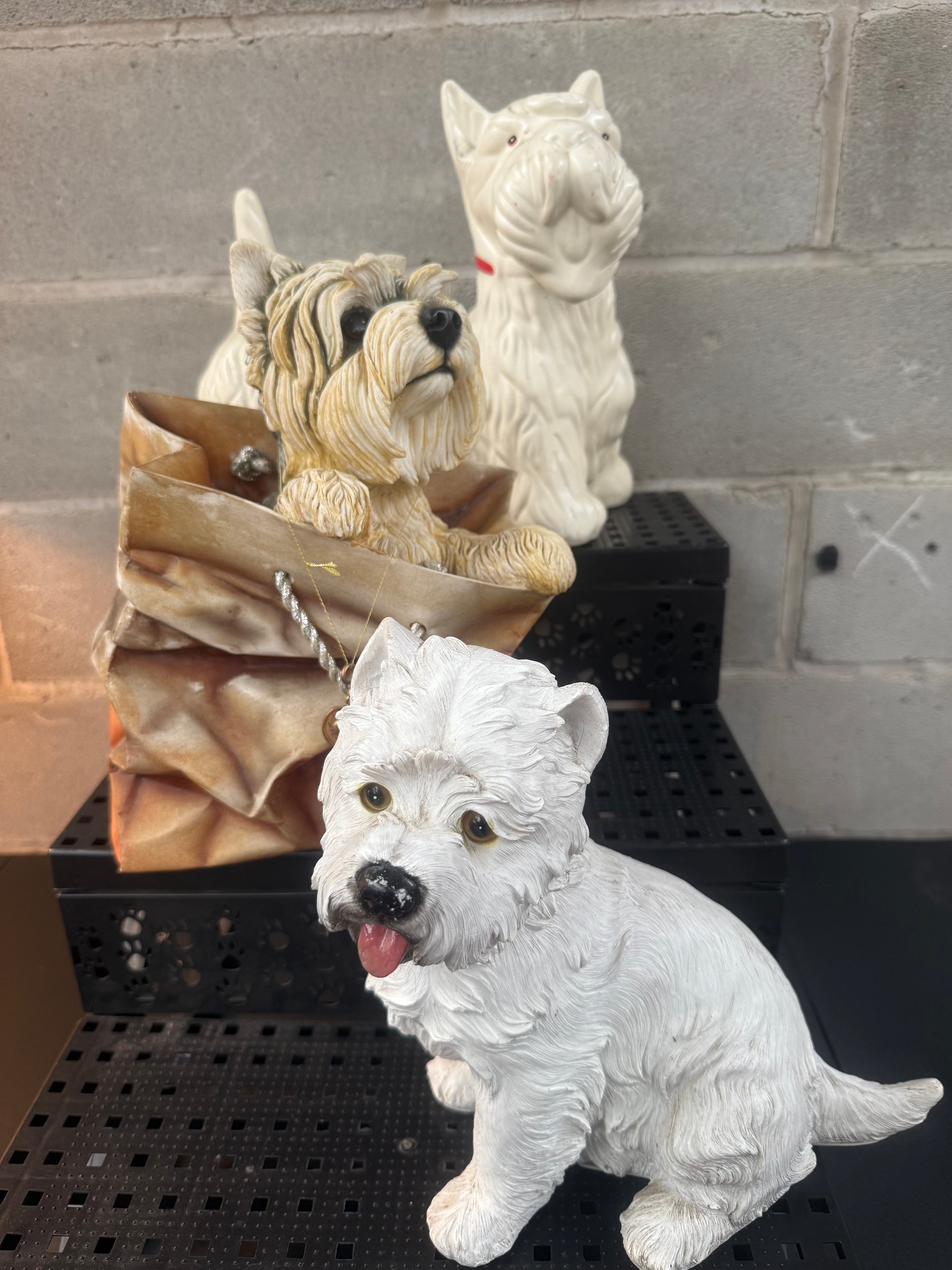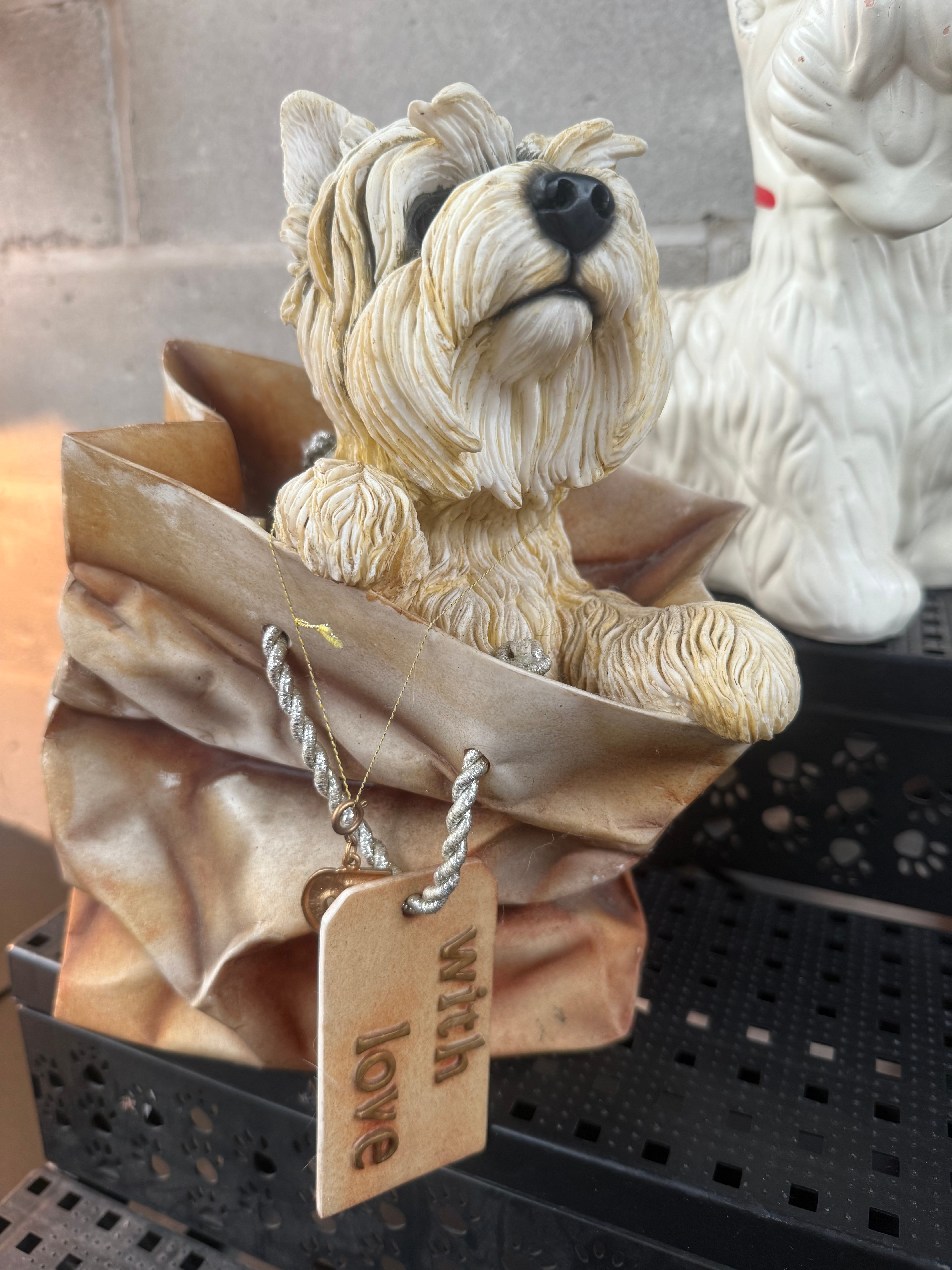 A group of three West Highland Terrier figurines by The Leonardo Collection. Each crafted from a composite material, likely resin or ceramic, with painted details. One white-bodied figure is depicted seated with its tongue extended. Another tan and white figure emerges from a crumpled brown paper bag, accompanied by an attached tag reading “with love.” A third, all-white figure is also included. The base of one piece bears the manufacturer’s mark “The Leonardo Collection With Love ©2001” with a crown logo.