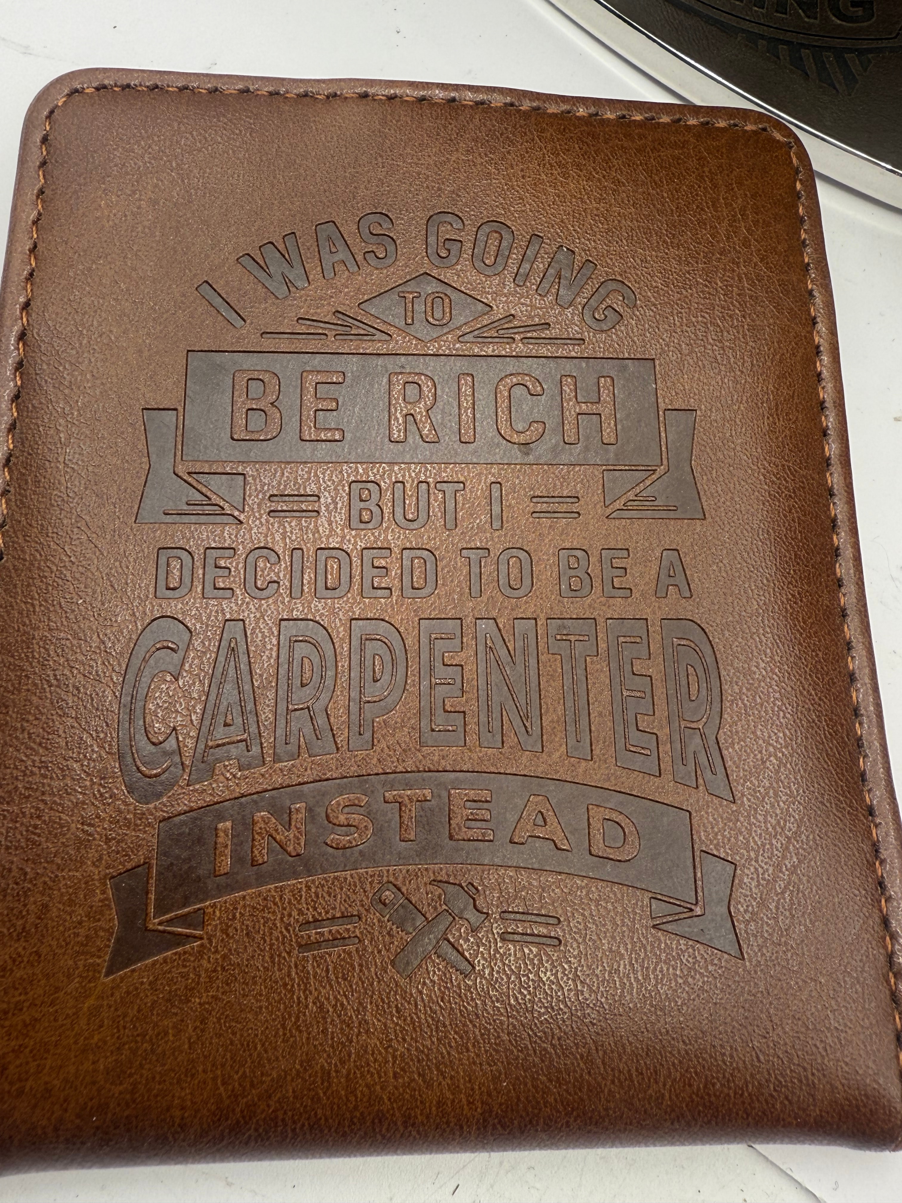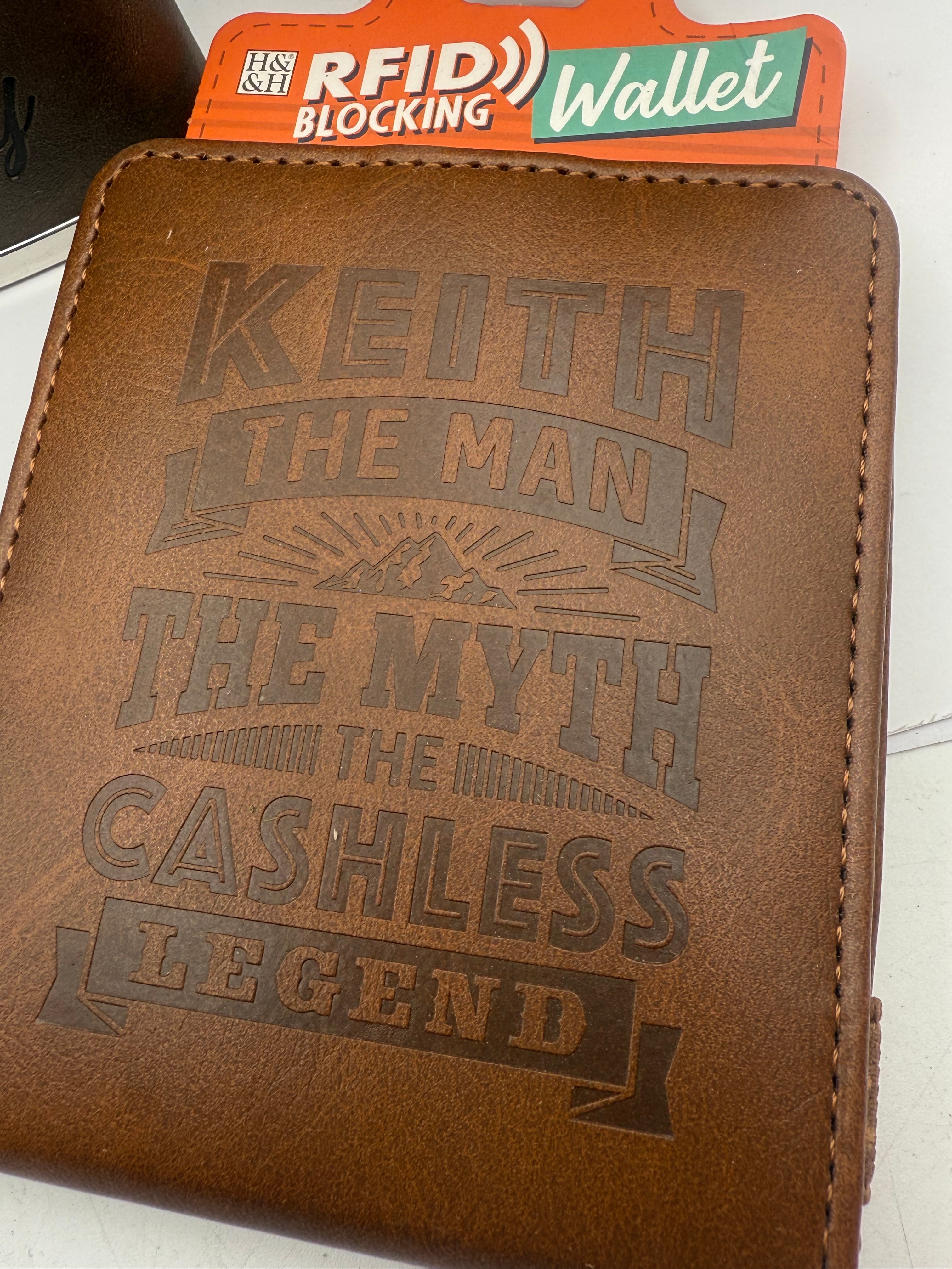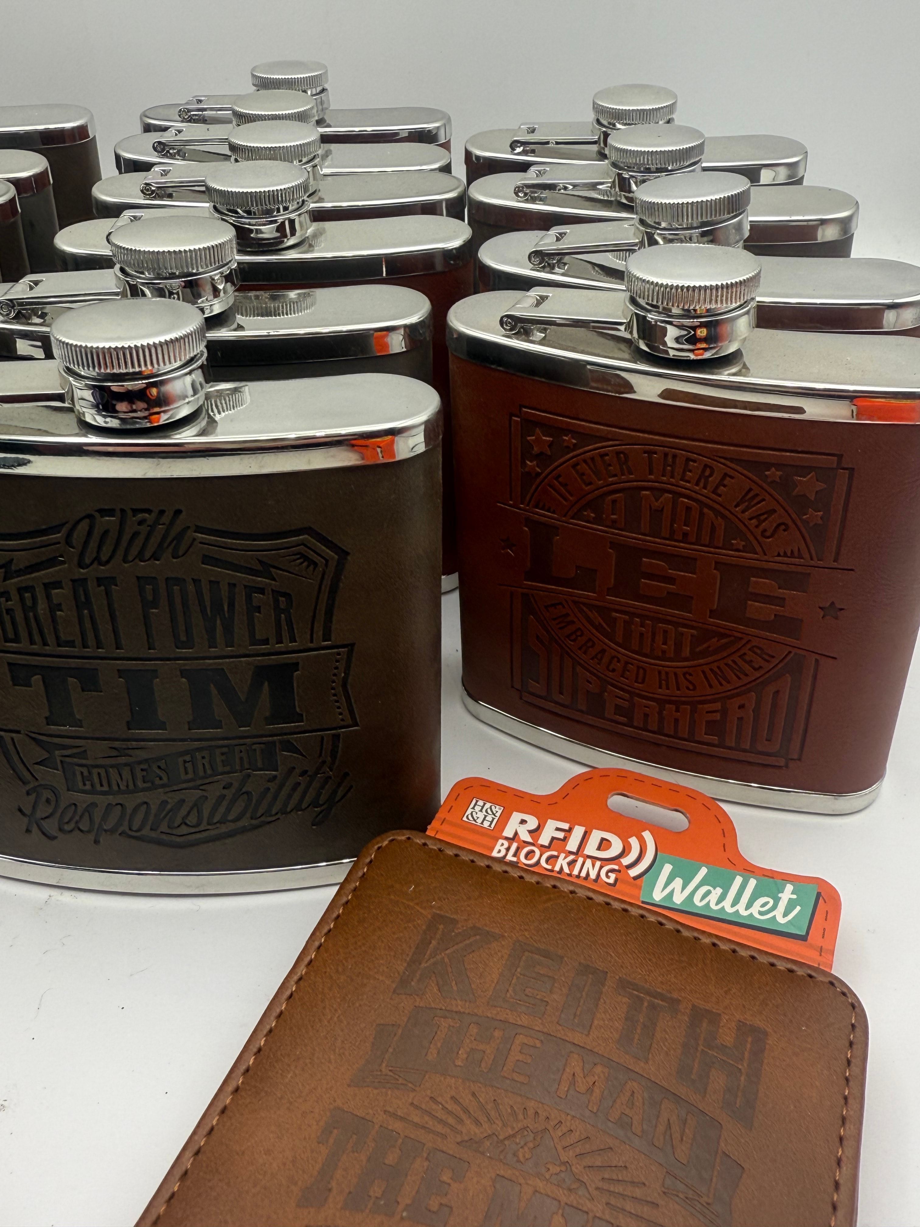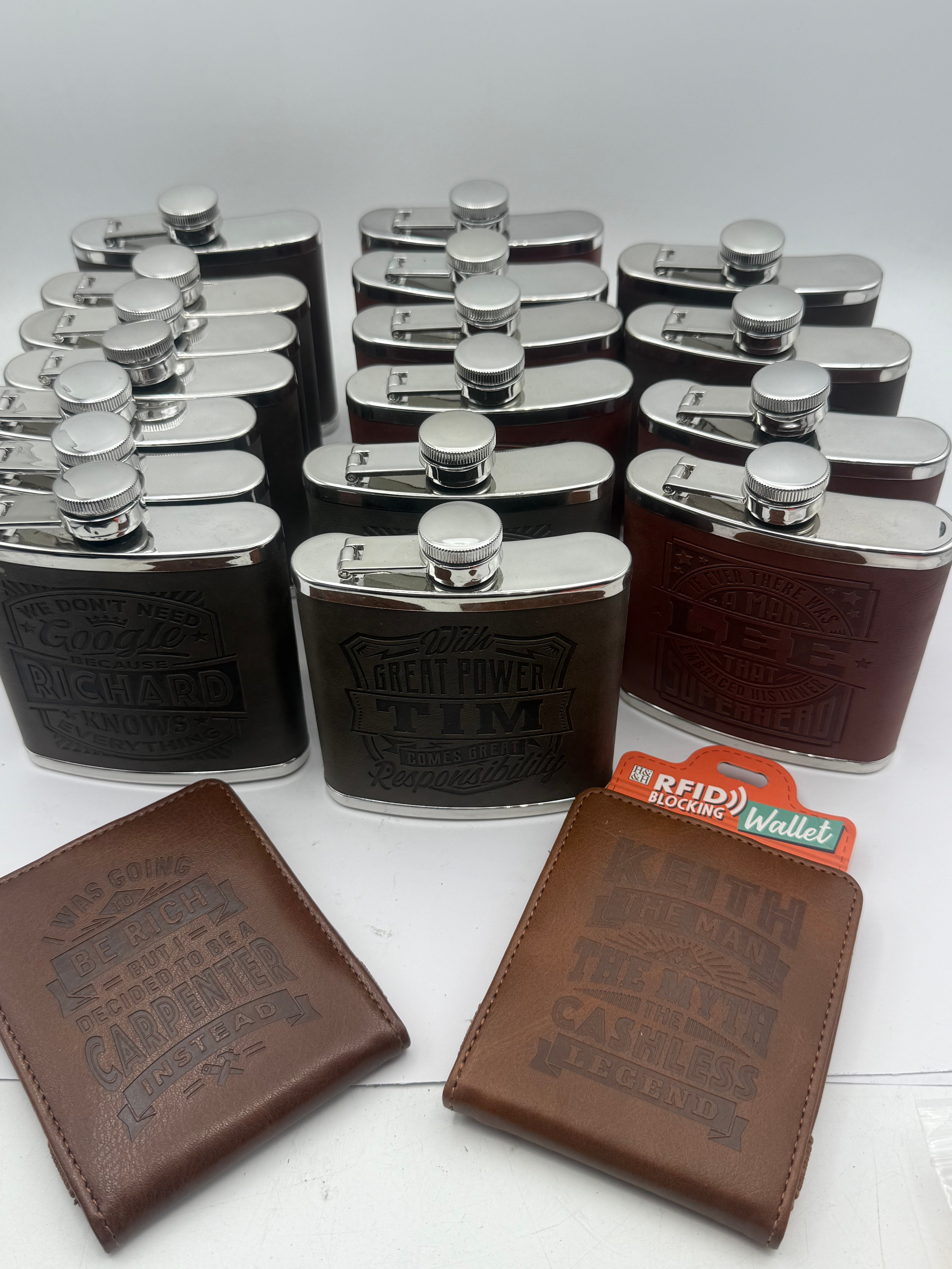 A collection of contemporary personalized hip flasks and wallets, consistent with items marketed as ‘Hip Flasks for Men Leather Hip Flask Gift Set’ and ‘Personalized Flask Gift Set for Men’ found on online marketplaces. Comprising 17 hip flasks, each constructed from a stainless steel body with a faux-leather wrap. Alongside, two faux-leather wallets are included. Each item features distinct laser-engraved or debossed English text, often personalized or themed for gifting. Visible flask inscriptions include “WE DON’T NEED GOOGLE MY FRIEND RICHARD KNOWS EVERYTHING,” “With GREAT POWER COMES GREAT RESPONSIBILITY” featuring the name “TIM,” and “IF EVER THERE WAS A MAN LEE THAT EMBRACED HIS INNER SUPERHERO.” The two wallets display “I WAS GOING TO BE RICH BUT I DECIDED TO BE A CARPENTER INSTEAD” and “KEITH THE MAN THE MYTH THE CASHLESS LEGEND,” with one wallet still bearing an “H&H RFID BLOCKING Wallet” retail tag.