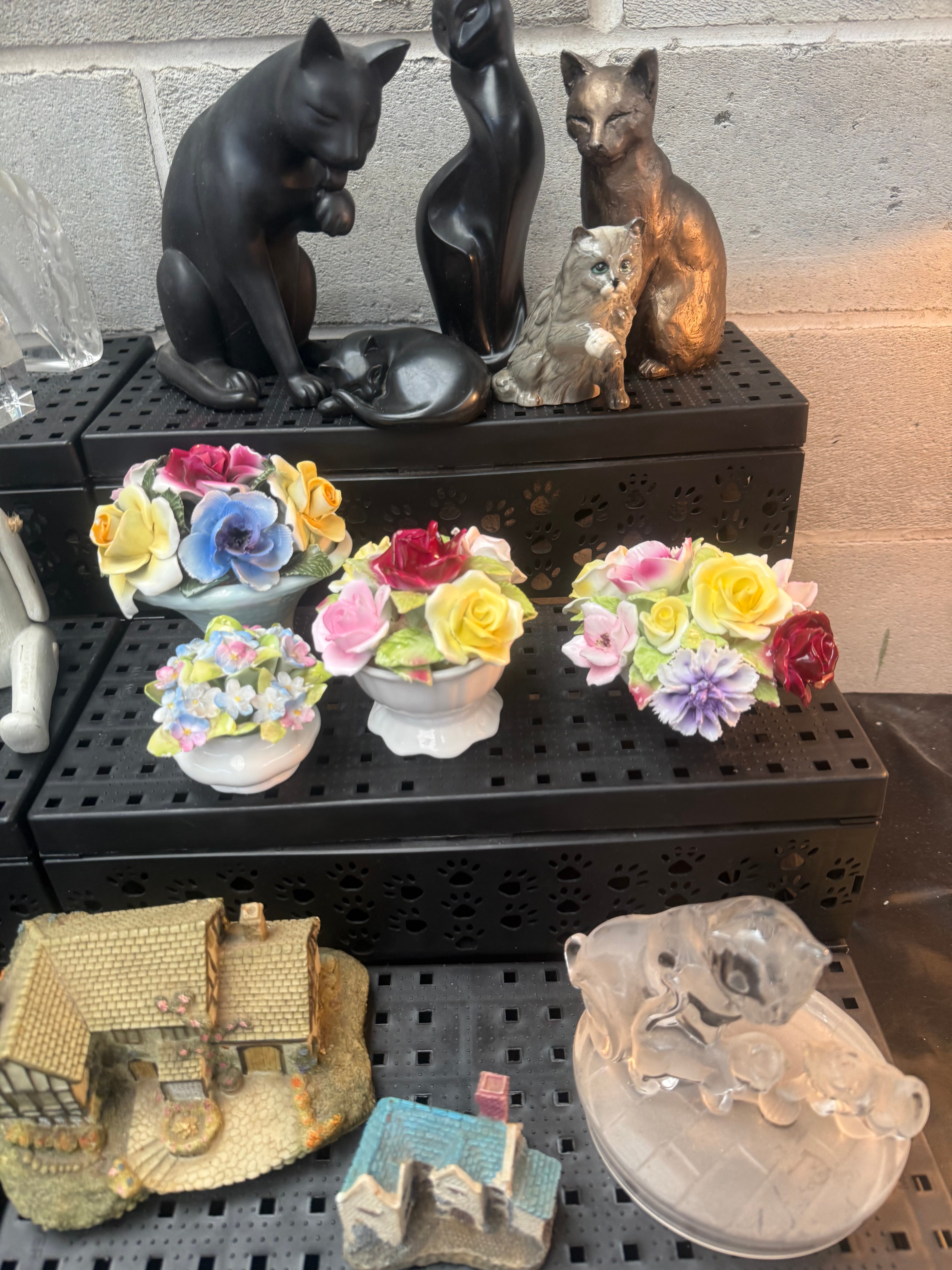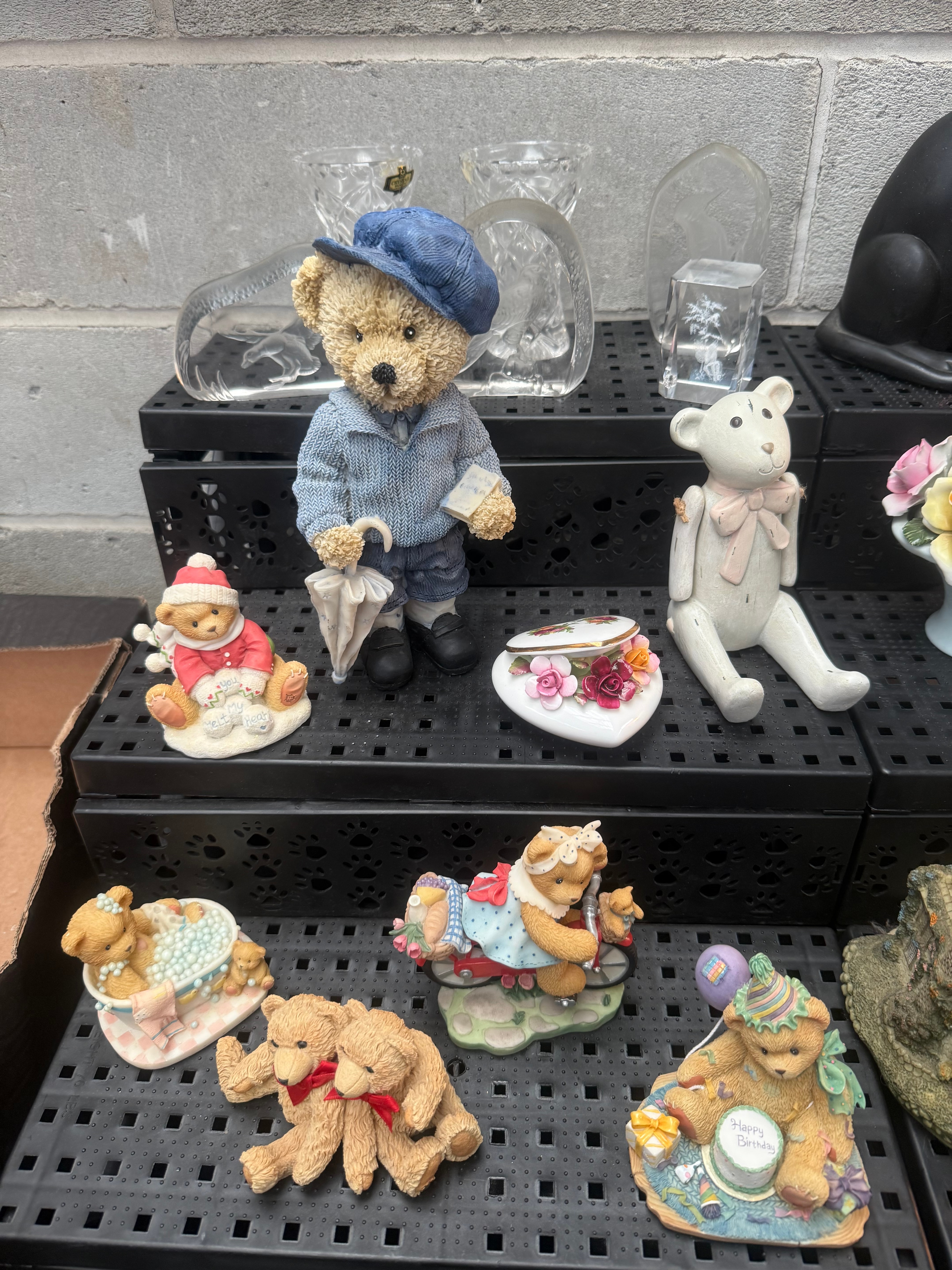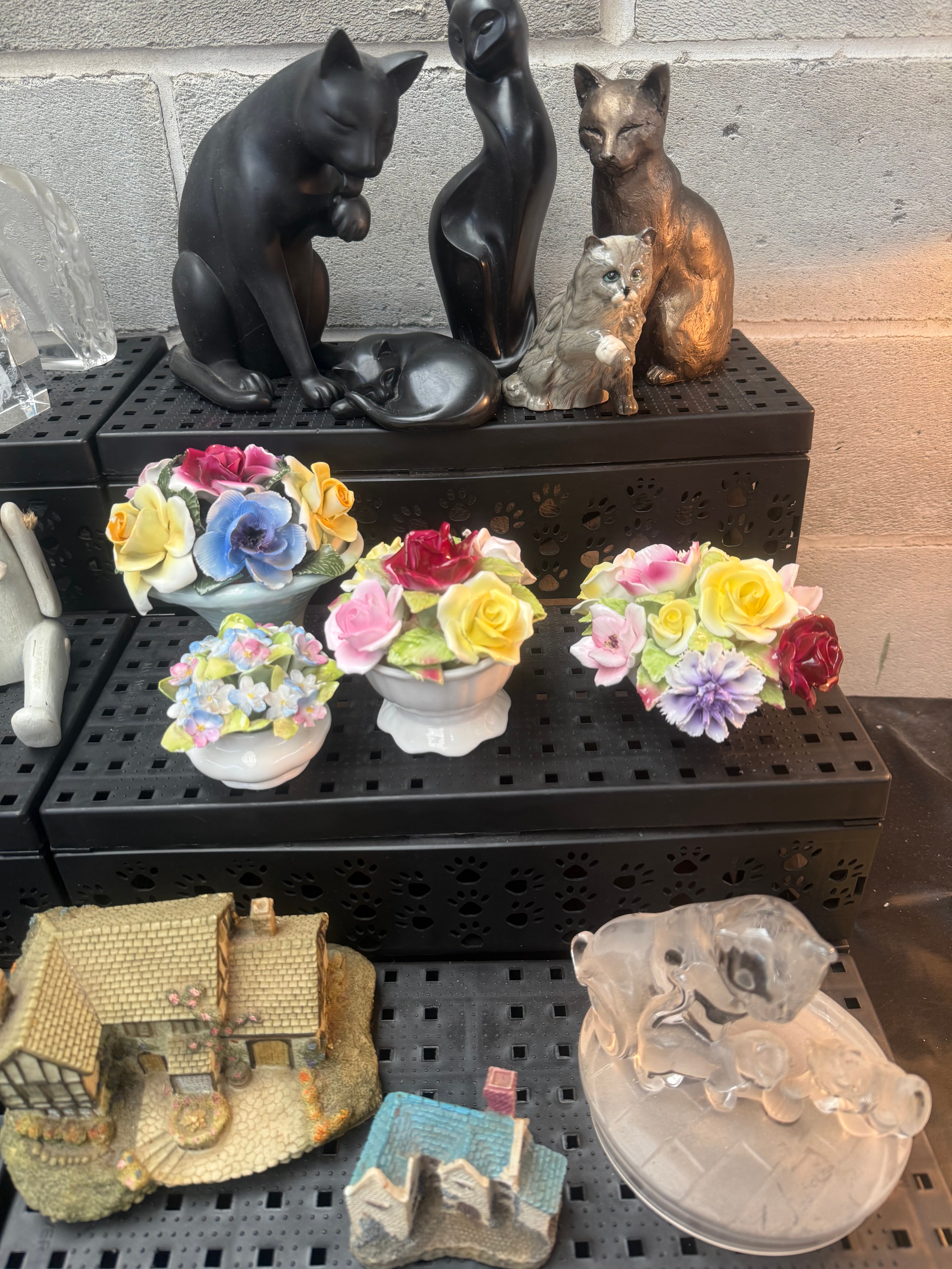 A diverse collection of decorative figurines and ornaments, including pieces by Royal Doulton, Royal Albert, and Coalport, as identified through web intelligence. The collection features anthropomorphic teddy bear figurines in various poses and attire, alongside a series of cat figurines rendered in black, bronze, and grey tones, including a sleeping kitten. Also present are a series of miniature ceramic floral arrangements in bowl-like vessels, consistent with Royal Albert ‘flower bouquets’ as identified in web intelligence. Two miniature architectural house models, aligning with ‘Coalport cottages’ mentioned in web research, are included. Three clear pressed glass decorative objects, including a bear, complete the assortment. The style is consistent with late 20th to early 21st-century collectible figurines, utilizing materials such as ceramic, porcelain, resin, and glass. One bear figurine on the bottom shelf bears the legible English text “Happy Birthday.”