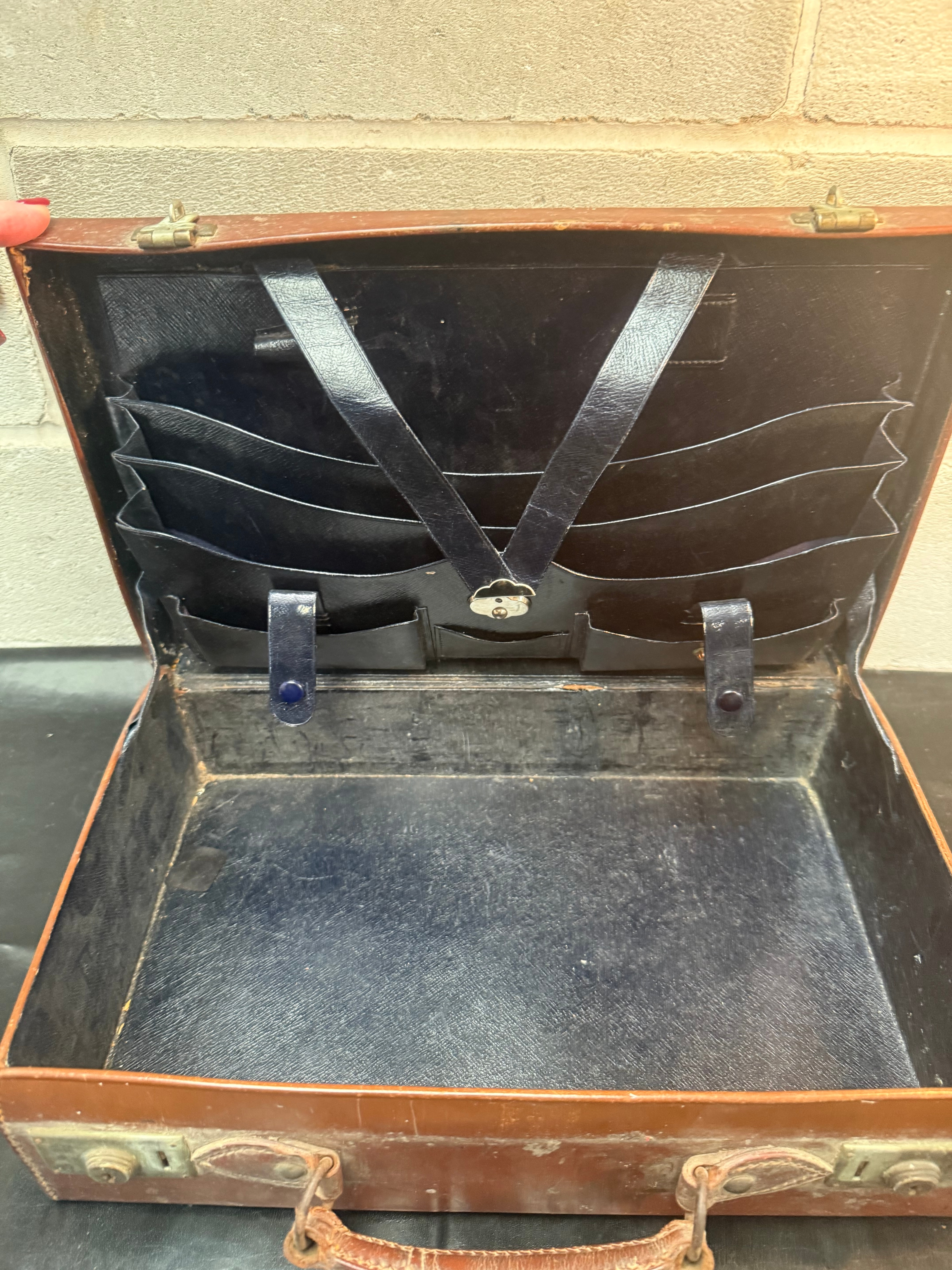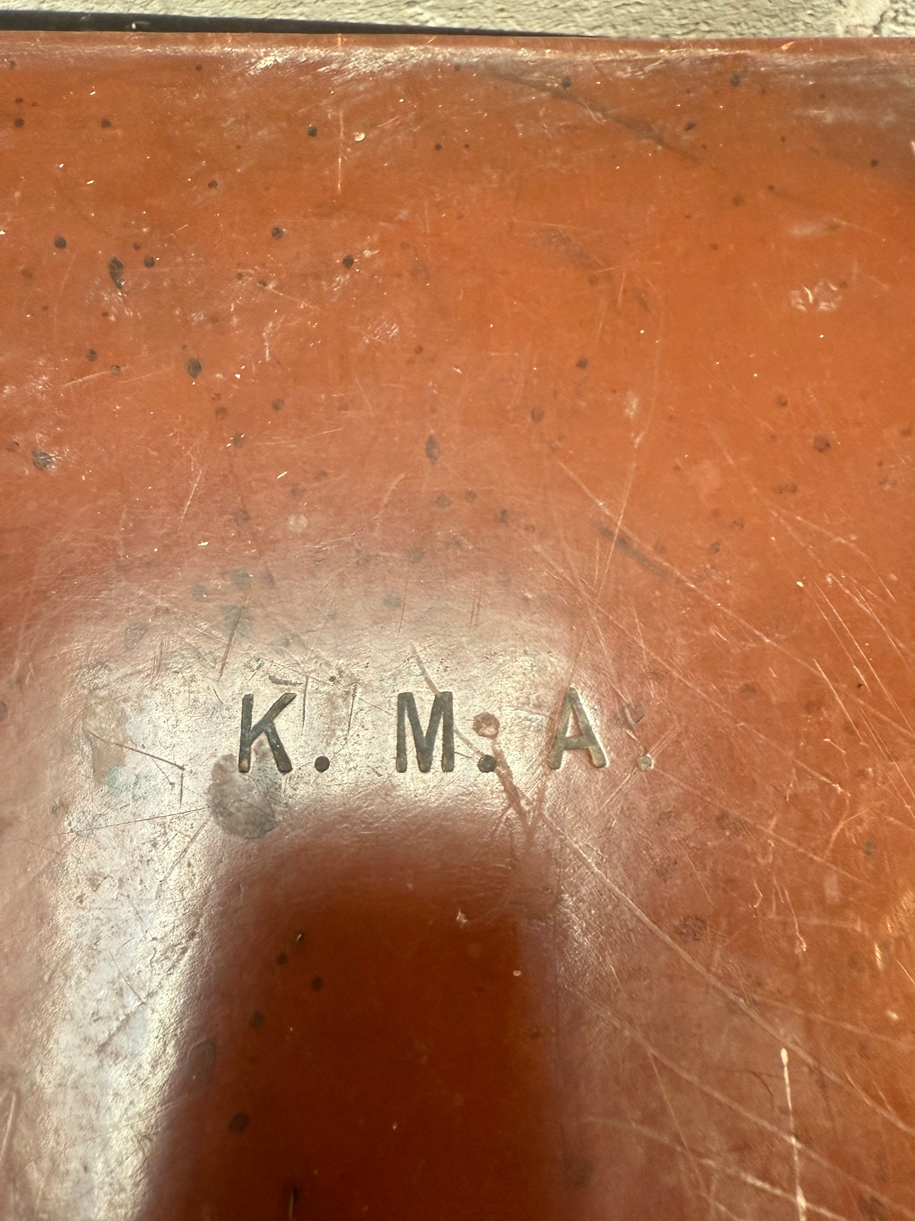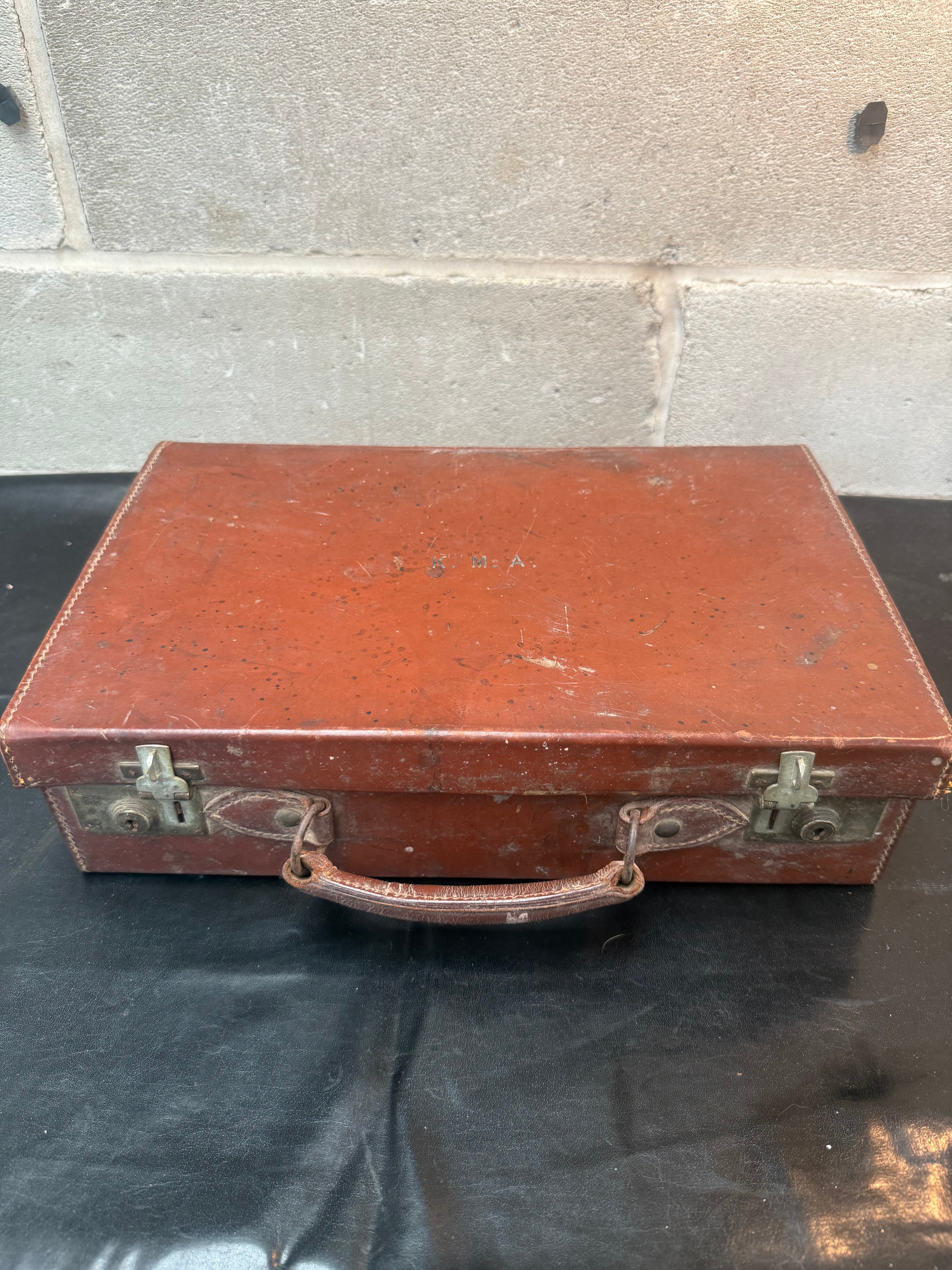 A vintage attaché case crafted from aged, reddish-brown Leather. The case features two tarnished metal clasps with integrated locks and a leather-wrapped metal handle. Stamped into the top lid are the initials “K. M: A.” The interior is lined with a dark blue or black material, appearing to be leather or a heavy fabric. One side of the interior contains multiple accordion-style document pockets secured by a central metal closure.