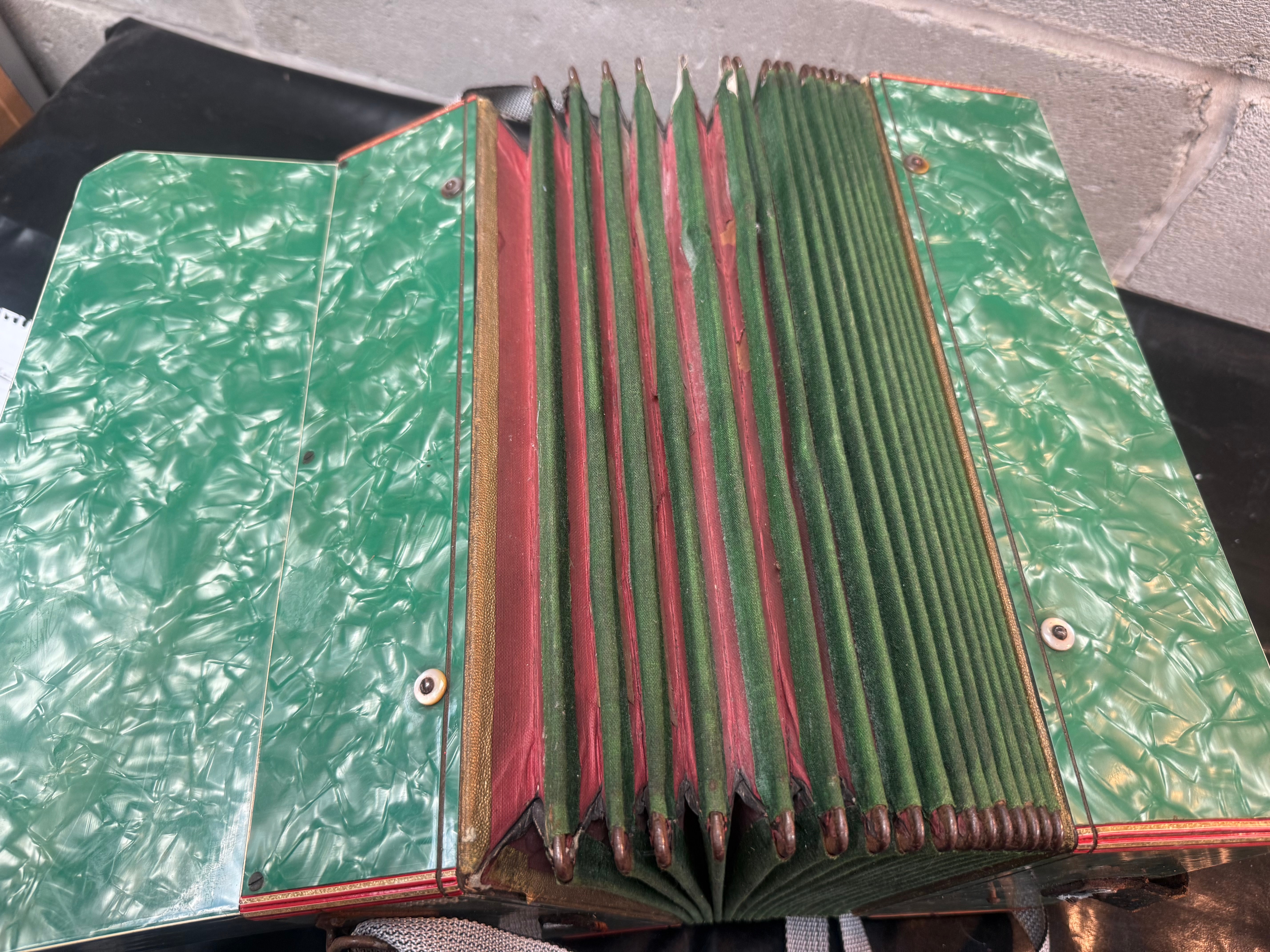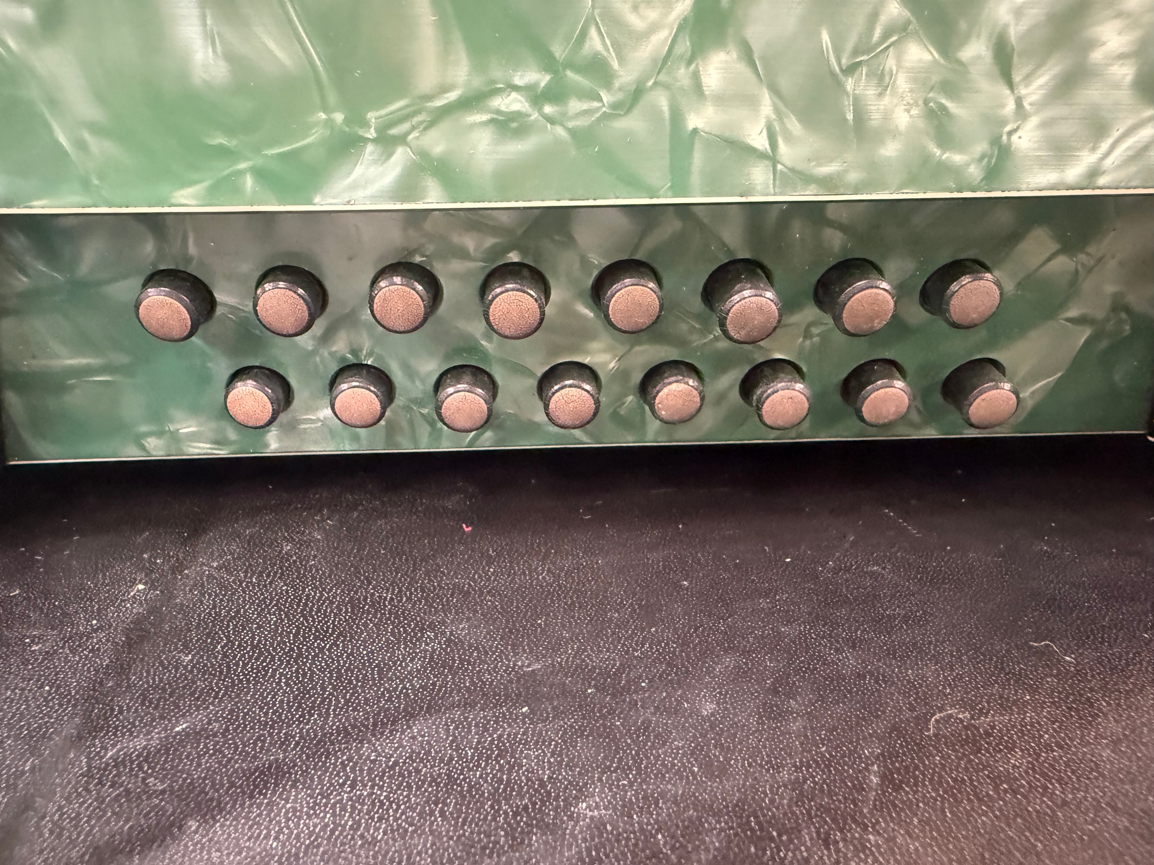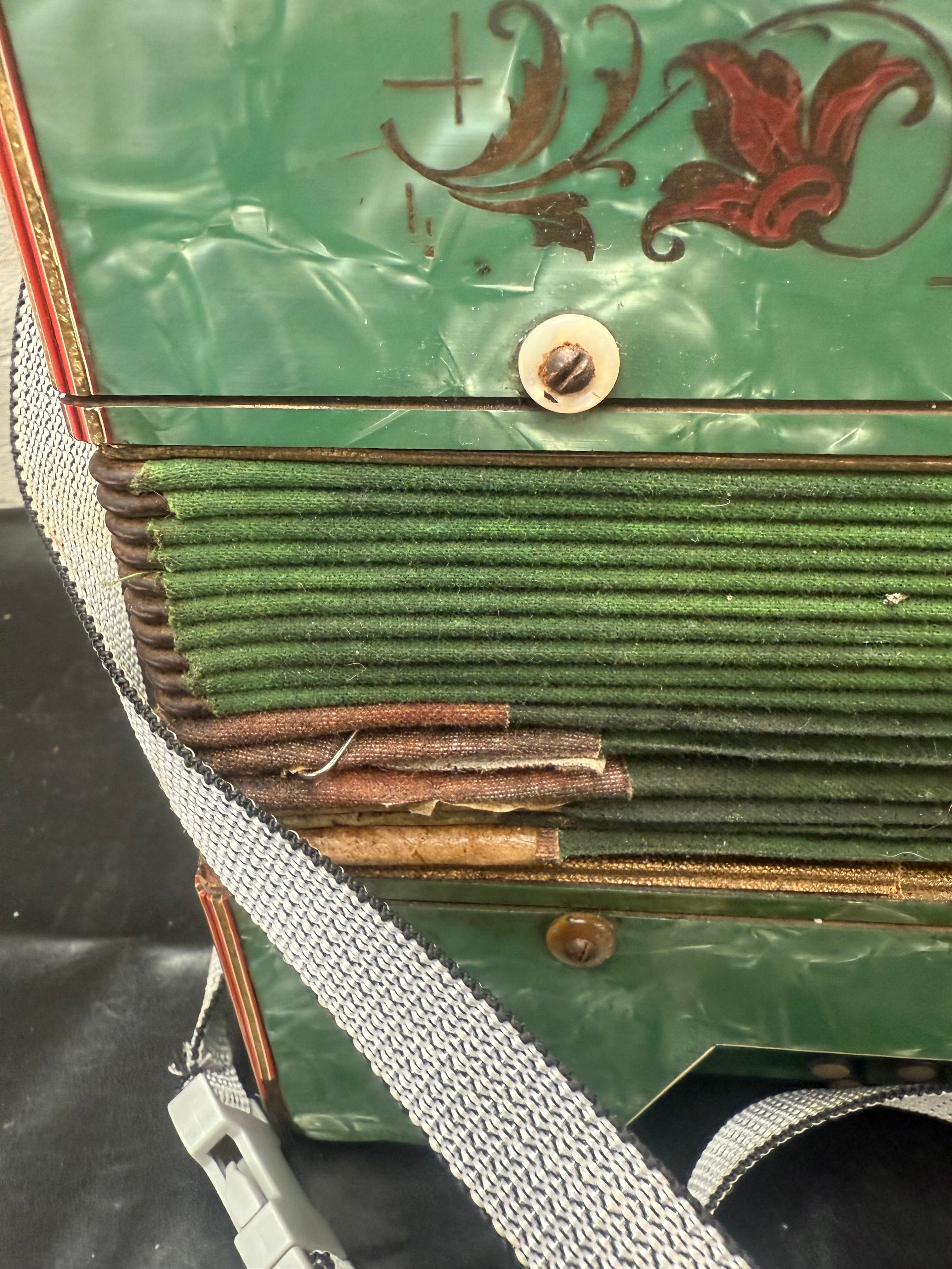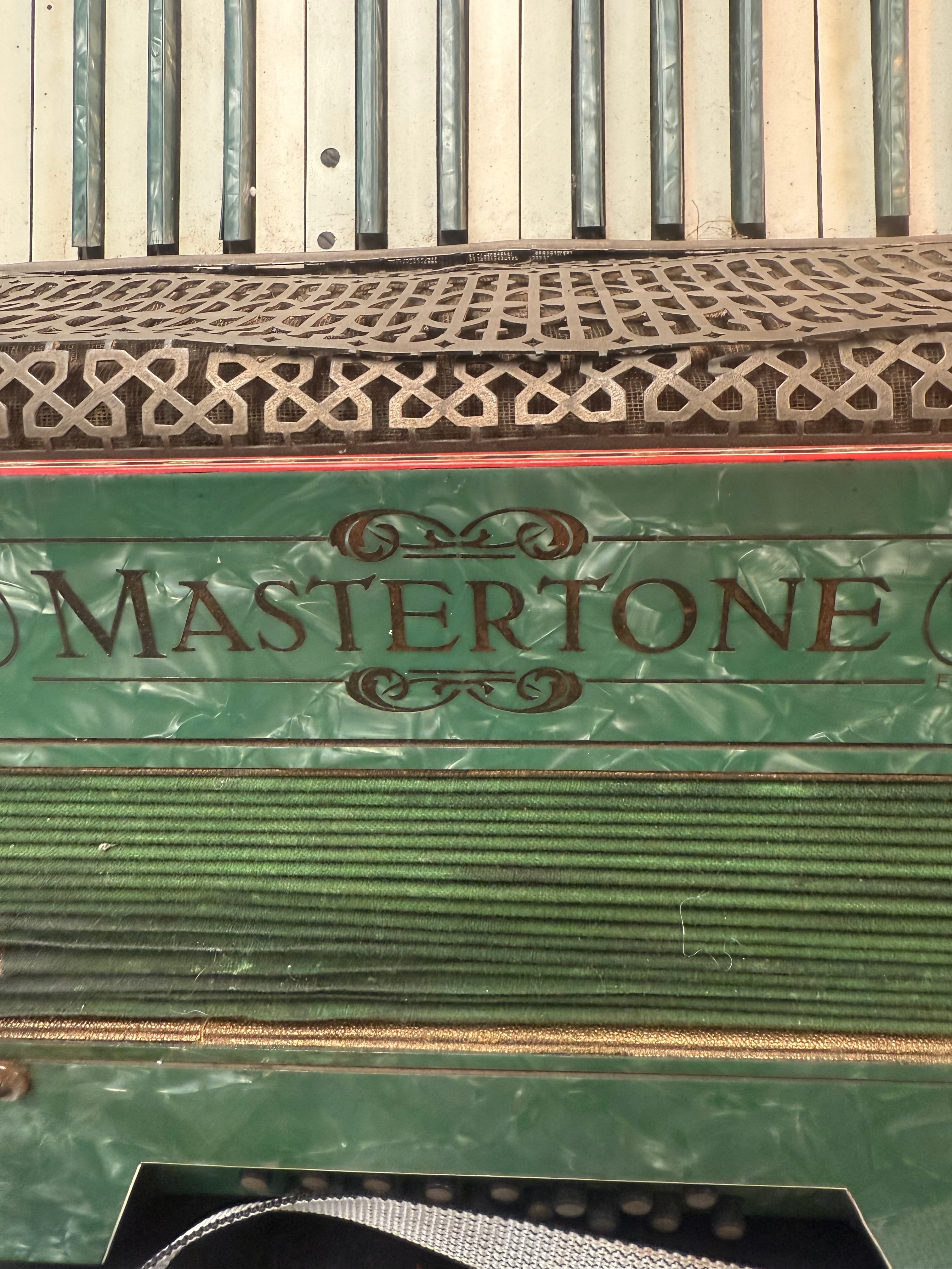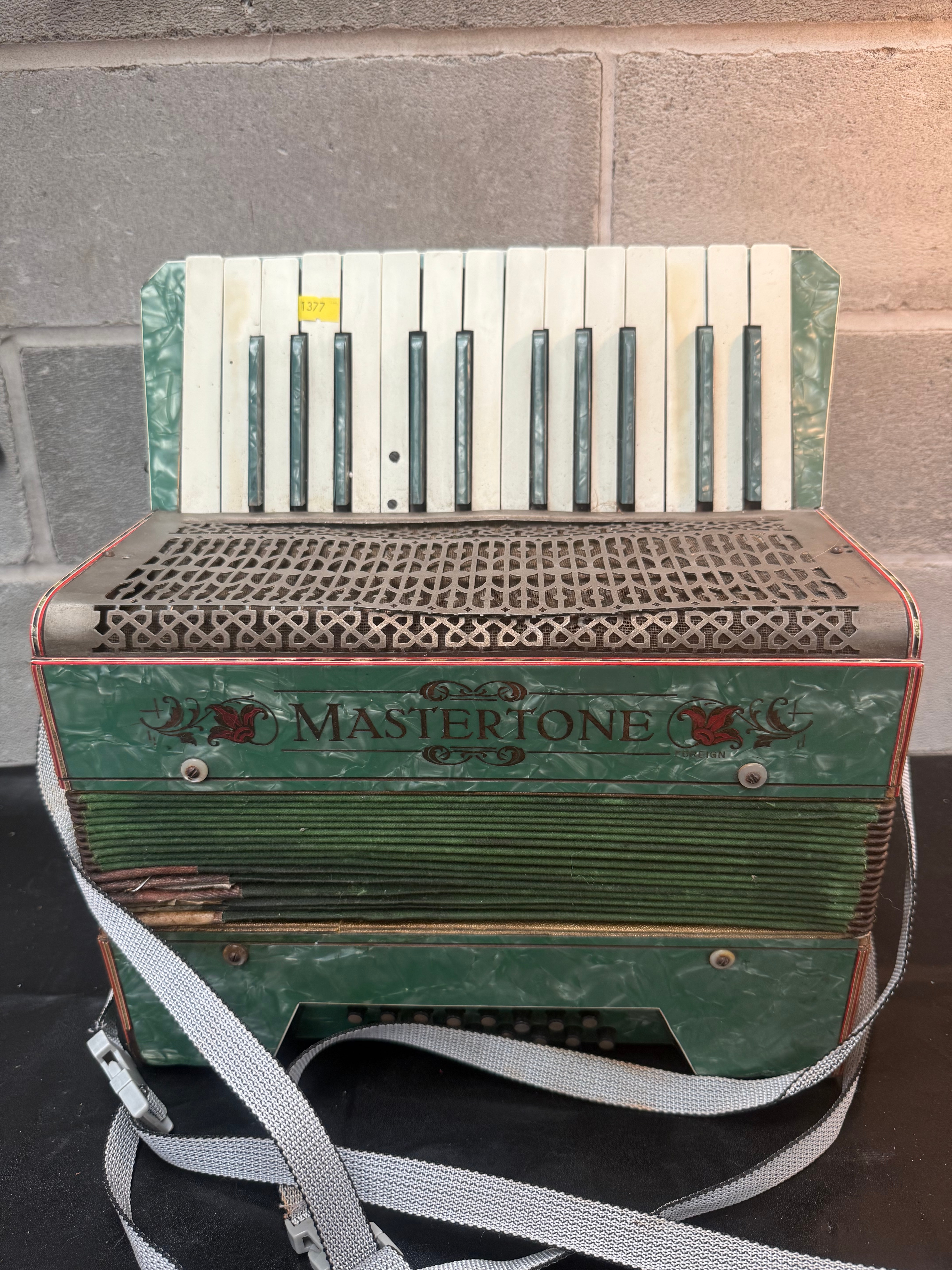 A vintage Mastertone 12 Bass Accordion, likely mid-20th century. The instrument features a marbled green plastic/celluloid casing with red trim accents. It is equipped with a standard piano-style keyboard of white and black keys on the treble side, and a panel of brown bass buttons on the opposing side. The front grille, adorned with an ornate geometric pattern, prominently displays the brand name “MASTERTONE” and partially visible text “MADE IN GERMANY” below it. A small yellow sticker with the number “13/7” is affixed to one of the white keys.