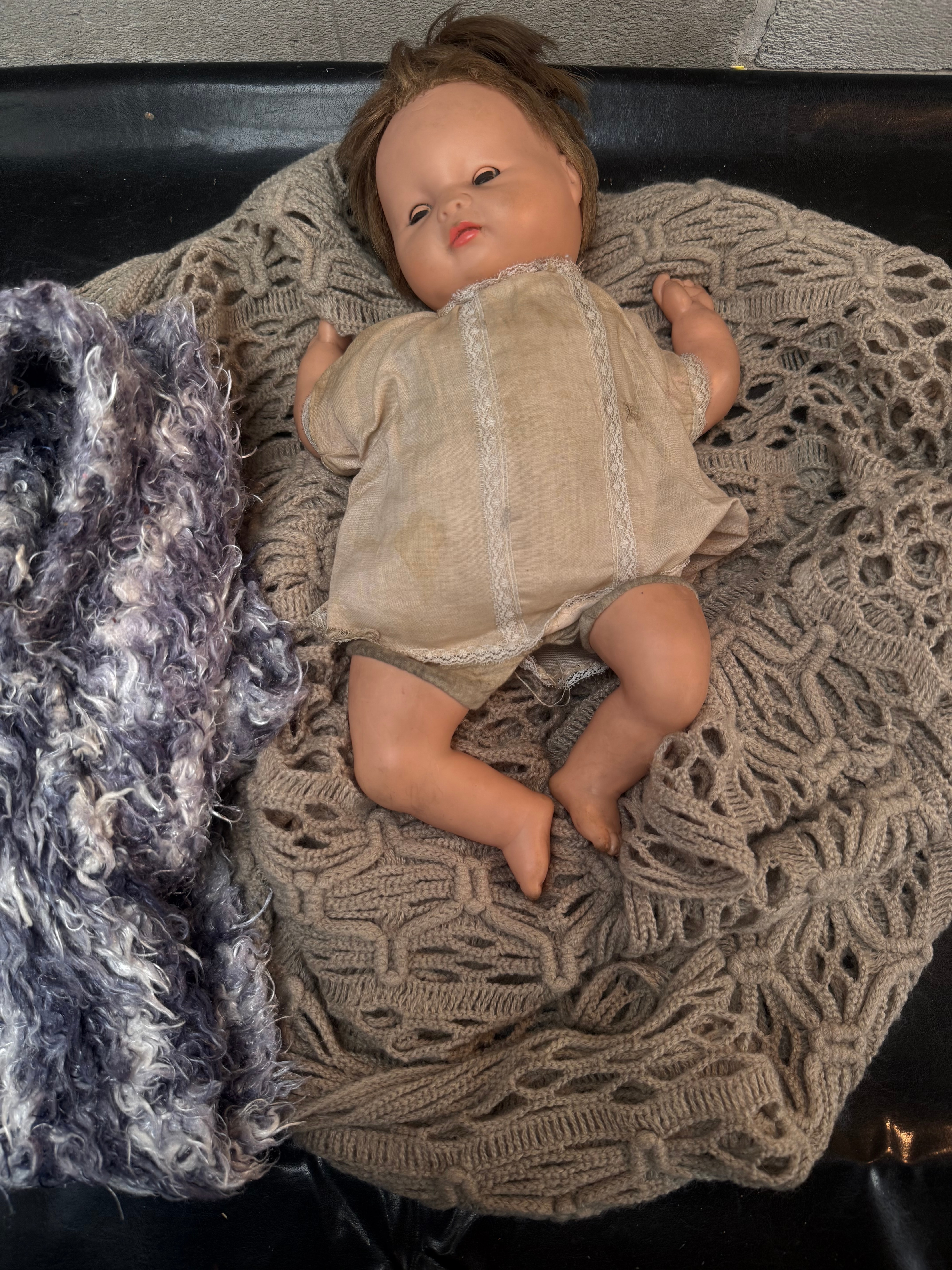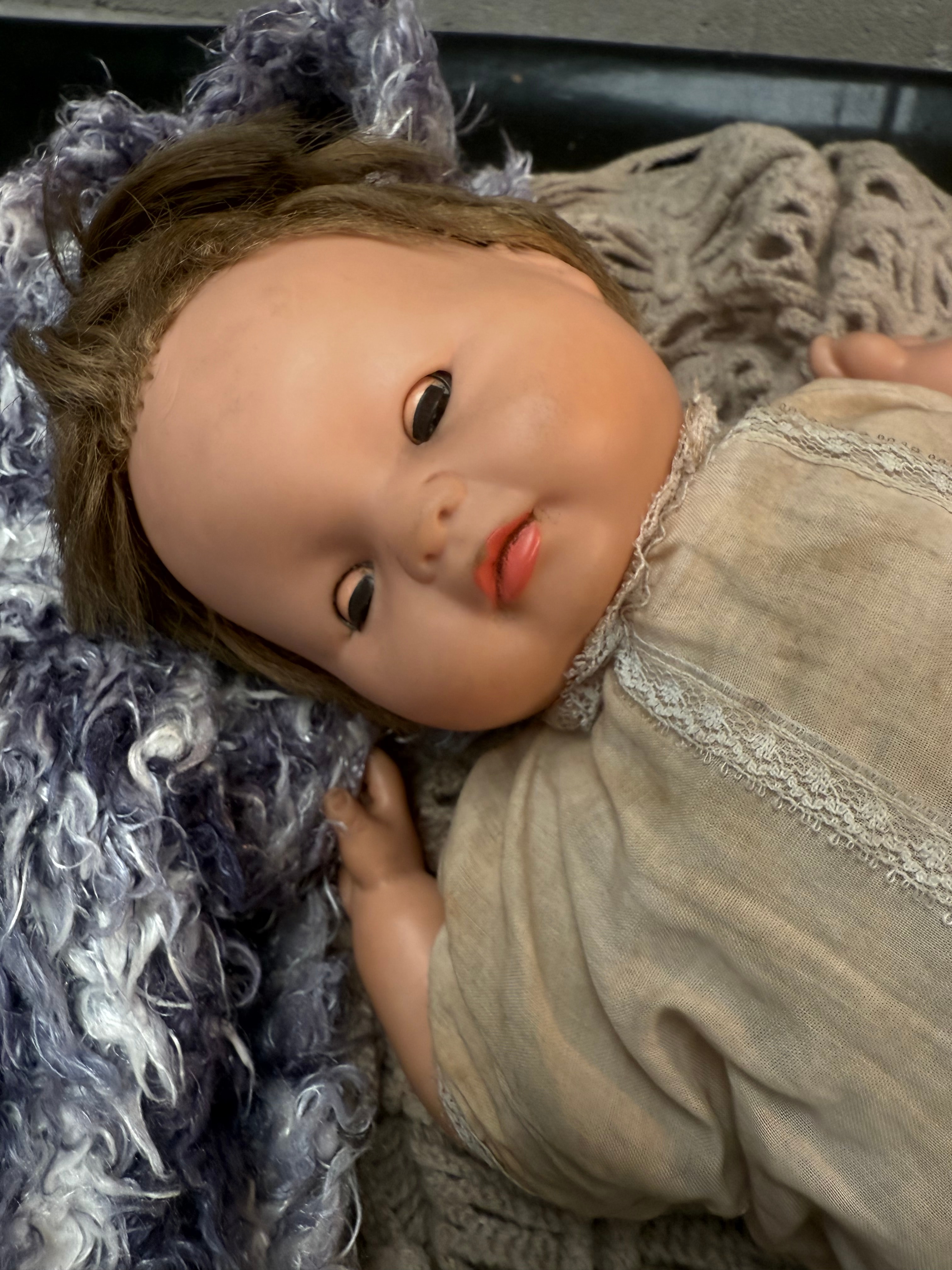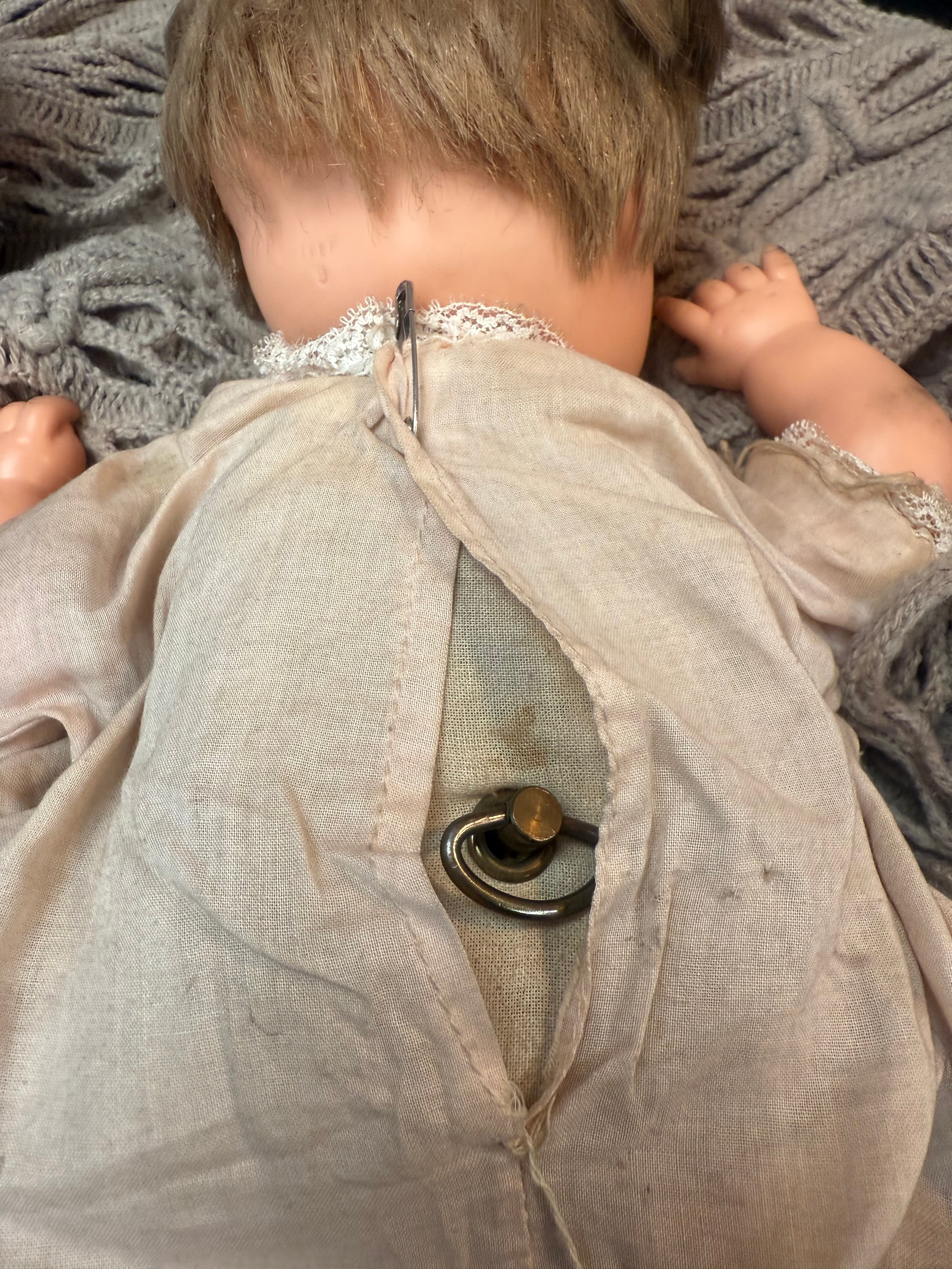 A baby doll featuring a hard plastic or composition head and limbs with painted facial features, including brown eyes and red lips, and molded brown hair. The doll’s body is fabric. It is dressed in a light-colored fabric romper with lace trim. A torn seam at the back reveals a metal, C-shaped mechanism inside, likely part of a cry box or winding key. No visible manufacturer’s markings or text are discernible.