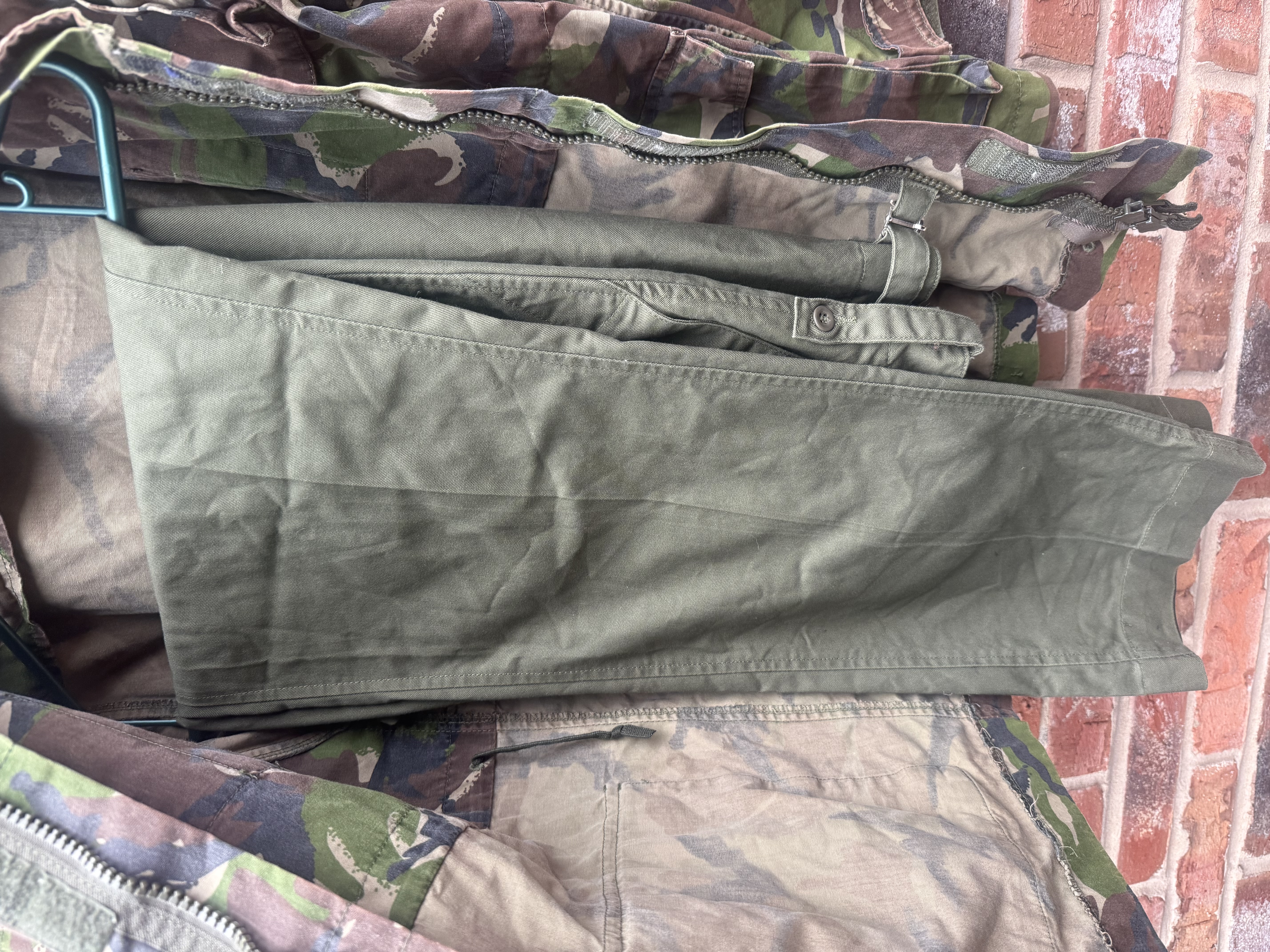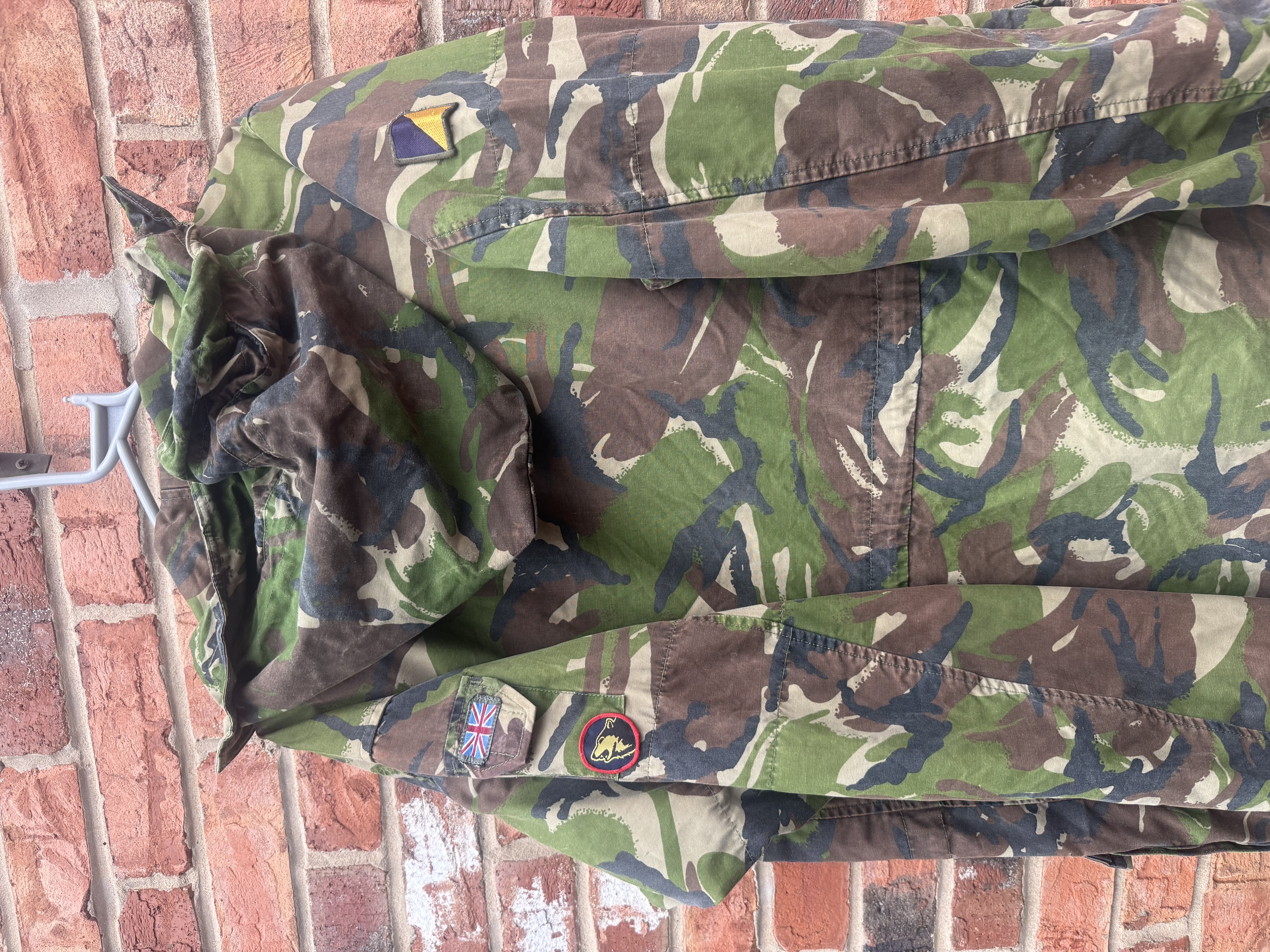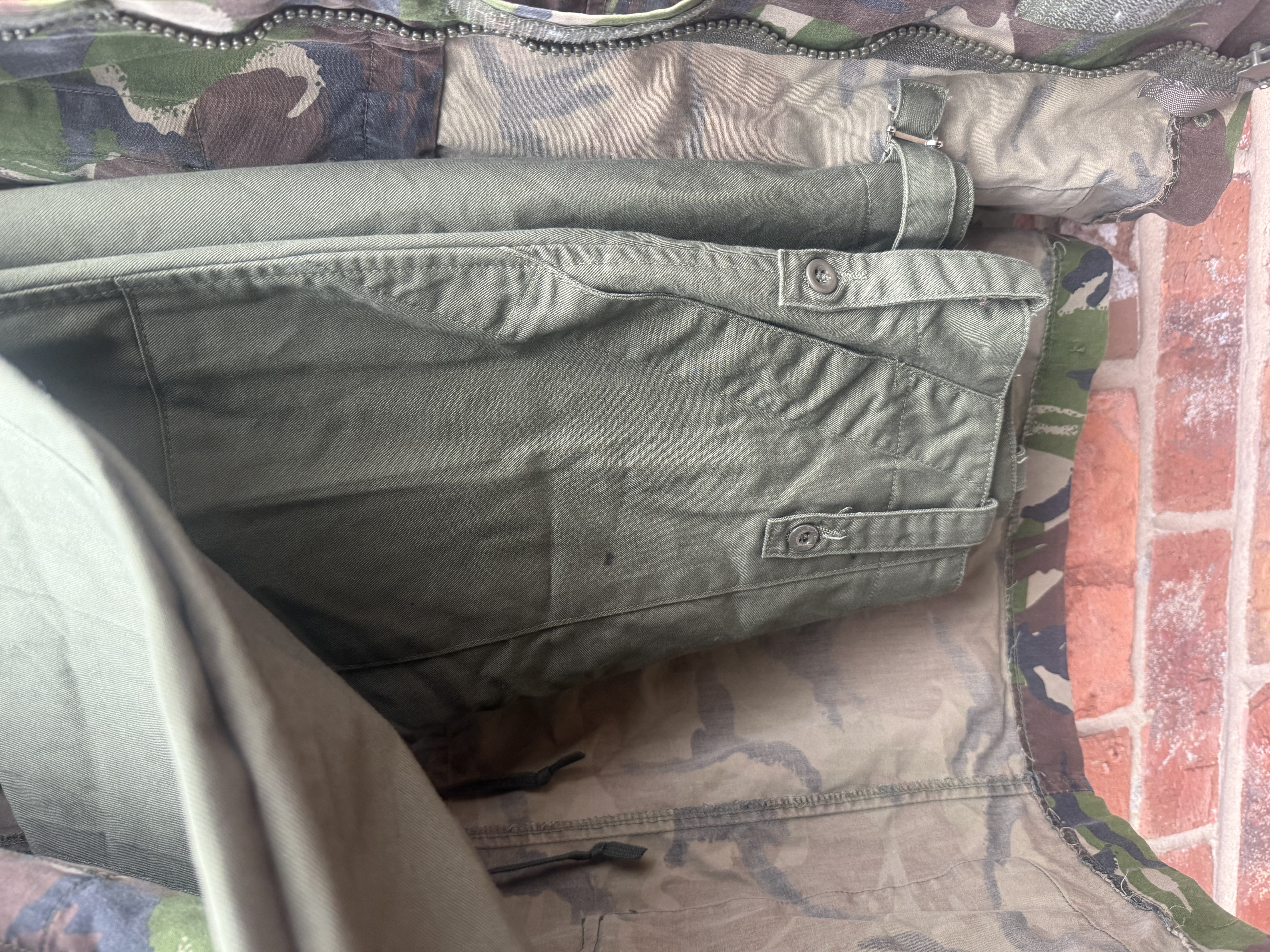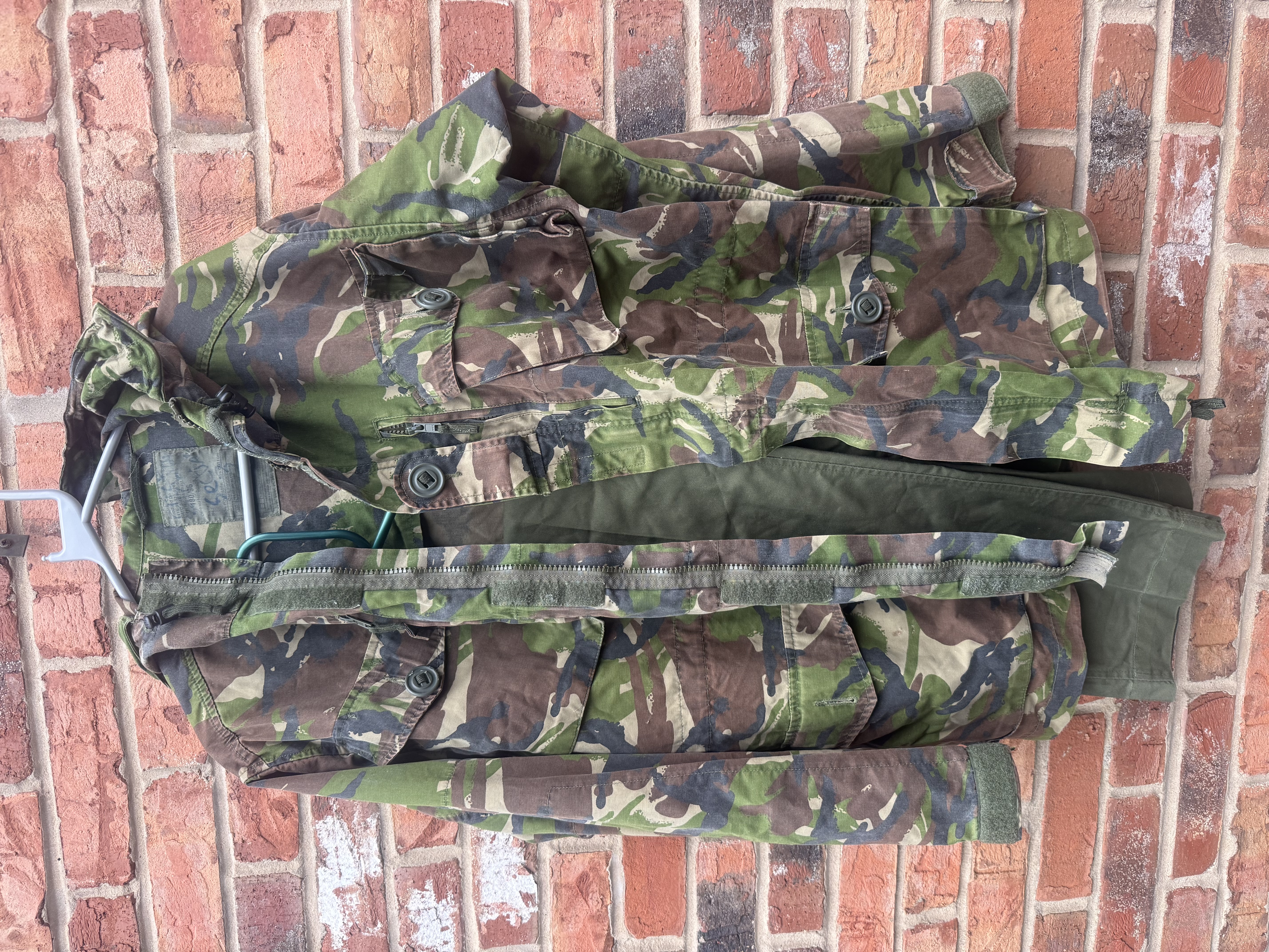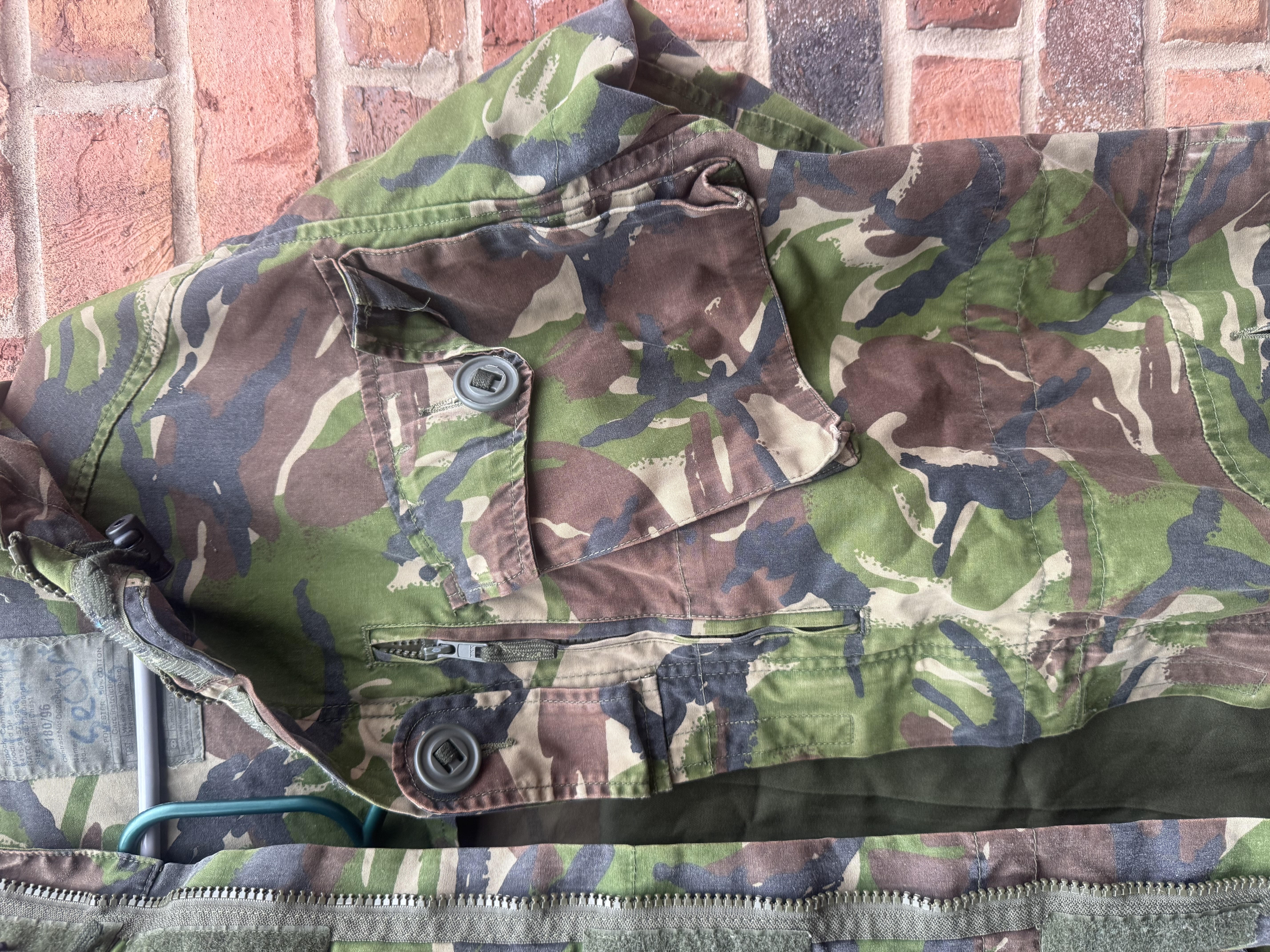 A DPM camouflage combat jacket, dated 1999, size 180/96, with three patches, by W. M. S. (CLOTHING) LTD, made in Northern Ireland, accompanied by a pair of olive green trousers.
