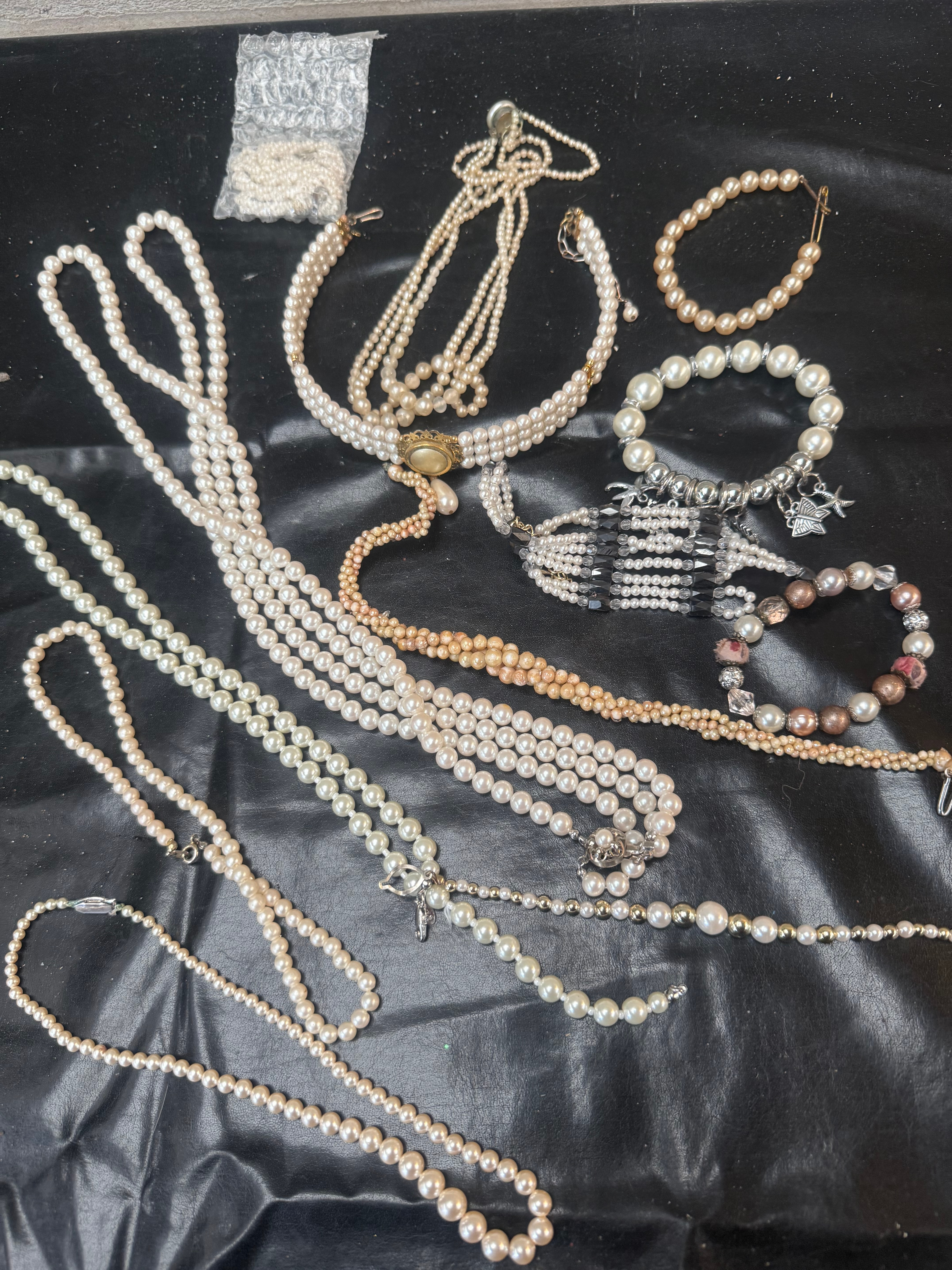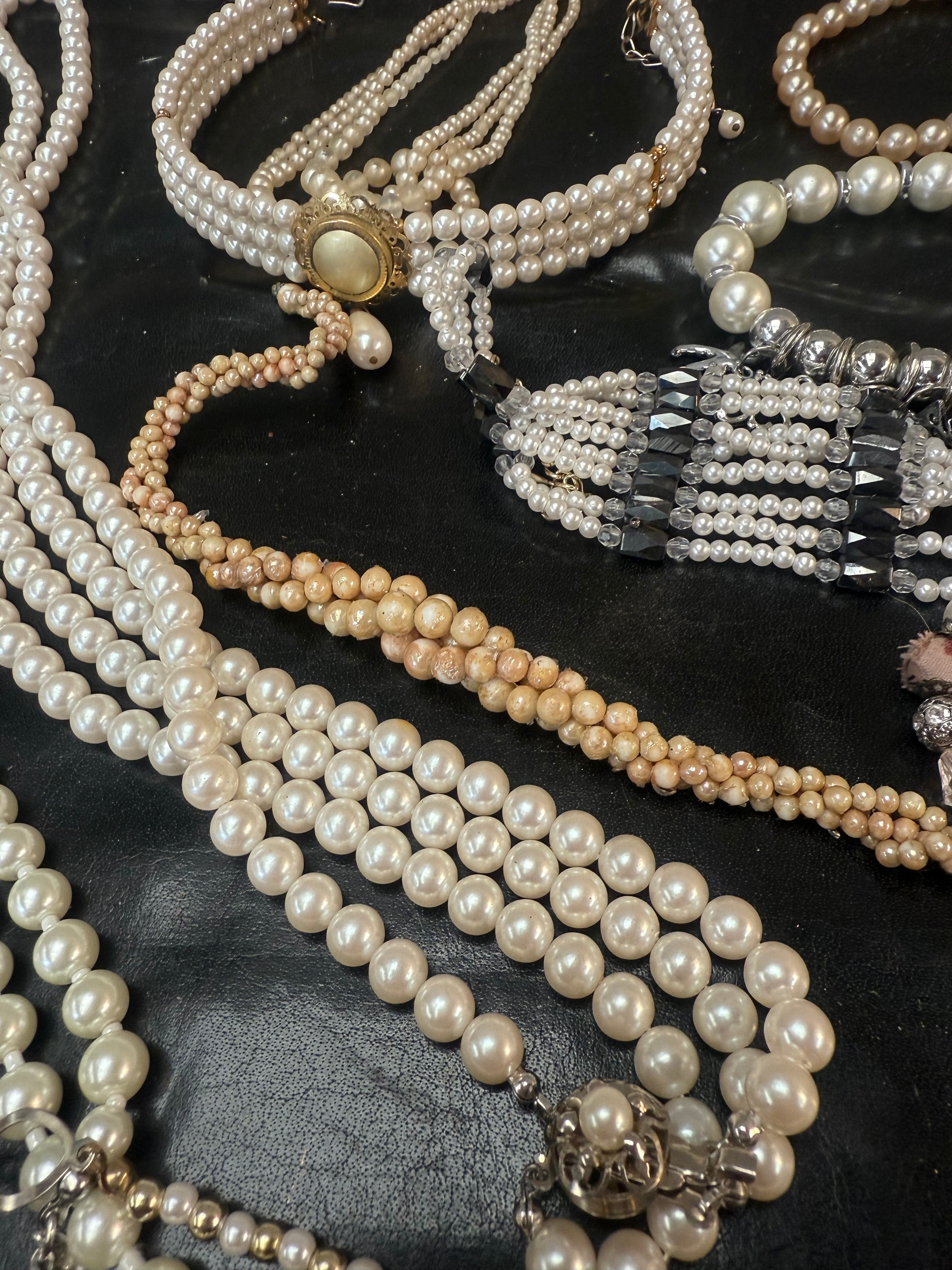 A collection of approximately 15-20 items of costume jewelry, primarily comprising necklaces and bracelets. The pieces are predominantly composed of spherical and semi-spherical pearls or imitation pearls, presented in various sizes and colors including white, cream, and light peach/pink. Styles encompass single-strand and multi-strand designs, notably a triple-strand choker with a gold-tone oval clasp featuring a central cabochon, as well as long opera-length strands and several bracelets. Additional materials include silver-tone and gold-tone metal findings, small charms such as starfish and seahorse, a cross pendant, and accent beads of clear and black faceted glass or crystal. Some pieces feature tasseled elements. A small plastic bag containing loose, smaller pearls is also included.