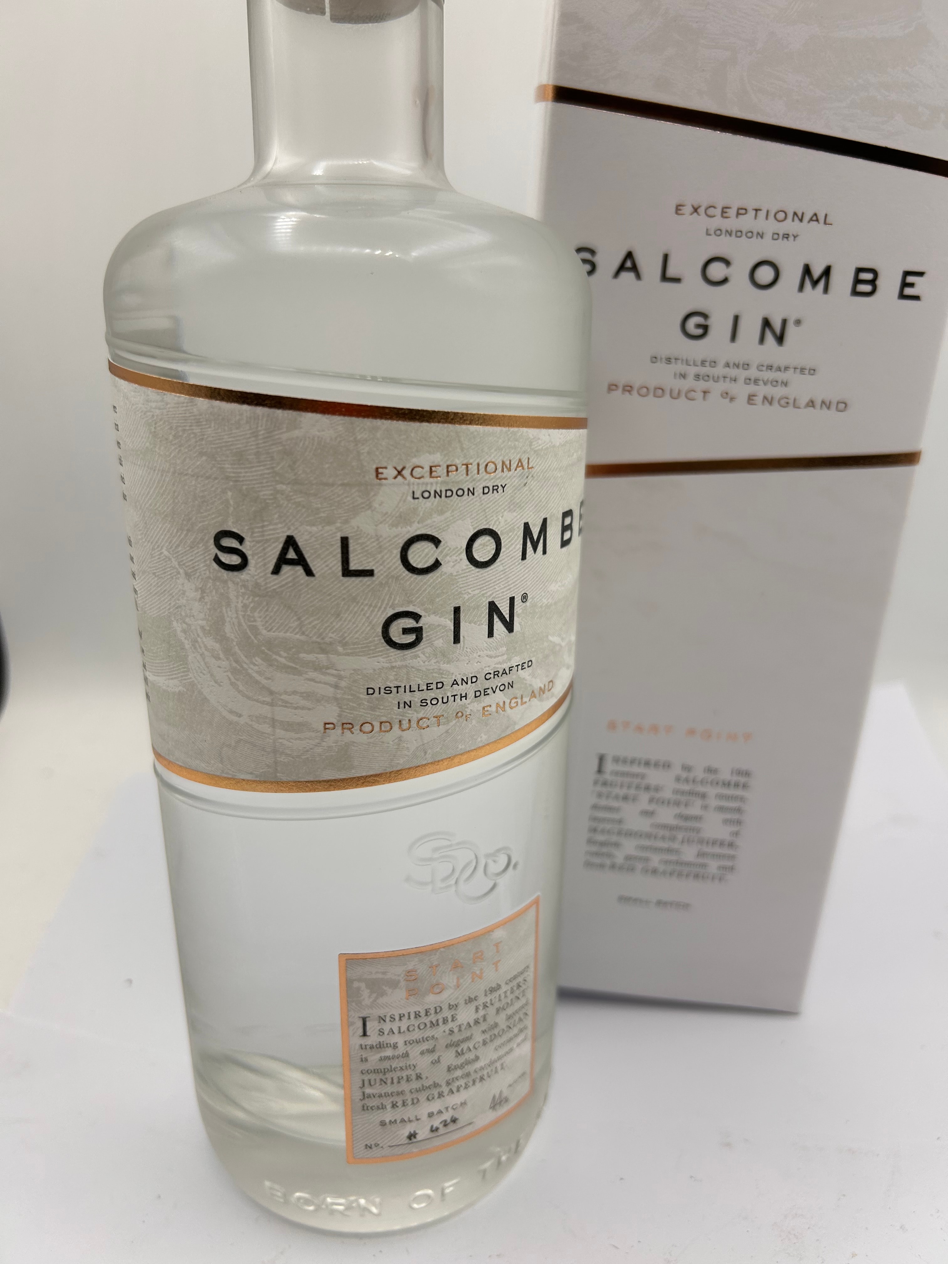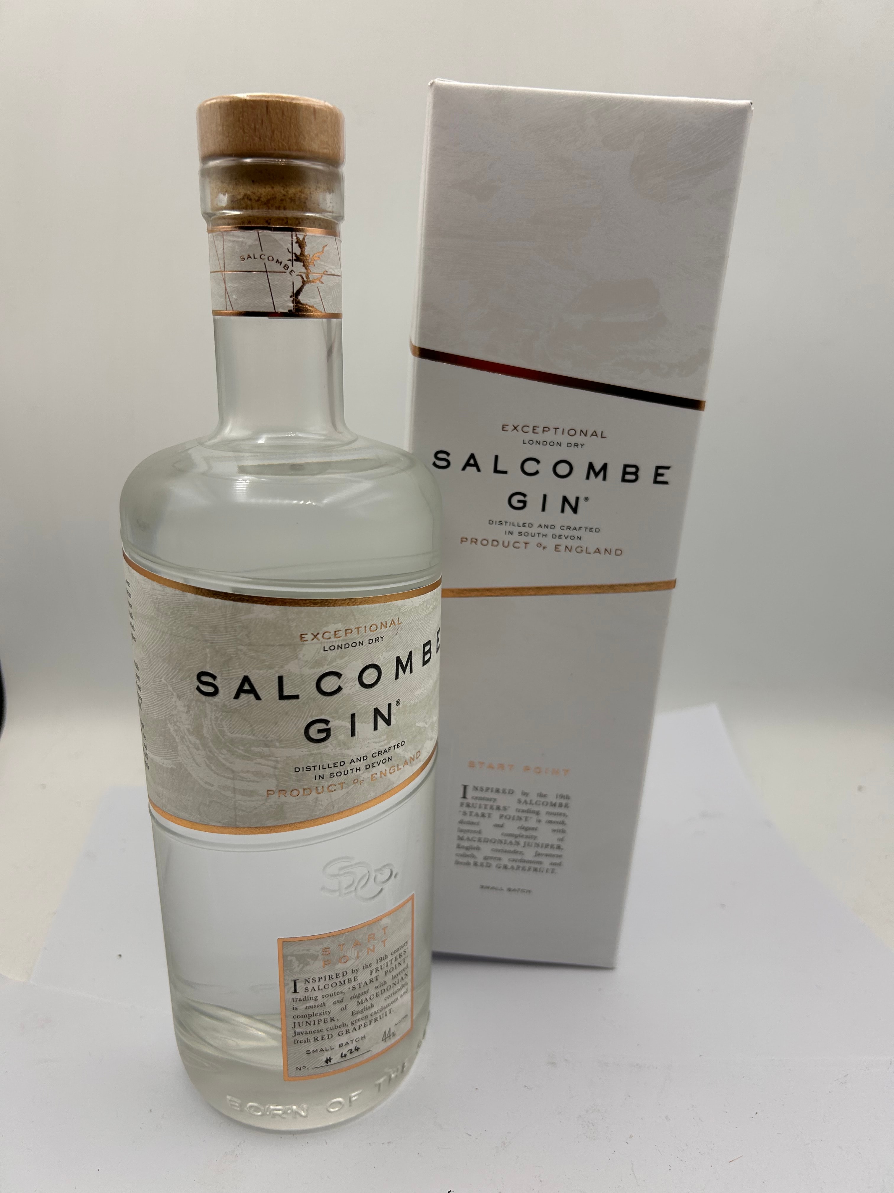 A bottle of Salcombe Start Point London Dry Gin, a contemporary spirit distilled and crafted in South Devon, Product of England. The clear glass bottle features a natural wood and cork stopper and paper labels adorned with gold-colored accents and a subtle wave motif. The gin is described as “START POINT,” inspired by Salcombe fruiters, featuring ingredients such as Macedonian juniper, fresh citrus, bay leaf, coriander, and pink grapefruit. The bottle’s lower label indicates “SMALL BATCH No. # 026.” It is presented with its matching cardboard gift box.