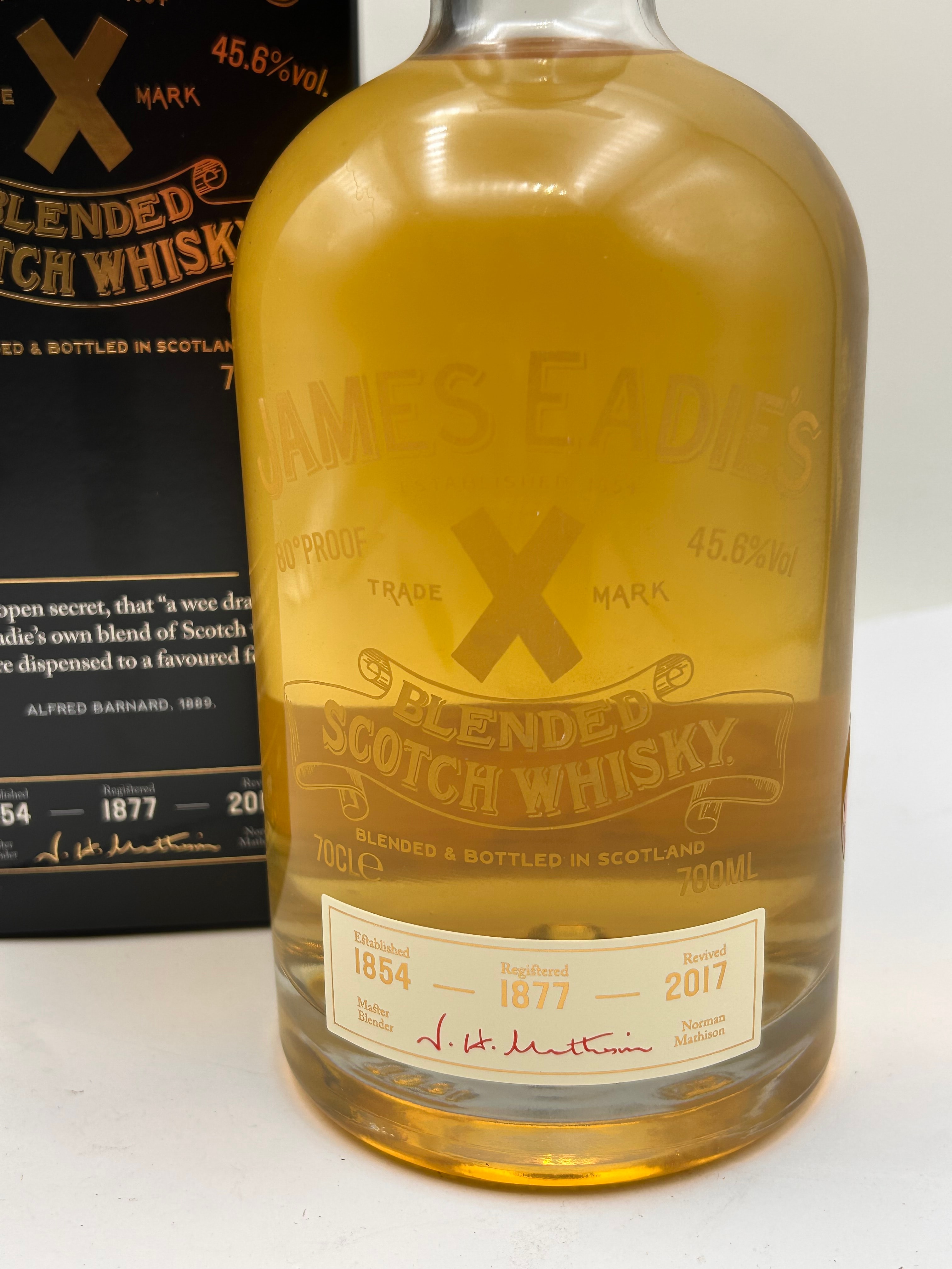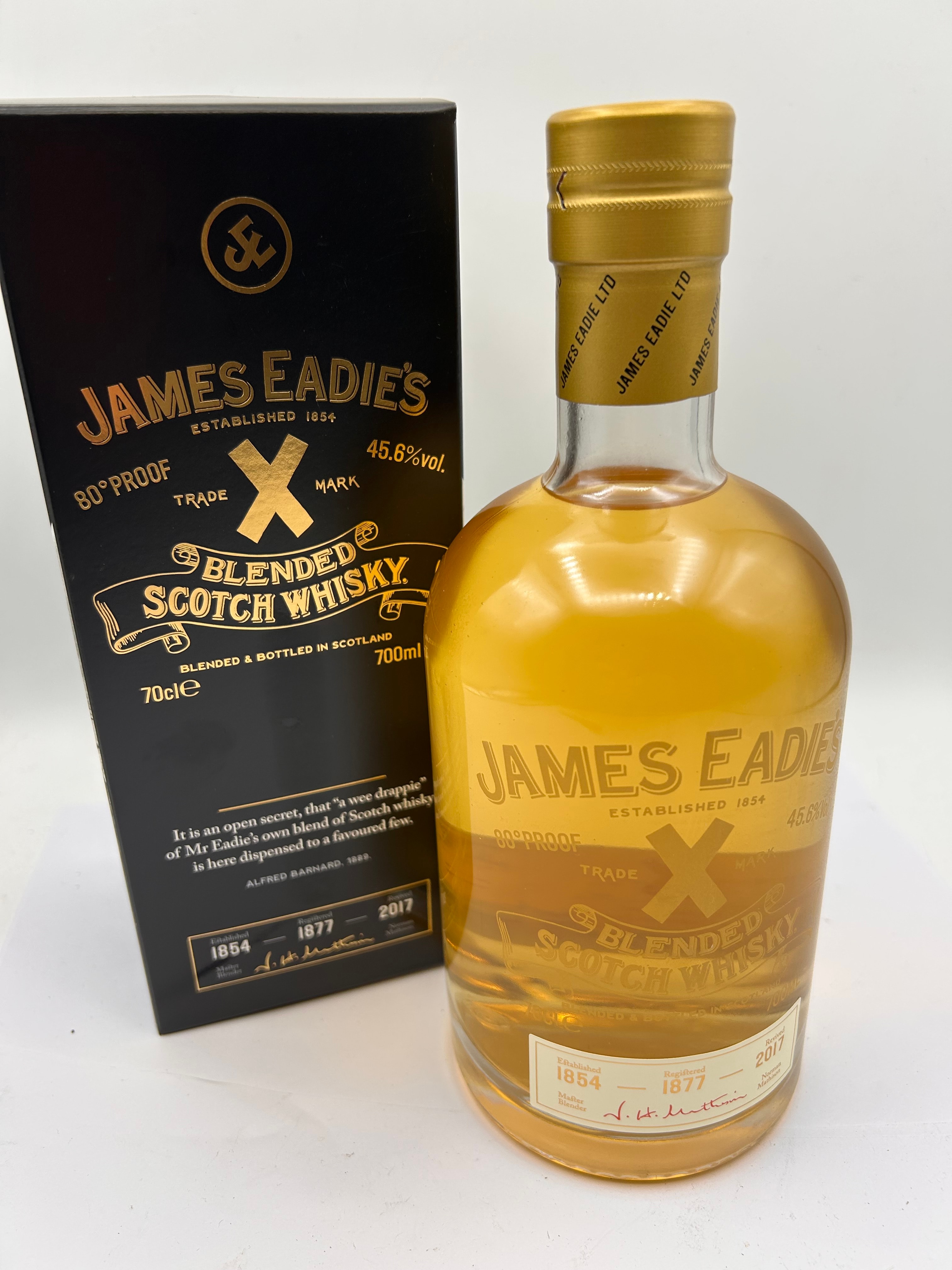 A bottle of James Eadie’s Trade Mark ‘X’ Blended Scotch Whisky, presented with its original black cardboard presentation box. The clear glass bottle features paper labels in gold and brown, detailing “Established 1854,” “80° PROOF,” “45.6% vol.,” a prominent “TRADE X MARK,” and “70cl / 700ml.” Further text on the label indicates “Registered 1877” and “Revived 2017” by “Norman Mathison,” with a “D. H. Mathison” signature as “Master Blender.” The box reiterates these details and includes a historical quote: “It is an open secret, that ‘a wee drappie’ of Mr Eadie’s own blend of Scotch is here dispensed to a favoured few. Alfred Barnard. 1889.” The bottle has a gold-colored screw cap marked “JAMES EADIE LTD.”