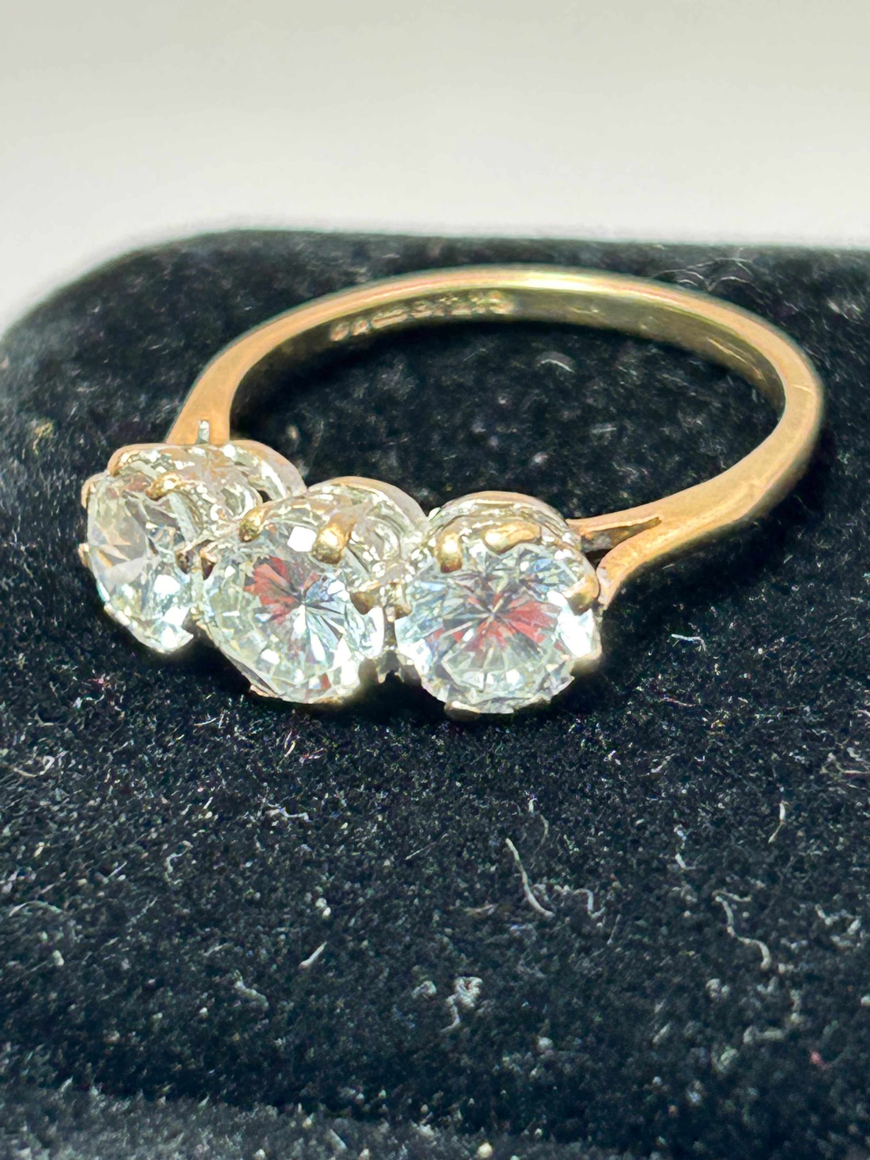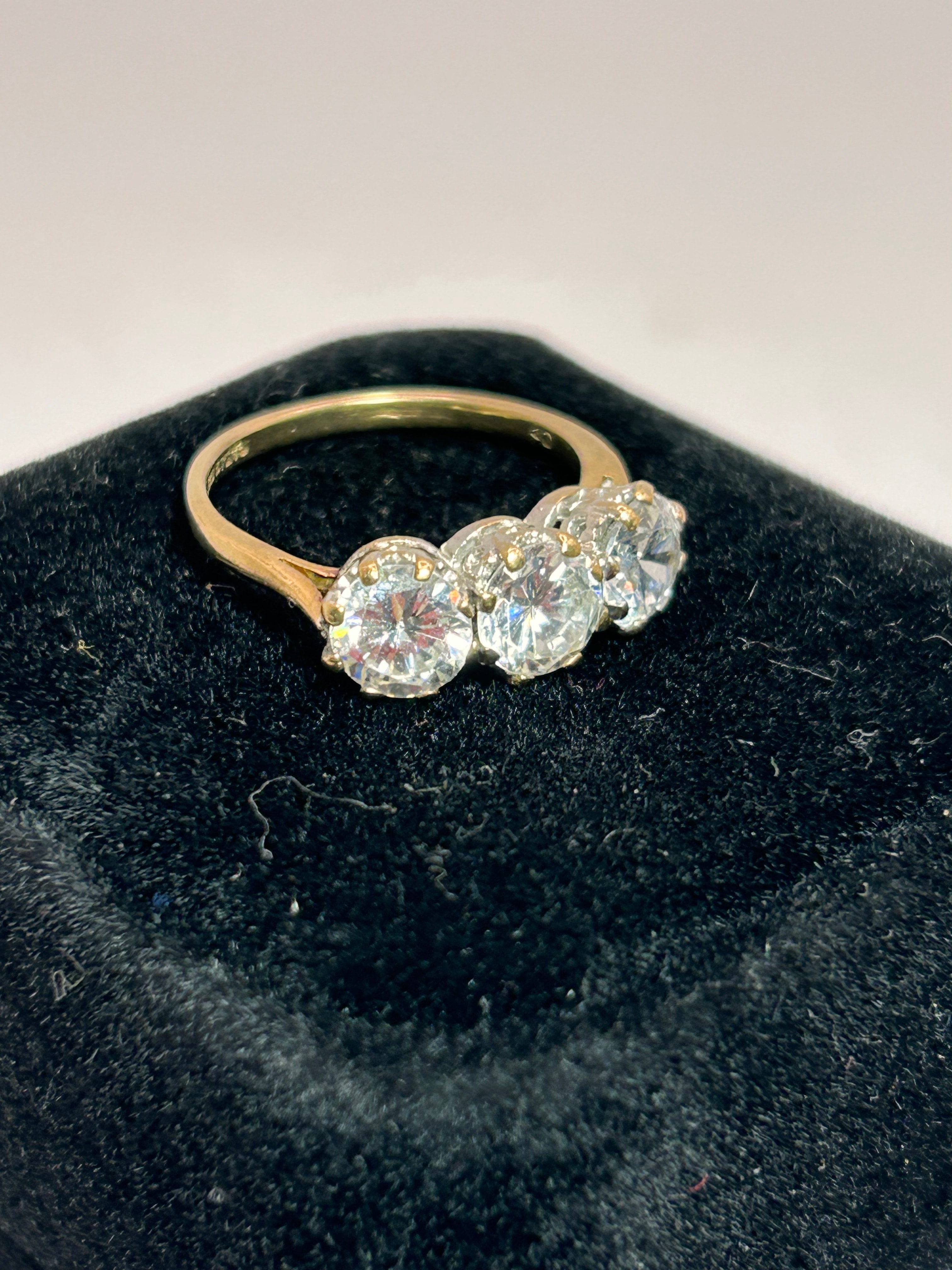 A contemporary 9ct yellow gold trilogy ring, set with three uniformly sized, round brilliant-cut cubic zirconia stones, with an approximate total weight of 3.5g. Each stone is individually secured in a prong setting. The interior of the band bears visible markings. UK ring size O.