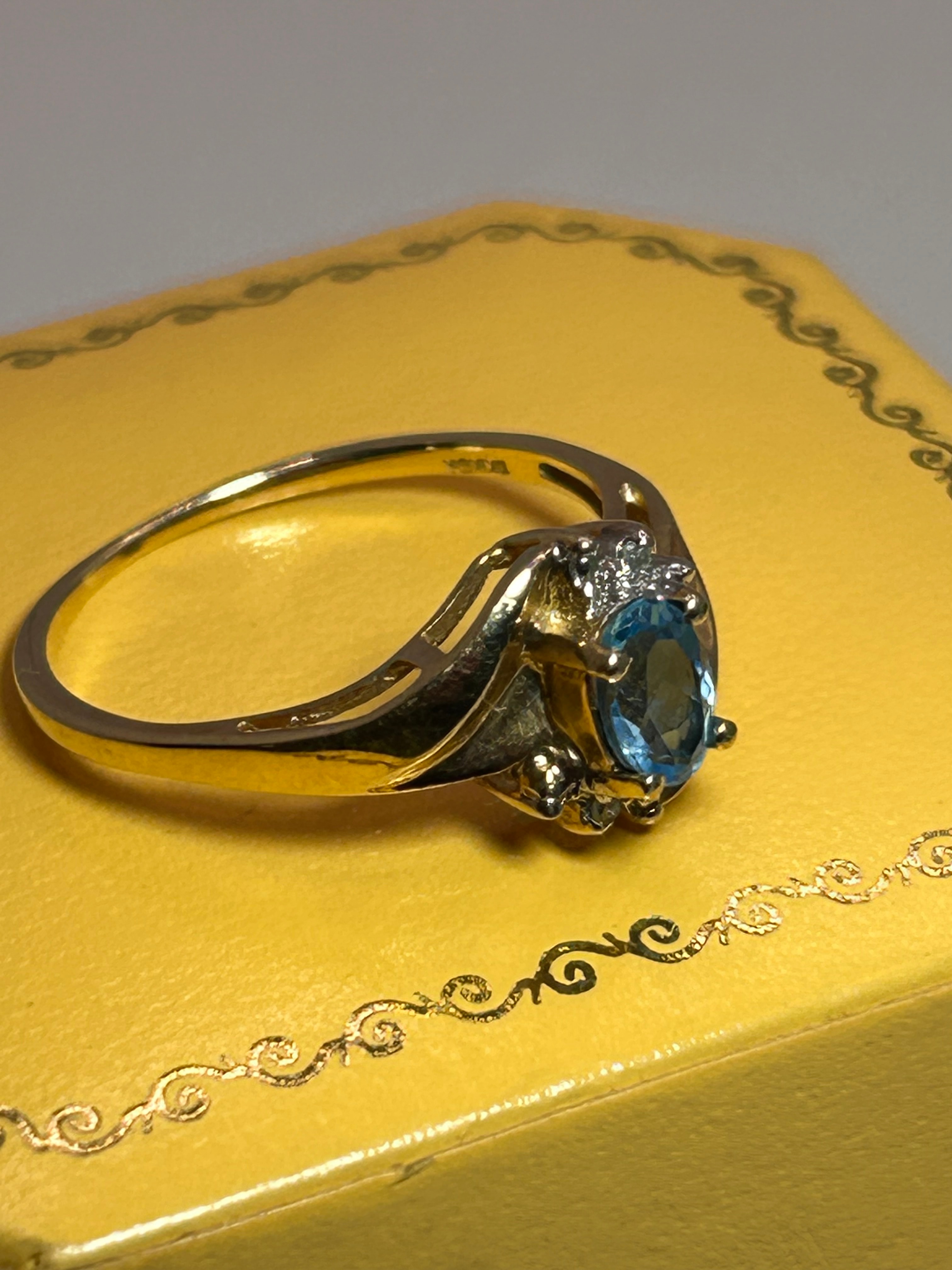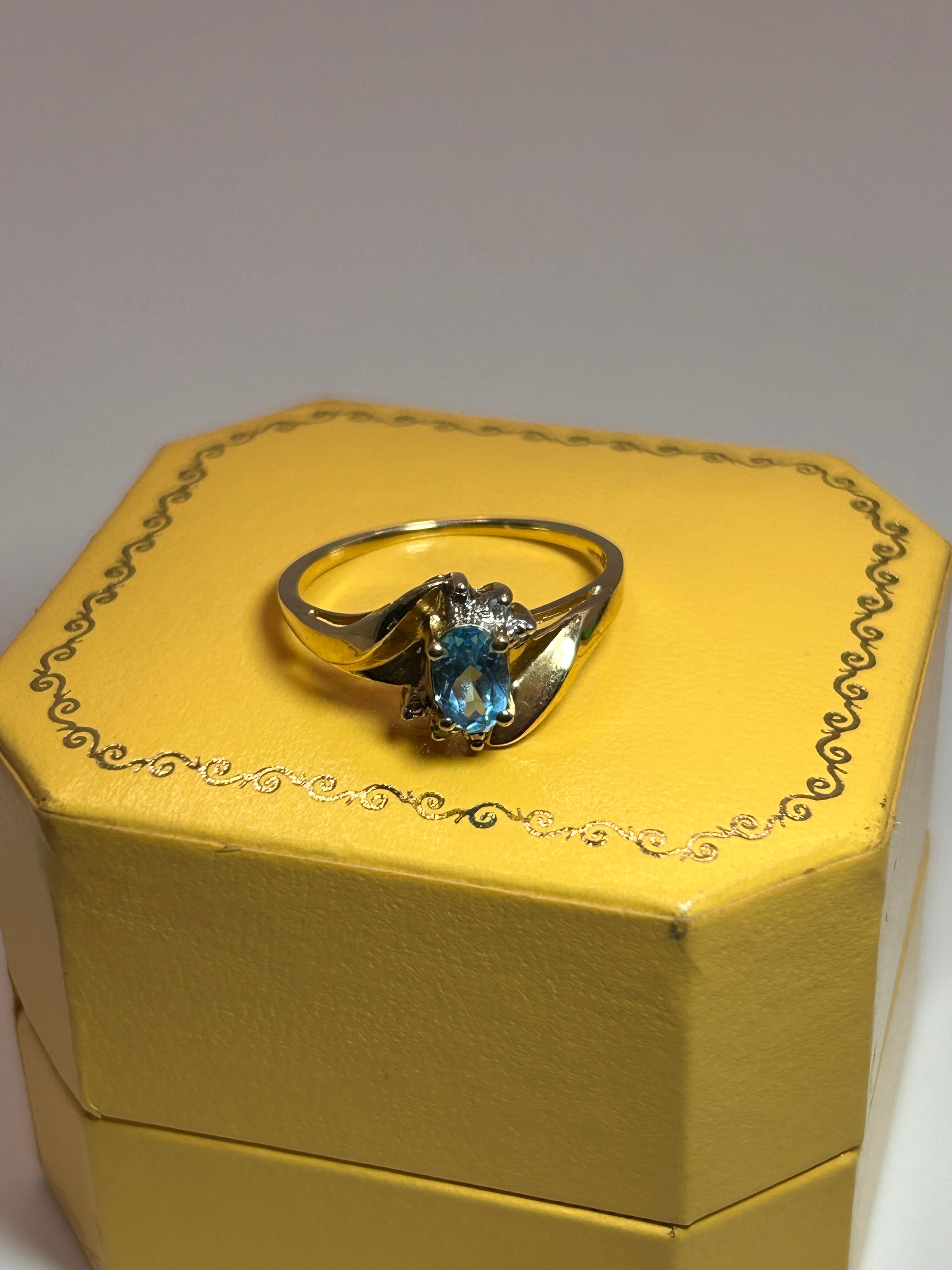 A modern-style 10K yellow gold bypass ring featuring a central oval-cut blue topaz and diamond accents. The translucent light blue gemstone is prong-set within the bypass-style band. The shoulders are adorned with a cluster of small, round, colorless accent stones, set into contrasting white metal, likely white gold or rhodium-plated. No discernible hallmarks or maker’s marks are visible.