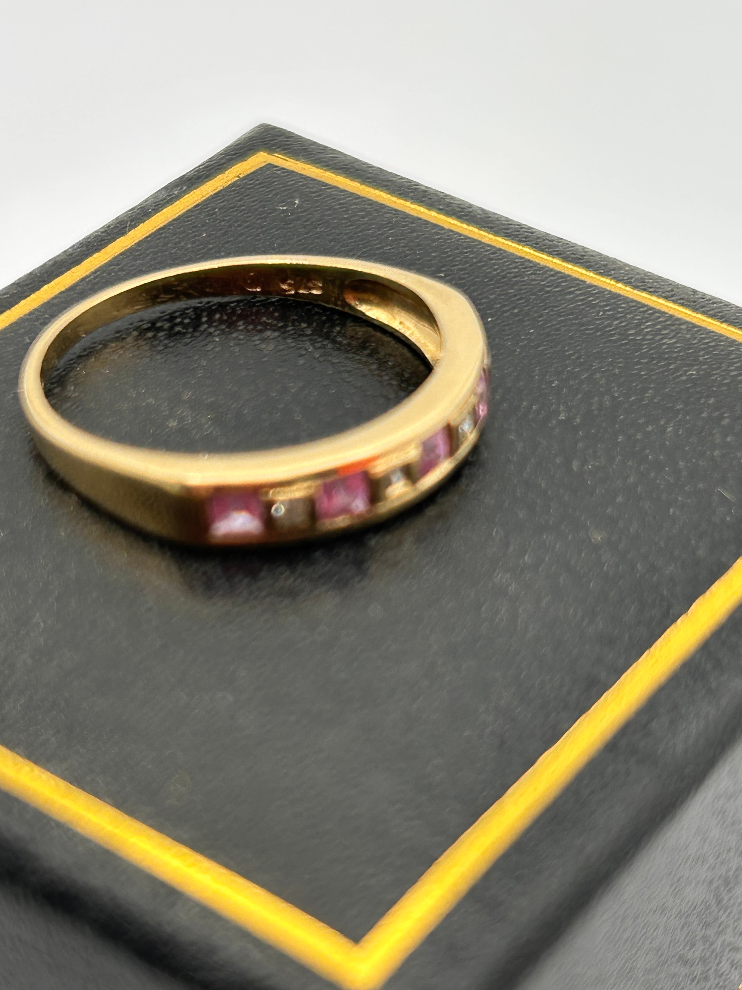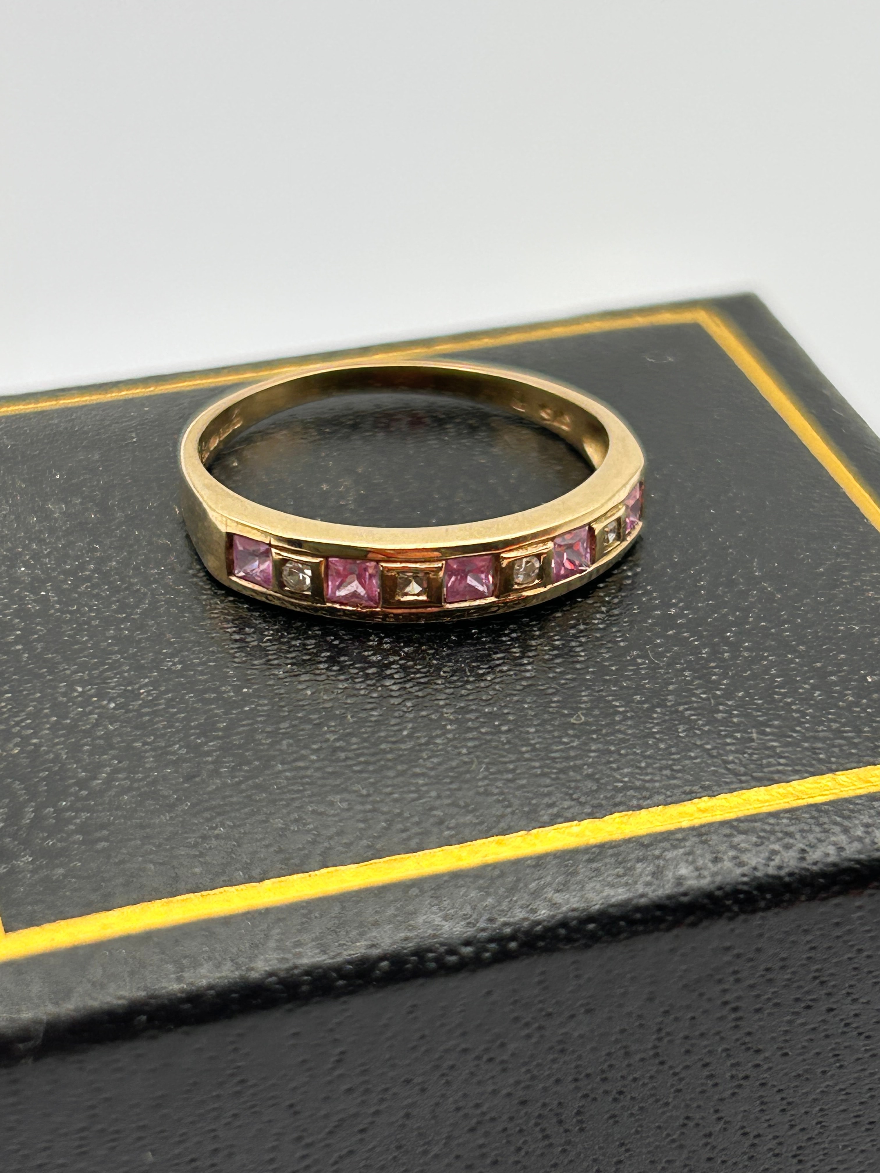 A 9ct yellow gold half-eternity band-style ring, featuring a series of alternating channel-set square-cut pink Topaz stones and smaller round-cut Diamond stones across its top half. The interior of the band is clearly marked ‘375’, indicating 9 carat gold.