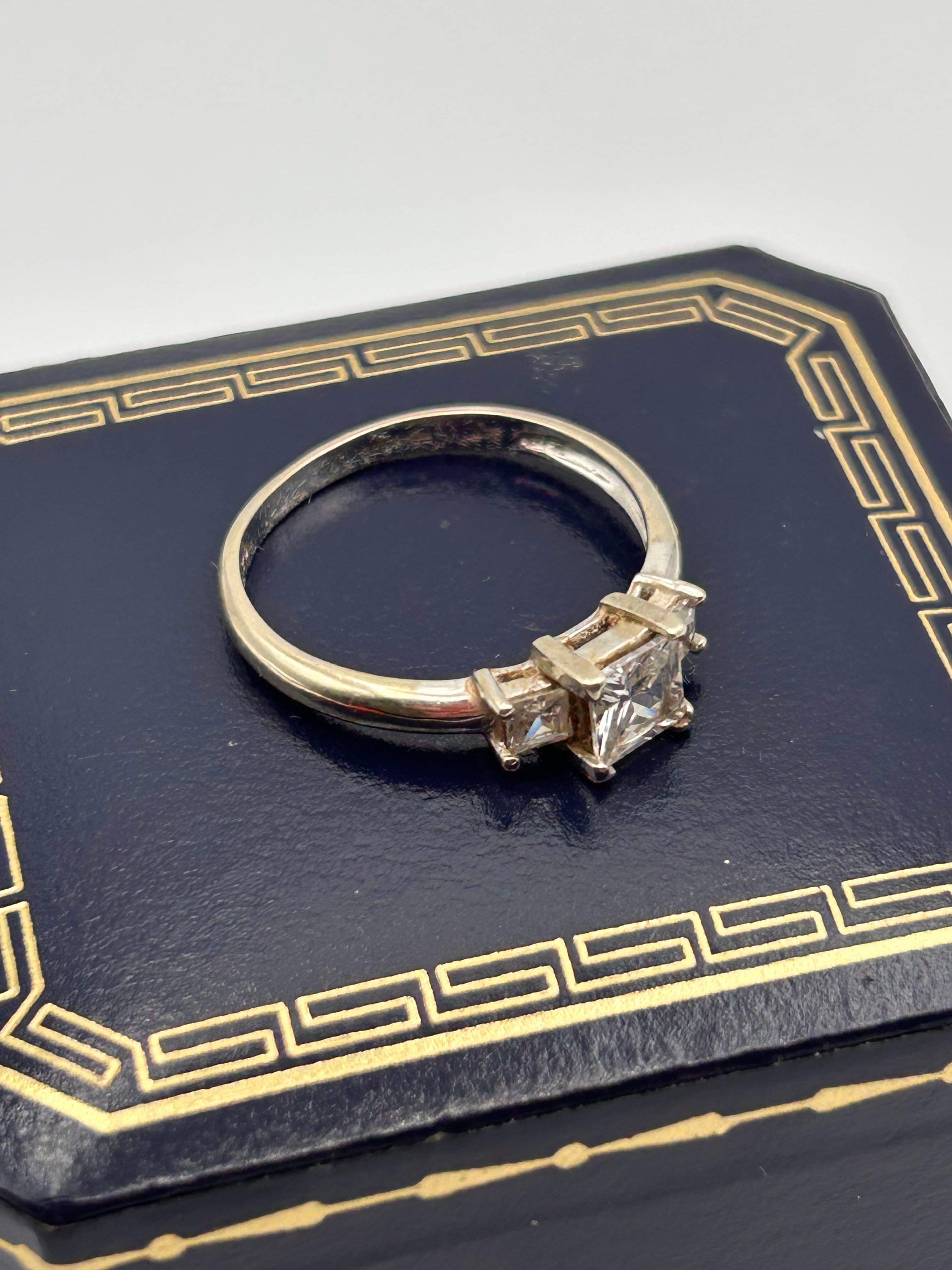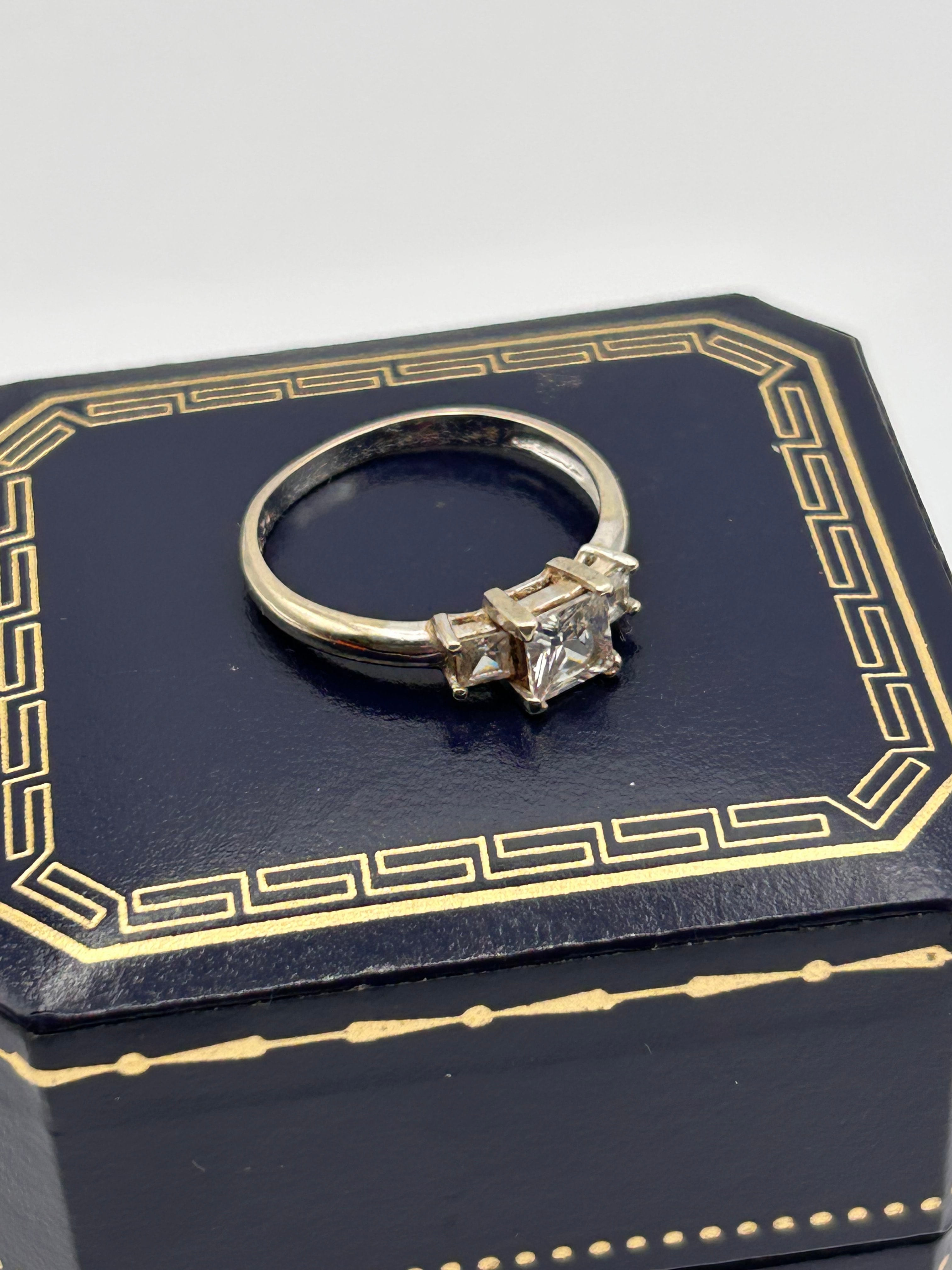 A 9ct white gold trilogy style ring set with three CZ stones. The central stone is a princess-cut clear faceted CZ, flanked by two smaller, similarly cut clear faceted CZ stones, all secured by prongs. The band is a plain, polished design. The ring is presented on a dark blue jewelry box with a gold Greek key border pattern.