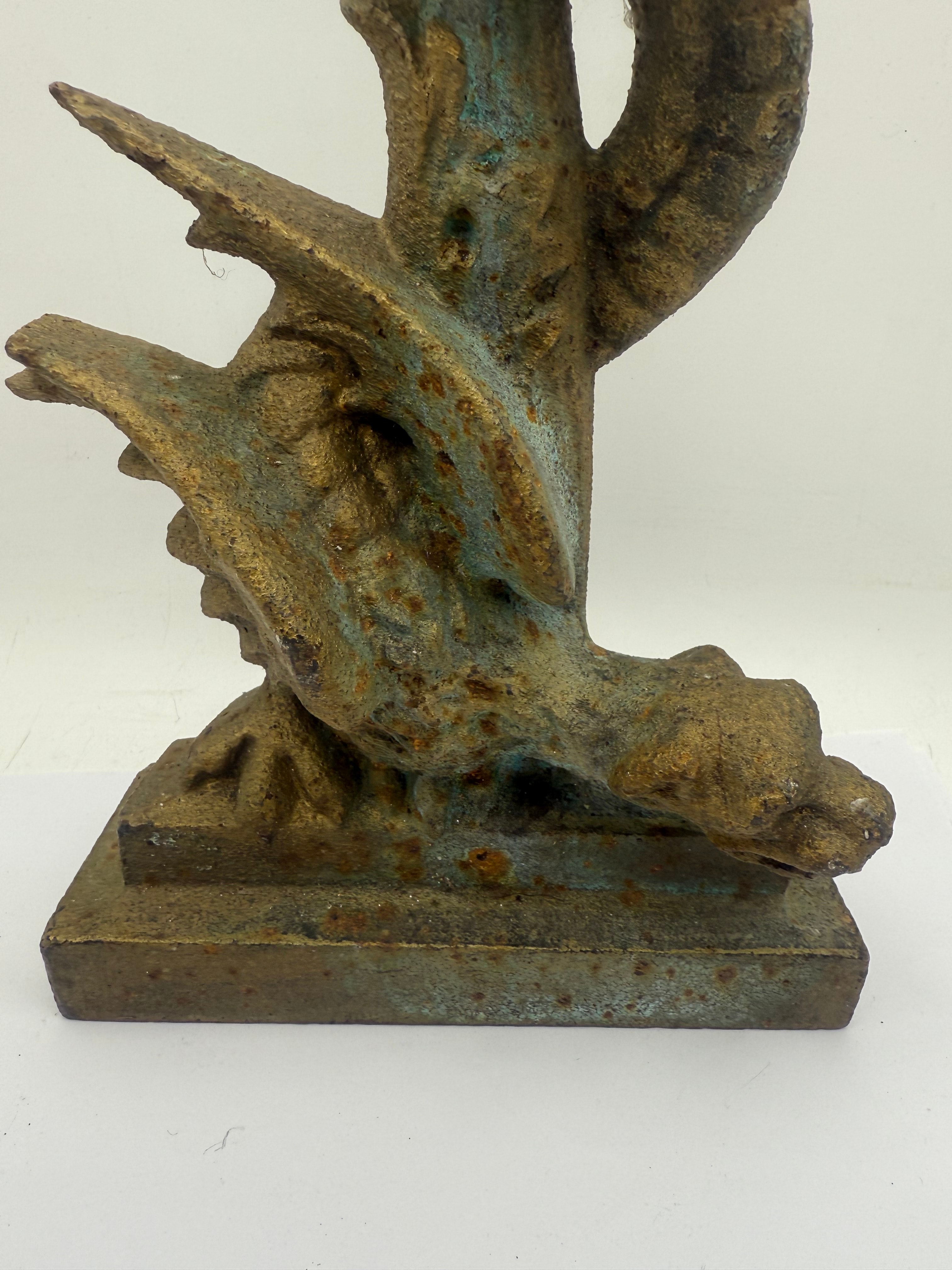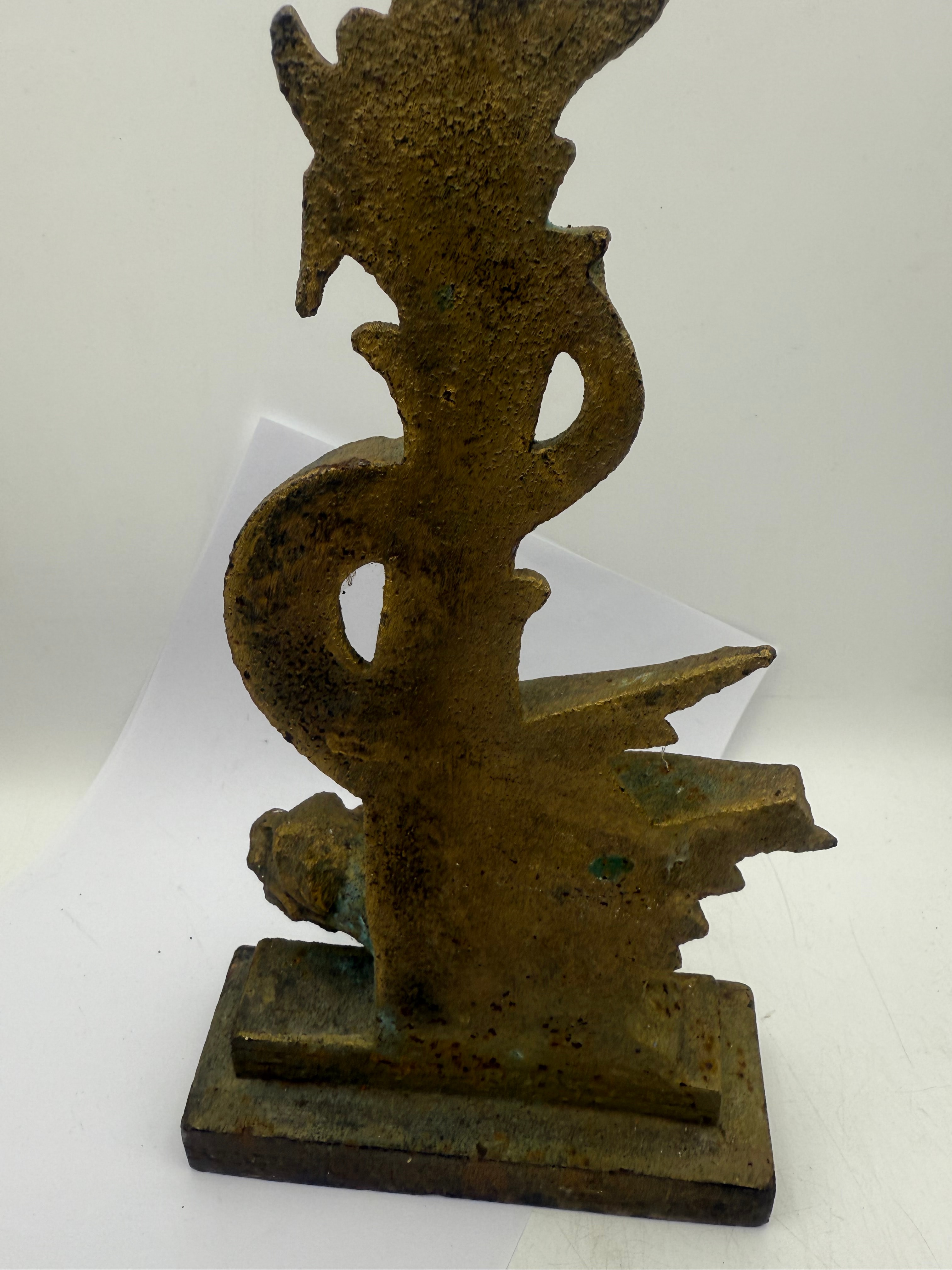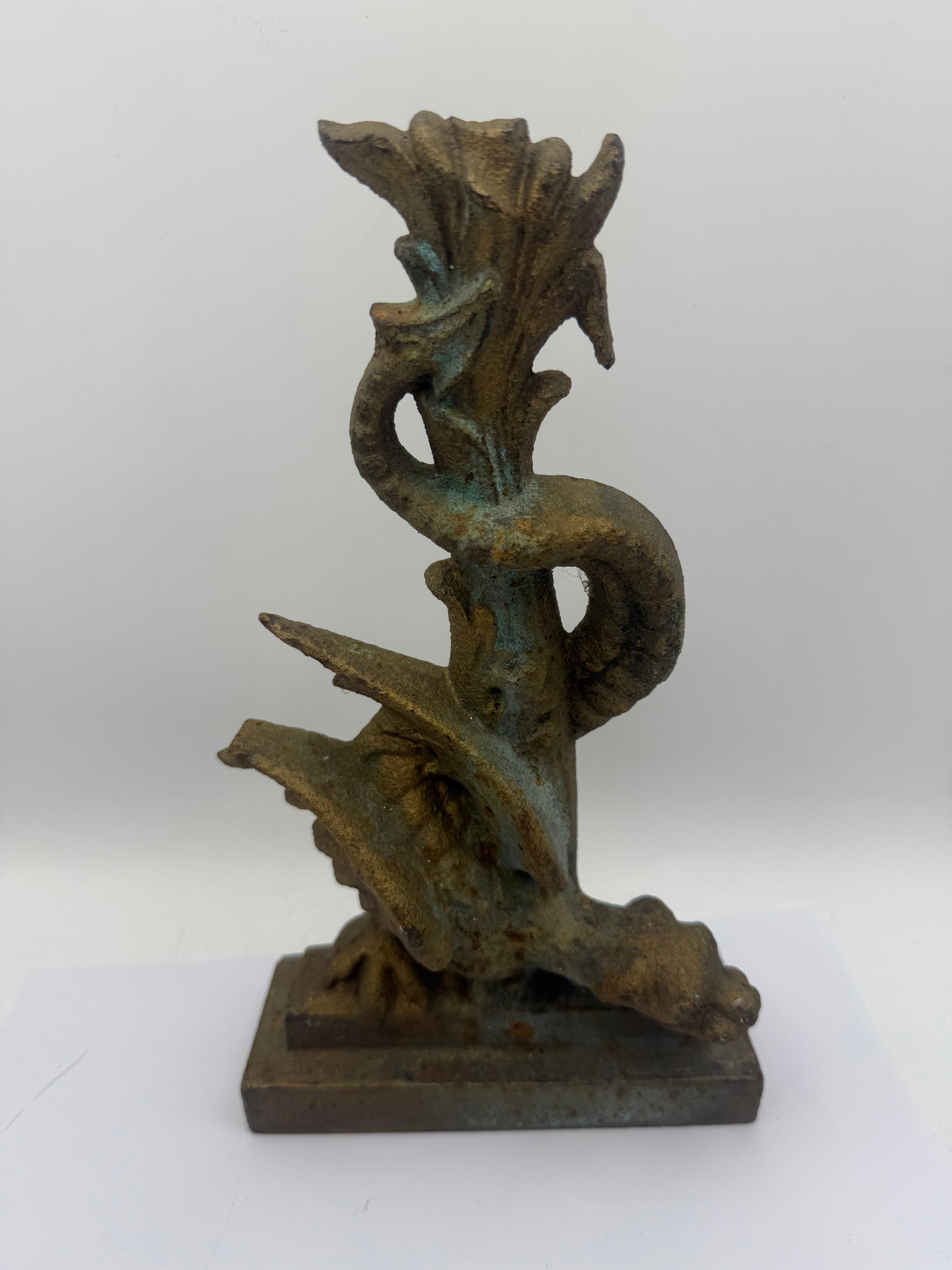 An antique Thai style protective Naga, snake or serpent figure. Crafted from cast iron, this sculptural ornament depicts a stylized winged sea creature or dragon with a serpentine body coiling upwards from a rectangular base. The surface exhibits heavy patination with a dull golden-brown color, interspersed with significant areas of blue-green verdigris and darker oxidation, consistent with a rough casting texture. No discernible text, maker’s marks, or other inscriptions are visible.