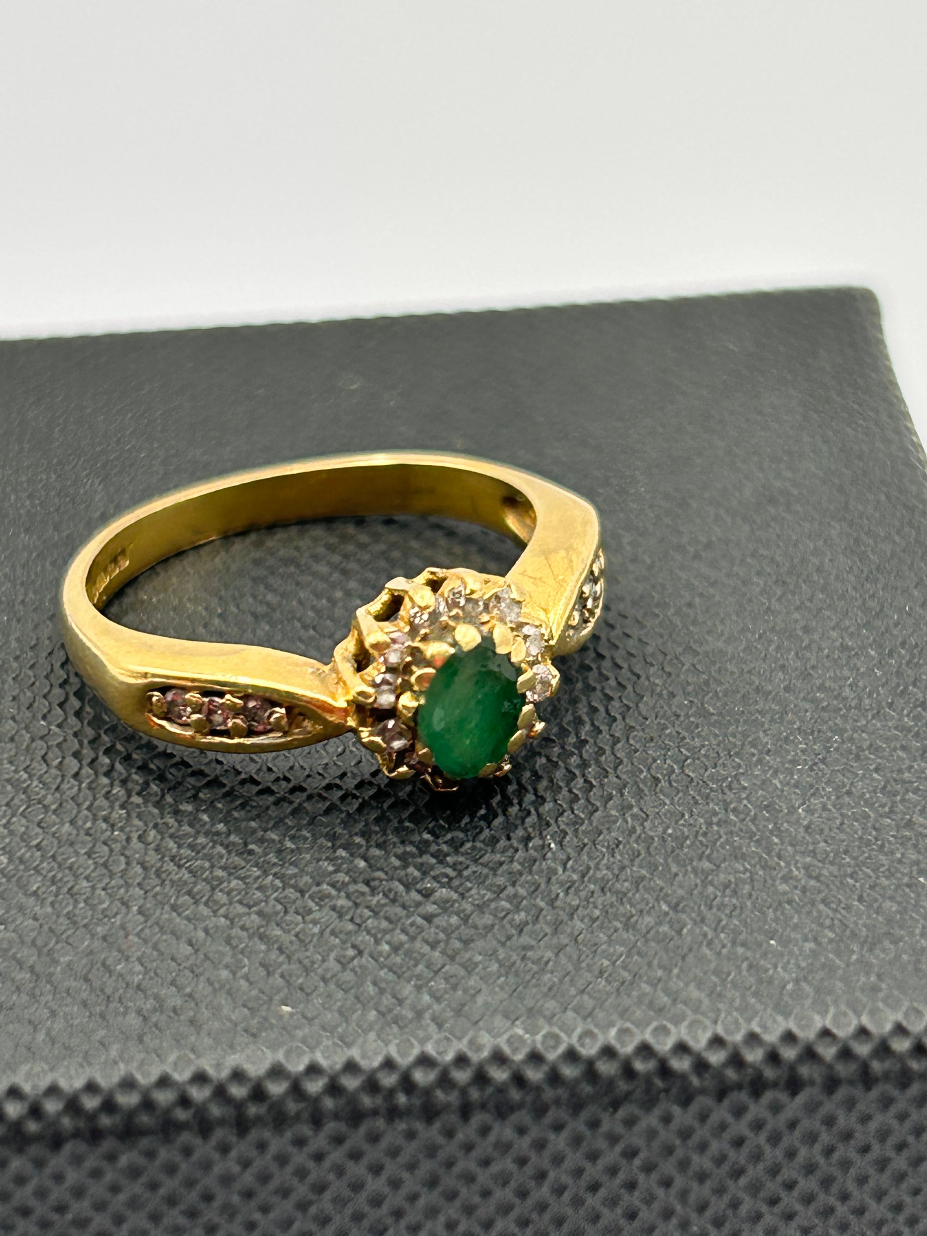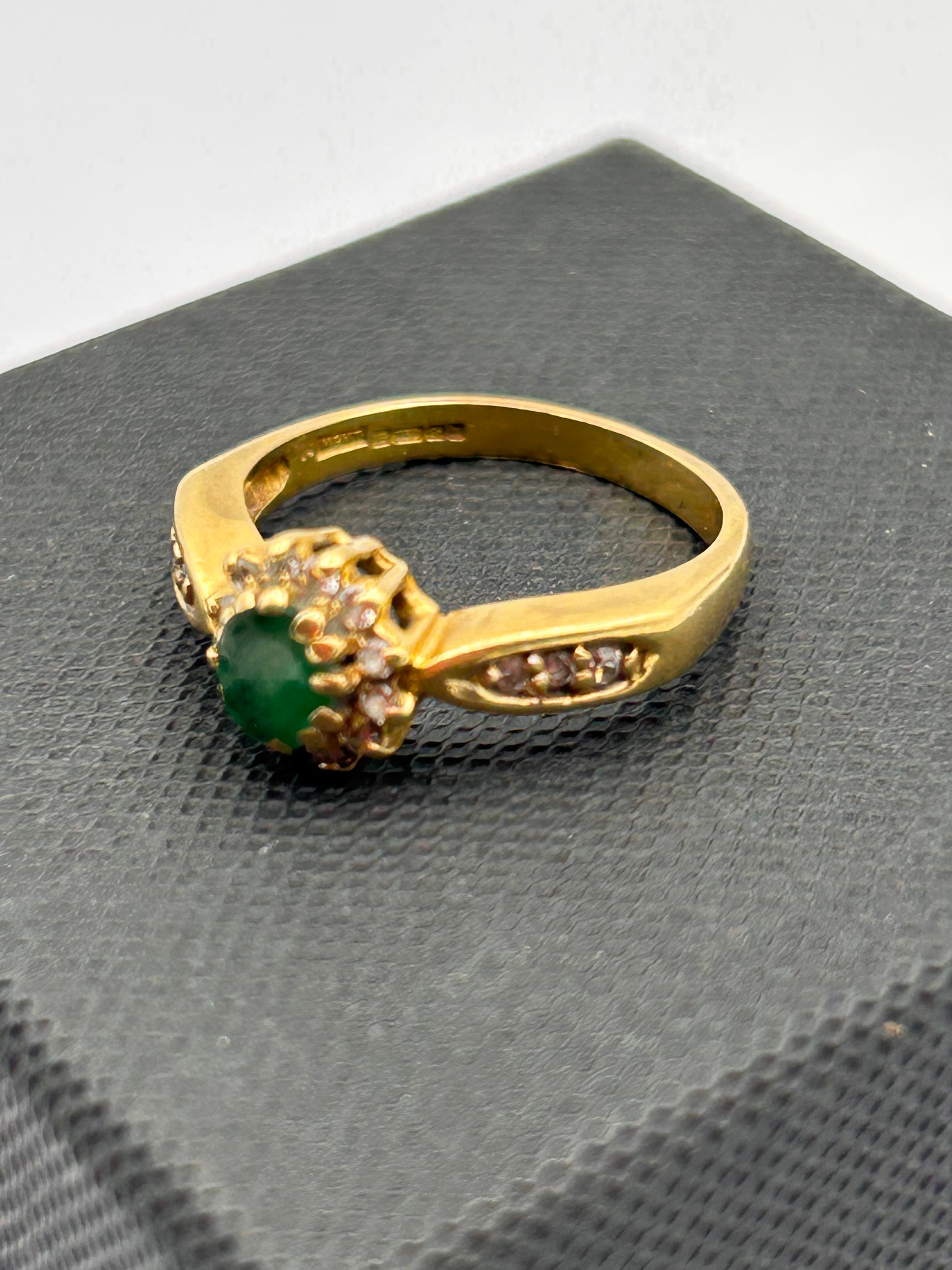 An 18ct yellow gold ring, set with a central oval-cut emerald and surrounded by round brilliant-cut diamonds. The shoulders are further embellished with small round diamonds. A faint hallmark is visible on the inner band. The ring features a contemporary or vintage design.