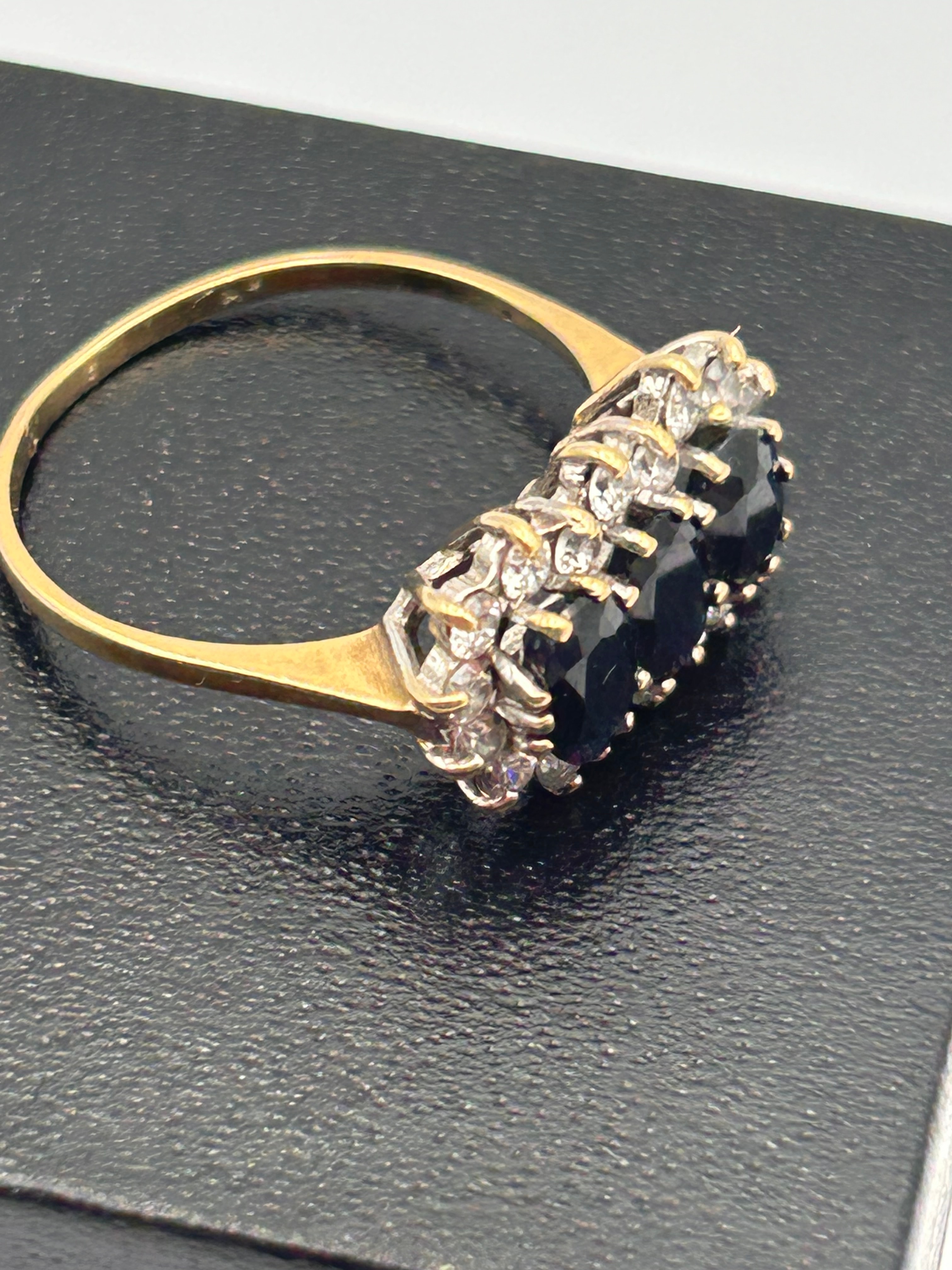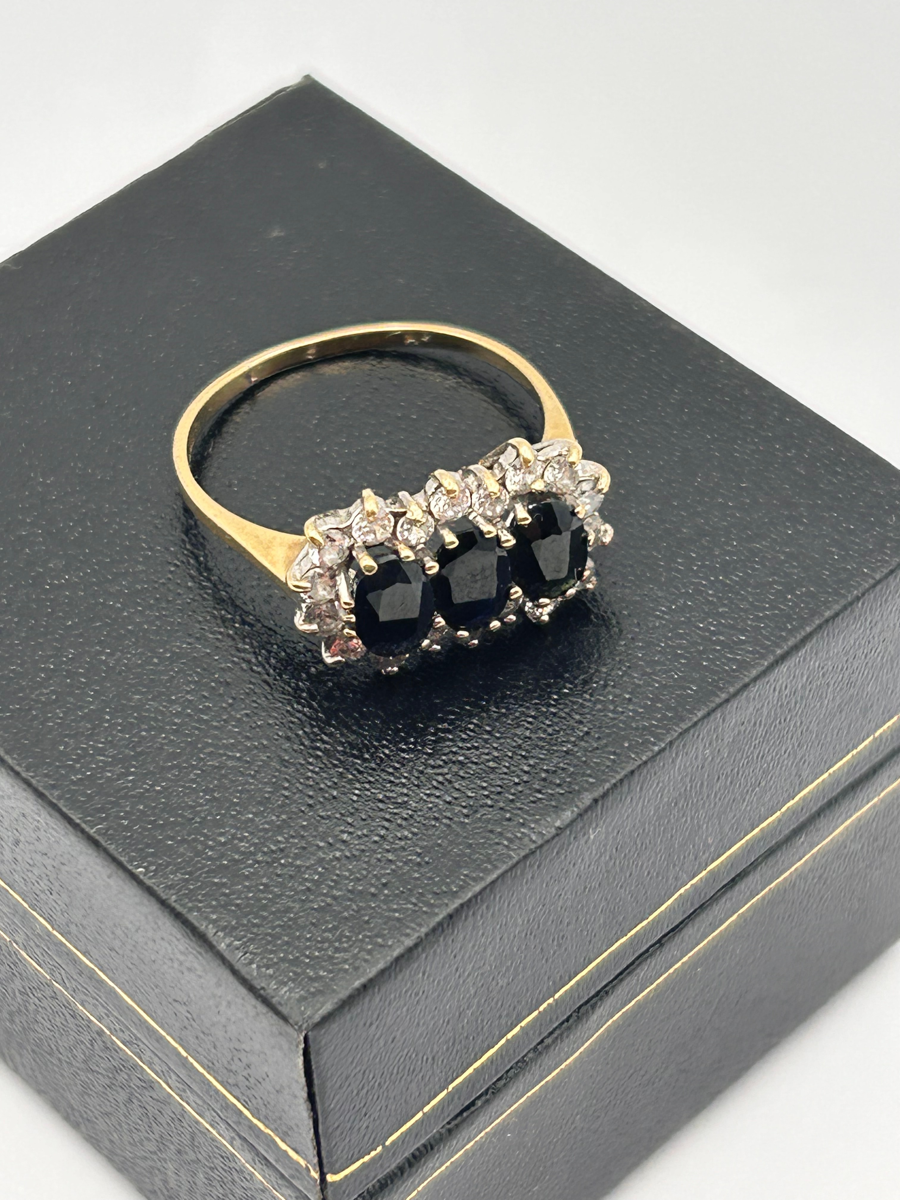 A 9ct yellow gold ring featuring a central trilogy of three cushion or square-cut faceted sapphires. These are flanked on either side by ornate clusters of small, round, faceted CZ stones set in a contrasting white metal. The design presents a classic three-stone style with decorative shoulders.
